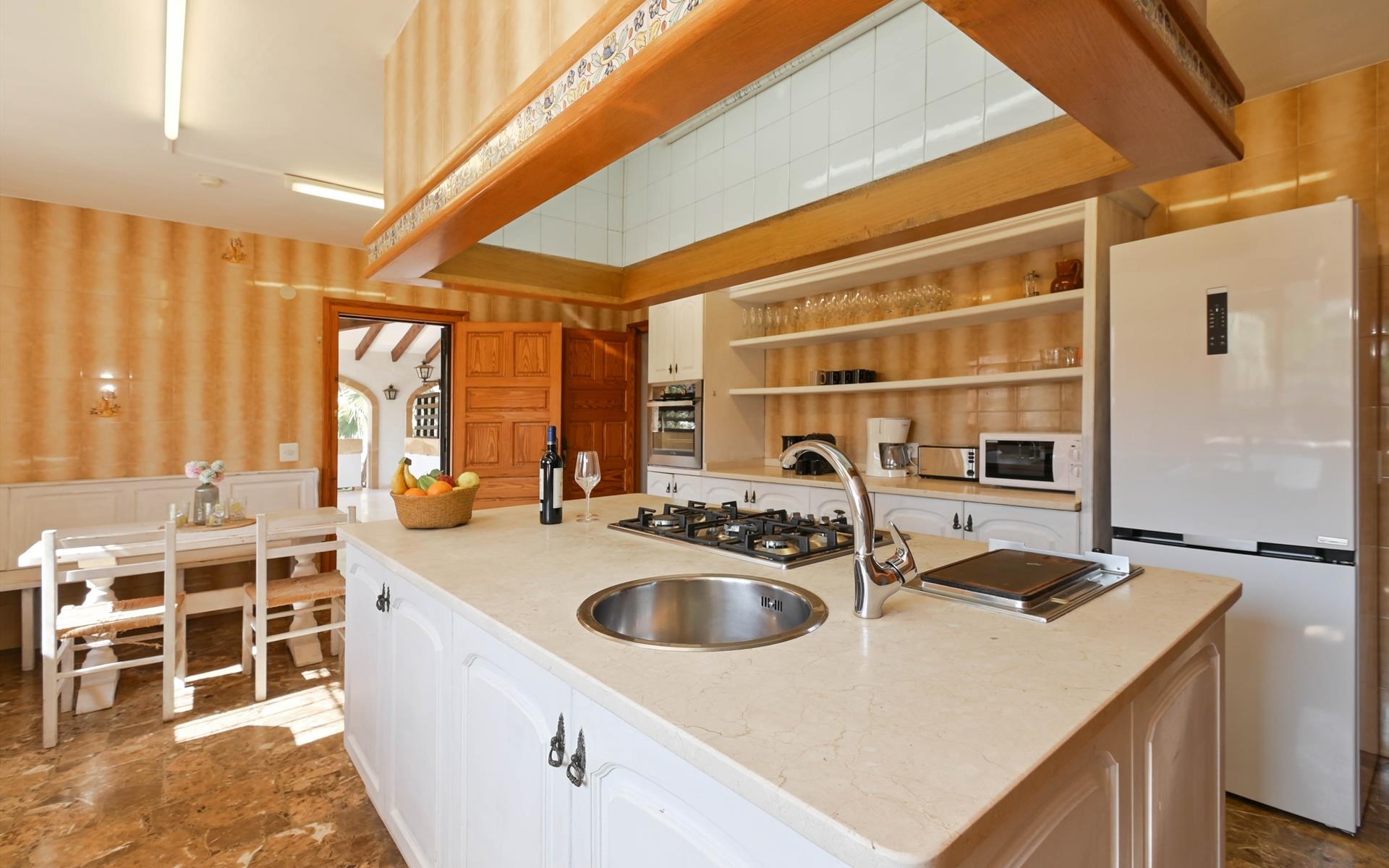 - keuken met gasfornuis, elektrische oven, magnetron, vaatwasser, koelkast-vriezers, koffiezetapparaat, waterkoker, mixer, broodrooster en sapcentrifuge