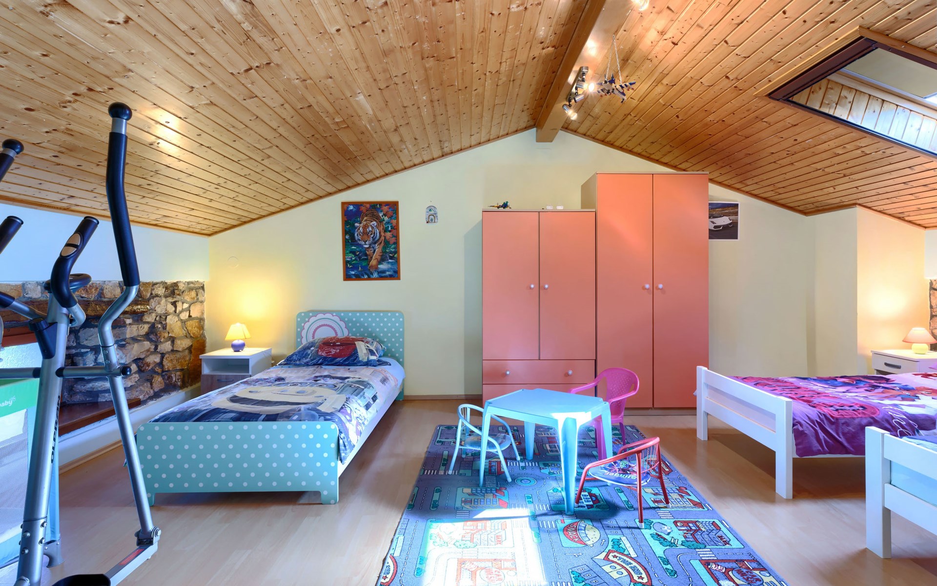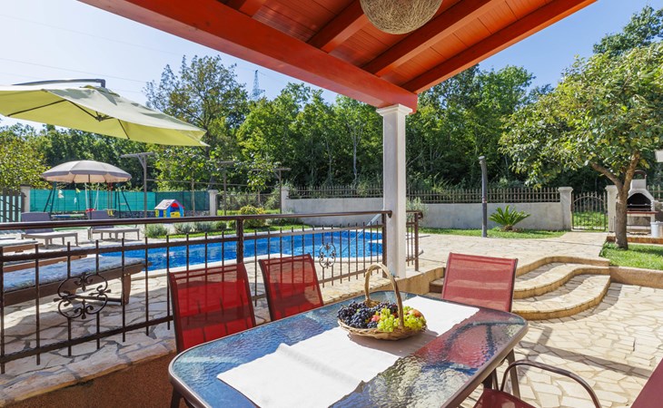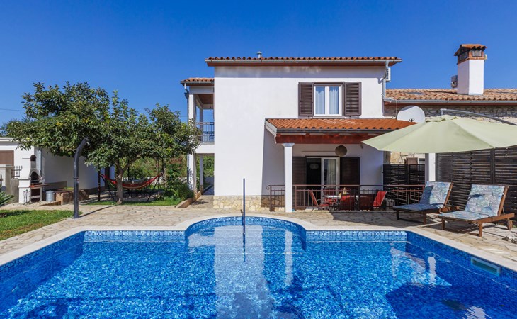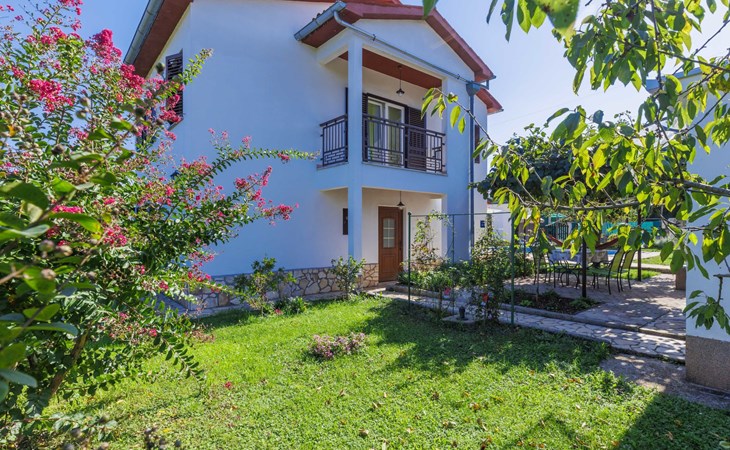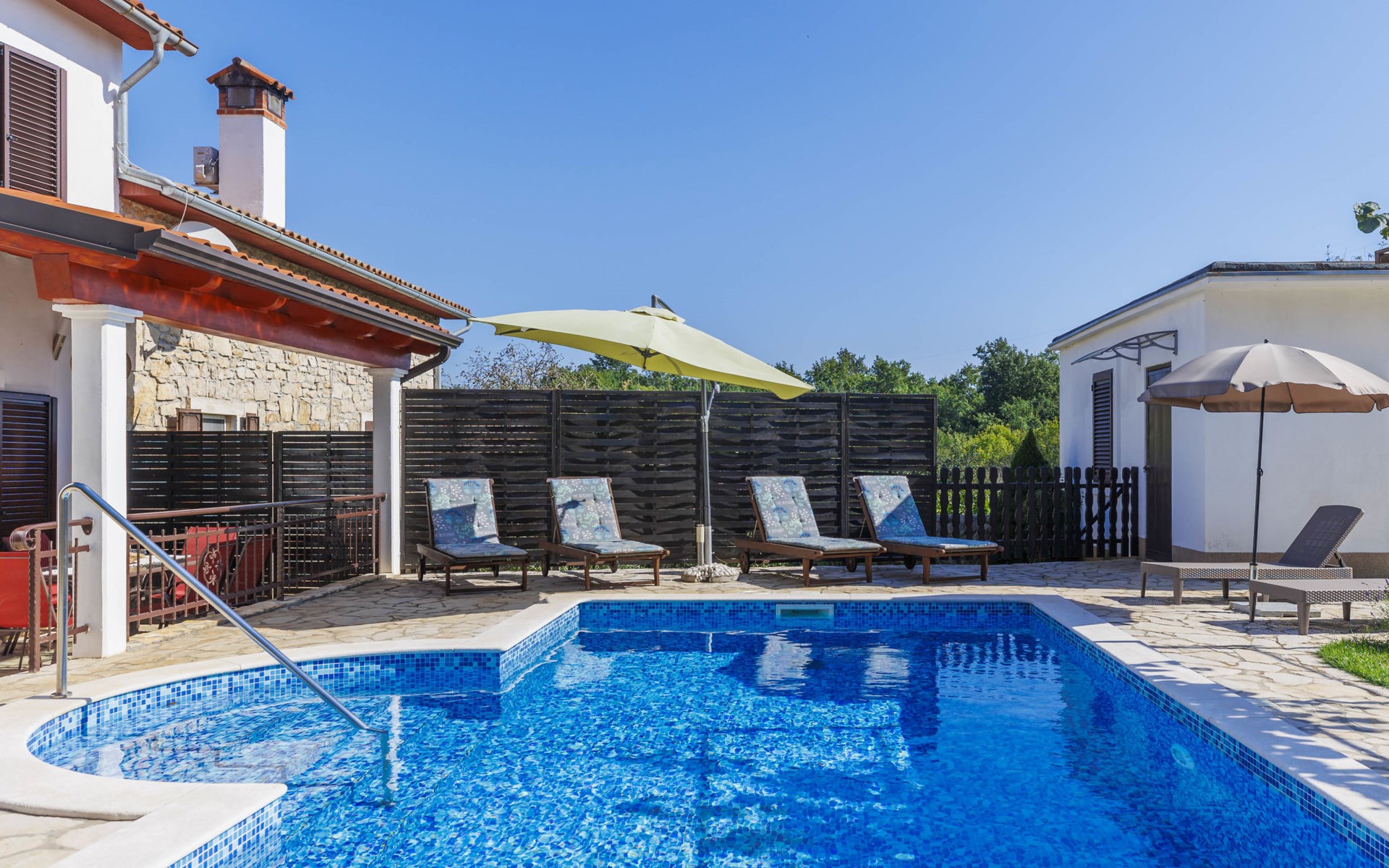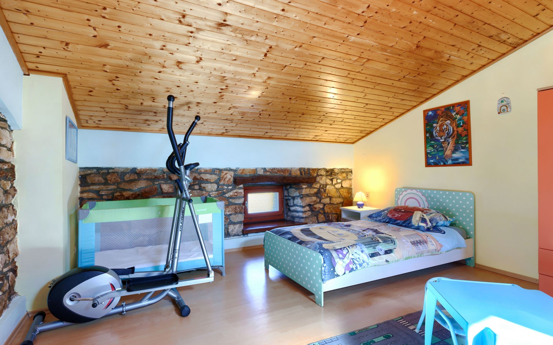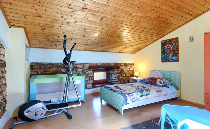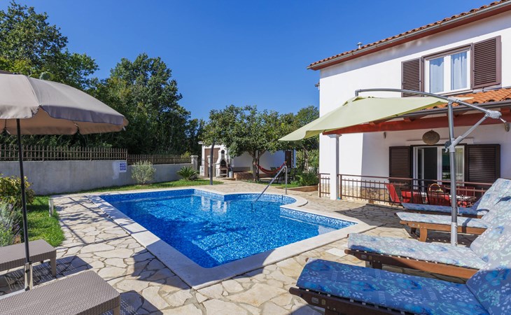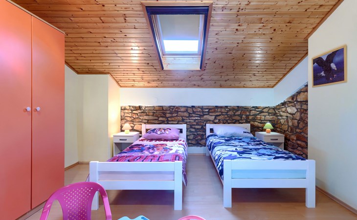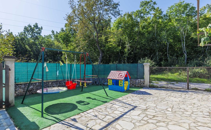 Twee onder één kap woning "Marija", van 2 verdiepingen, omgeven door bomen. In het gehucht Tomovi, 7.5 km van het centrum van Labin, rustige, zonnige ligging, 13 km van zee. Voor alleengebruik: terrein 600 m2 (omheind), kleine tuin met gazon, openluchtzwembad hoekig (7 x 4 m, 140 cm diepte, seizoensgebonden beschikbaarheid: 18.Mei. - 12.Okt.) met trap. Buitendouche, prieel (15 m2), barbecue, kinderspeelplaats (glijbaan, schommel). In het huis: internetaansluiting, wasmachine. Parkeerplaats bij het huis op het terrein. Winkel 1 km, supermarkt 7.5 km, restaurant 8 km, bushalte 7.1 km, kiezelstrand 13 km. Wandelroutes 200 m vanaf het huis, fietspad 250 m.