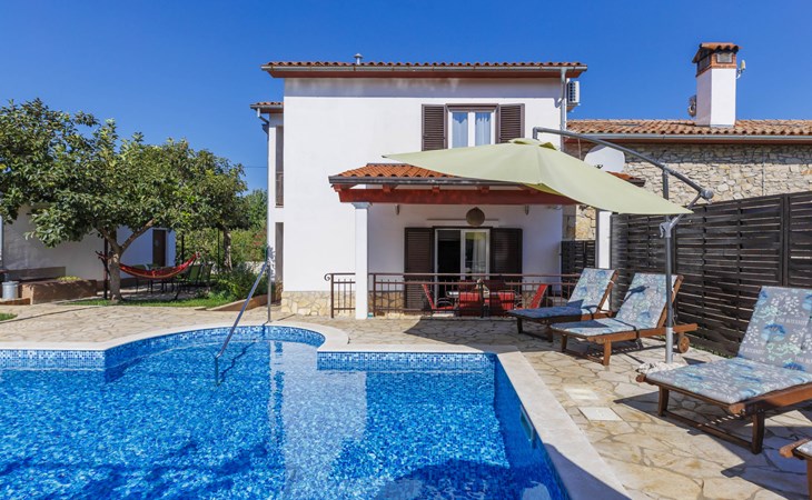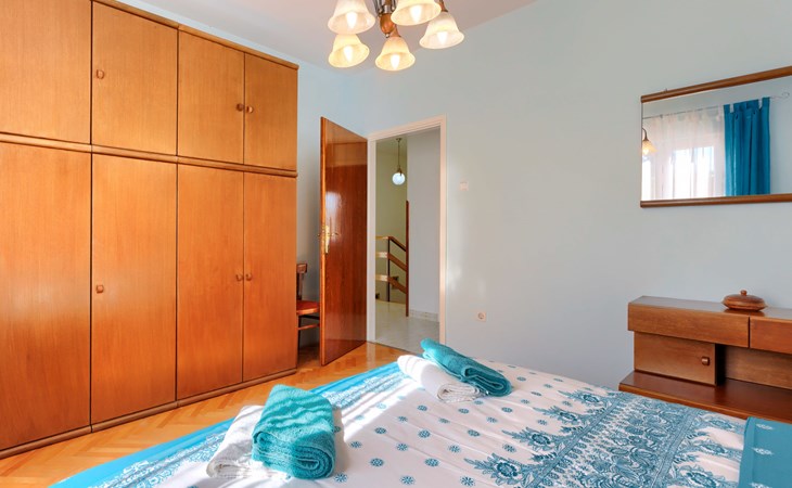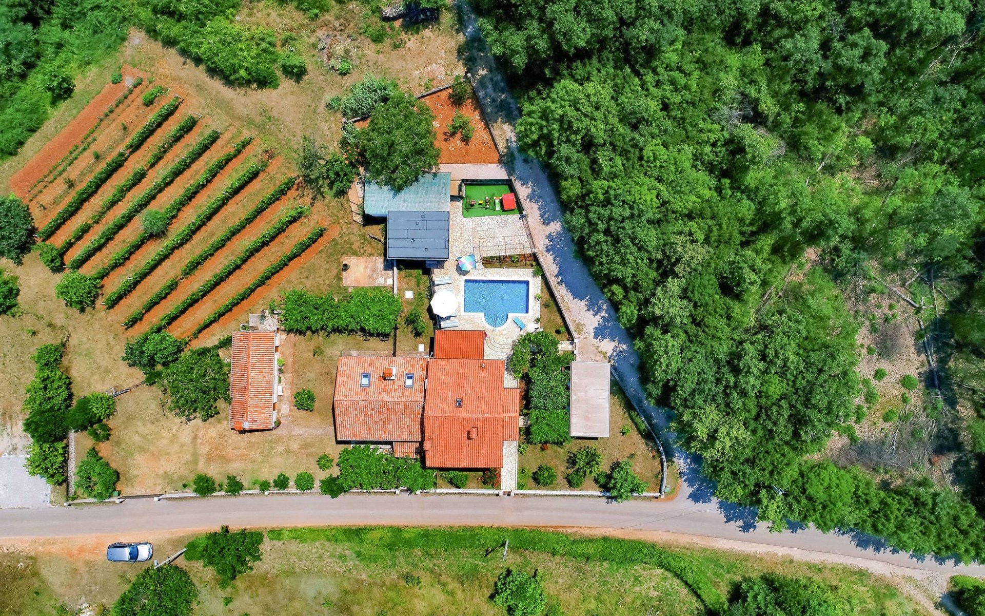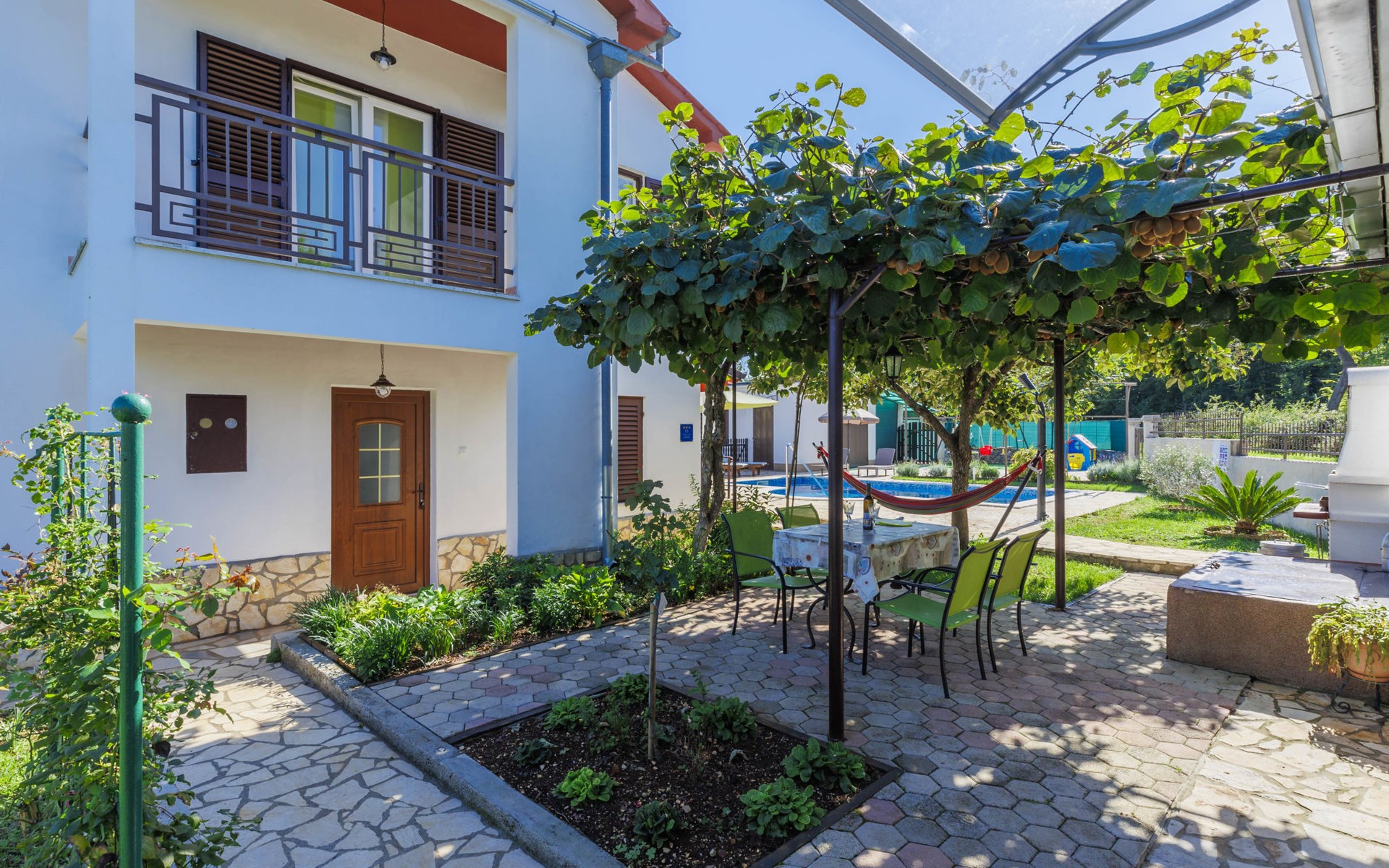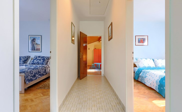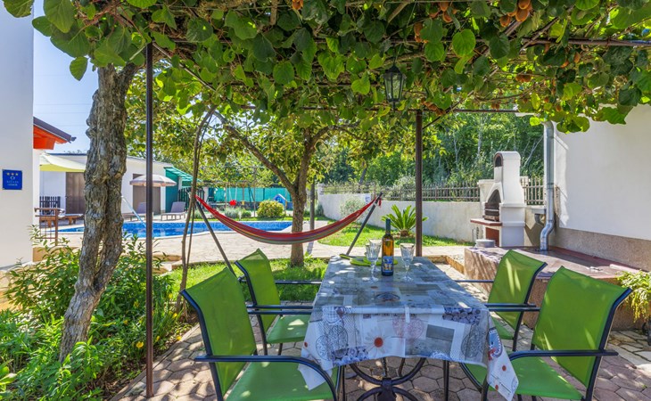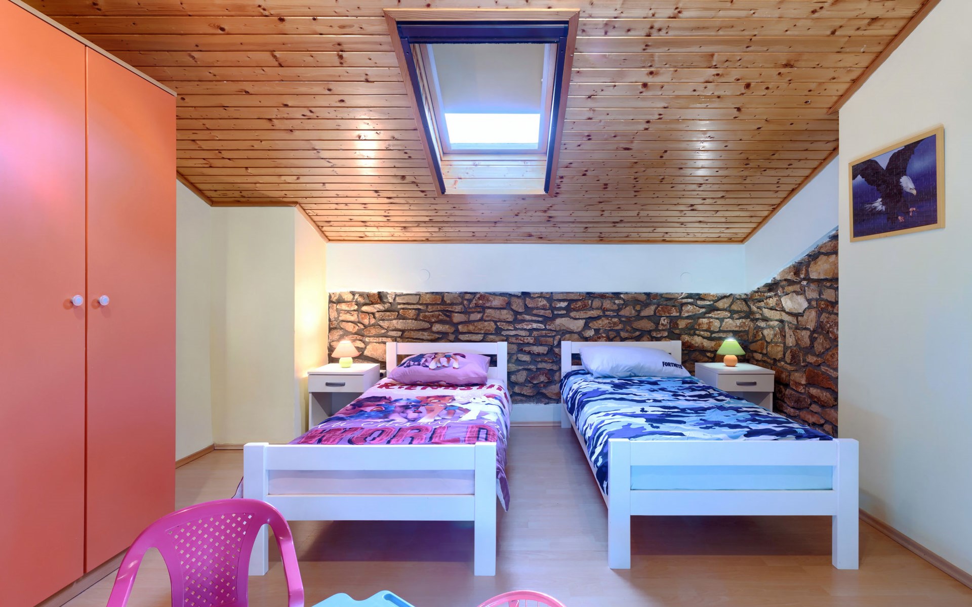 Twee onder één kap woning "Marija", van 2 verdiepingen, omgeven door bomen. In het gehucht Tomovi, 7.5 km van het centrum van Labin, rustige, zonnige ligging, 13 km van zee. Voor alleengebruik: terrein 600 m2 (omheind), kleine tuin met gazon, openluchtzwembad hoekig (7 x 4 m, 140 cm diepte, seizoensgebonden beschikbaarheid: 18.Mei. - 12.Okt.) met trap. Buitendouche, prieel (15 m2), barbecue, kinderspeelplaats (glijbaan, schommel). In het huis: internetaansluiting, wasmachine. Parkeerplaats bij het huis op het terrein. Winkel 1 km, supermarkt 7.5 km, restaurant 8 km, bushalte 7.1 km, kiezelstrand 13 km. Wandelroutes 200 m vanaf het huis, fietspad 250 m.