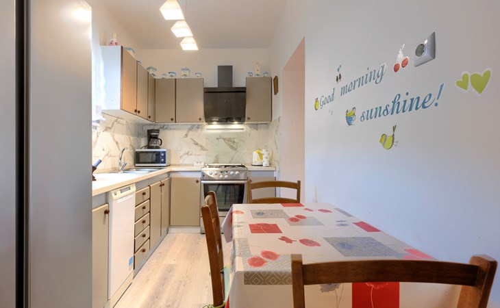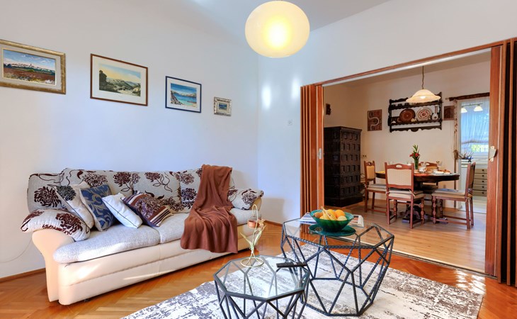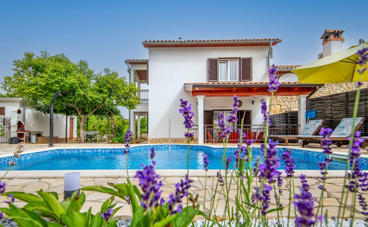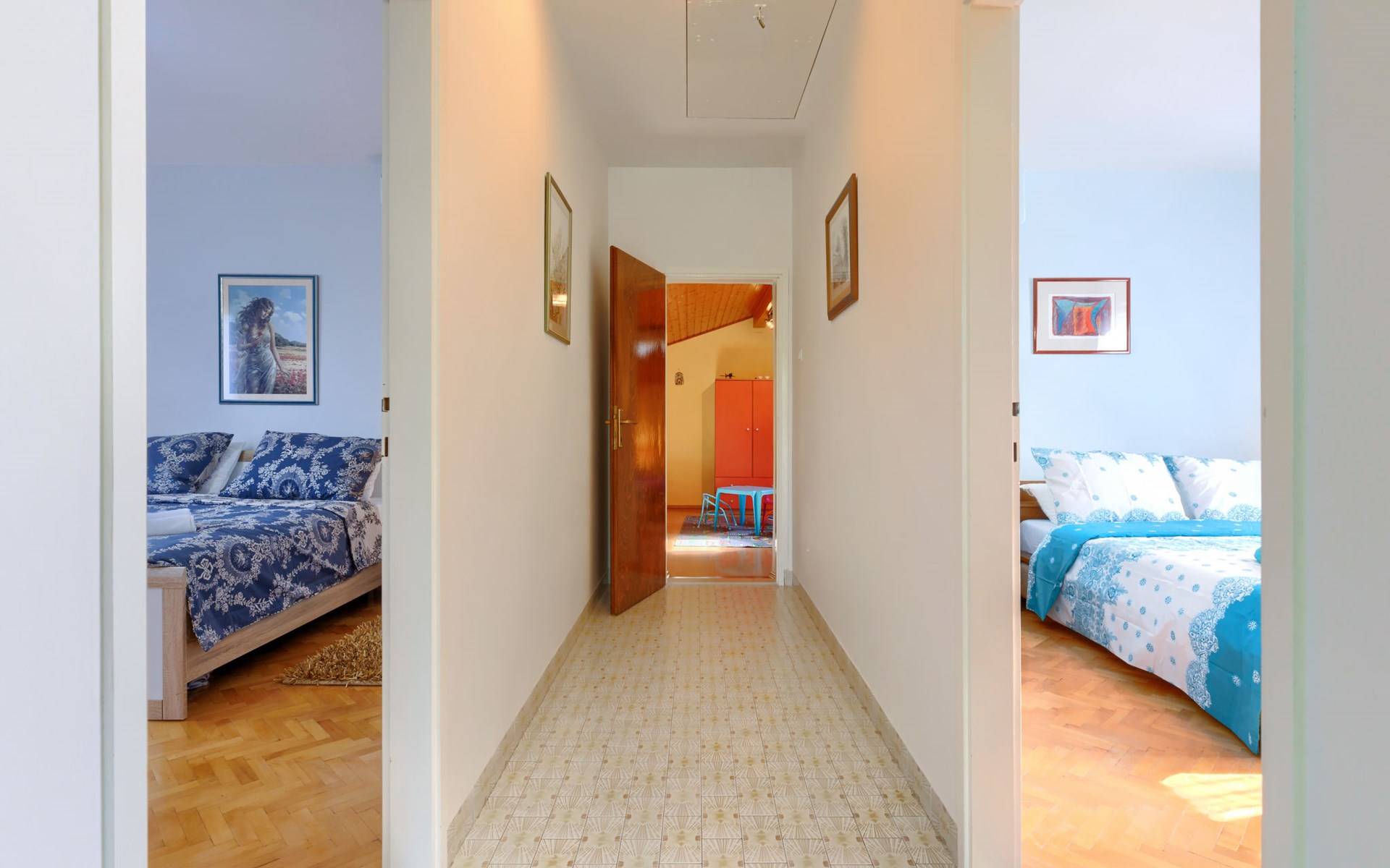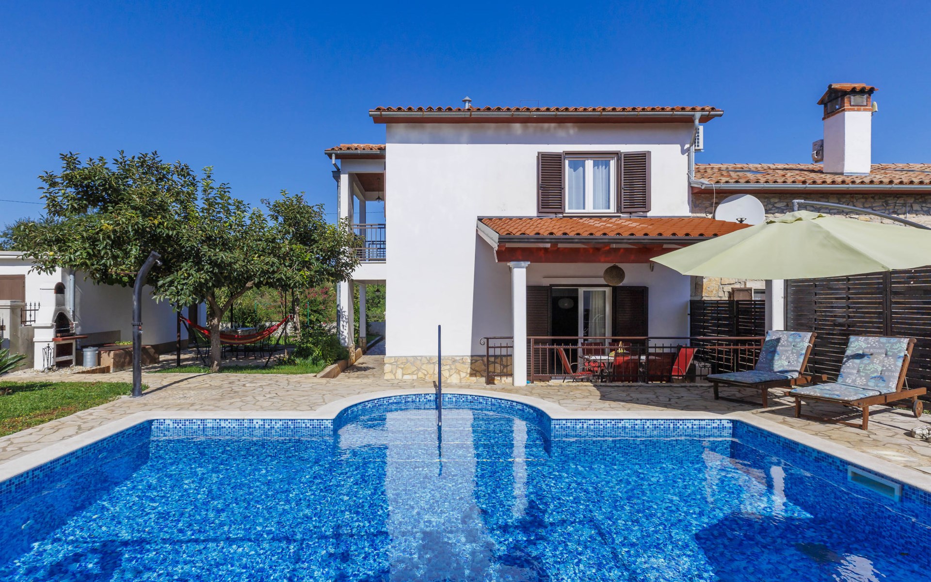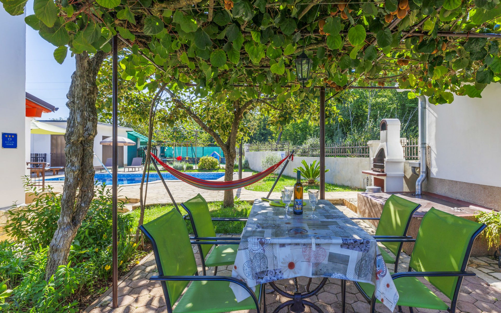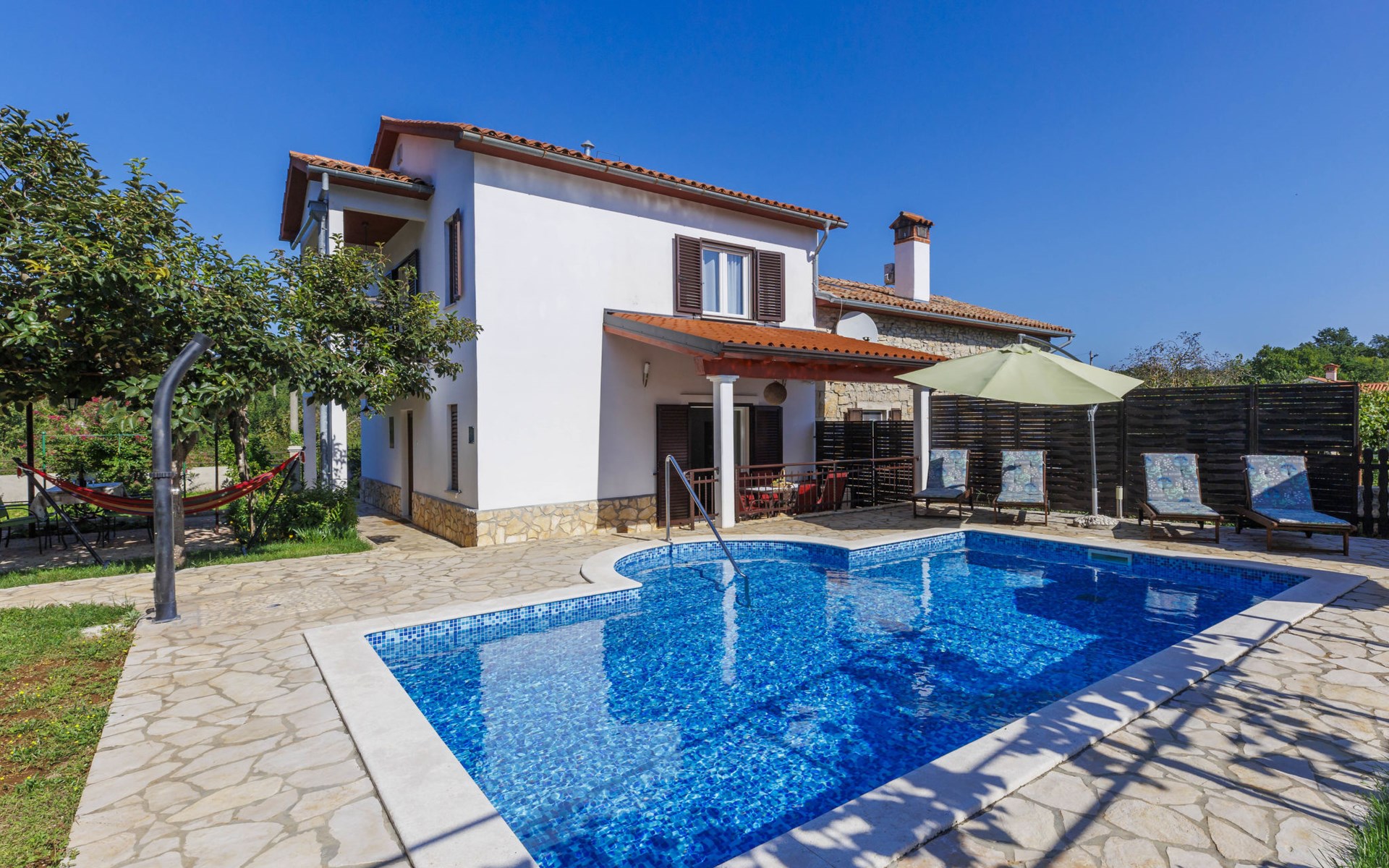 Twee onder één kap woning "Marija", van 2 verdiepingen, omgeven door bomen. In het gehucht Tomovi, 7.5 km van het centrum van Labin, rustige, zonnige ligging, 13 km van zee. Voor alleengebruik: terrein 600 m2 (omheind), kleine tuin met gazon, openluchtzwembad hoekig (7 x 4 m, 140 cm diepte, seizoensgebonden beschikbaarheid: 18.Mei. - 12.Okt.) met trap. Buitendouche, prieel (15 m2), barbecue, kinderspeelplaats (glijbaan, schommel). In het huis: internetaansluiting, wasmachine. Parkeerplaats bij het huis op het terrein. Winkel 1 km, supermarkt 7.5 km, restaurant 8 km, bushalte 7.1 km, kiezelstrand 13 km. Wandelroutes 200 m vanaf het huis, fietspad 250 m.