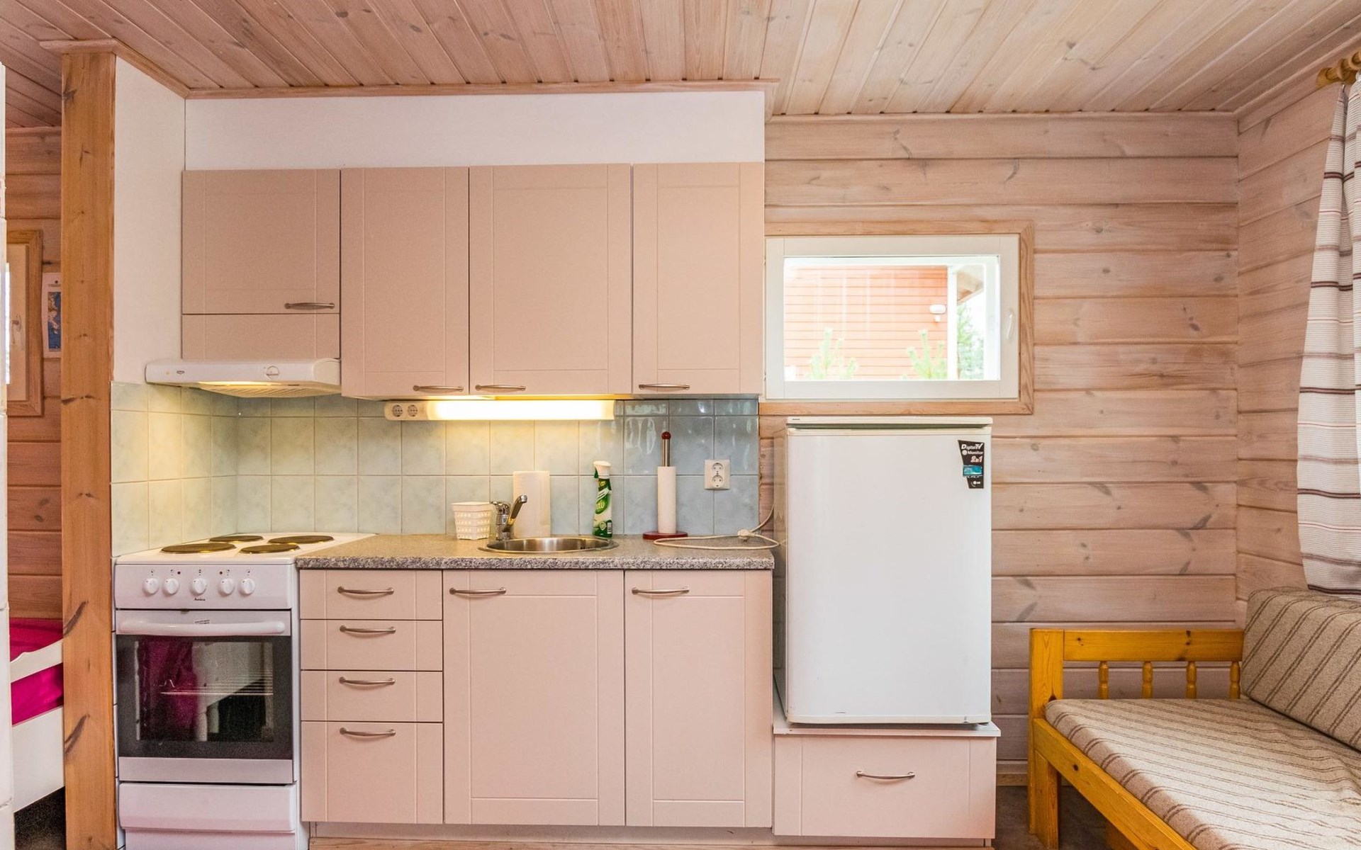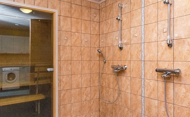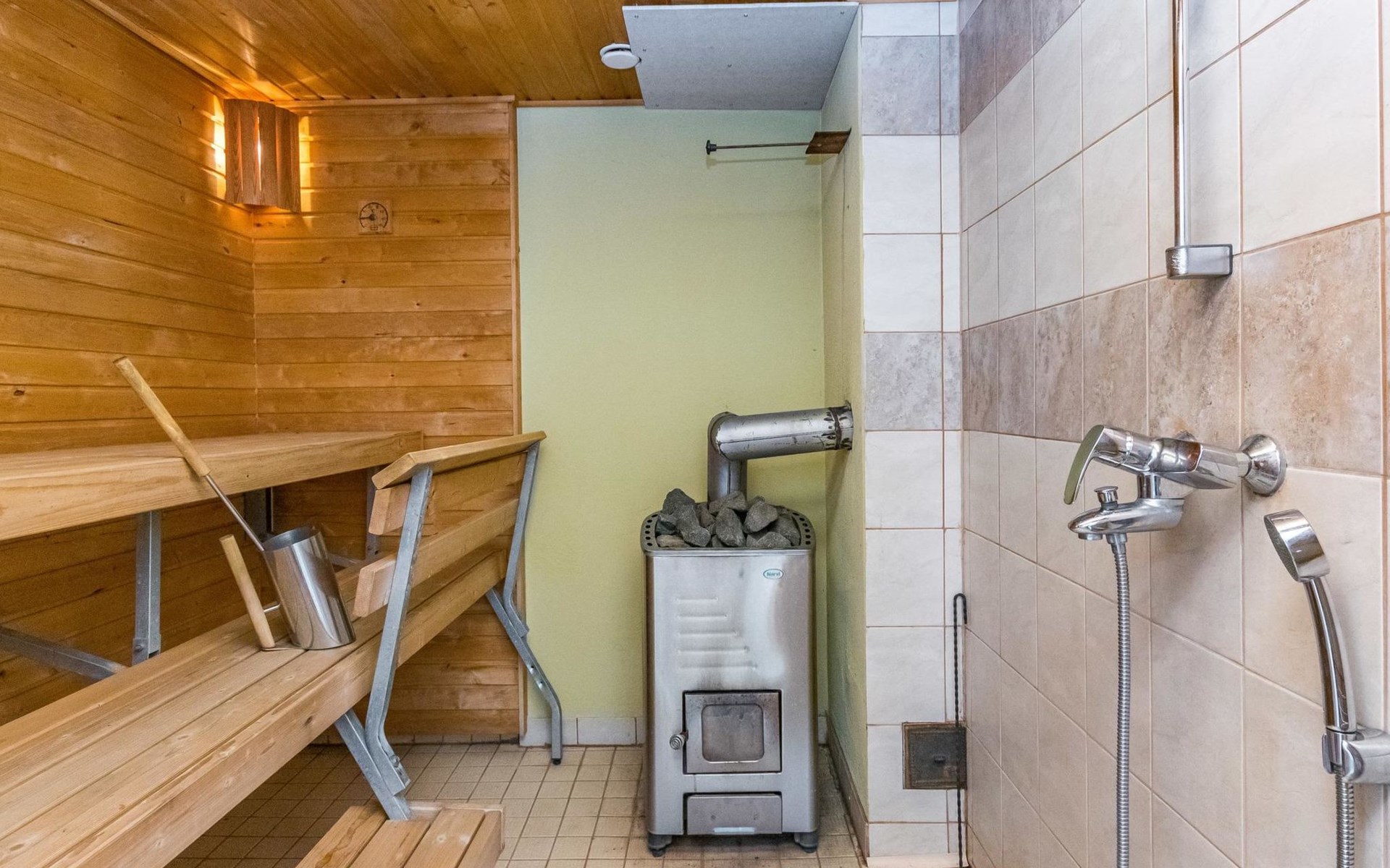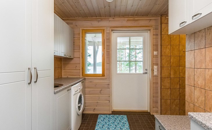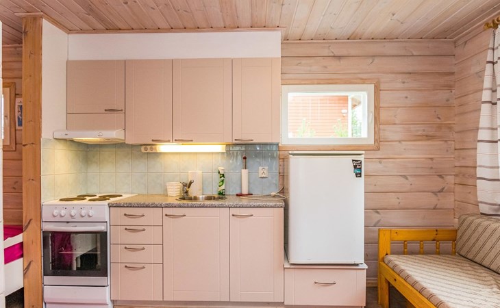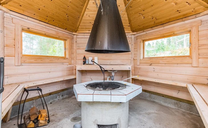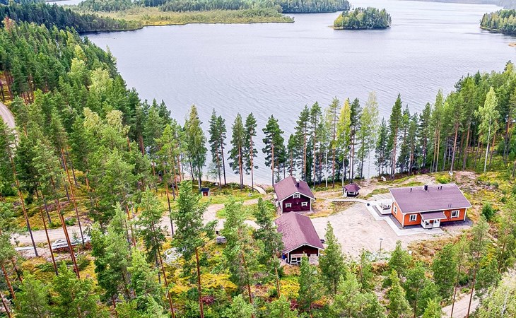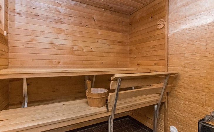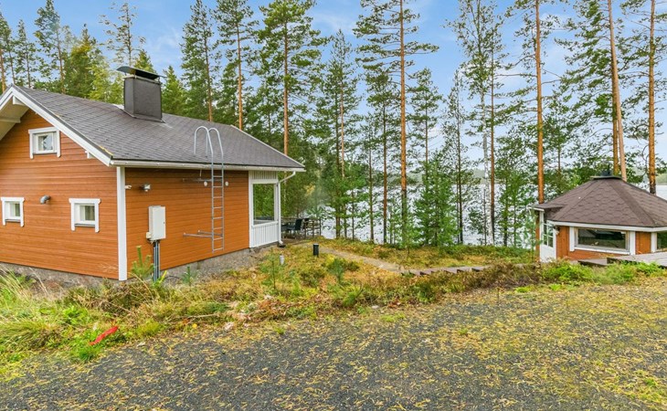 Lakeside sauna (30m²) with wood-burning sauna stove and shower, kitchen/living room, bedroom (7m²) with two beds. The lakeside sauna is not available in winter (1.11.-313.), except by separate agreement.