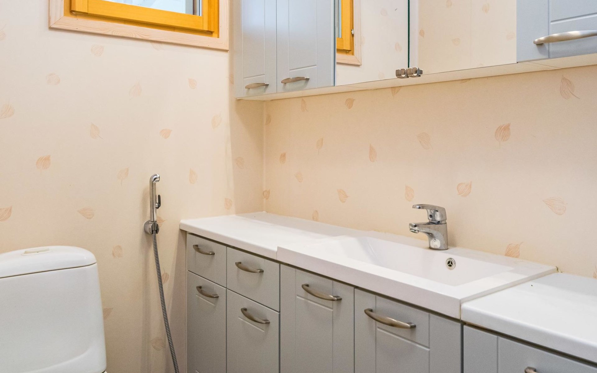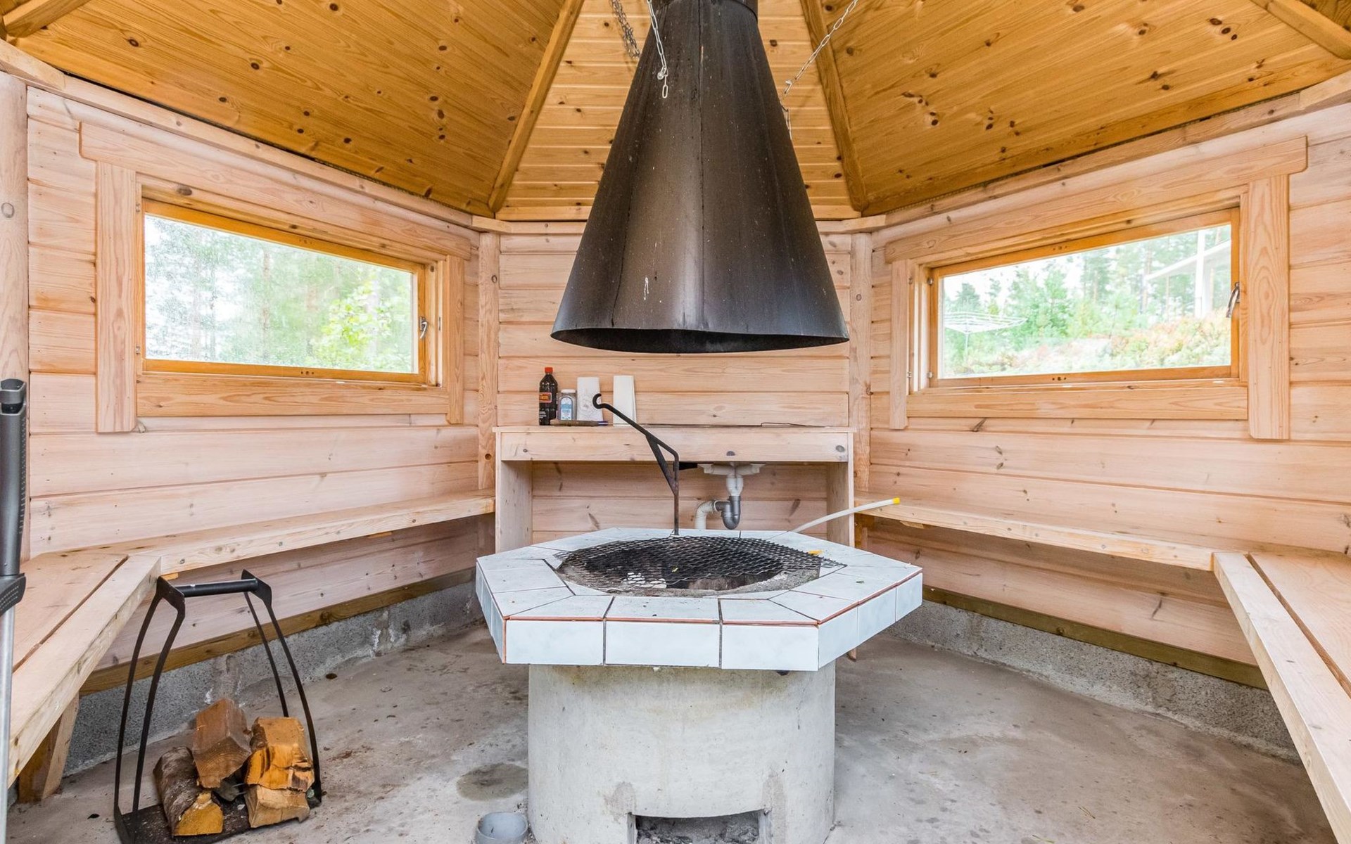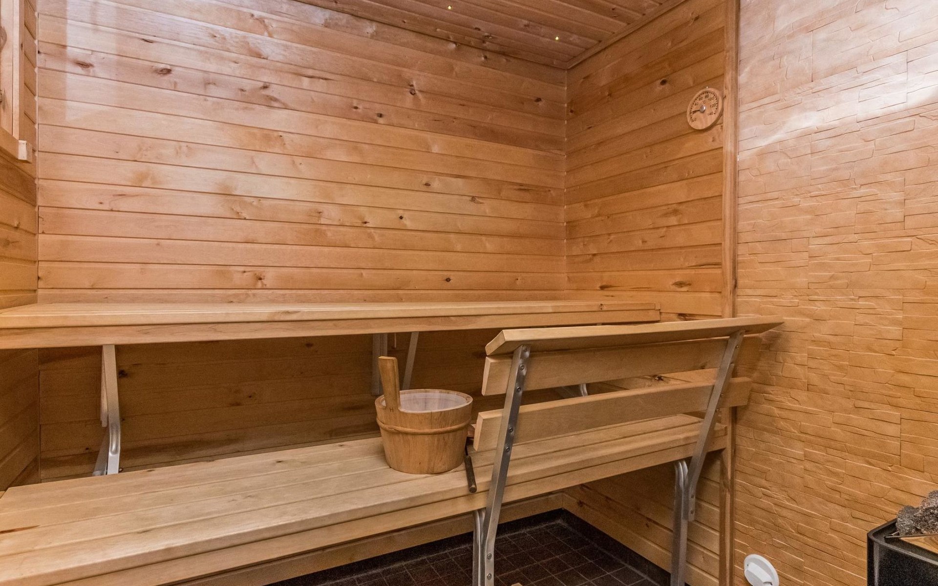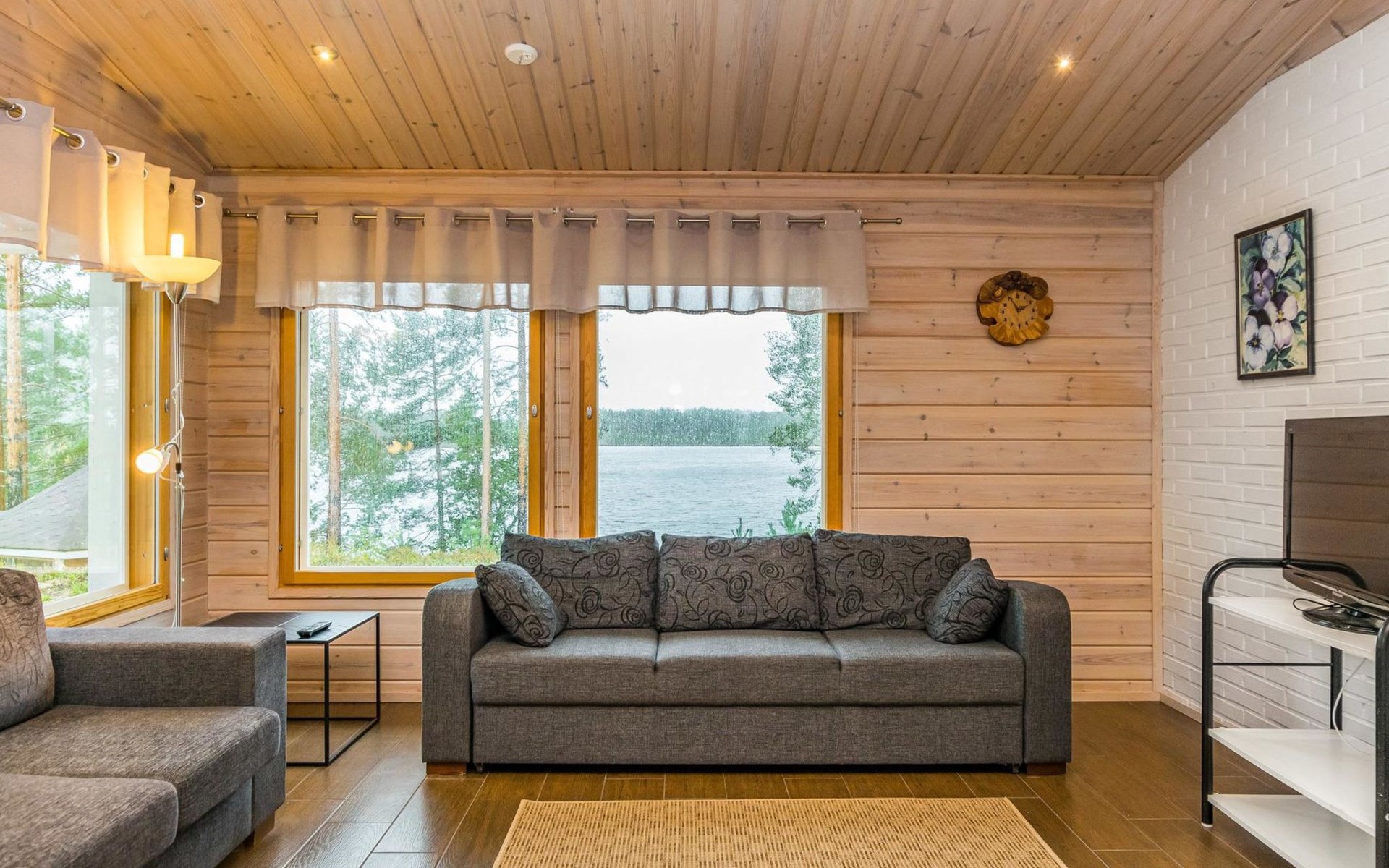 Lakeside sauna (30m²) with wood-burning sauna stove and shower, kitchen/living room, bedroom (7m²) with two beds. The lakeside sauna is not available in winter (1.11.-313.), except by separate agreement.