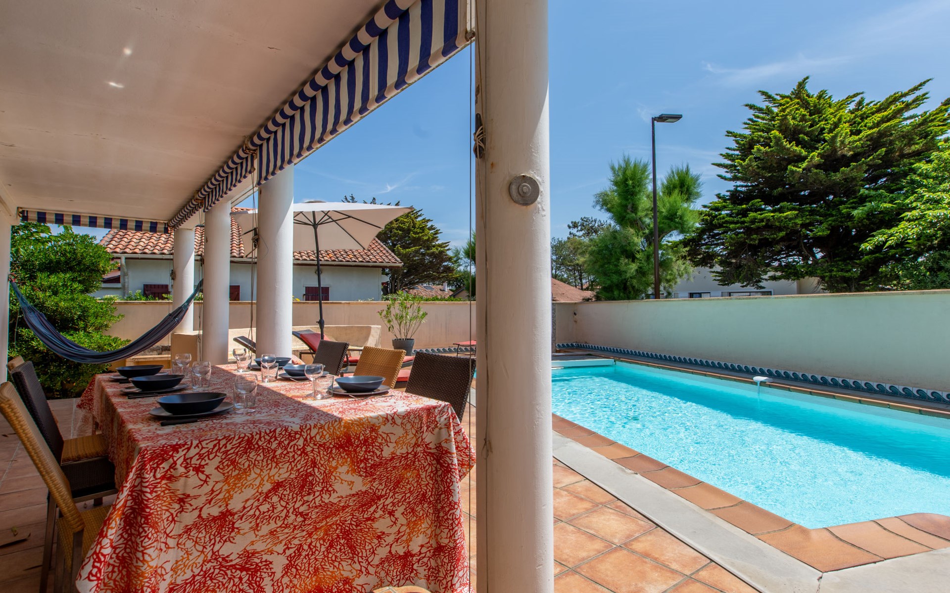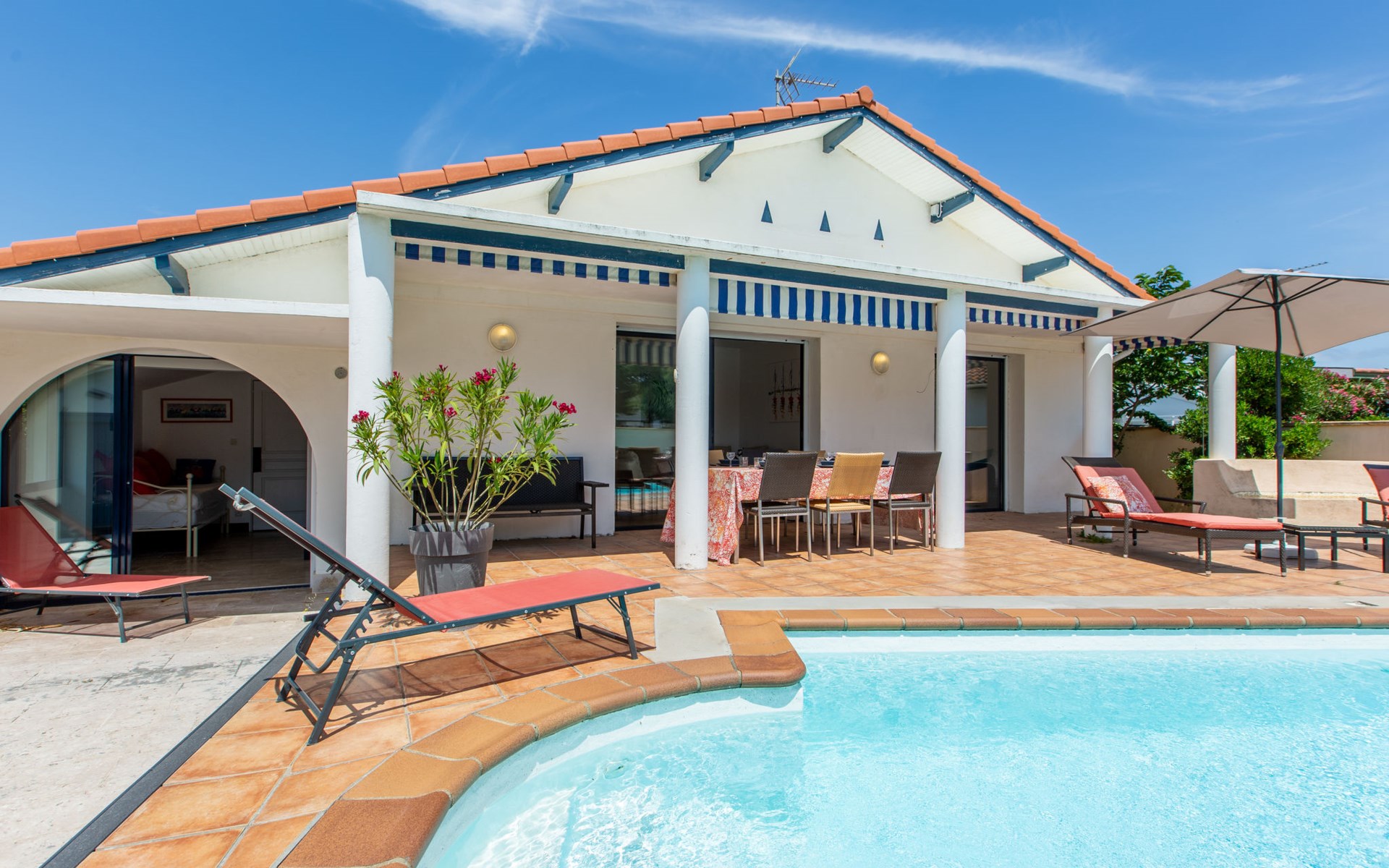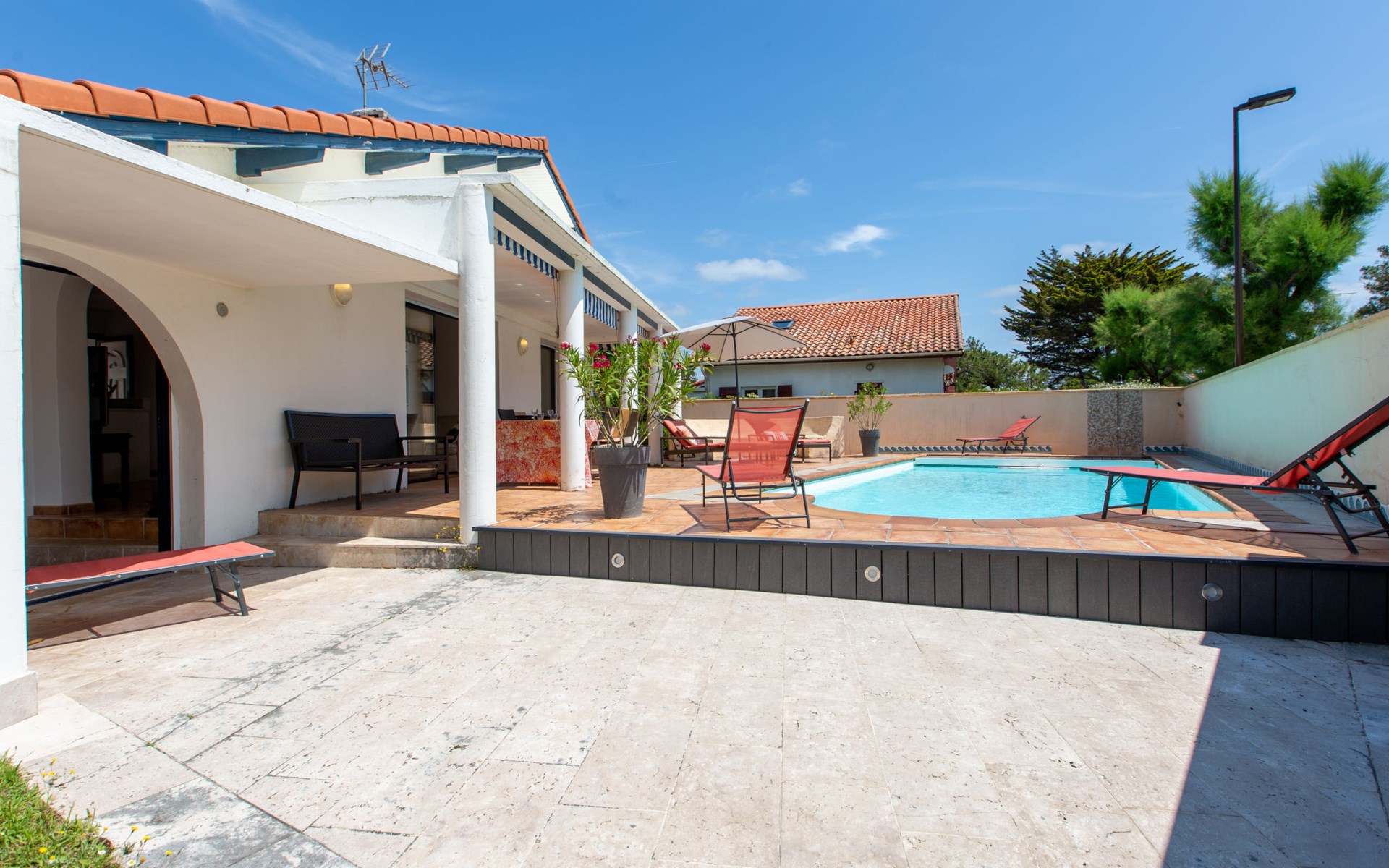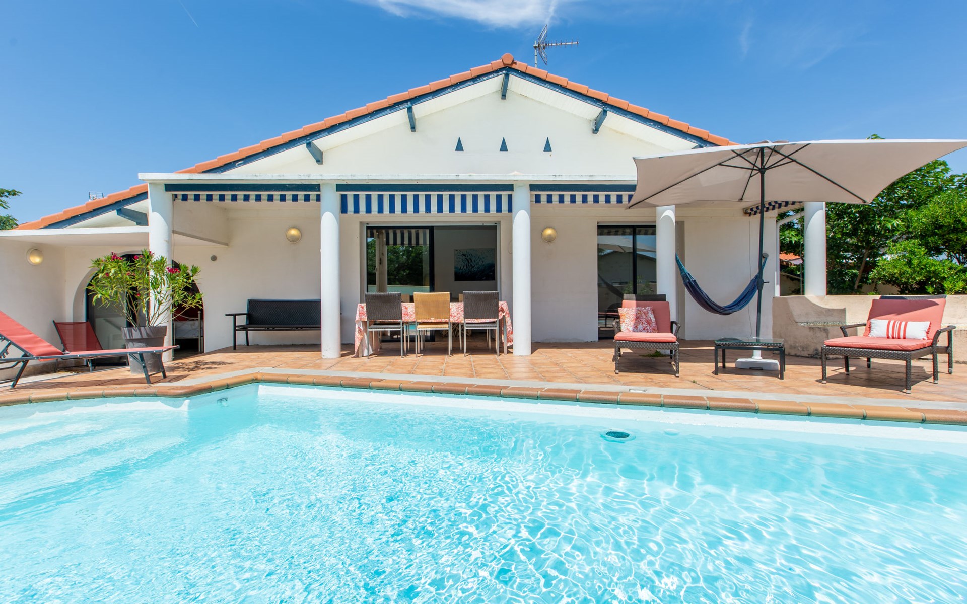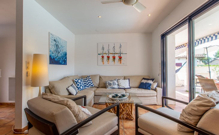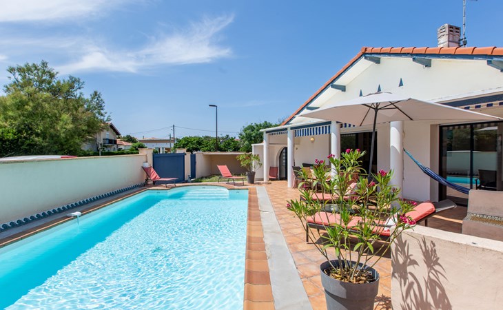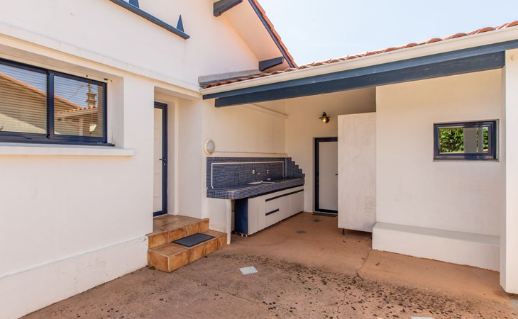 Vieux Boucau 20 km van Hossegor: Eengezinswoning "Corsaires". Huurobject bestaande uit hoofd-/ bijgebouw, in de plaats, 700 m van het centrum van Vieux Boucau, 500 m van zee, 500 m van het strand. Voor alleengebruik: openluchtzwembad (150 - 150 cm diepte, seizoensgebonden beschikbaarheid: 01.Jun. - 30.Sep.). Levensmiddelenwinkel 250 m, restaurant, bar, bakkerij, café 300 m, zandstrand "Plage centrale" 500 m. Golfterrein (9 holes) 3 km, surfschool 350 m, tennis, midgetgolf 400 m, fietspad 20 m. Attracties in de buurt: courant d'Huchet 7 km, skate parc 1 km, cinéma 700 m, parc accrobranche 8 km. De eigenaar accepteert geen jeugdgroepen. De sleuteloverdracht vindt plaats bij het agentschap Hossegor 20 km.