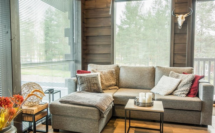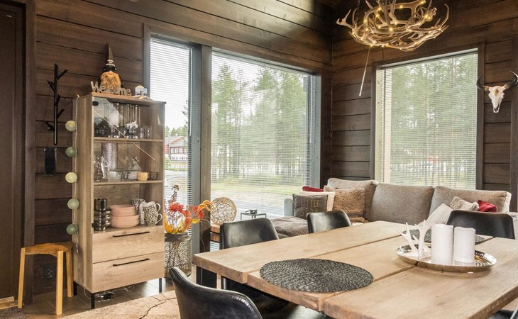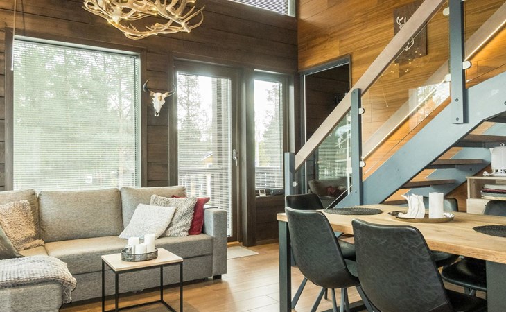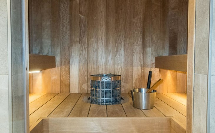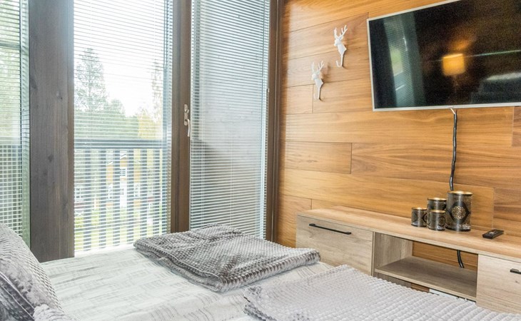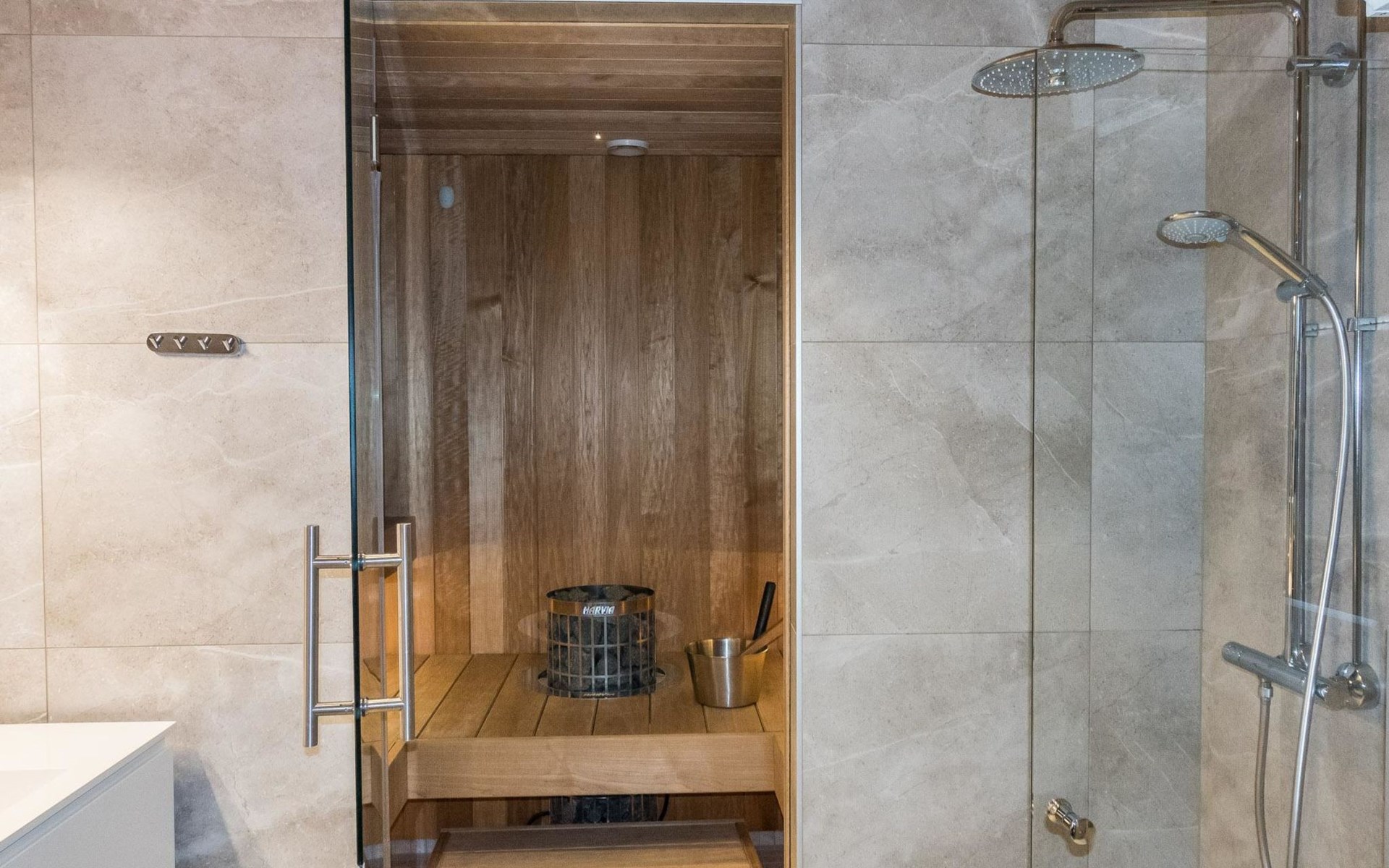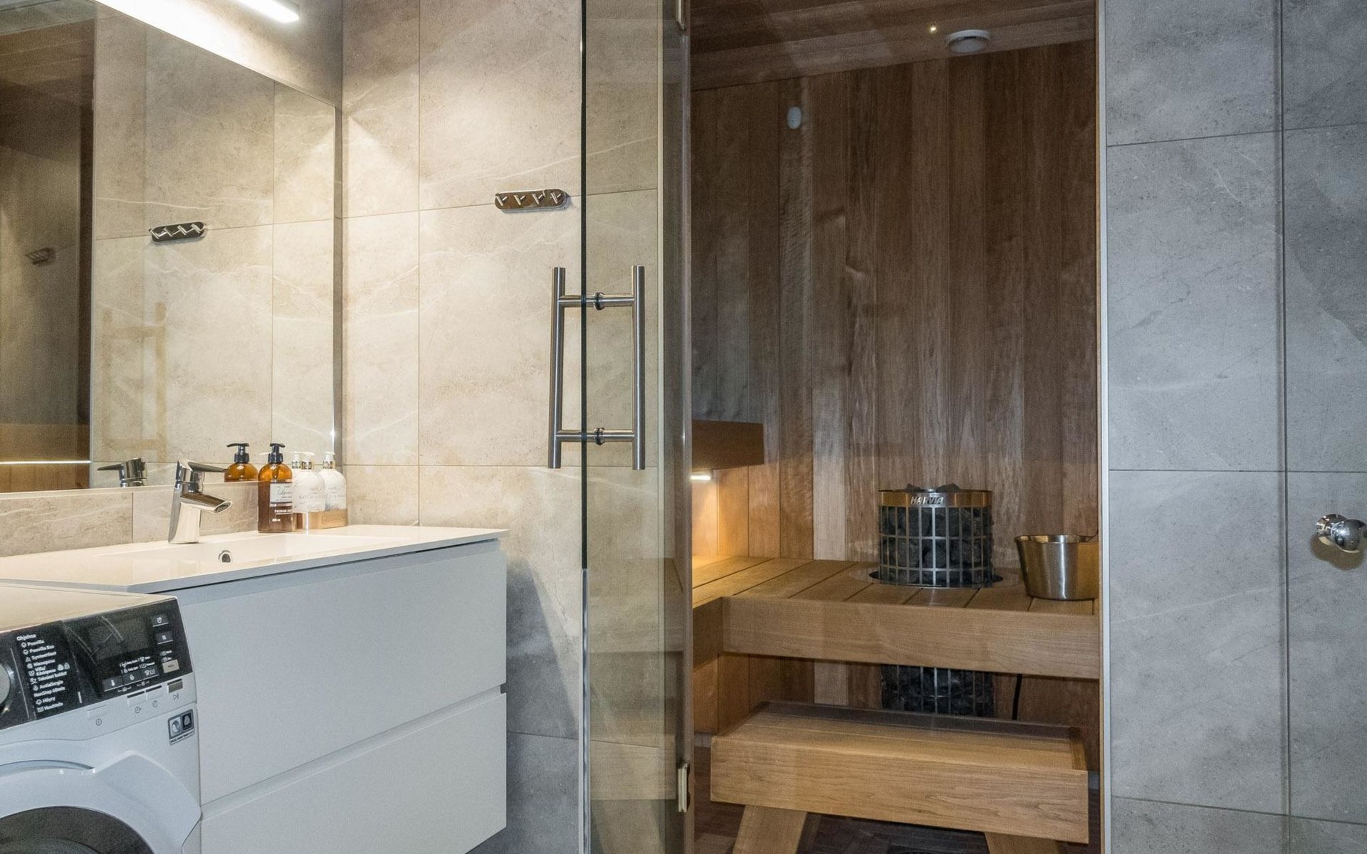 The bedroom has a folding door. The sauna and bathroom are also on this floor. There is access to a balcony from the living area.