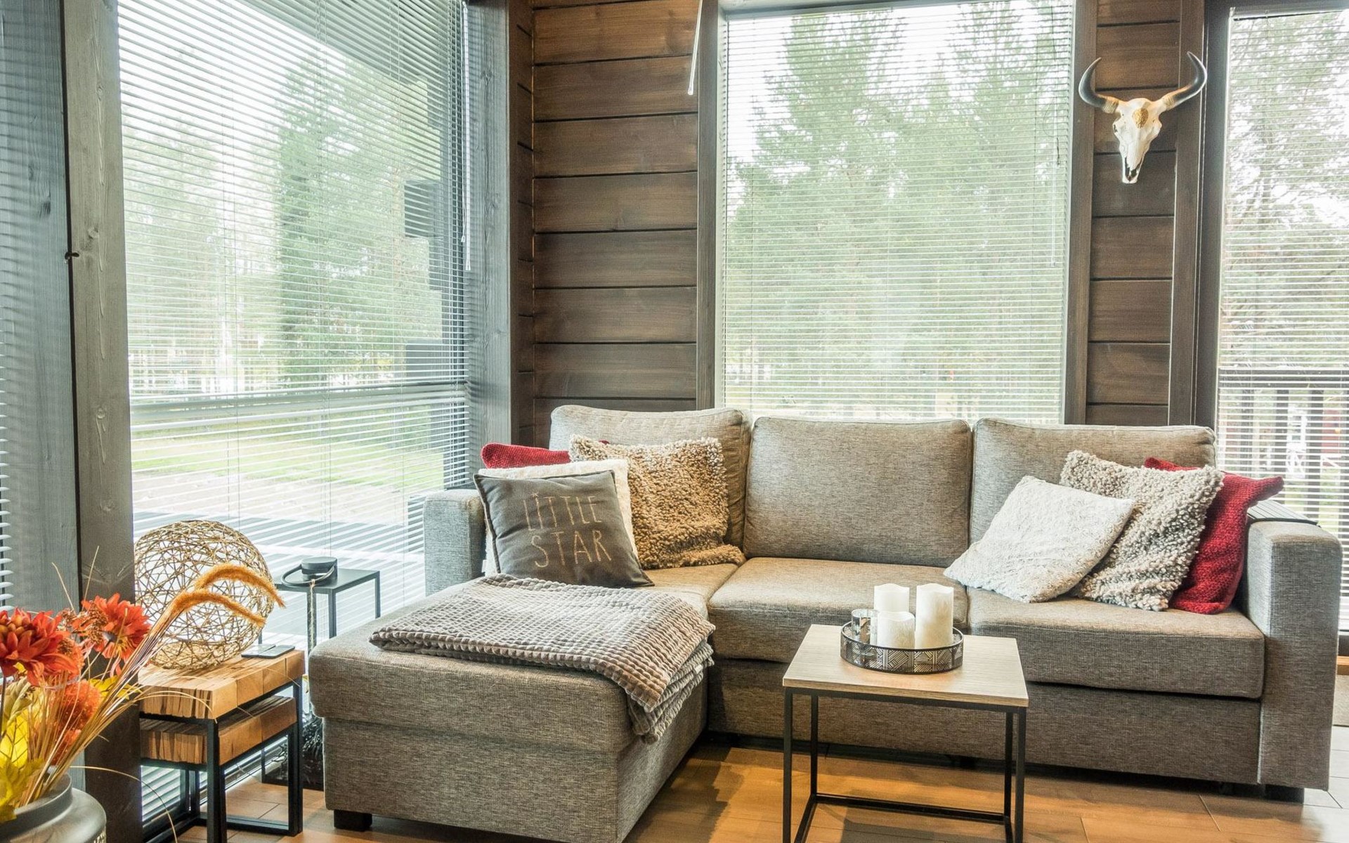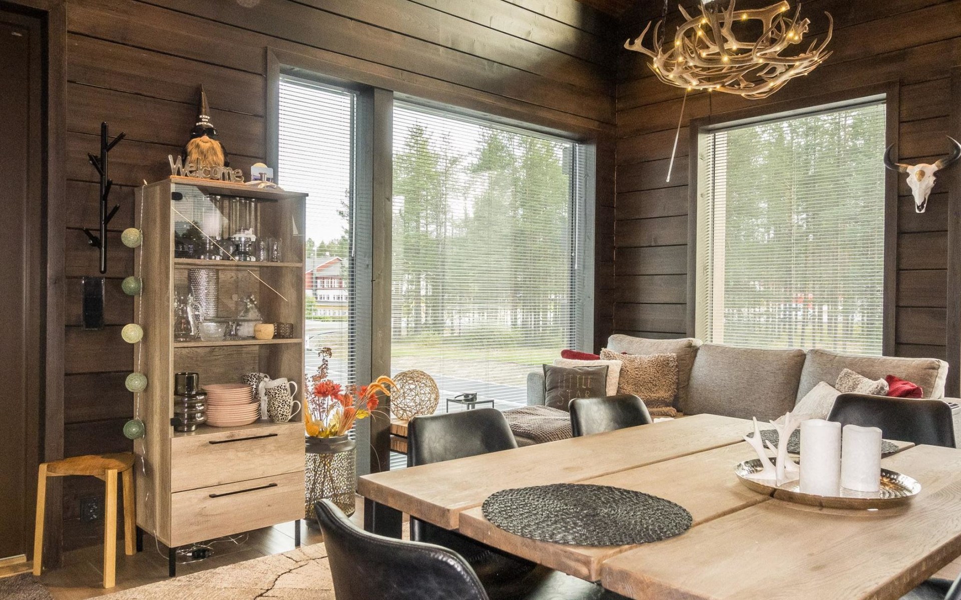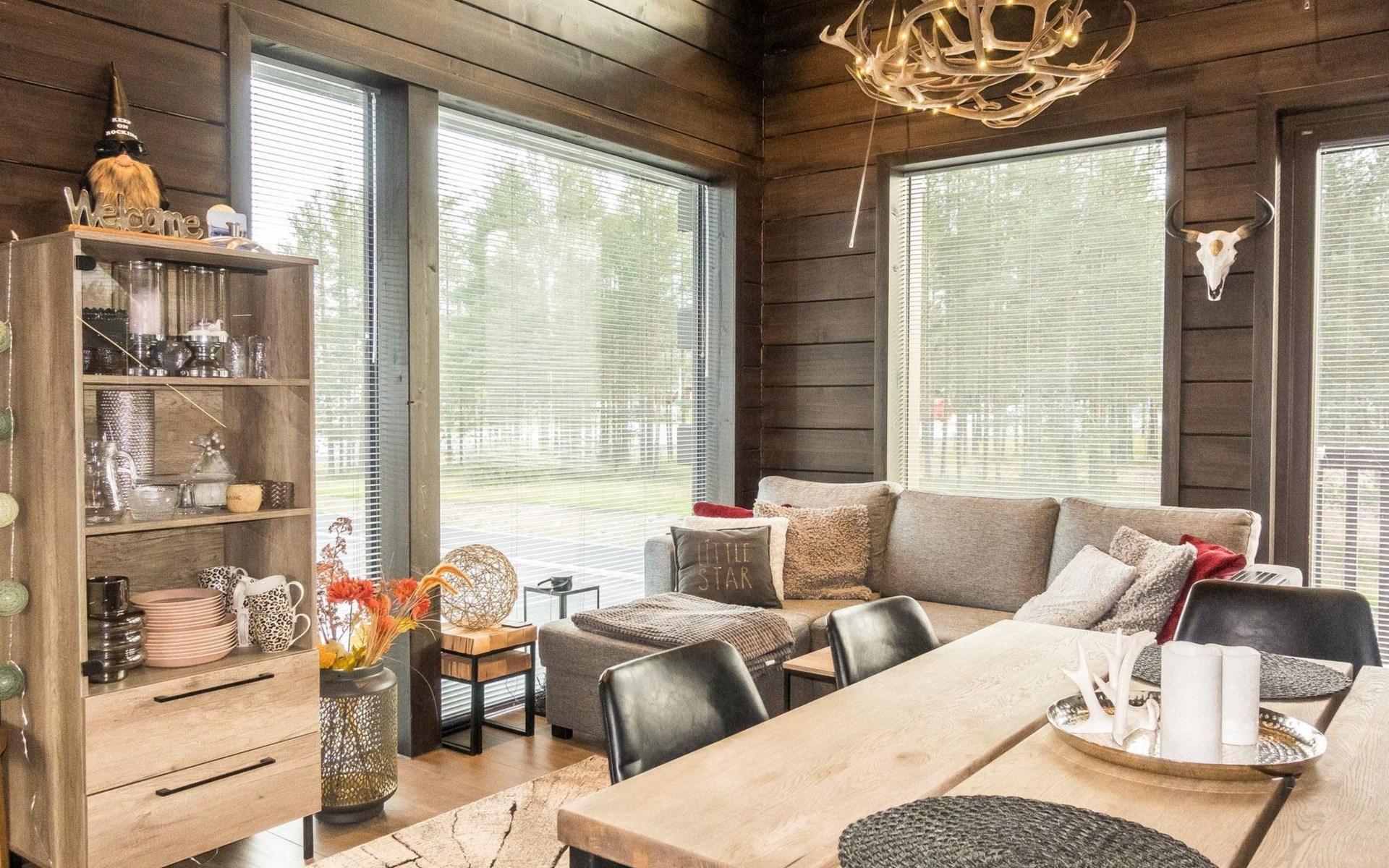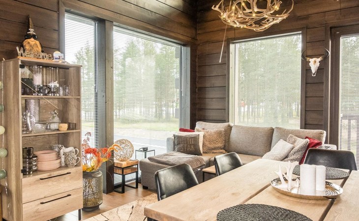 The bedroom has a folding door. The sauna and bathroom are also on this floor. There is access to a balcony from the living area.
