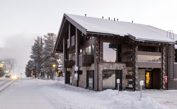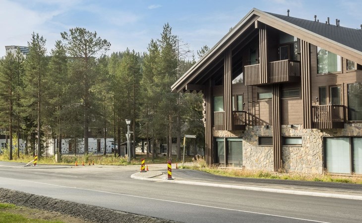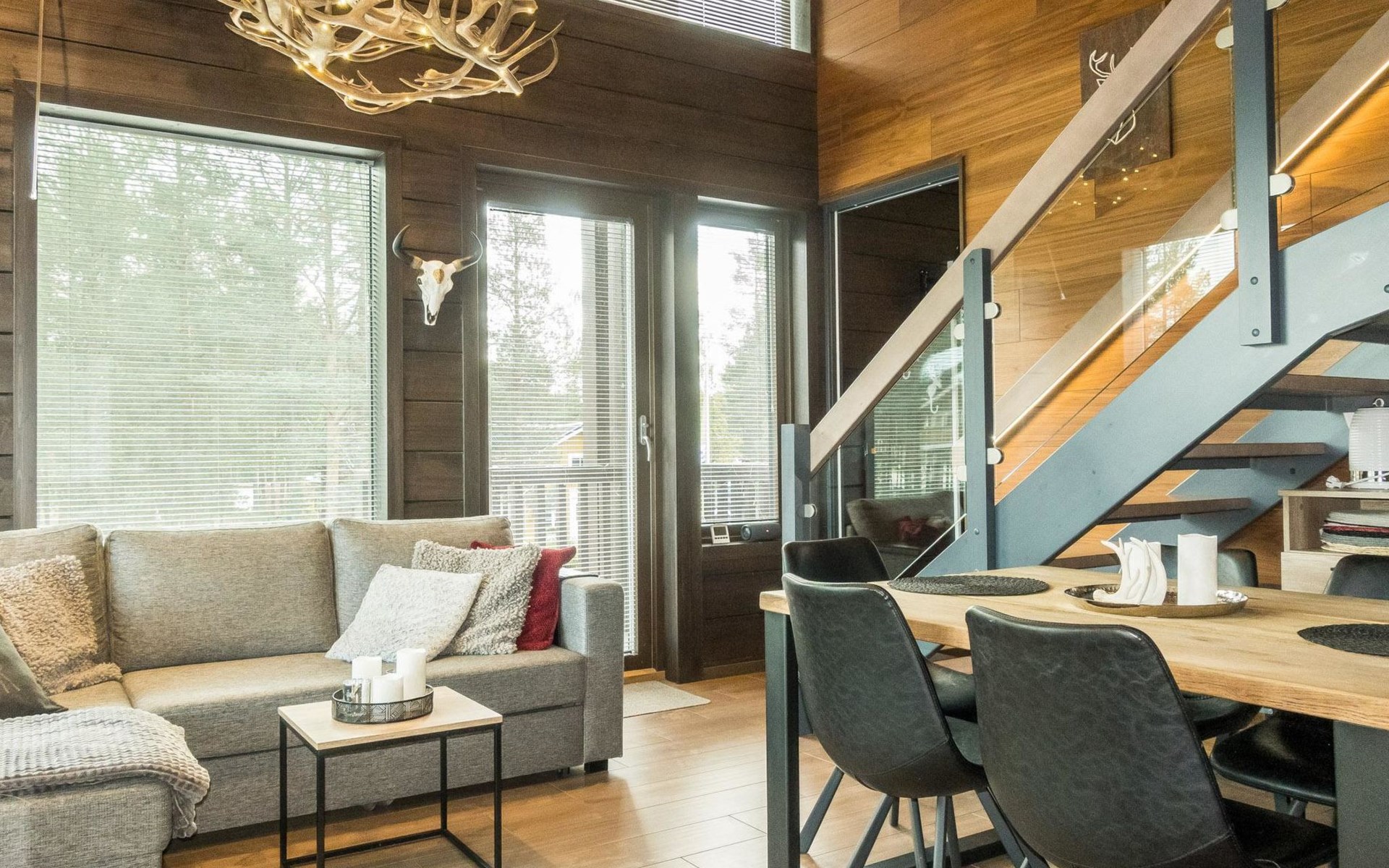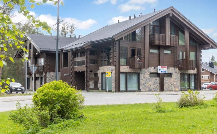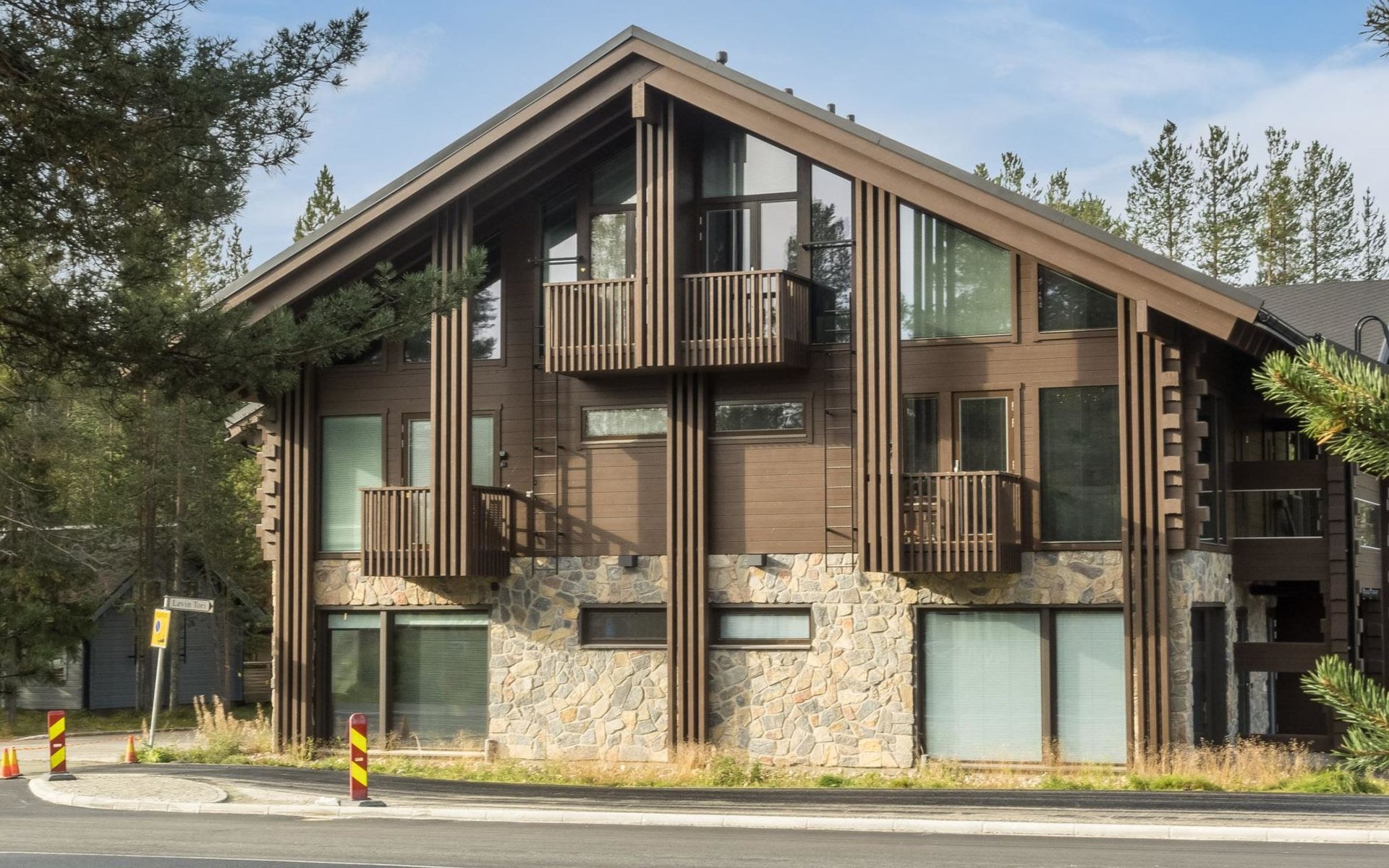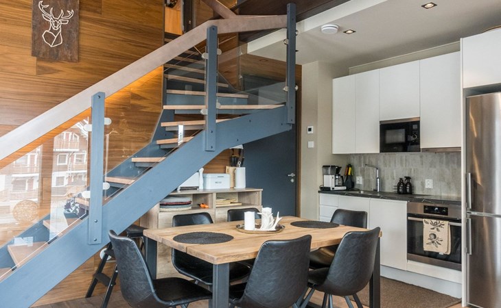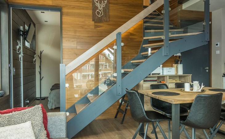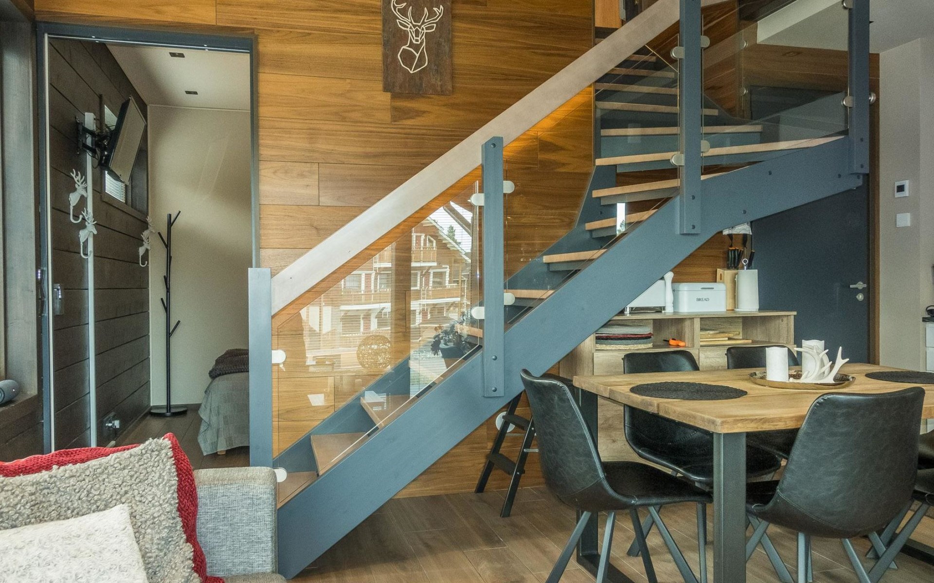 Platinum 2 is a second-floor apartment in an alpine-style house. Access to the second floor is via outdoor stairs.