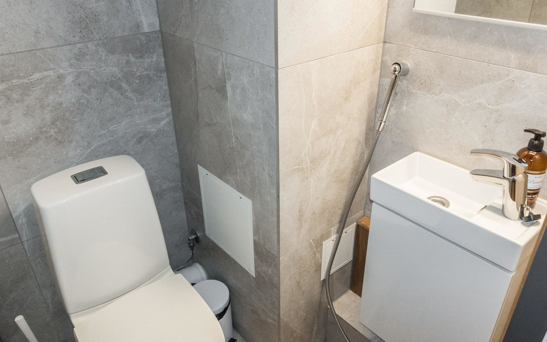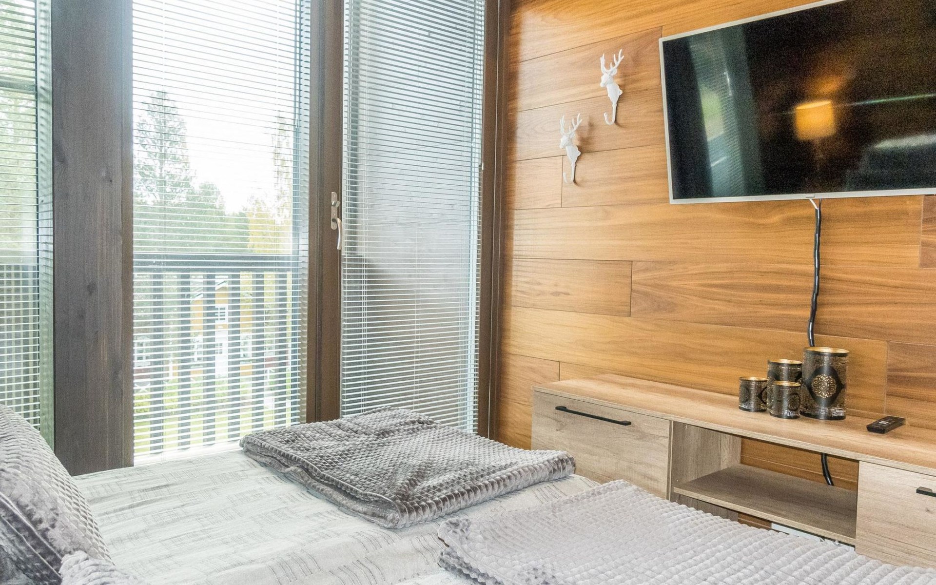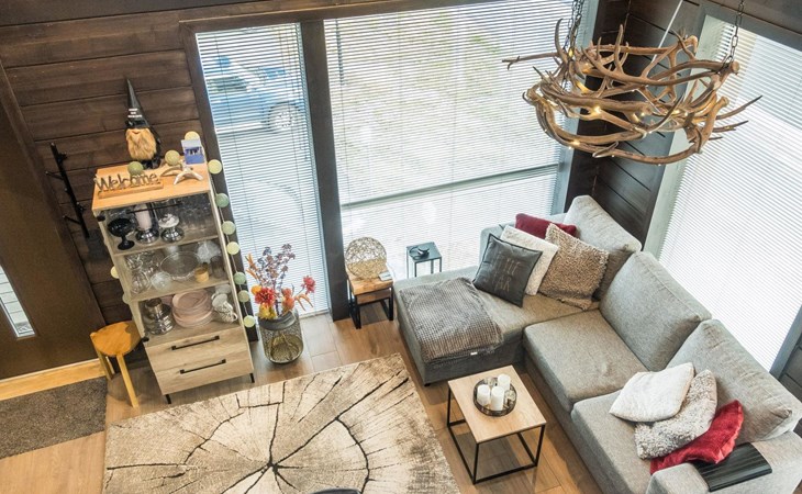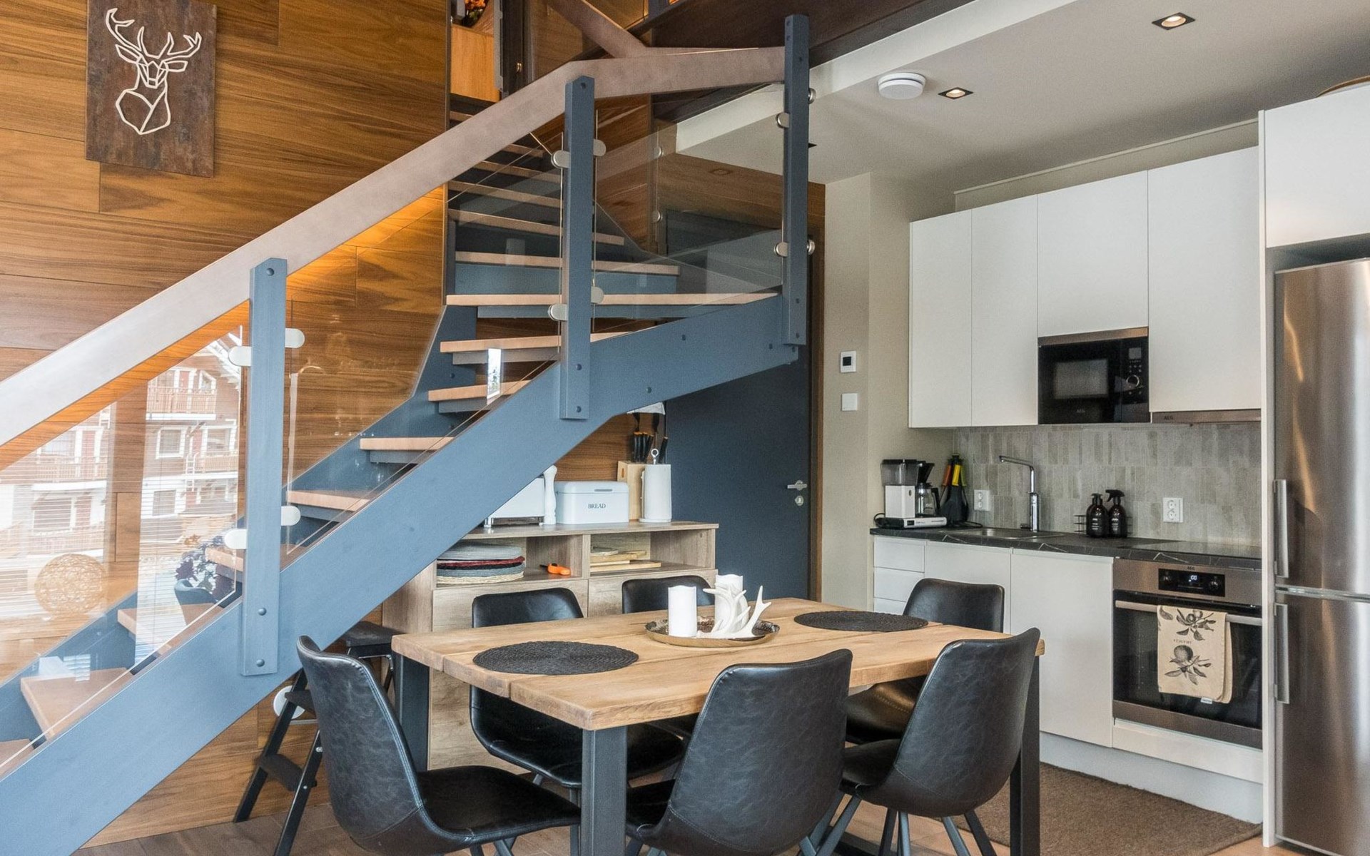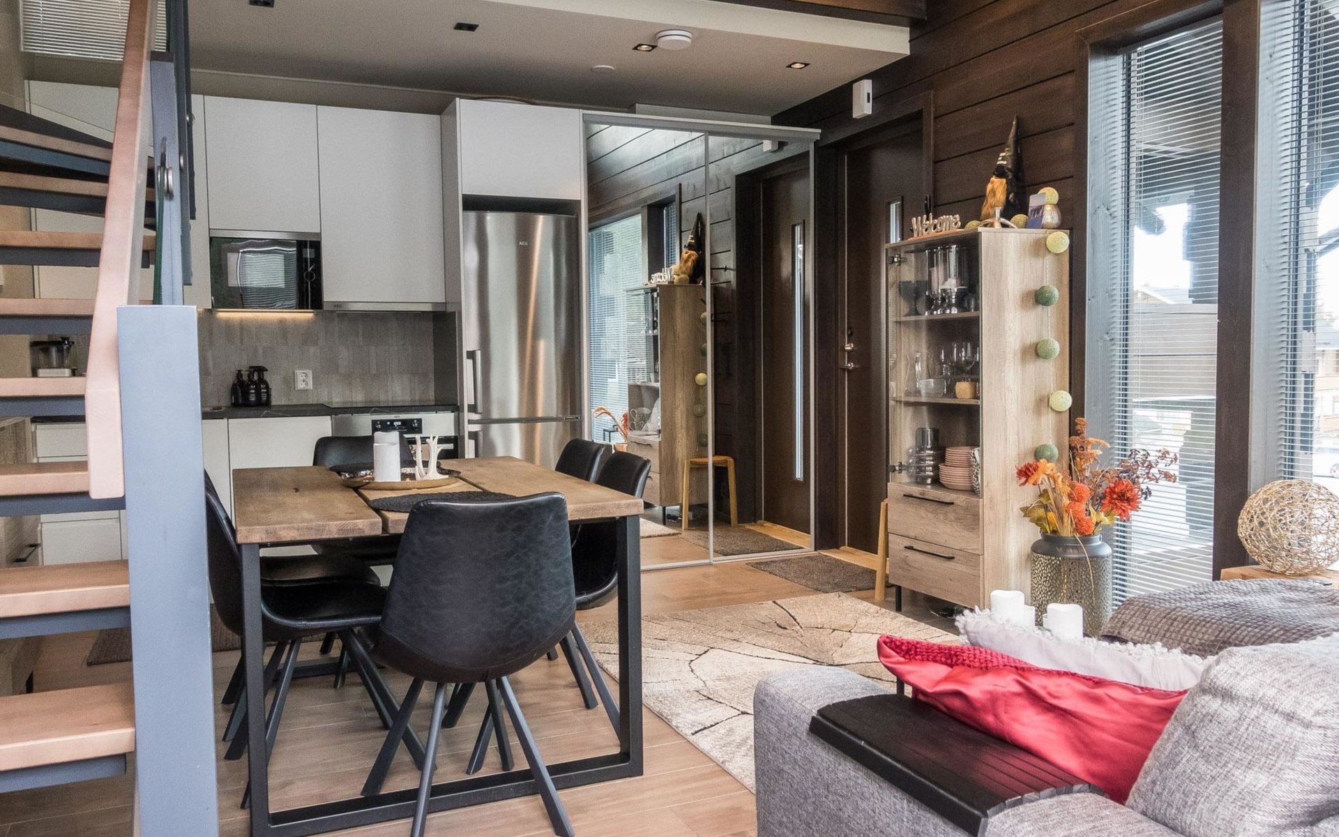 On the entrance level of the apartment, there is an open kitchen and living area, as well as a bedroom with two beds. The living area also features a sofa bed.