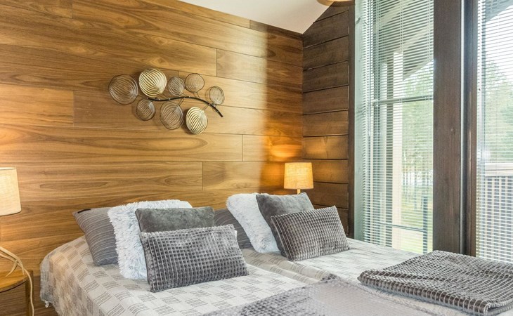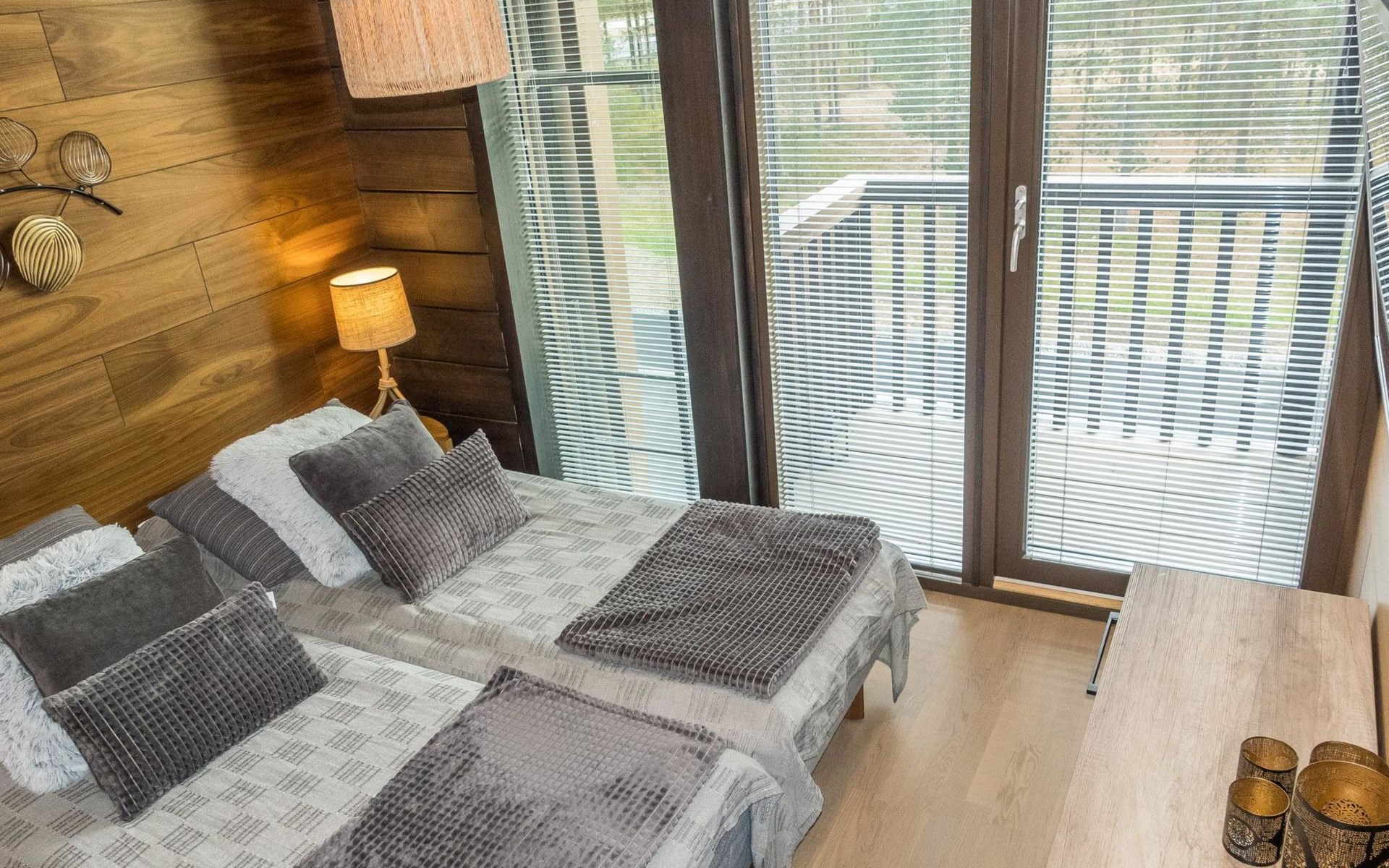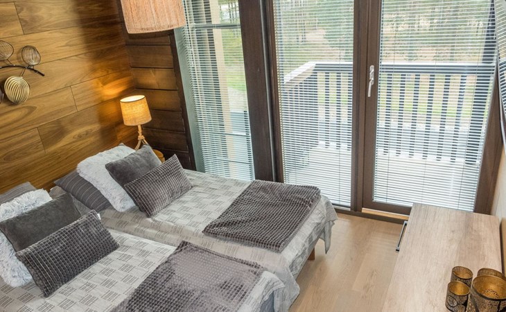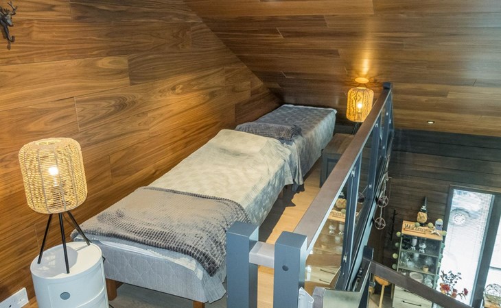 On the upper floor, there is a bedroom with two beds. The bedroom has access to a balcony. There are also two beds on the upper floor loft. The upper floor also includes a WC.