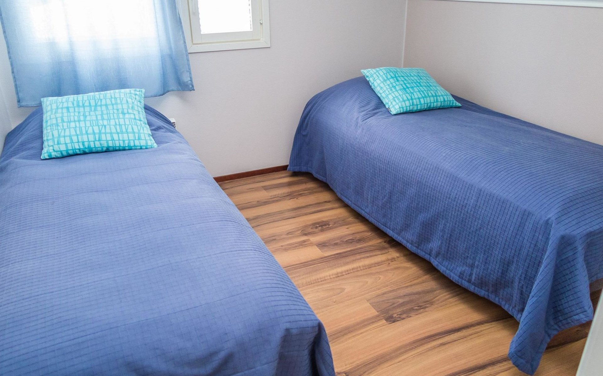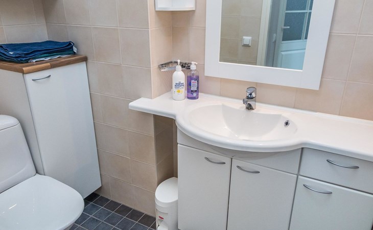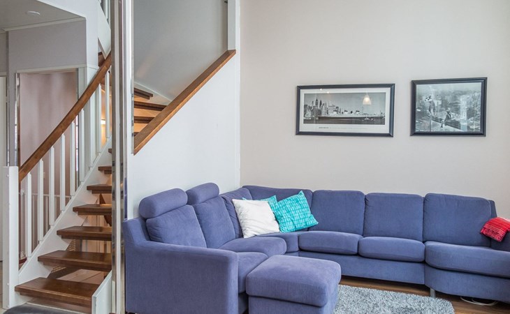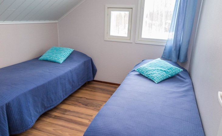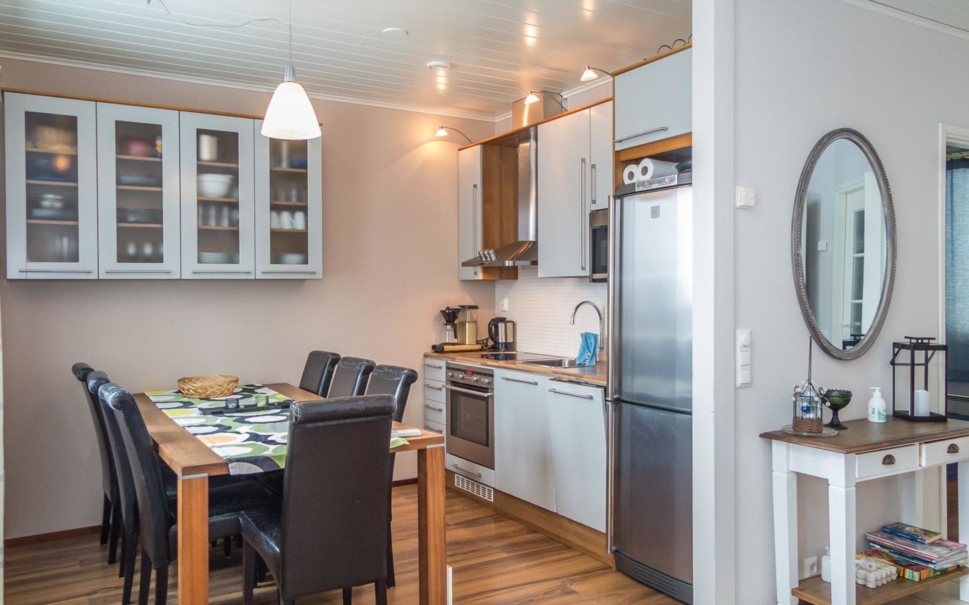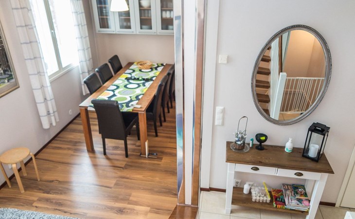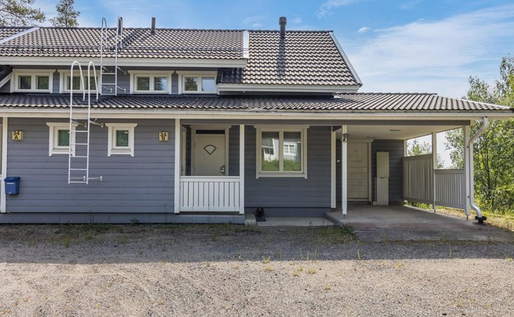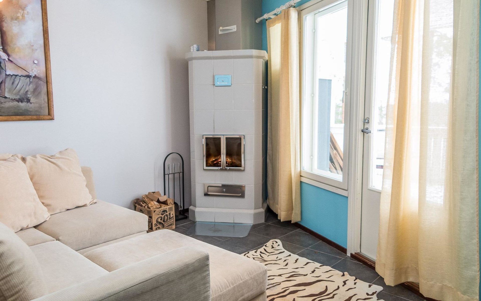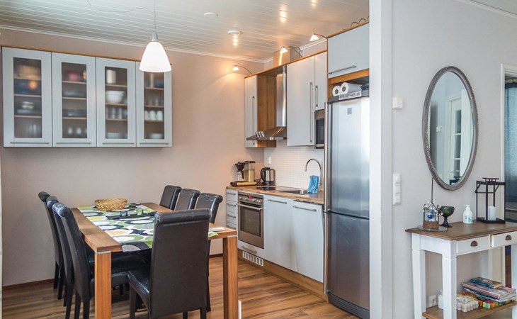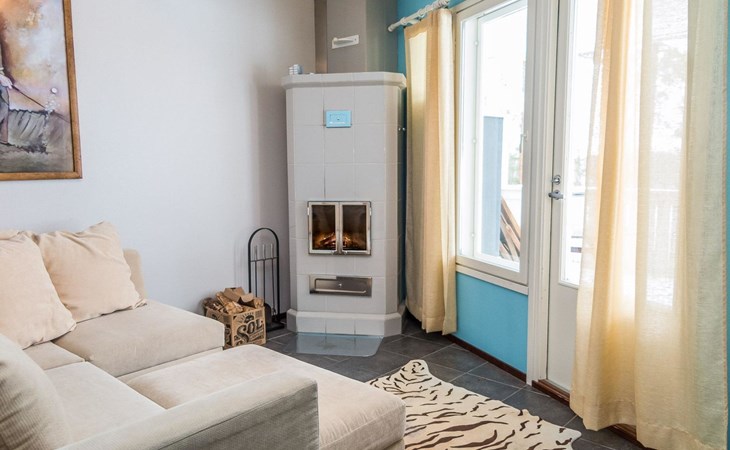 Wooden apartment from 2006, on the middle floor a kitchen, a bedroom with a double bed, an entrance hall, a separate toilet and a terrace. Upstairs, a hall and 2 bedrooms with 2 beds each. Downstairs is a laundry room, a fireplace room with a sofa bed for 2, a utility room, a sauna (electric stove) and a terrace. Air source heat pump, which also has cooling.