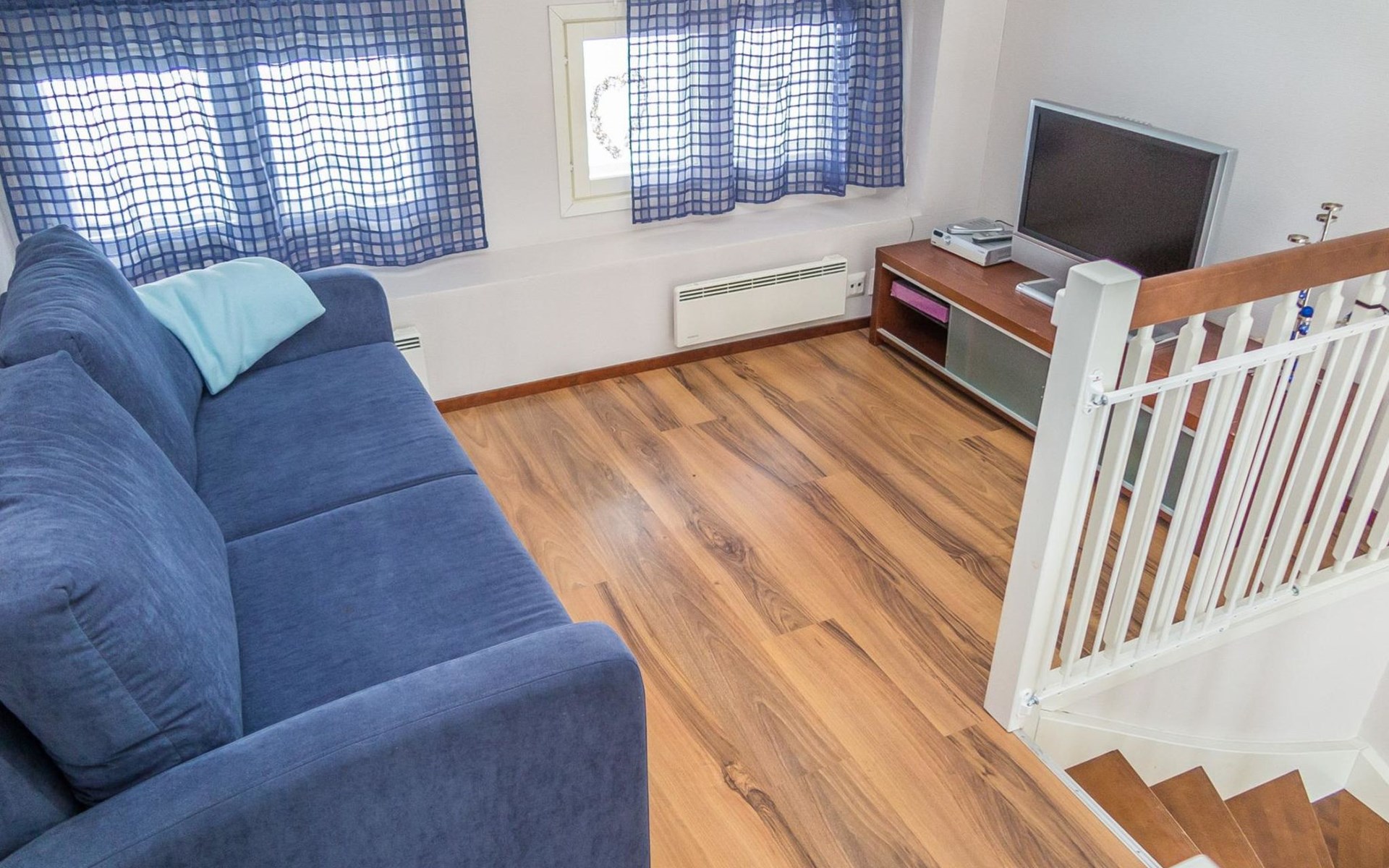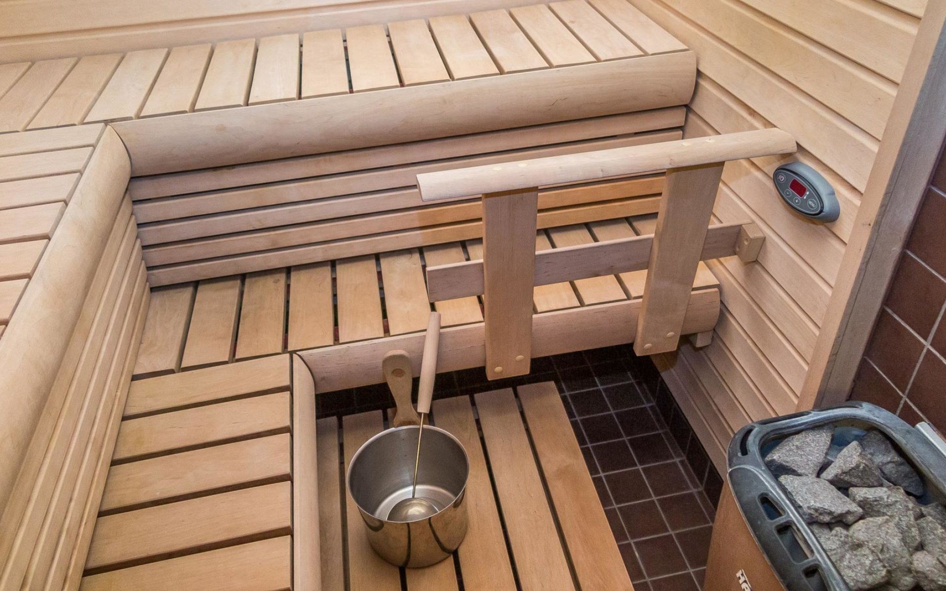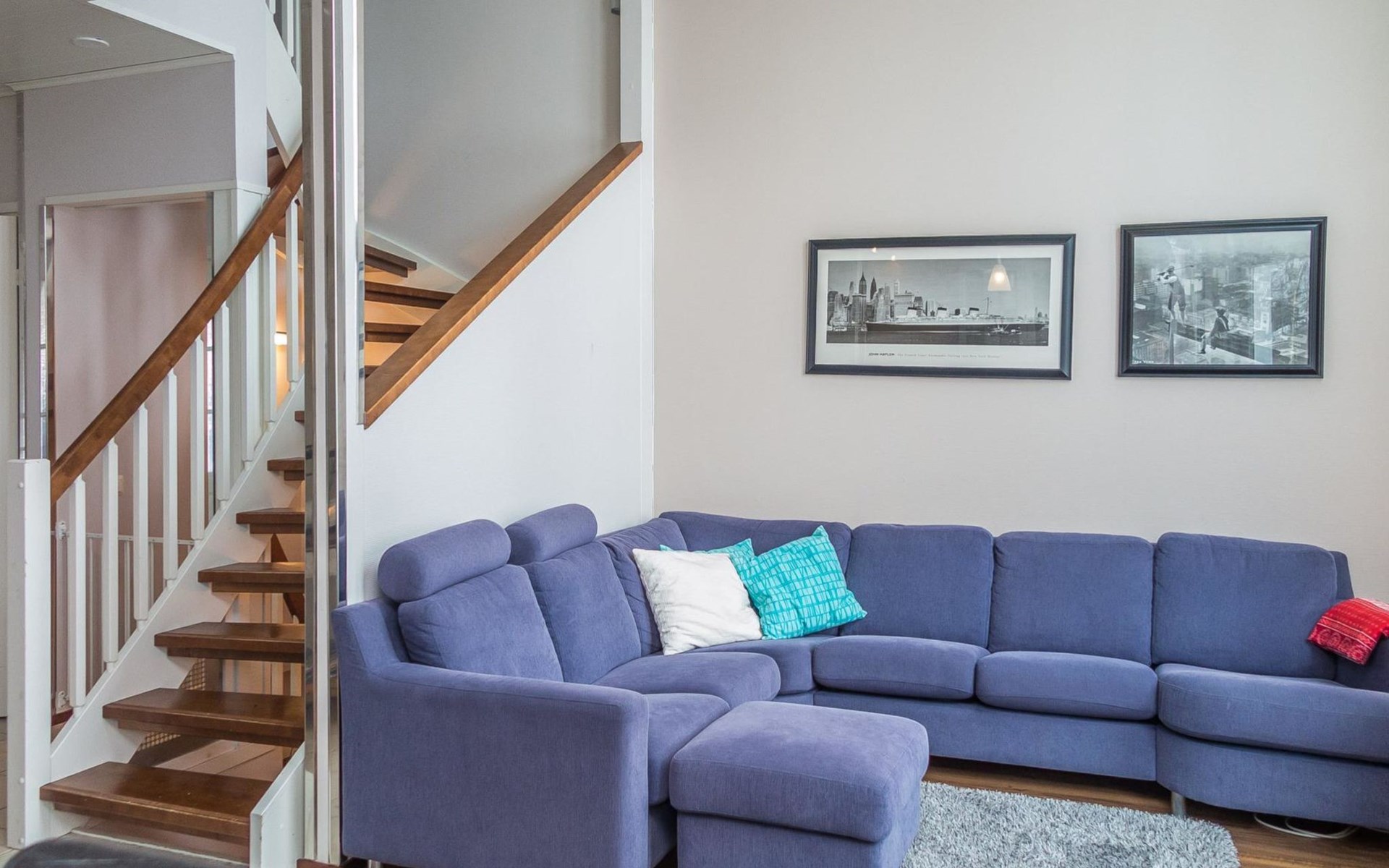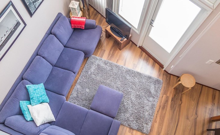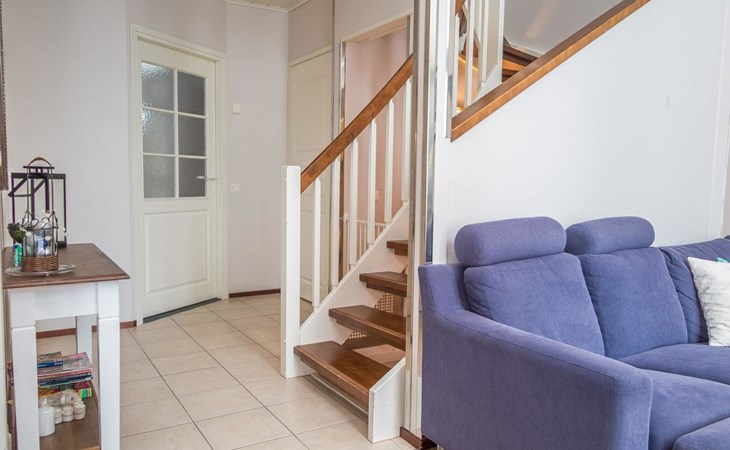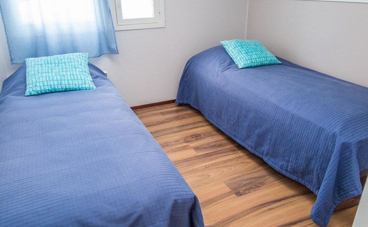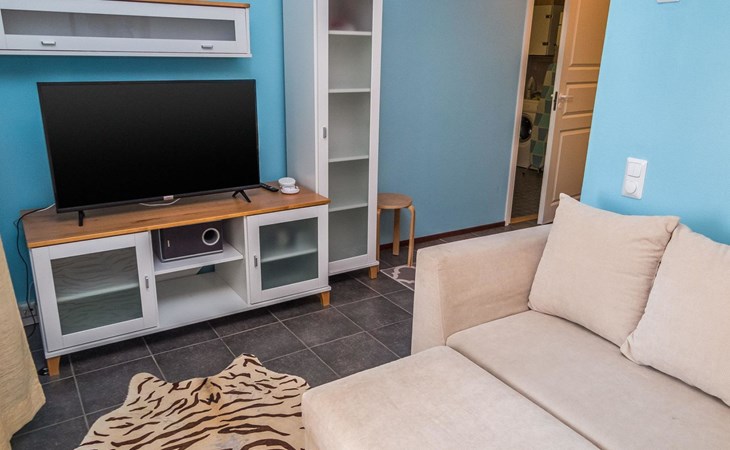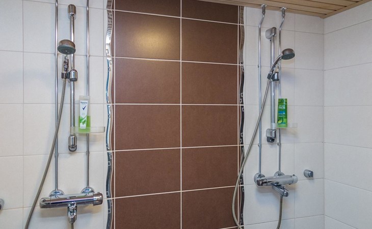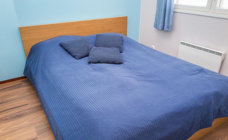 Wooden apartment from 2006, on the middle floor a kitchen, a bedroom with a double bed, an entrance hall, a separate toilet and a terrace. Upstairs, a hall and 2 bedrooms with 2 beds each. Downstairs is a laundry room, a fireplace room with a sofa bed for 2, a utility room, a sauna (electric stove) and a terrace. Air source heat pump, which also has cooling.
