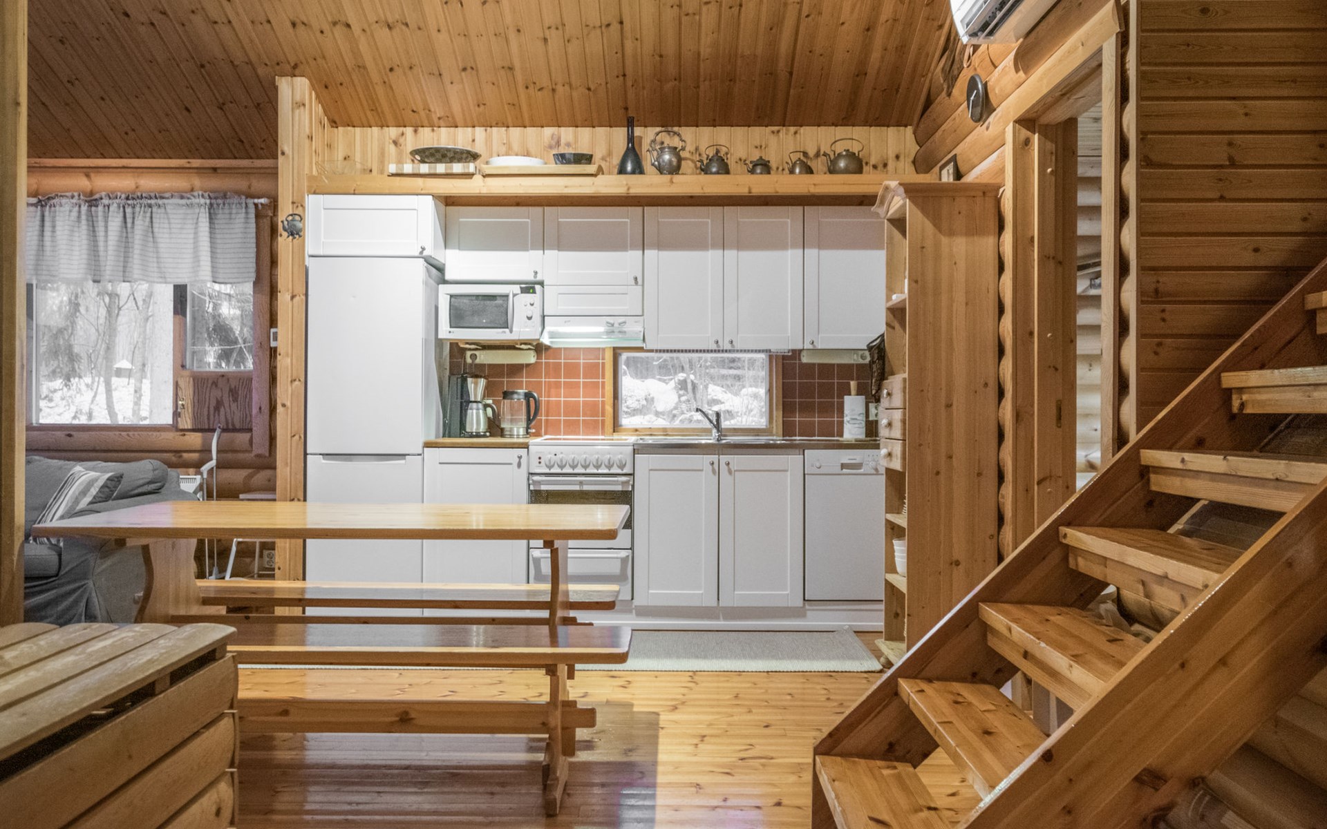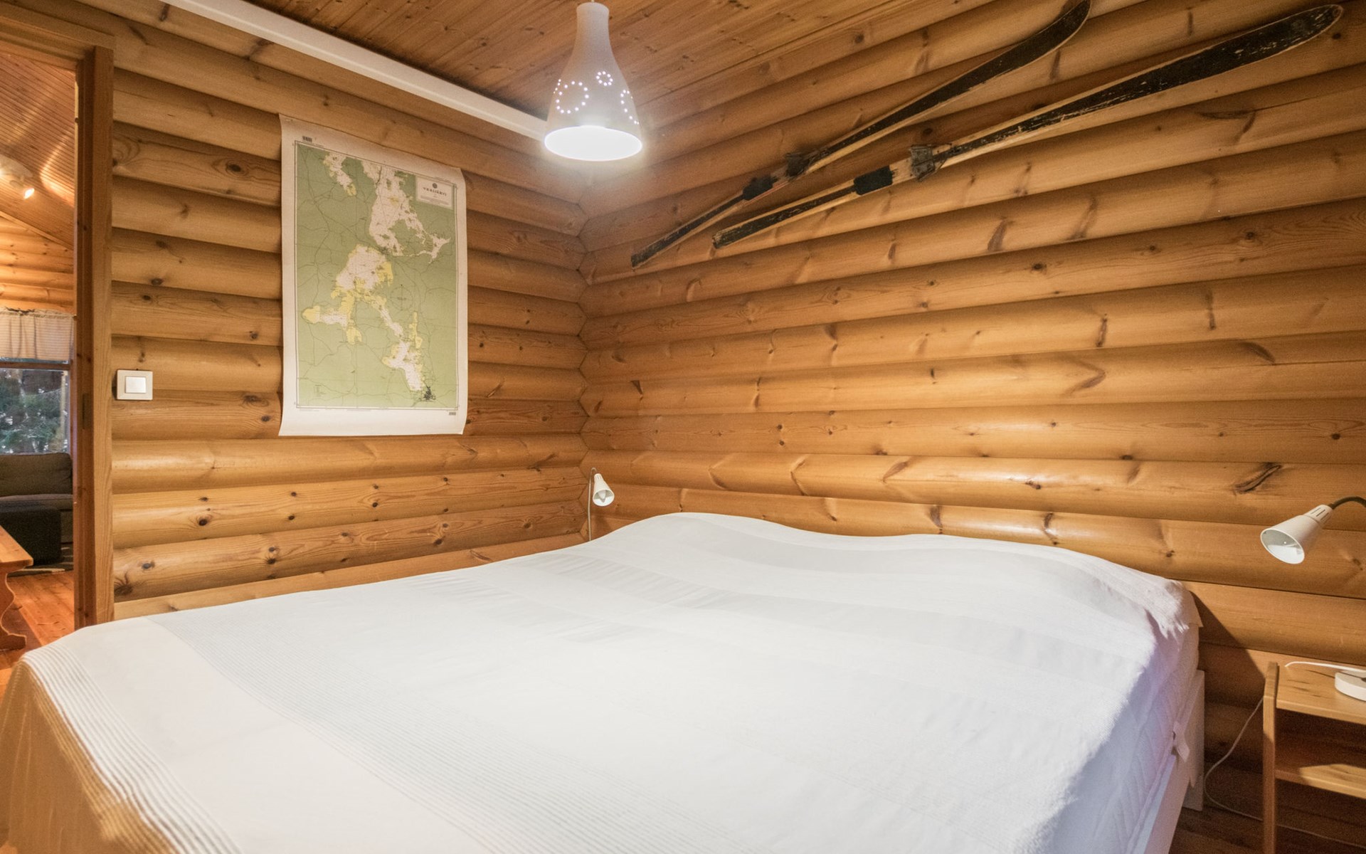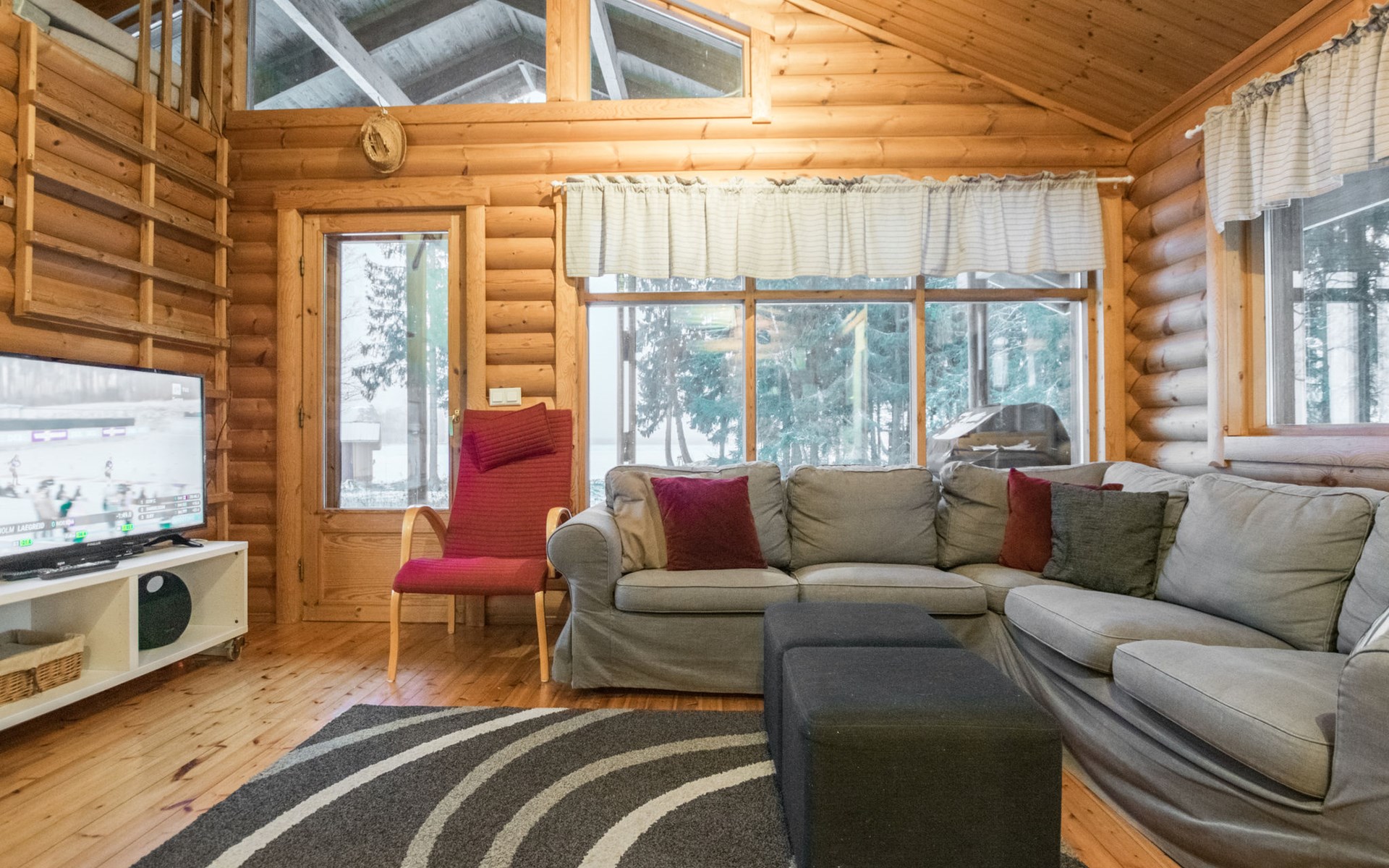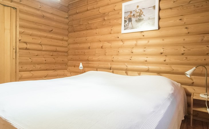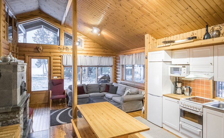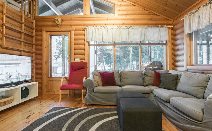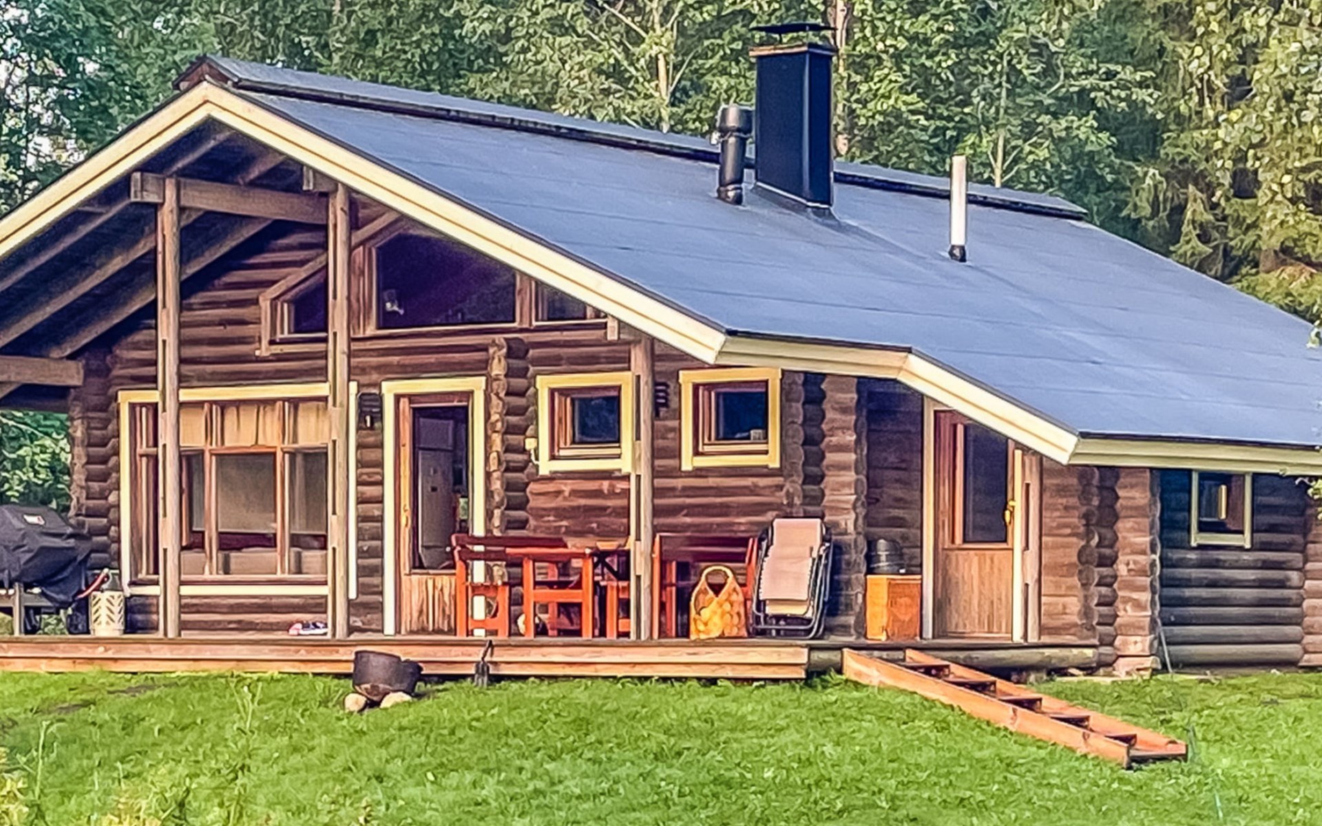 Wooden/log cottage 1994, living room/kitchen, bedroom 2 beds, second bedroom double bed, sleeping loft with folding door 2 beds and 2 mattresses, dressing room (convertible sofa as an alternative sleeping Place) , washroom, sauna (electric stove). Gas grill on the terrace.