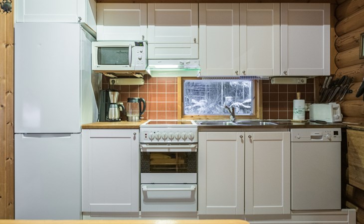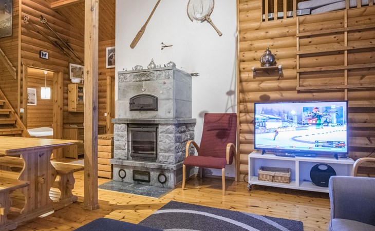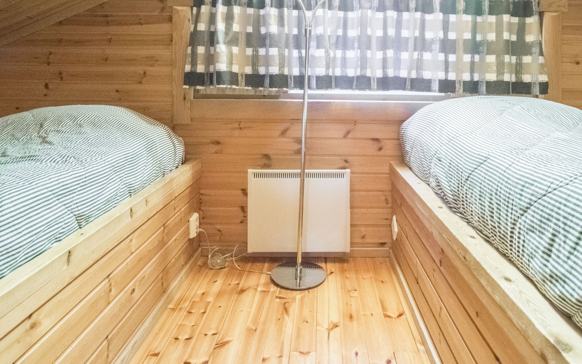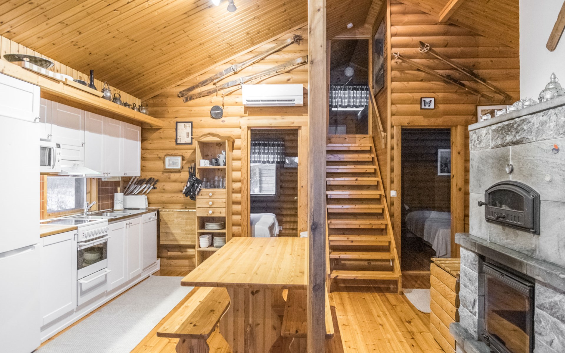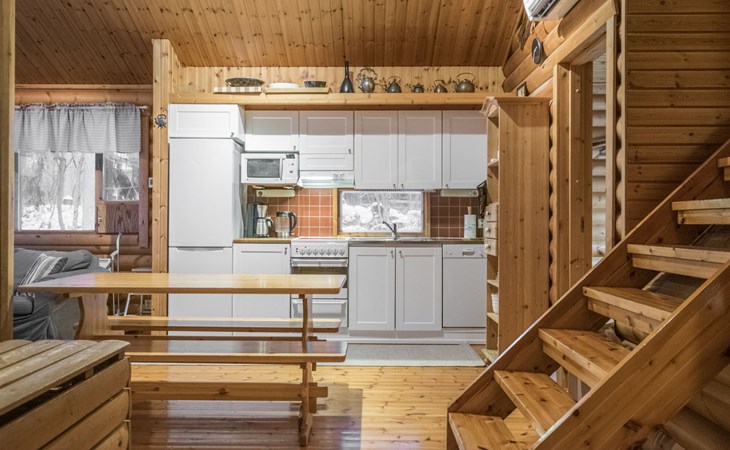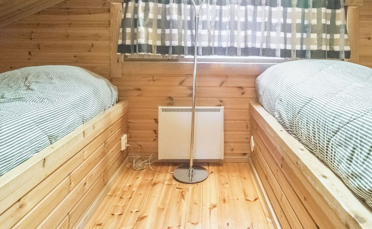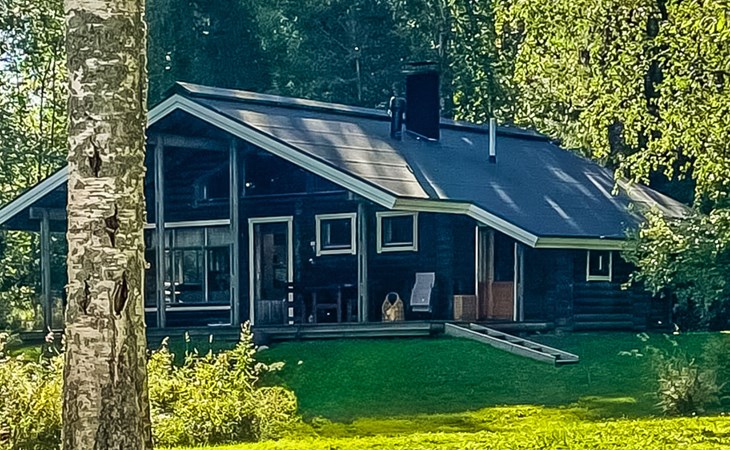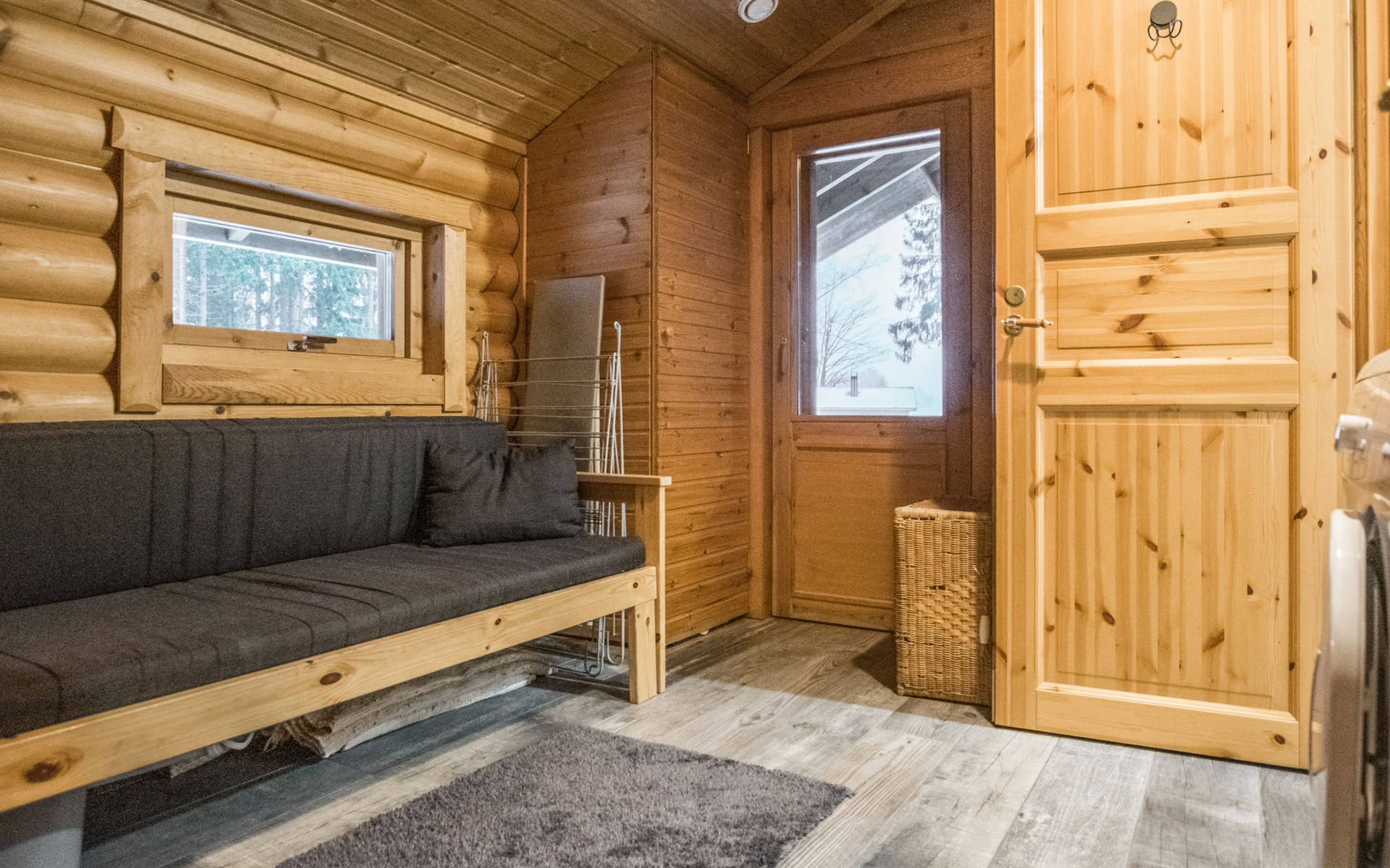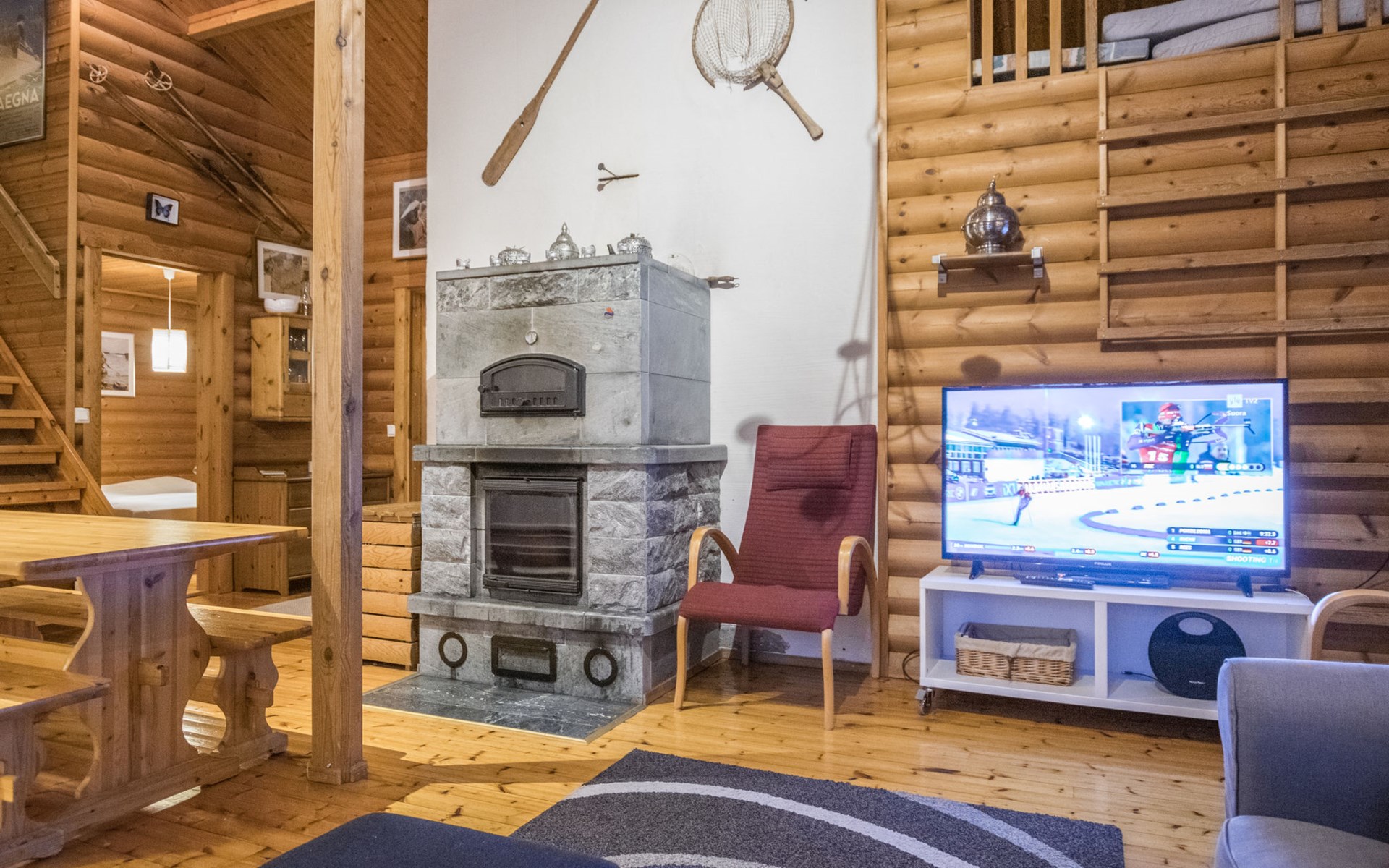 Wooden/log cottage 1994, living room/kitchen, bedroom 2 beds, second bedroom double bed, sleeping loft with folding door 2 beds and 2 mattresses, dressing room (convertible sofa as an alternative sleeping Place) , washroom, sauna (electric stove). Gas grill on the terrace.
