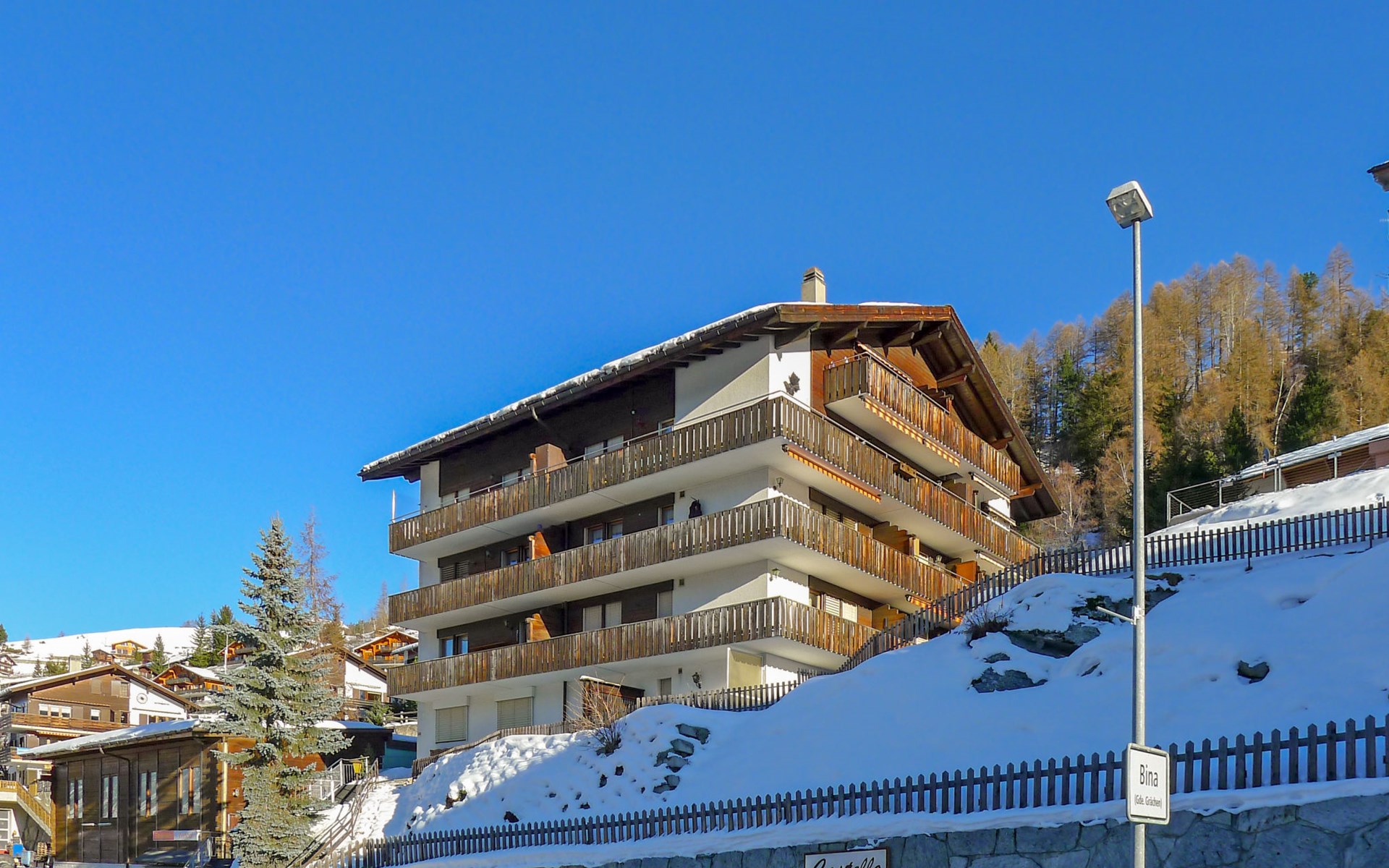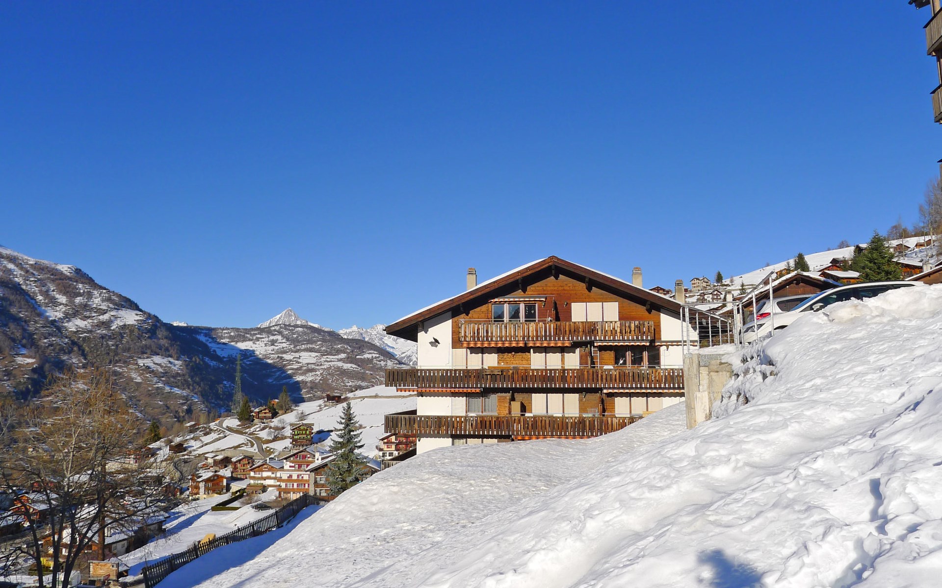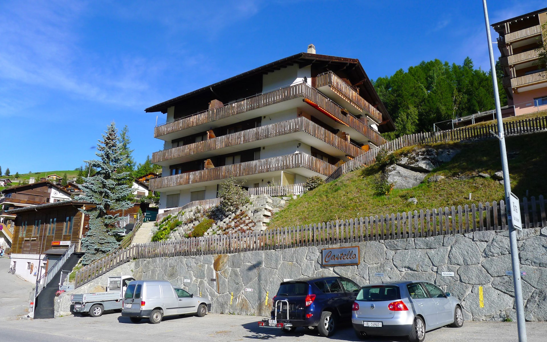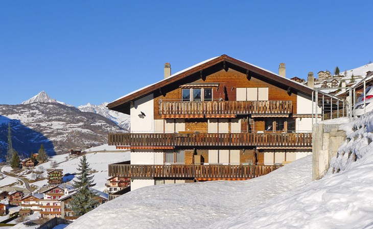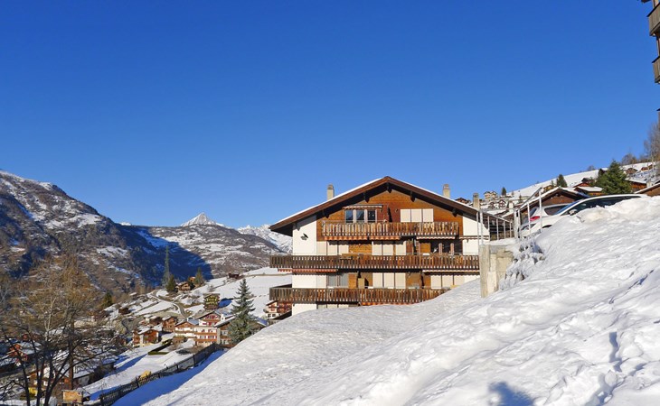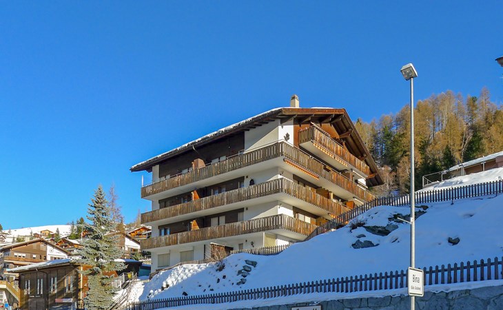 Gezellig appartementencomplex "Castello", 1.600 m boven zeeniveau, van 5 verdiepingen, bouwjaar 1980. In de plaats, 500 m van het centrum, rustige, zonnige ligging tegen een helling, 500 m van het skigebied. In het huis: lift, berging voor ski's, centrale verwarming, wasmachine, droger (voor medegebruik, extra), droogruimte. Toegangsweg tot aan het huis (bergweg). Trappenweg naar het huis. Parkeerplaats bij het huis. Levensmiddelenwinkel 500 m, supermarkt, restaurant, bushalte 200 m. Kabelbaan op, ski faciliteiten, skipisten, skischool, rodelbaan, kinderspeelplaats 500 m. Bekende skigebieden kunnen gemakkelijk worden bereikt: Zermatt 25 km, Saas Fee 35 km.
