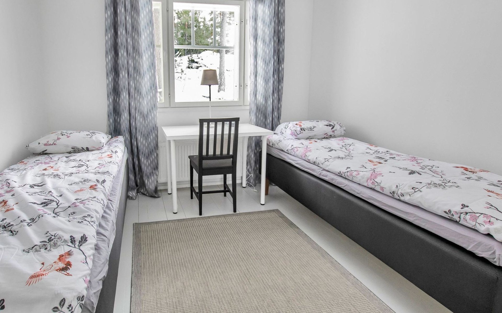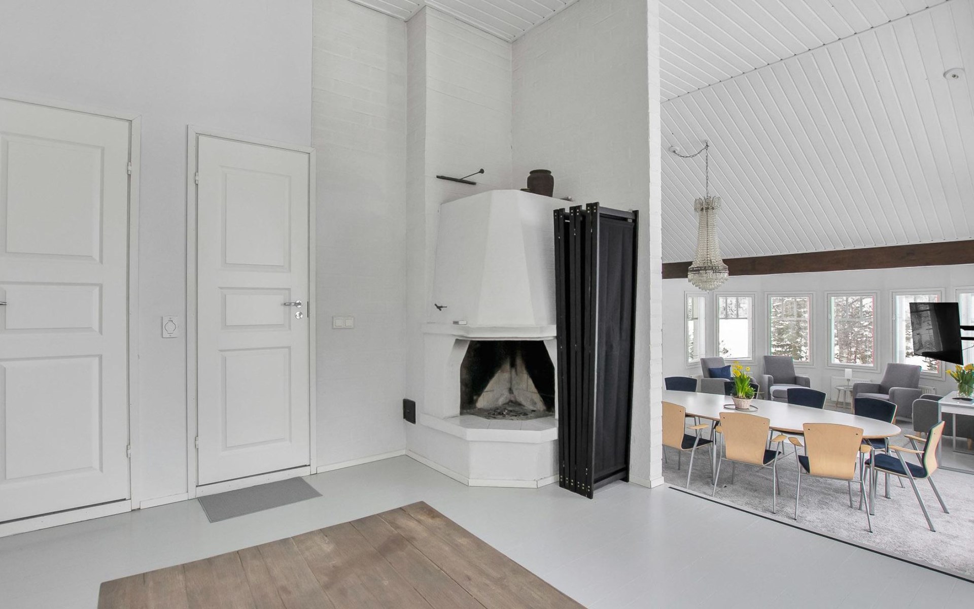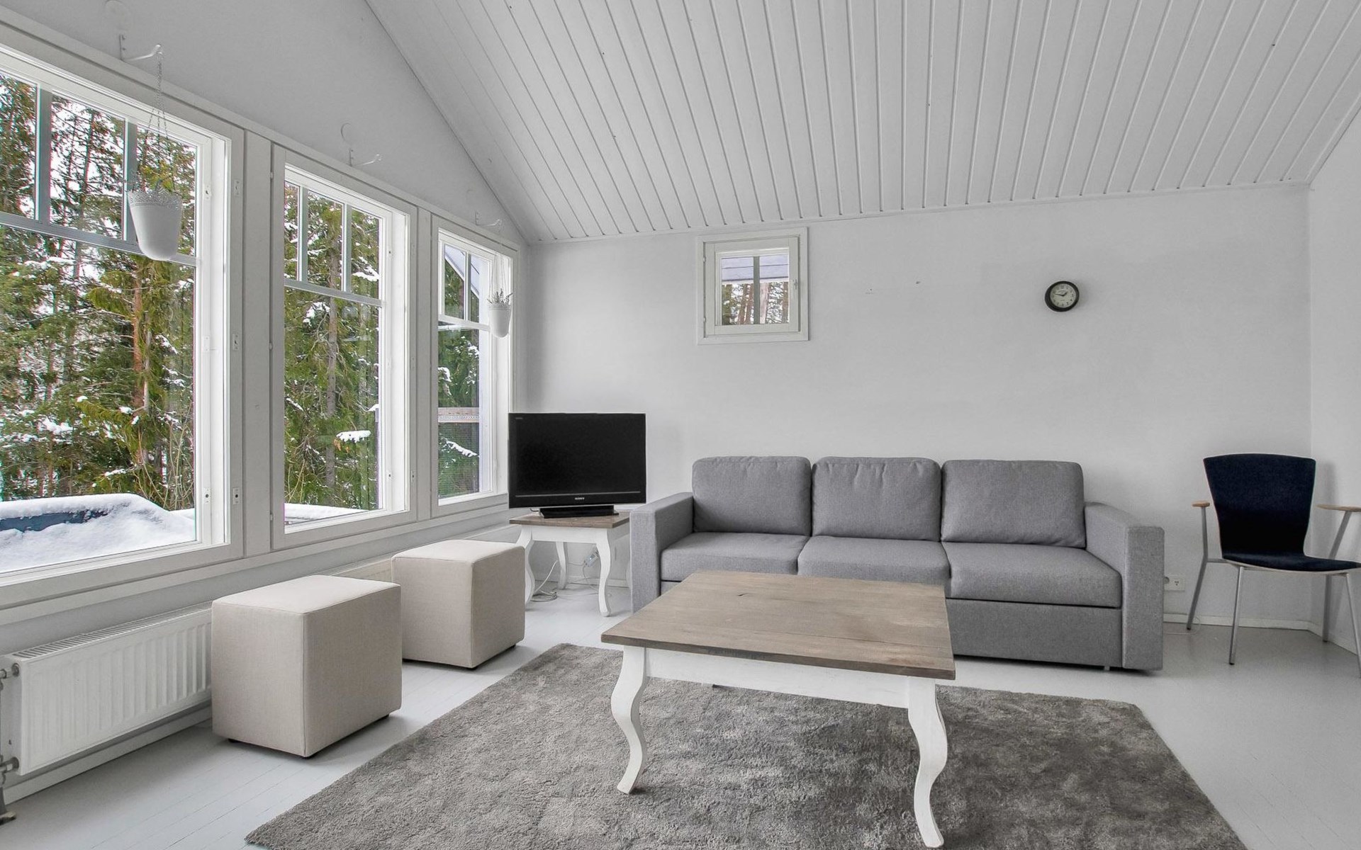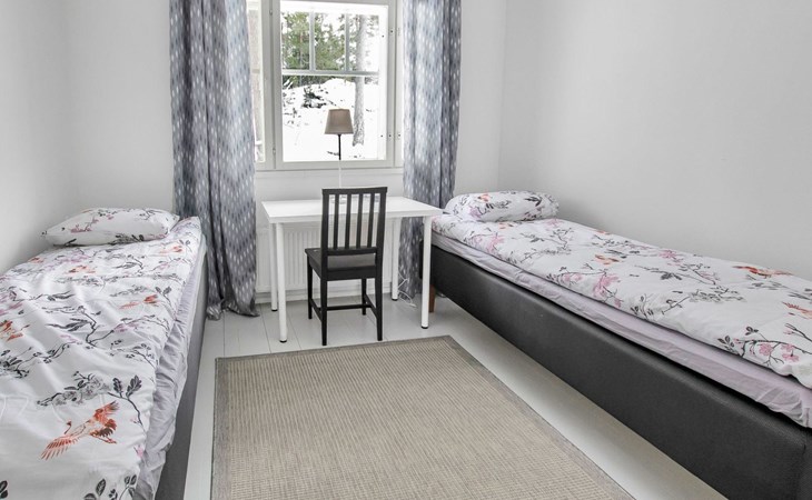 The cabin has 3 bedrooms, each with two separate beds and a sofa bed in the living area. The cabin also has living room / kitchen, fireplace, air source heat pump (cooling), electric sauna, shower, three separate toilets.