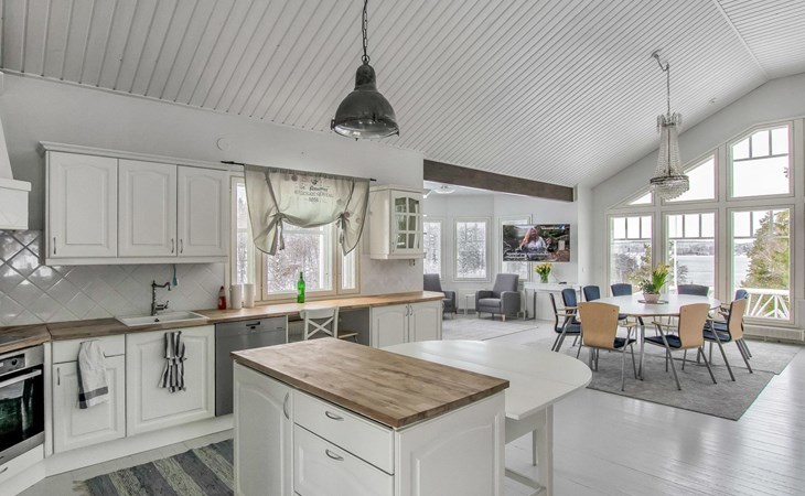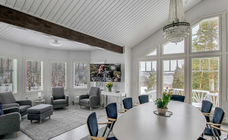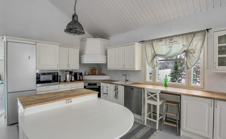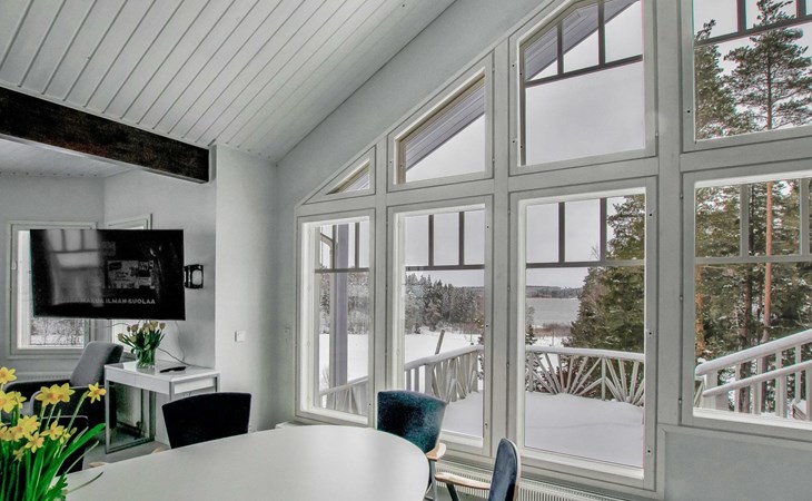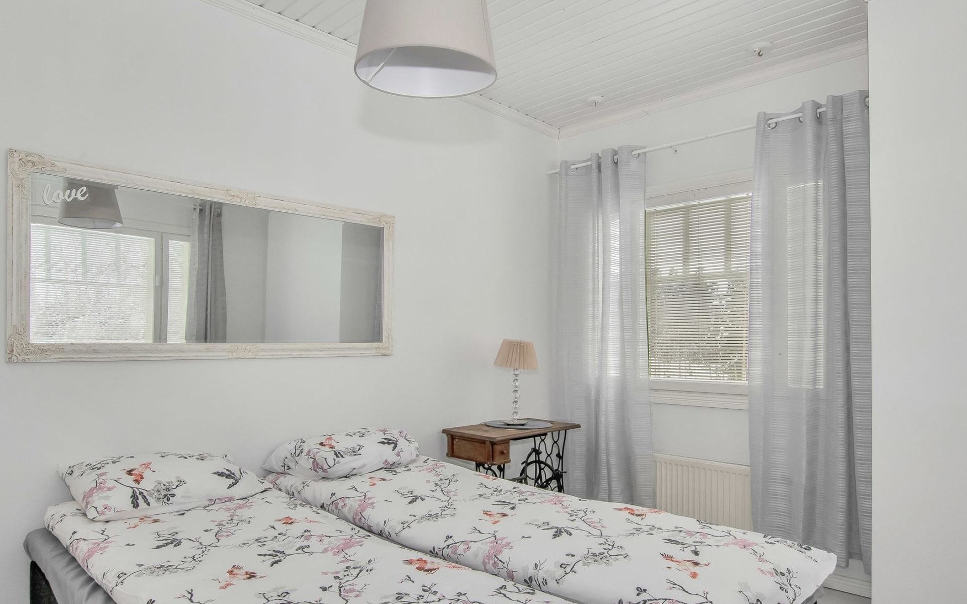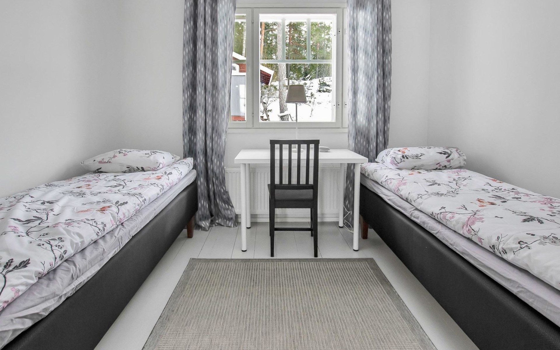 The cabin has 3 bedrooms, each with two separate beds and a sofa bed in the living area. The cabin also has living room / kitchen, fireplace, air source heat pump (cooling), electric sauna, shower, three separate toilets.