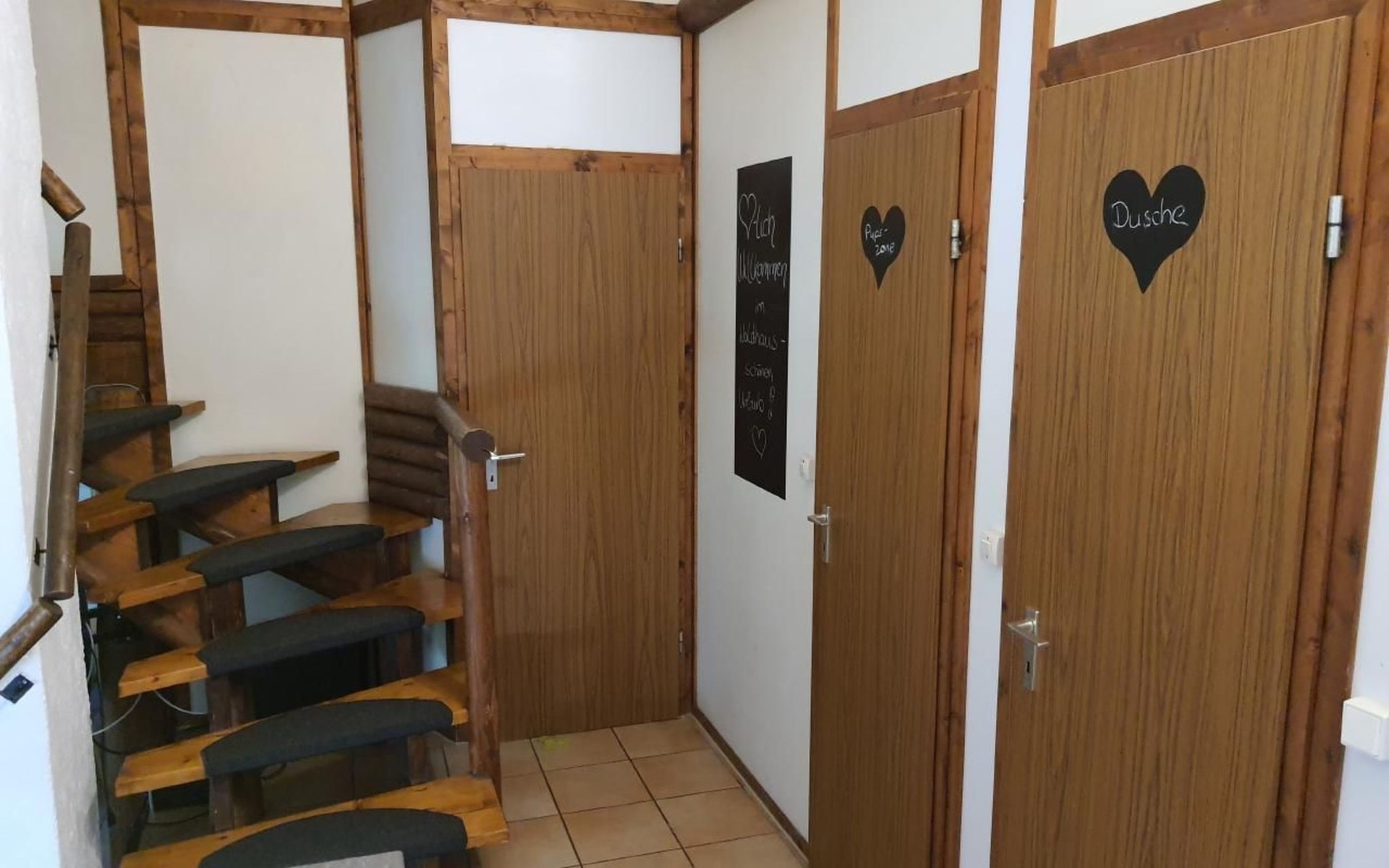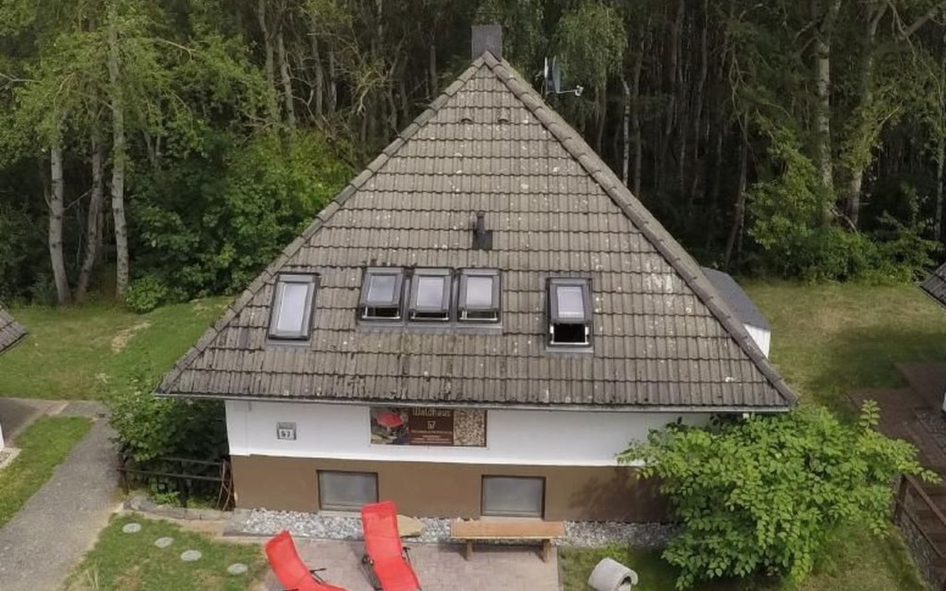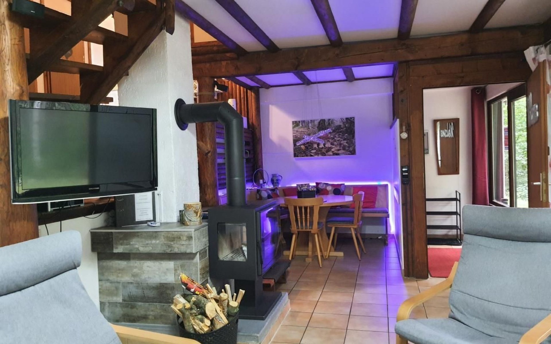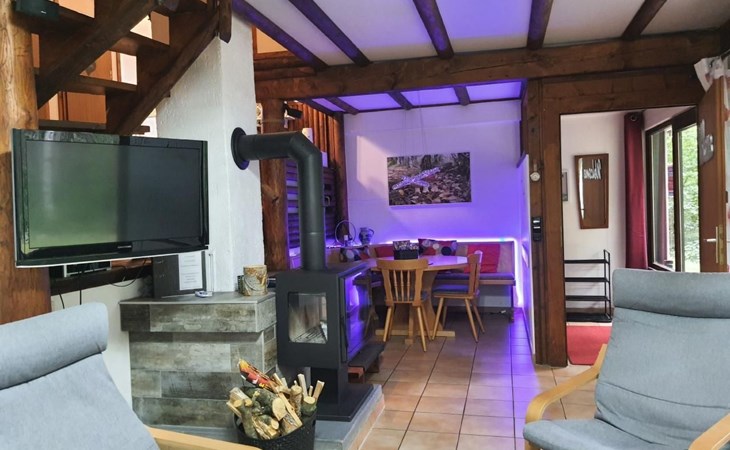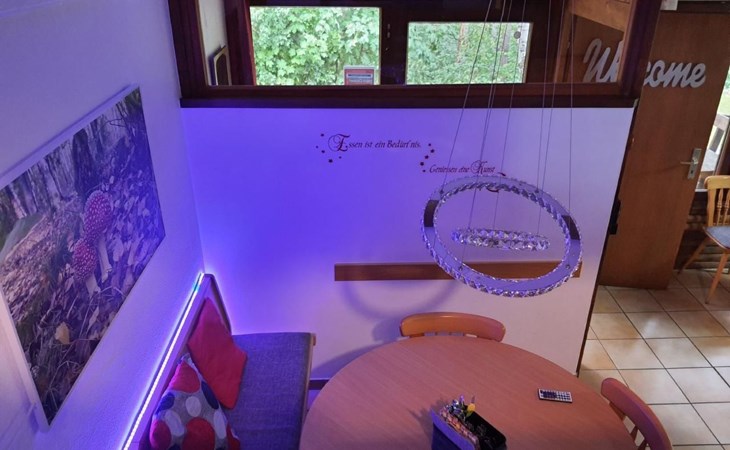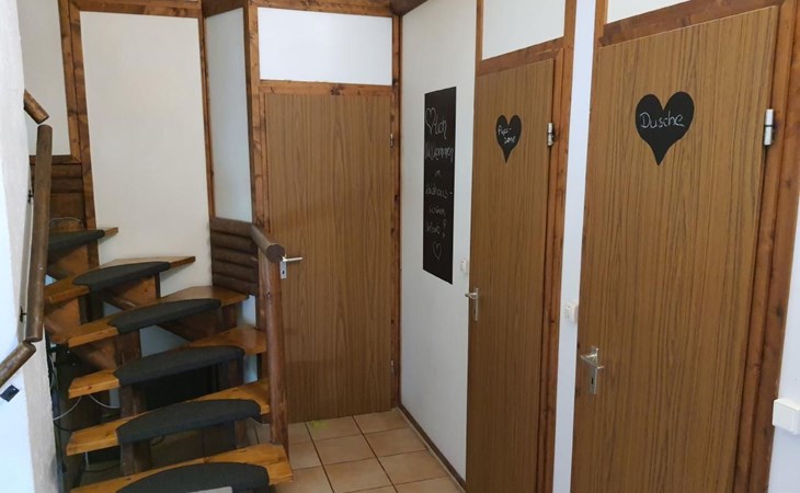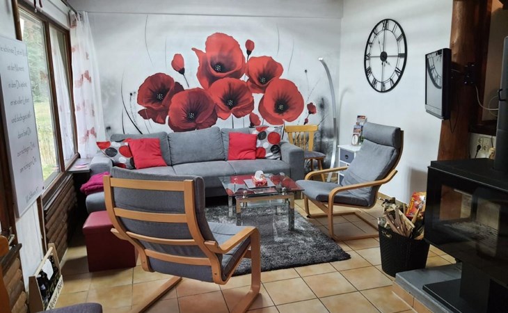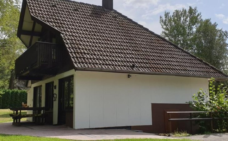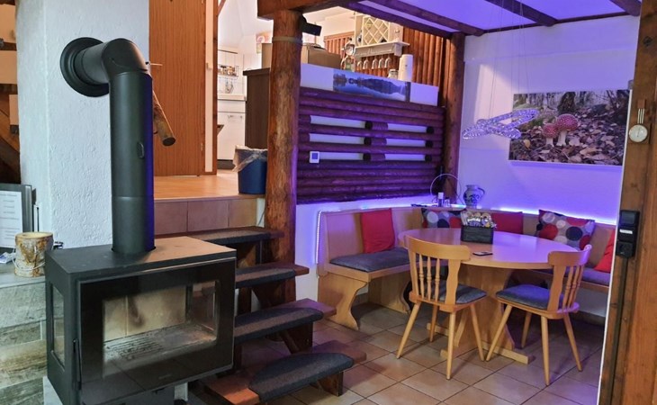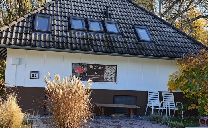 Our forest house is located at the end of the holiday park and is the furthest away from the forest. Are you looking for peace and relaxation in nature, with a lake and forest, surrounded by your loved ones?Then our Waldhaus 57 is the right place for you!We're glad you're here!Our house is equipped for 4-6 people:A living room with couch and two relaxing chairs, TV, DVD and Dolby surround system. The fireplace and modern infrared heating panels provide warmth and cosiness.The dining area offers enough space to comfortably seat 6 people.The high-quality kitchen is equipped with a large fridge, freezer (3 compartments), oven, ceramic hob, large sink and a dishwasher, toaster, coffee machine or Nespresso machine, pressure cooker, blender, and crockery & cutlery for 12 people. From the kitchen you have a beautiful view into the living room and down to the forest.The house has two toilets, a separate shower and three bedrooms:Butterfly room: box spring bed and separate WCSunflower room: a double bed and washbasin Owl room: with two single beds and washbasin The upper bedrooms each have access to the balcony.All bedrooms have fitted wardrobes and ample storage space.The ground floor is brick-built, the roof area with the sloping bedrooms is a wooden structure. Therefore, a certain amount of noise and natural creaking of the wood is unavoidable.The outside area offers two terraces, a brick barbecue, rotary clothes dryer, raised bed and car park for loading and unloading.The outdoor area offers two terraces, a brick barbecue, rotary clothes dryer, raised bed and 1 parking space for loading and unloading.Activities around the Silbersee are partly chargeable. Please refer to the respective providers for opening prices and opening times. The offers have nothing to do with the letting of the house.The WLAN is sufficient for private use - however, there is no guarantee for stability and utilisation (home office etc.).The additional costs (cleaning, pet and deposit) are transferred directly to us (landlord) in advance. The consumed electricity and the tourist tax will be deducted from the deposit after the stay and transferred back to us.Linen package (towel, shower towel, sheets and duvet covers) can be booked.* Non-smoking house. You are welcome to use the garden or balcony.* Dog on request* Crockery and any inventory may not be stolen or left in other houses (when booking several holiday homes)* Final cleaning does not include the removal of your own rubbish, emptying the fridge and freezer* Damages must be reported immediatelyDirectly at the Waldhaus you will find hiking trails, cycle paths, a mountain bike course. 5 minutes walk to the swimming lake with fishing possibilities, pedal boat hire. There is a football pitch, a volleyball court, table tennis tables, a mini-golf course and smaller playgrounds. On the other side of the lake there is also a thermal spa with sauna built directly into the lake and a summer toboggan run with beer garden. There is also an indoor playground (Frieloland) and a climbing park. The pony farm is approx. 1.5km away and the Knüll wildlife park is also 10km away.