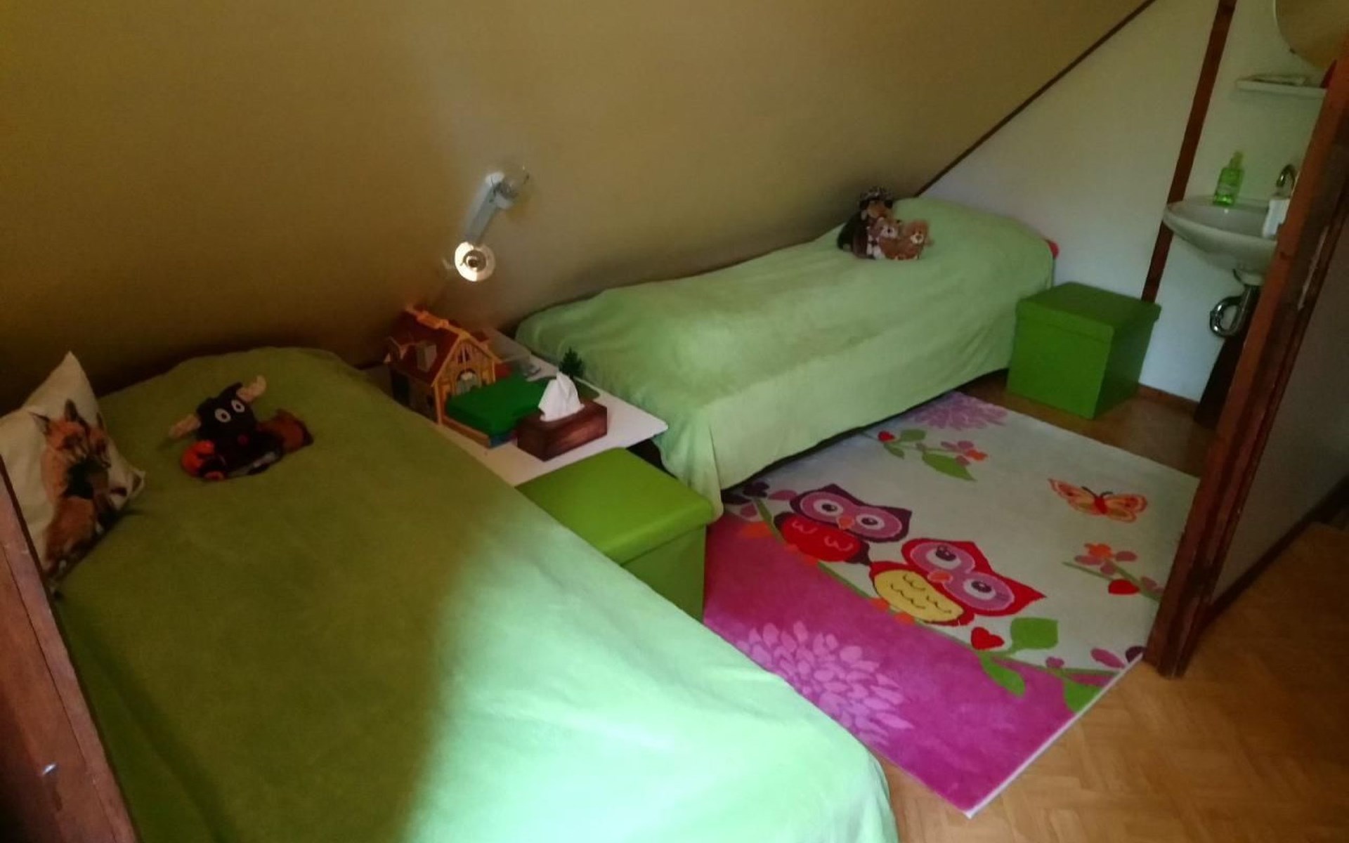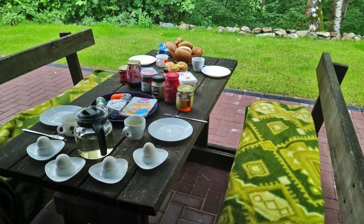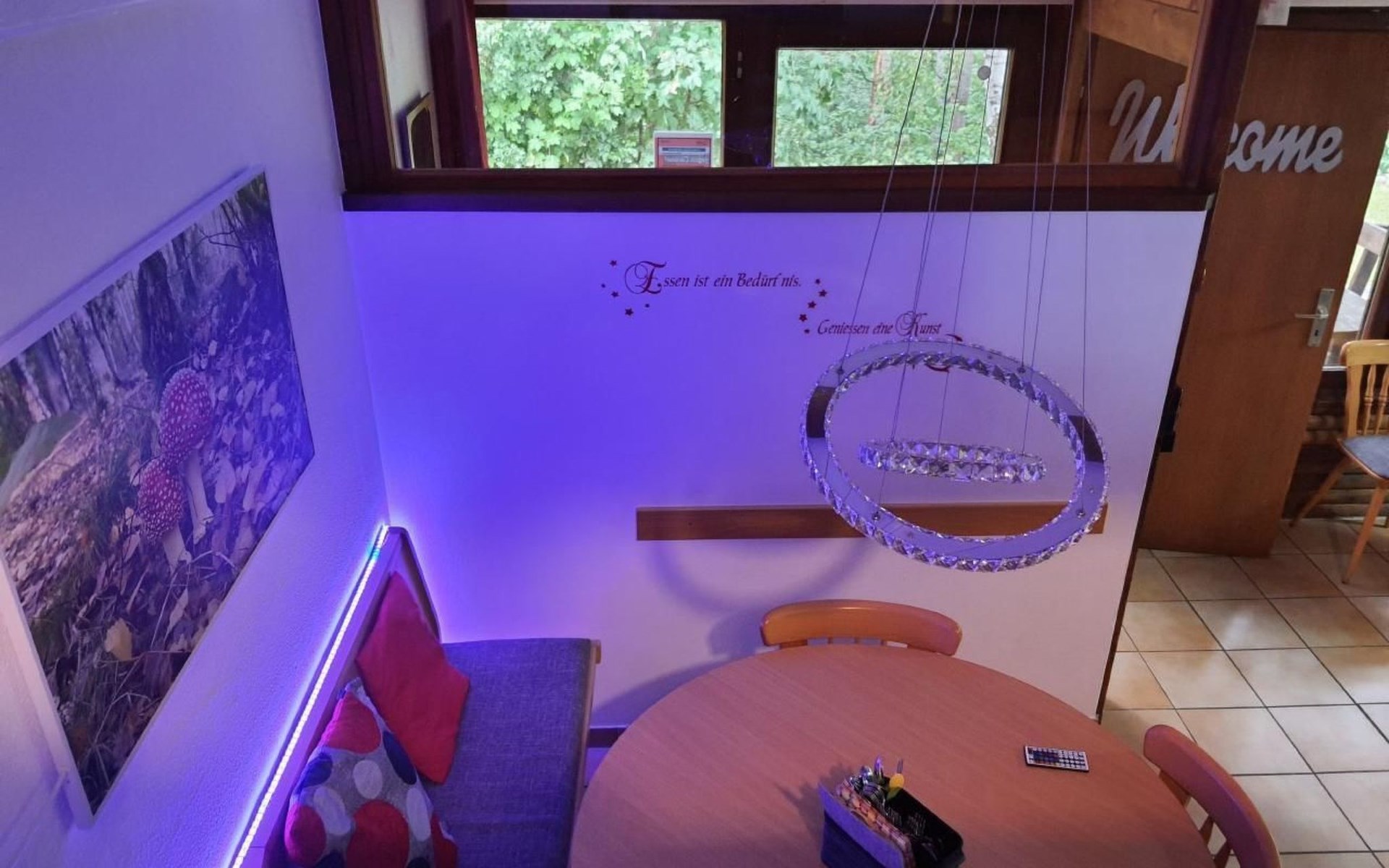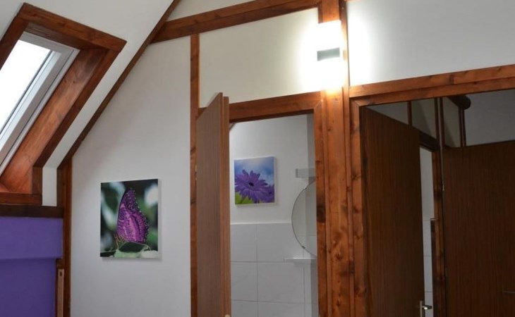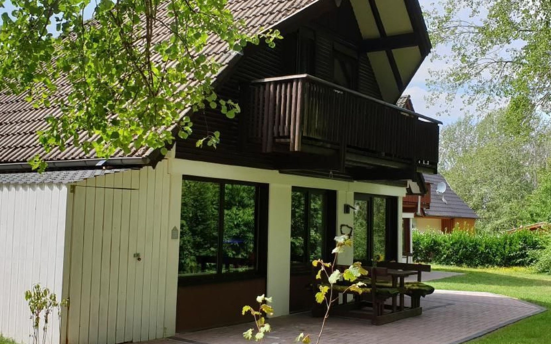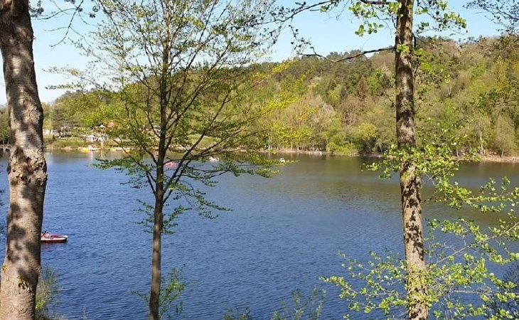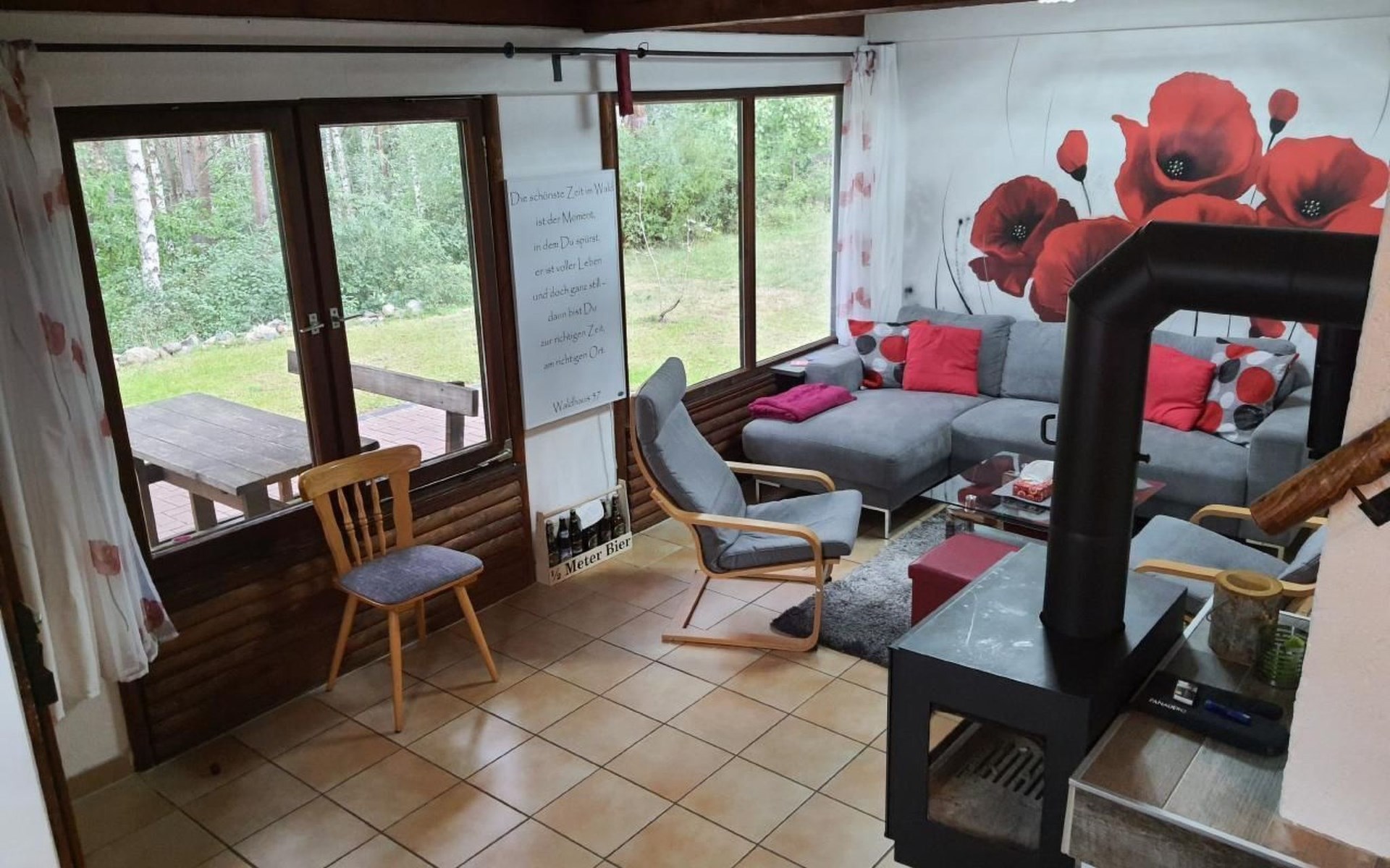 Our forest house is located at the end of the holiday park and is the furthest away from the forest. Are you looking for peace and relaxation in nature, with a lake and forest, surrounded by your loved ones?Then our Waldhaus 57 is the right place for you!We're glad you're here!Our house is equipped for 4-6 people:A living room with couch and two relaxing chairs, TV, DVD and Dolby surround system. The fireplace and modern infrared heating panels provide warmth and cosiness.The dining area offers enough space to comfortably seat 6 people.The high-quality kitchen is equipped with a large fridge, freezer (3 compartments), oven, ceramic hob, large sink and a dishwasher, toaster, coffee machine or Nespresso machine, pressure cooker, blender, and crockery & cutlery for 12 people. From the kitchen you have a beautiful view into the living room and down to the forest.The house has two toilets, a separate shower and three bedrooms:Butterfly room: box spring bed and separate WCSunflower room: a double bed and washbasin Owl room: with two single beds and washbasin The upper bedrooms each have access to the balcony.All bedrooms have fitted wardrobes and ample storage space.The ground floor is brick-built, the roof area with the sloping bedrooms is a wooden structure. Therefore, a certain amount of noise and natural creaking of the wood is unavoidable.The outside area offers two terraces, a brick barbecue, rotary clothes dryer, raised bed and car park for loading and unloading.The outdoor area offers two terraces, a brick barbecue, rotary clothes dryer, raised bed and 1 parking space for loading and unloading.Activities around the Silbersee are partly chargeable. Please refer to the respective providers for opening prices and opening times. The offers have nothing to do with the letting of the house.The WLAN is sufficient for private use - however, there is no guarantee for stability and utilisation (home office etc.).The additional costs (cleaning, pet and deposit) are transferred directly to us (landlord) in advance. The consumed electricity and the tourist tax will be deducted from the deposit after the stay and transferred back to us.Linen package (towel, shower towel, sheets and duvet covers) can be booked.* Non-smoking house. You are welcome to use the garden or balcony.* Dog on request* Crockery and any inventory may not be stolen or left in other houses (when booking several holiday homes)* Final cleaning does not include the removal of your own rubbish, emptying the fridge and freezer* Damages must be reported immediatelyDirectly at the Waldhaus you will find hiking trails, cycle paths, a mountain bike course. 5 minutes walk to the swimming lake with fishing possibilities, pedal boat hire. There is a football pitch, a volleyball court, table tennis tables, a mini-golf course and smaller playgrounds. On the other side of the lake there is also a thermal spa with sauna built directly into the lake and a summer toboggan run with beer garden. There is also an indoor playground (Frieloland) and a climbing park. The pony farm is approx. 1.5km away and the Knüll wildlife park is also 10km away.