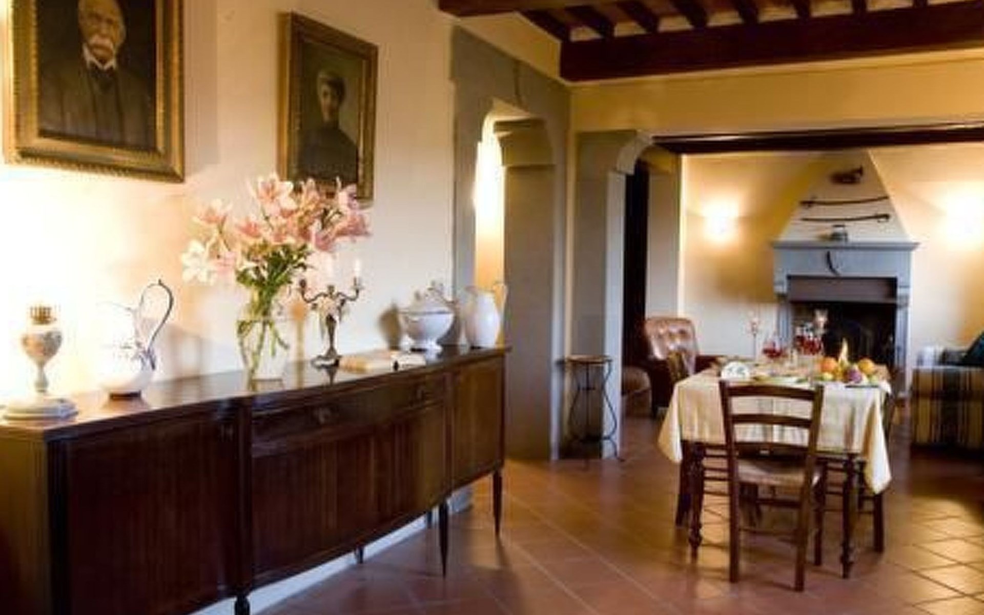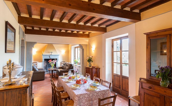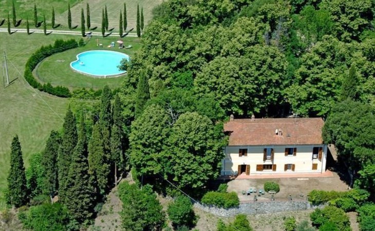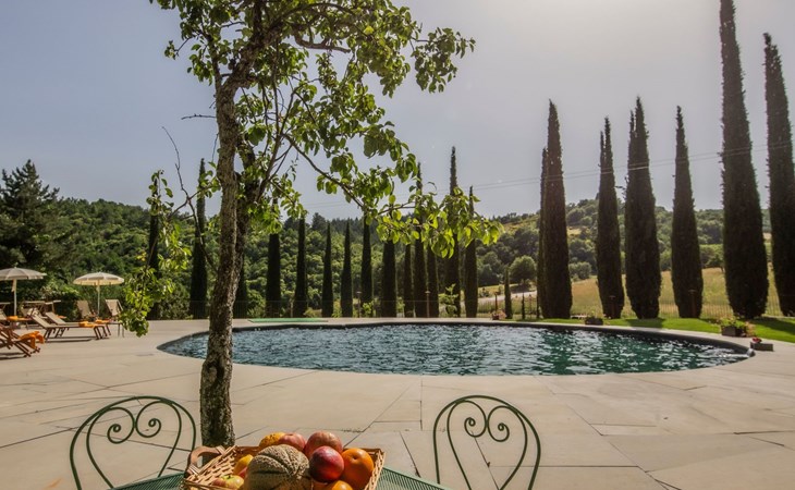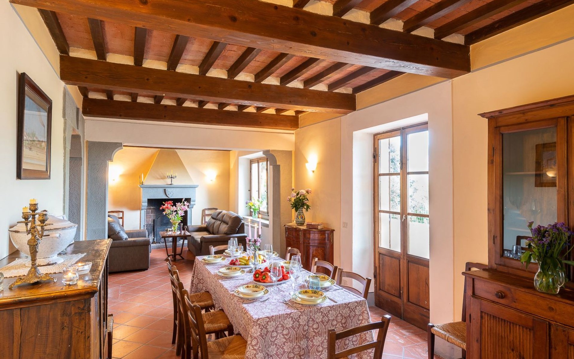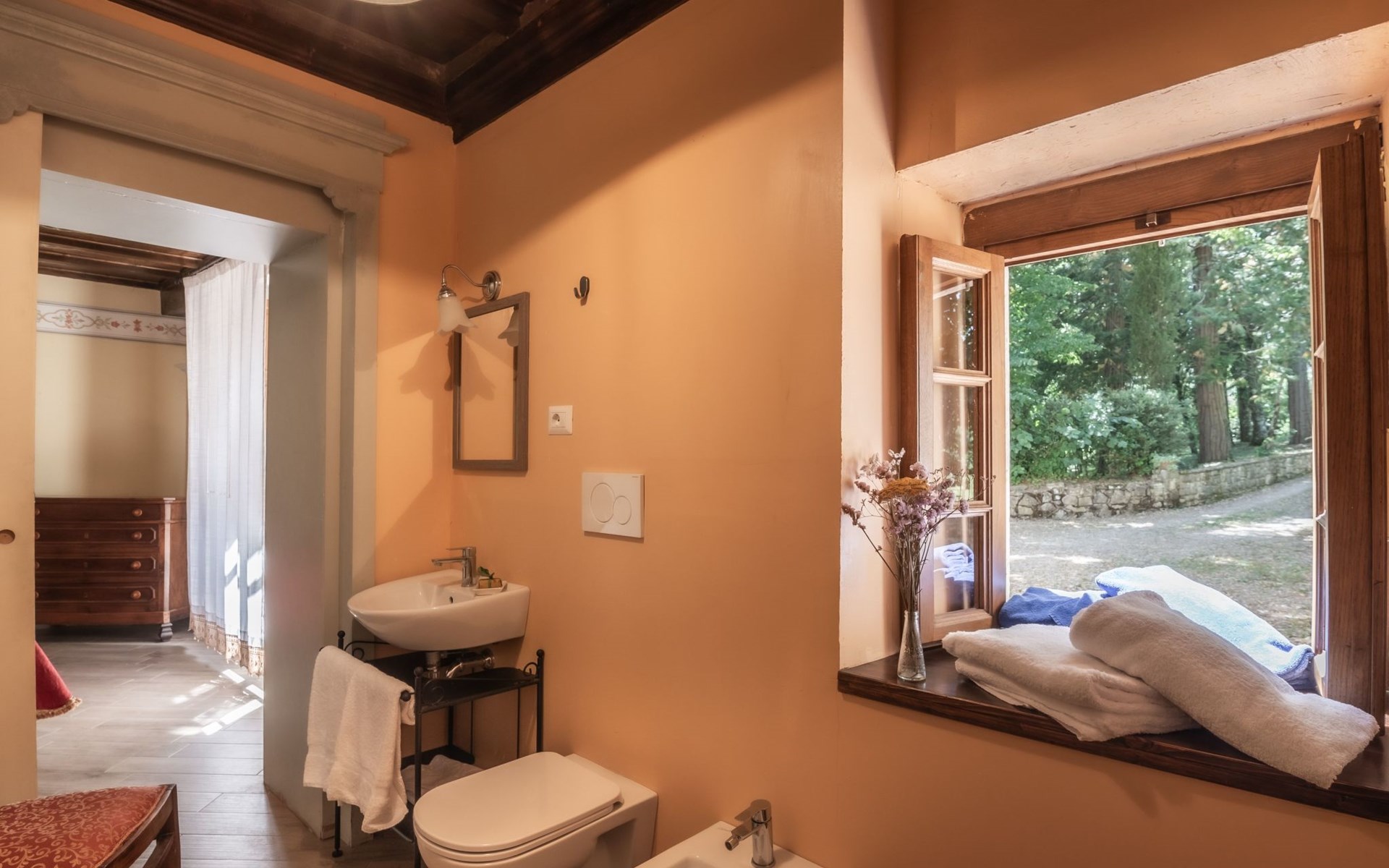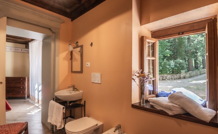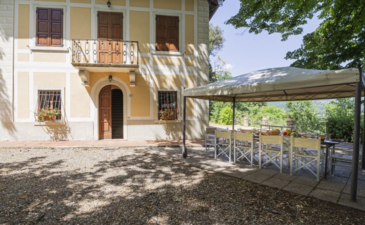 Maximaal 3 huisdieren/honden toegestaan. This detached holiday home dating back to the 19th century lies below the Castello di Romena and is surrounded by a large park with linden, oak and stone oak trees. A path about 300 metres long and lined with cypress trees leads to the property.The 250 m² living area extends over two floors. The ground floor has a fireplace room with a suite, a large dining room open towards the fireplace room, also with a suite and access to the outdoors. There is also a kitchen with access to the outdoors. The kitchen is equipped with an oven, gas hob, fridge with freezer compartment, dishwasher and coffee machine. The ground floor also has a bedroom with a double bed and private bathroom with shower and WC and an access to the outdoors. On the groundfloor there is also a second bedroom with double bed and private bathroom with shower and WC as well as a guest toilet. A staircase leads from the ground floor to the first floor, with an open living room with a balcony. The first floor also comprises two bedrooms with a double bed and each with a private bathroom, of which one has a bath, shower, two washbasins and a toilet, while the other has a shower, toilet, bidet and washbasin. During the renovation, the architectural details of the old building style were accentuated, resulting in a well-presented residential ambience with some antique furnishing, clay tiles and wooden ceiling beams or wooden paneling. There is a little house nearby with a washing machine. A TV and a DVD player are available.On the back of the house you can enjoy from the terrace with garden furniture and gazebo a beautiful view of the valley and the medieval castles of Poppi, Romena and Porciano. Approx. 40 m from the house is a large, fenced, circular swimming pool (water surface approx. 180 m², depth: 1.50 m; open in mid and high season with whirlpool. From season 2024 a portion of the large pool approx. 40 m². it will be heated, with night lighting, games for children and adults, with umbrellas, deck chairs with cushions and outdoor shower with hot water.Next to the pool is a summer kitchen with table, brick barbecue, sink and worktop .In case of booking of up to seven people, the guests have three bedrooms with three bathrooms. If requested, the fourth bedroom with en suite bathroom can be provided at an additional cost. You can order a payable bread and rolls service (only from Monday to Saturday, orders and payment locally)It is about 1km to the centre of Pratovecchio with shops. Near the house you can find a tennis court (1km), riding facilities (4km), and a 9-hole golf course (6km). Florence and Arezzo are about 40km from the house. It is about an hour by train from Arezzo to Rome. The property is completely fenced. IT051041B53AAC7G70