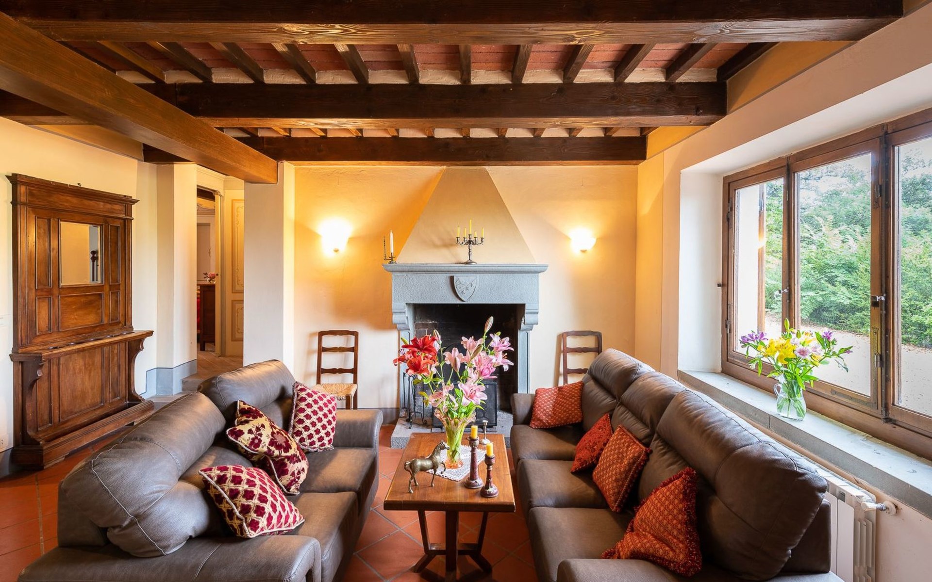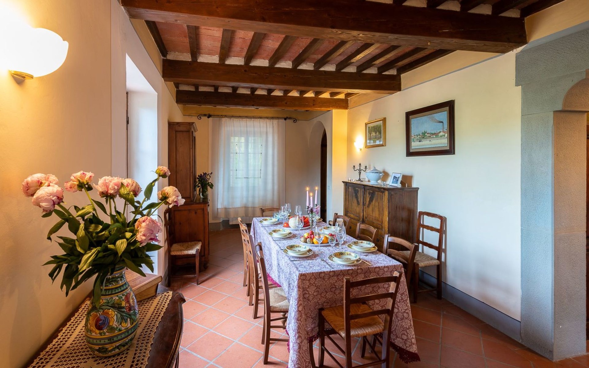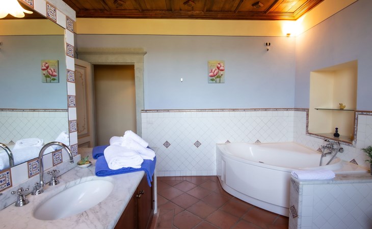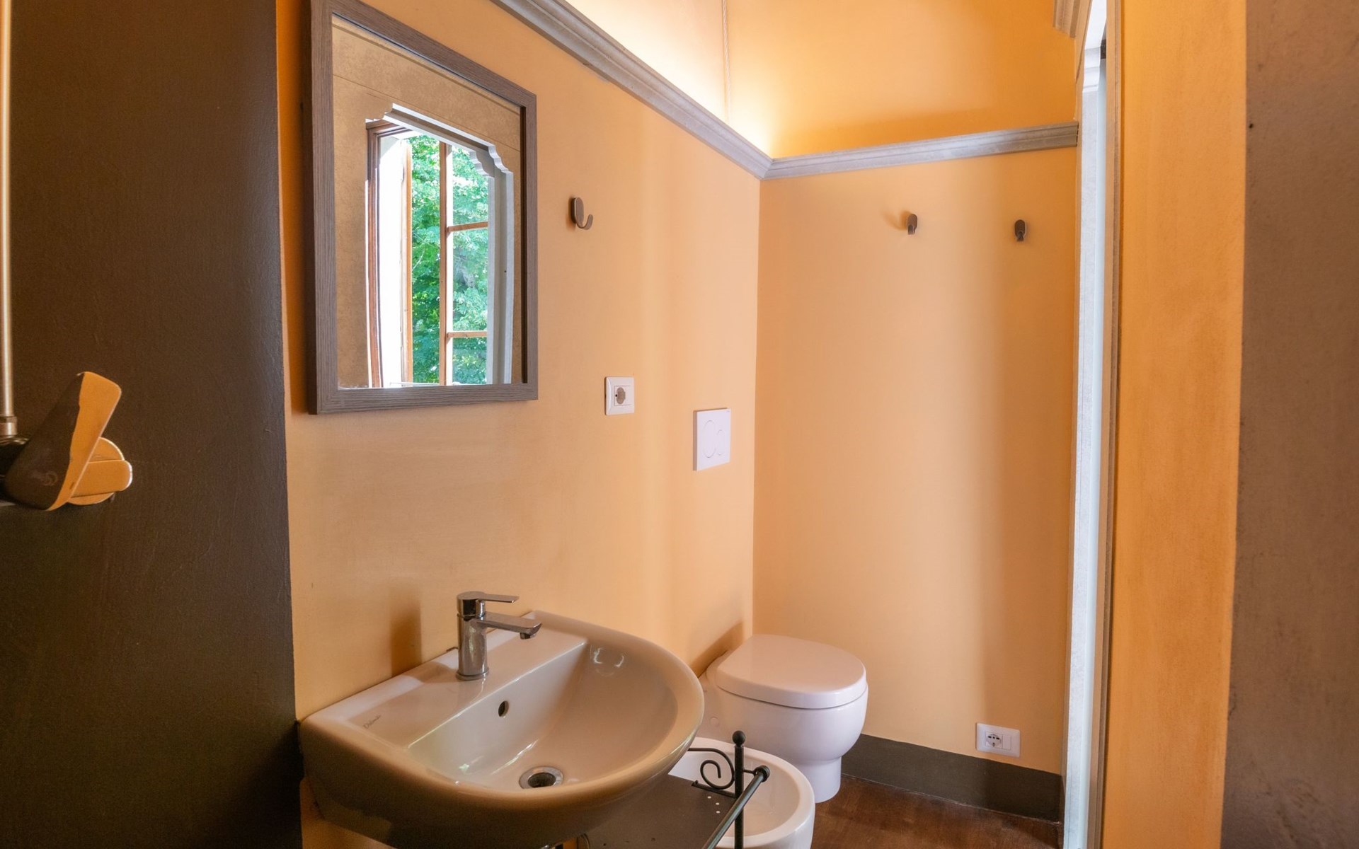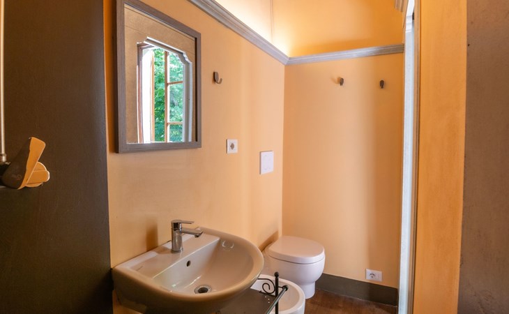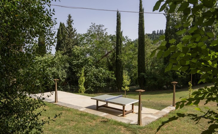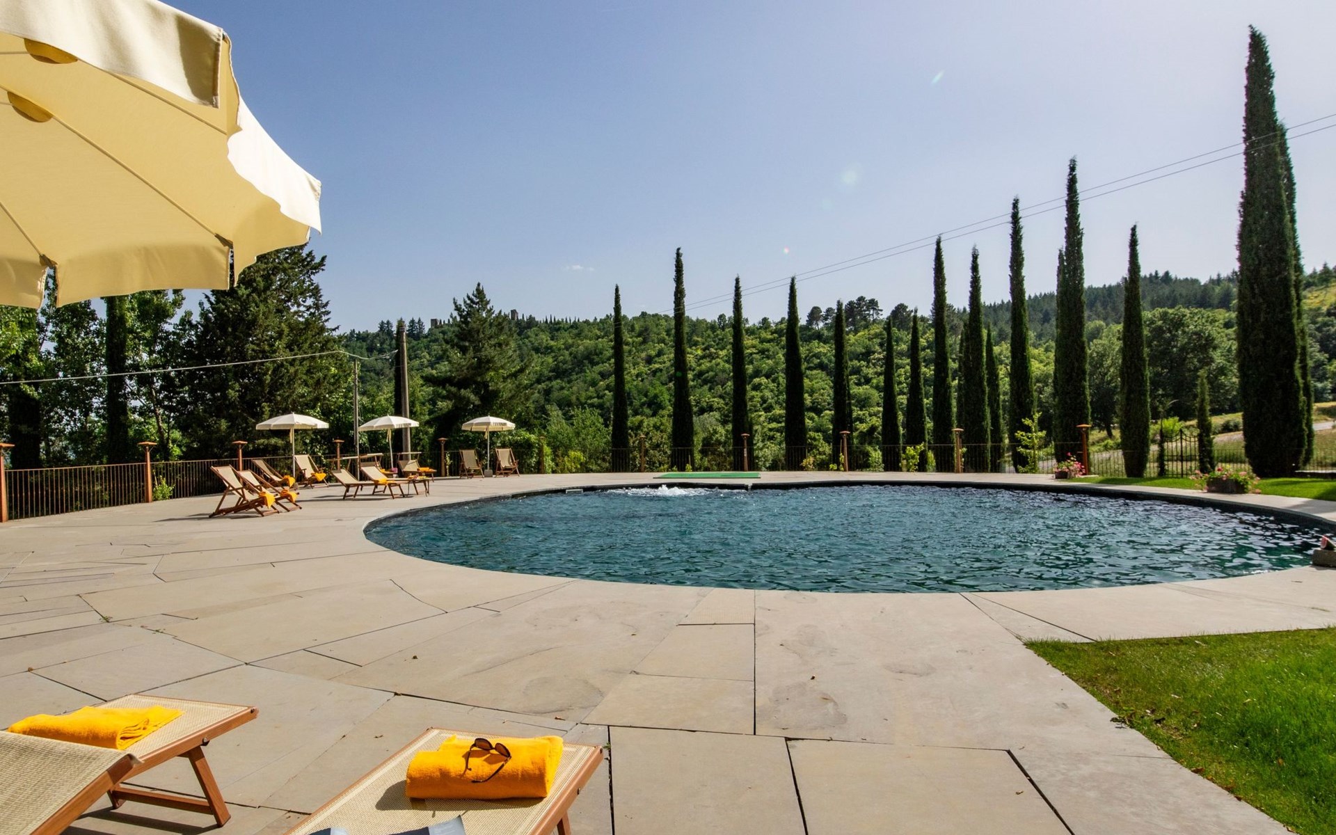 Maximaal 3 huisdieren/honden toegestaan. This detached holiday home dating back to the 19th century lies below the Castello di Romena and is surrounded by a large park with linden, oak and stone oak trees. A path about 300 metres long and lined with cypress trees leads to the property.The 250 m² living area extends over two floors. The ground floor has a fireplace room with a suite, a large dining room open towards the fireplace room, also with a suite and access to the outdoors. There is also a kitchen with access to the outdoors. The kitchen is equipped with an oven, gas hob, fridge with freezer compartment, dishwasher and coffee machine. The ground floor also has a bedroom with a double bed and private bathroom with shower and WC and an access to the outdoors. On the groundfloor there is also a second bedroom with double bed and private bathroom with shower and WC as well as a guest toilet. A staircase leads from the ground floor to the first floor, with an open living room with a balcony. The first floor also comprises two bedrooms with a double bed and each with a private bathroom, of which one has a bath, shower, two washbasins and a toilet, while the other has a shower, toilet, bidet and washbasin. During the renovation, the architectural details of the old building style were accentuated, resulting in a well-presented residential ambience with some antique furnishing, clay tiles and wooden ceiling beams or wooden paneling. There is a little house nearby with a washing machine. A TV and a DVD player are available.On the back of the house you can enjoy from the terrace with garden furniture and gazebo a beautiful view of the valley and the medieval castles of Poppi, Romena and Porciano. Approx. 40 m from the house is a large, fenced, circular swimming pool (water surface approx. 180 m², depth: 1.50 m; open in mid and high season with whirlpool. From season 2024 a portion of the large pool approx. 40 m². it will be heated, with night lighting, games for children and adults, with umbrellas, deck chairs with cushions and outdoor shower with hot water.Next to the pool is a summer kitchen with table, brick barbecue, sink and worktop .In case of booking of up to seven people, the guests have three bedrooms with three bathrooms. If requested, the fourth bedroom with en suite bathroom can be provided at an additional cost. You can order a payable bread and rolls service (only from Monday to Saturday, orders and payment locally)It is about 1km to the centre of Pratovecchio with shops. Near the house you can find a tennis court (1km), riding facilities (4km), and a 9-hole golf course (6km). Florence and Arezzo are about 40km from the house. It is about an hour by train from Arezzo to Rome. The property is completely fenced. IT051041B53AAC7G70