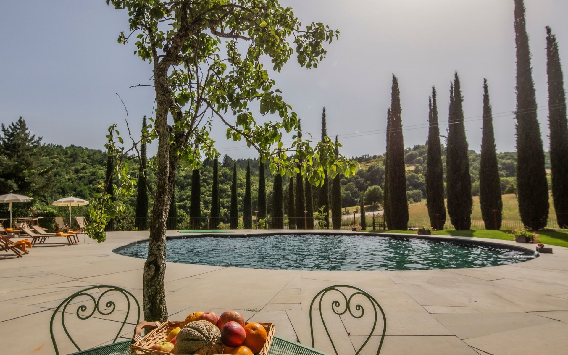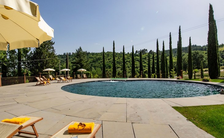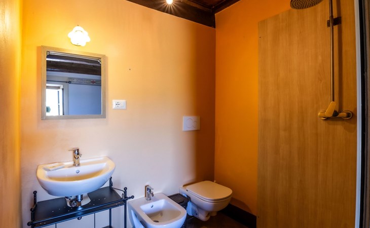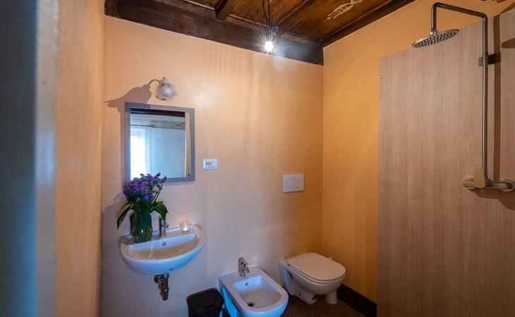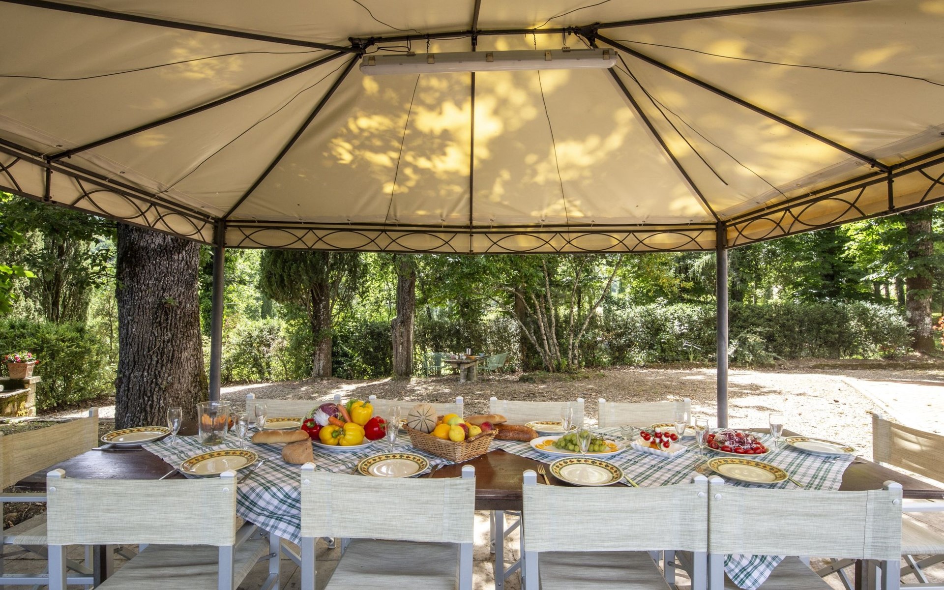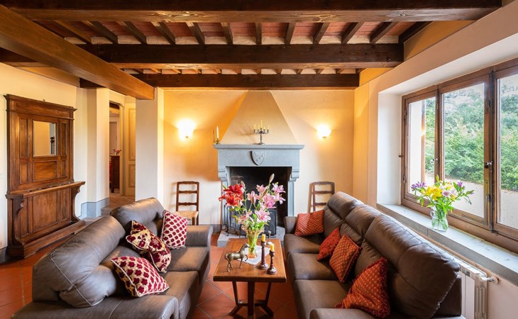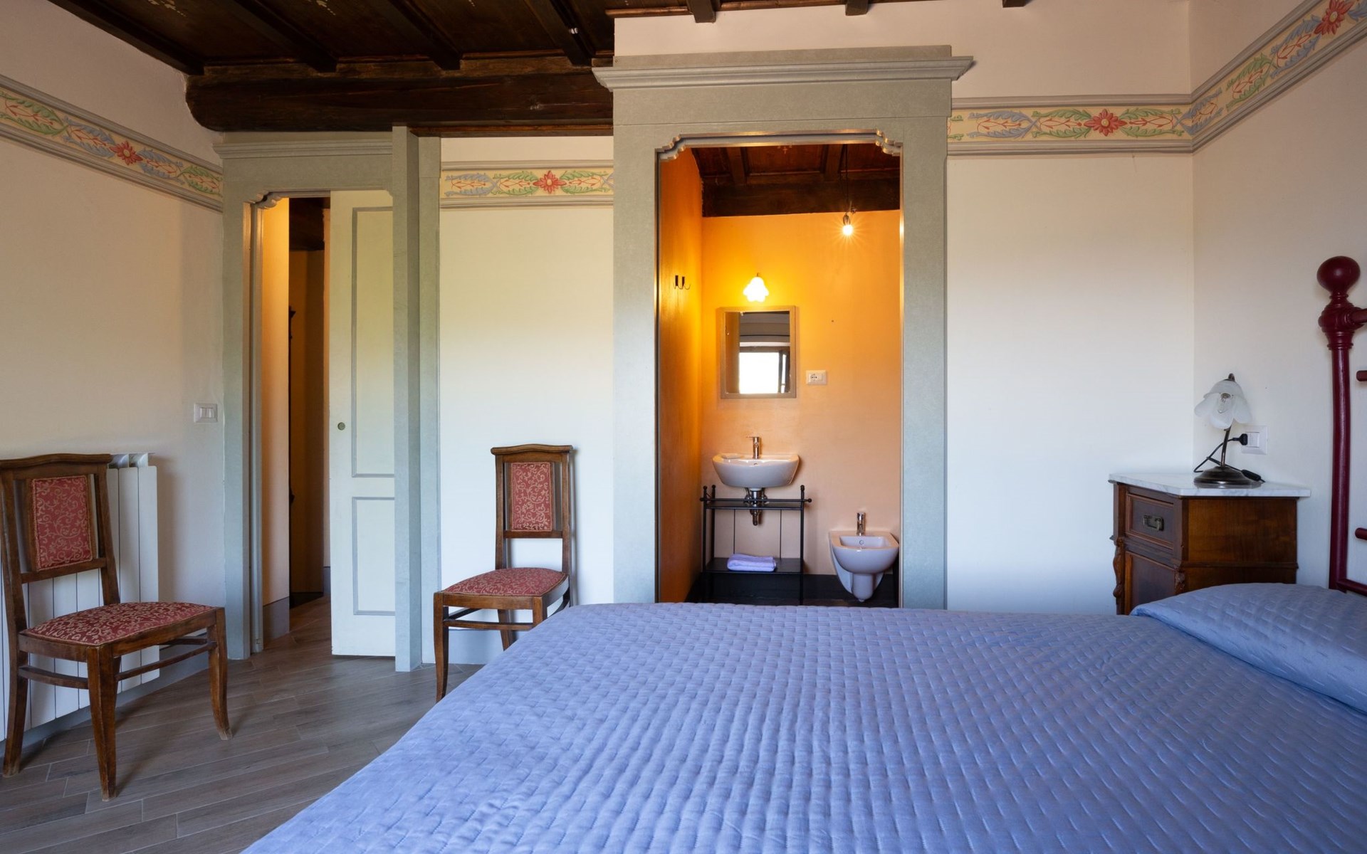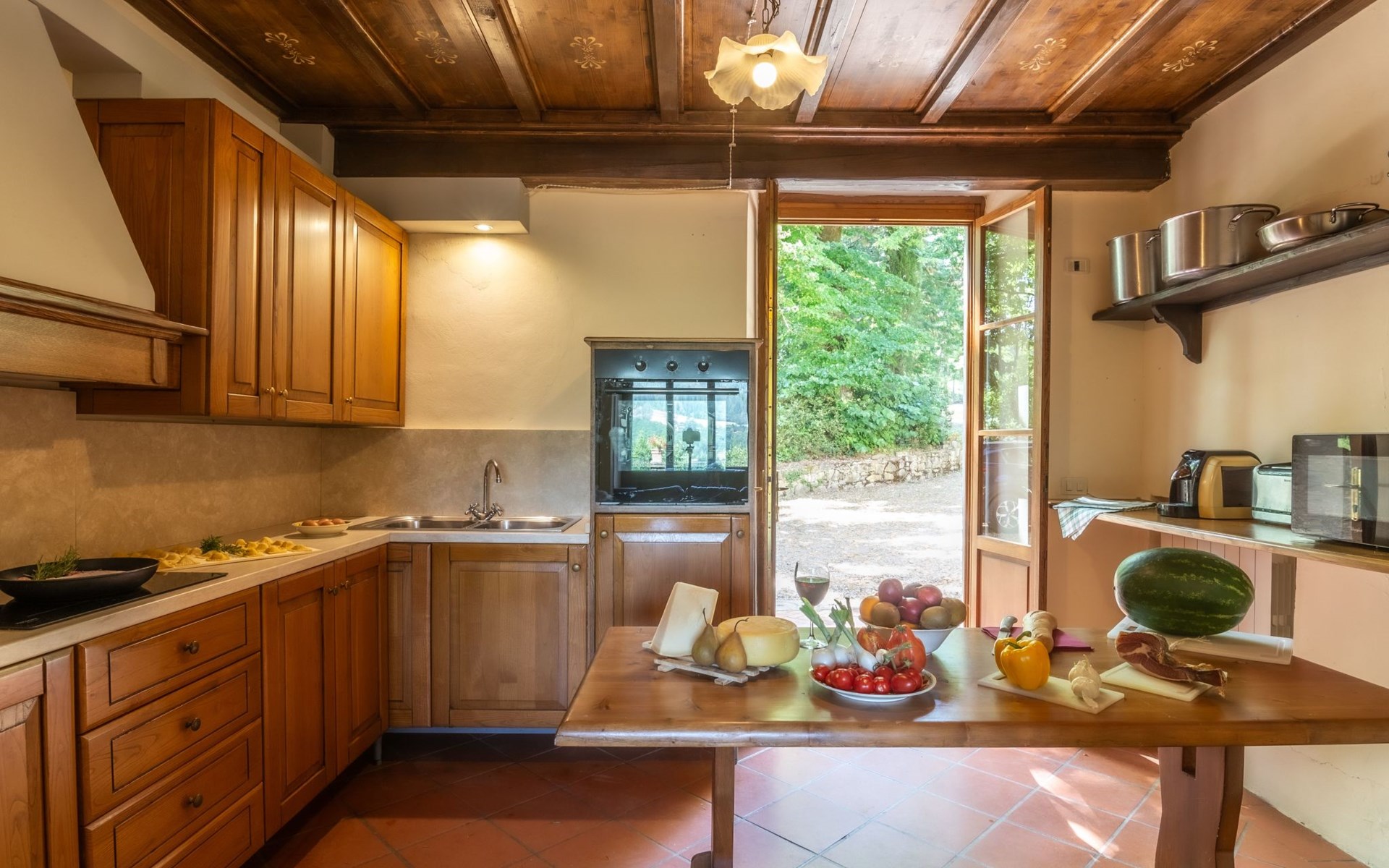 Maximaal 3 huisdieren/honden toegestaan. This detached holiday home dating back to the 19th century lies below the Castello di Romena and is surrounded by a large park with linden, oak and stone oak trees. A path about 300 metres long and lined with cypress trees leads to the property.The 250 m² living area extends over two floors. The ground floor has a fireplace room with a suite, a large dining room open towards the fireplace room, also with a suite and access to the outdoors. There is also a kitchen with access to the outdoors. The kitchen is equipped with an oven, gas hob, fridge with freezer compartment, dishwasher and coffee machine. The ground floor also has a bedroom with a double bed and private bathroom with shower and WC and an access to the outdoors. On the groundfloor there is also a second bedroom with double bed and private bathroom with shower and WC as well as a guest toilet. A staircase leads from the ground floor to the first floor, with an open living room with a balcony. The first floor also comprises two bedrooms with a double bed and each with a private bathroom, of which one has a bath, shower, two washbasins and a toilet, while the other has a shower, toilet, bidet and washbasin. During the renovation, the architectural details of the old building style were accentuated, resulting in a well-presented residential ambience with some antique furnishing, clay tiles and wooden ceiling beams or wooden paneling. There is a little house nearby with a washing machine. A TV and a DVD player are available.On the back of the house you can enjoy from the terrace with garden furniture and gazebo a beautiful view of the valley and the medieval castles of Poppi, Romena and Porciano. Approx. 40 m from the house is a large, fenced, circular swimming pool (water surface approx. 180 m², depth: 1.50 m; open in mid and high season with whirlpool. From season 2024 a portion of the large pool approx. 40 m². it will be heated, with night lighting, games for children and adults, with umbrellas, deck chairs with cushions and outdoor shower with hot water.Next to the pool is a summer kitchen with table, brick barbecue, sink and worktop .In case of booking of up to seven people, the guests have three bedrooms with three bathrooms. If requested, the fourth bedroom with en suite bathroom can be provided at an additional cost. You can order a payable bread and rolls service (only from Monday to Saturday, orders and payment locally)It is about 1km to the centre of Pratovecchio with shops. Near the house you can find a tennis court (1km), riding facilities (4km), and a 9-hole golf course (6km). Florence and Arezzo are about 40km from the house. It is about an hour by train from Arezzo to Rome. The property is completely fenced. IT051041B53AAC7G70