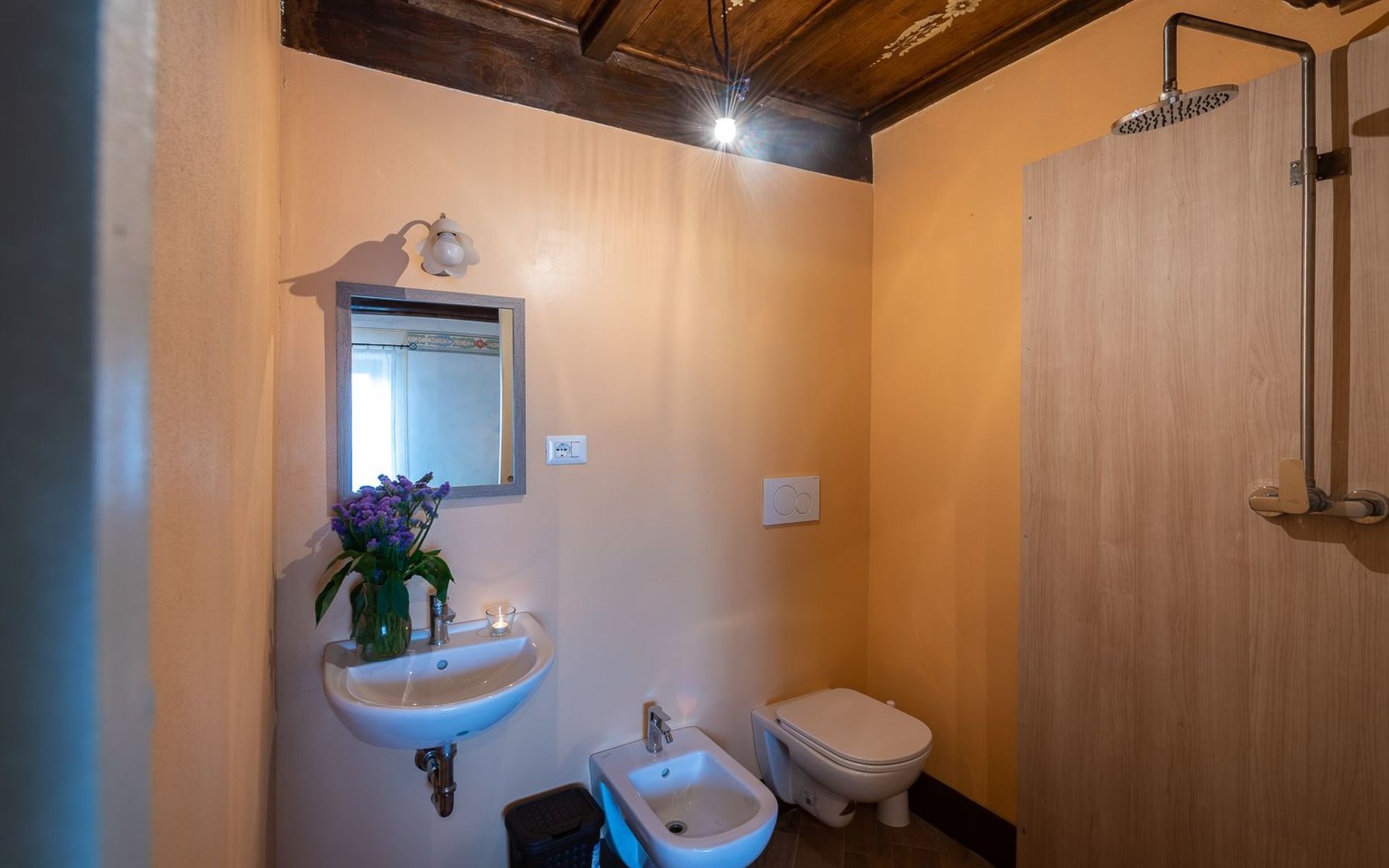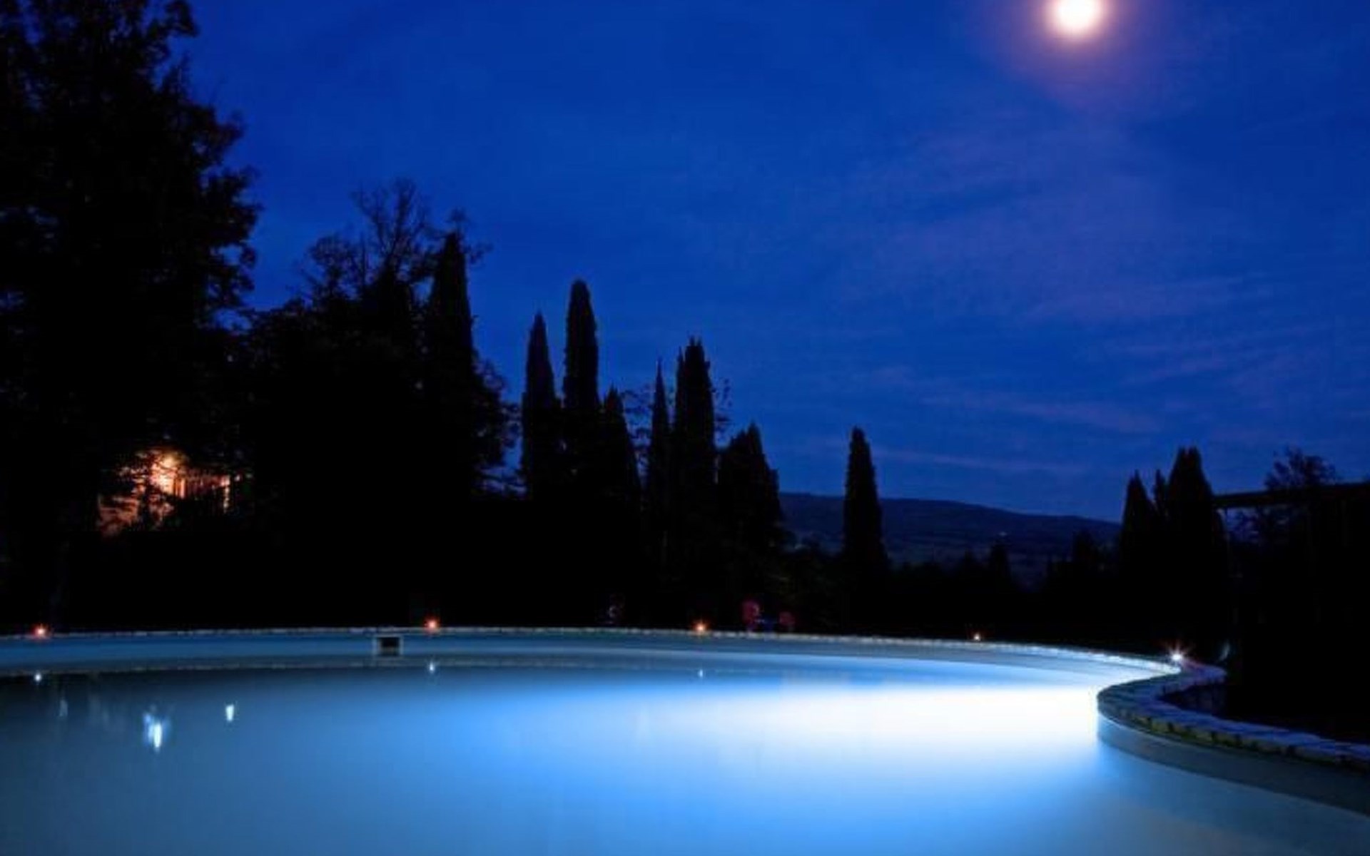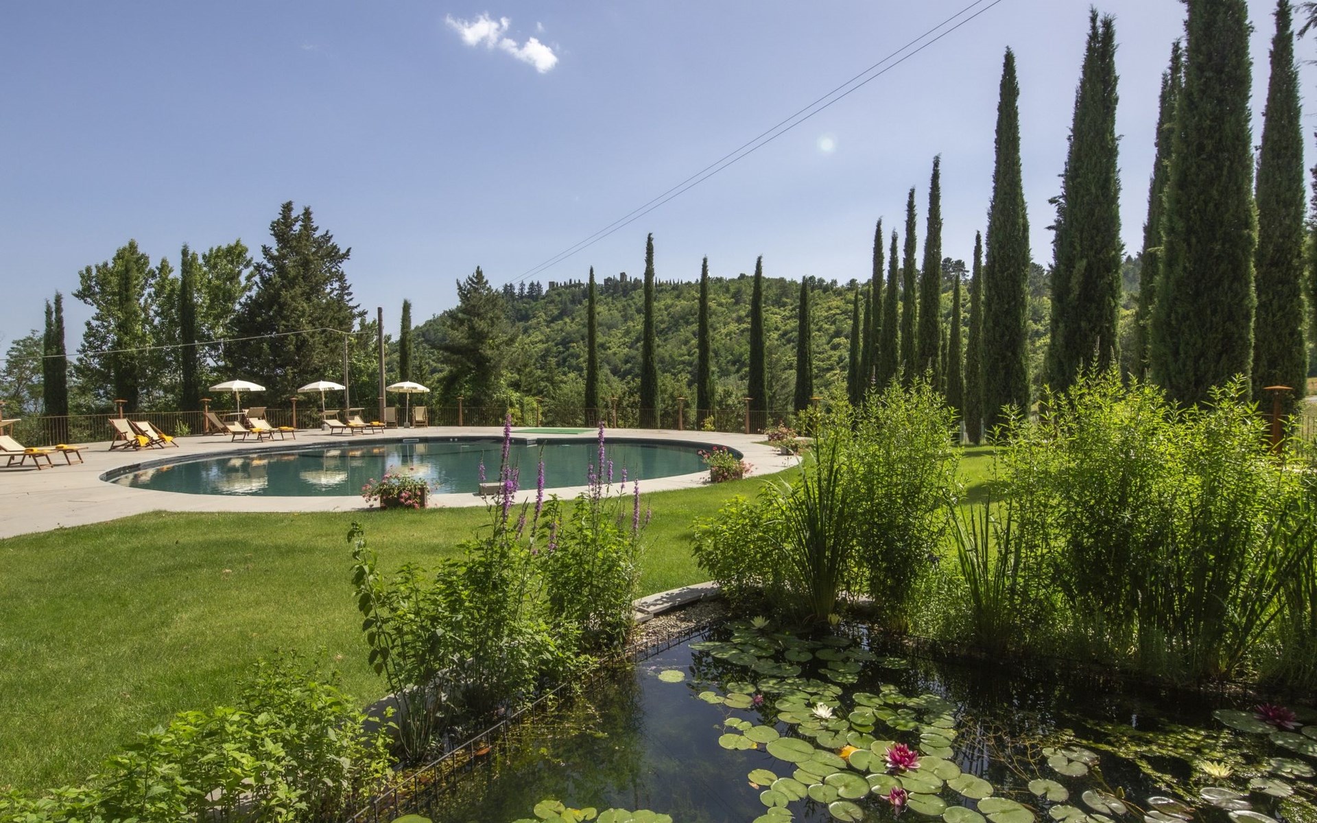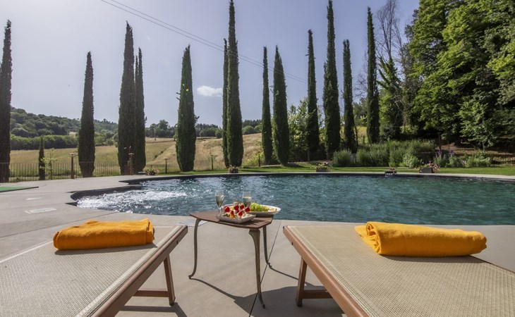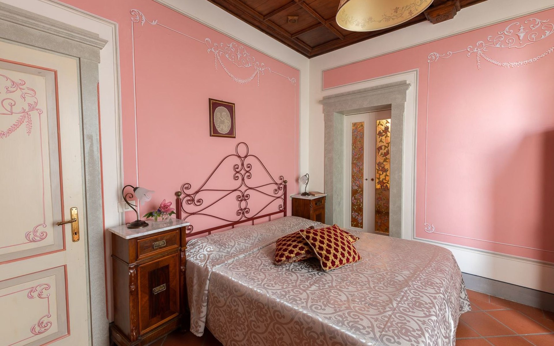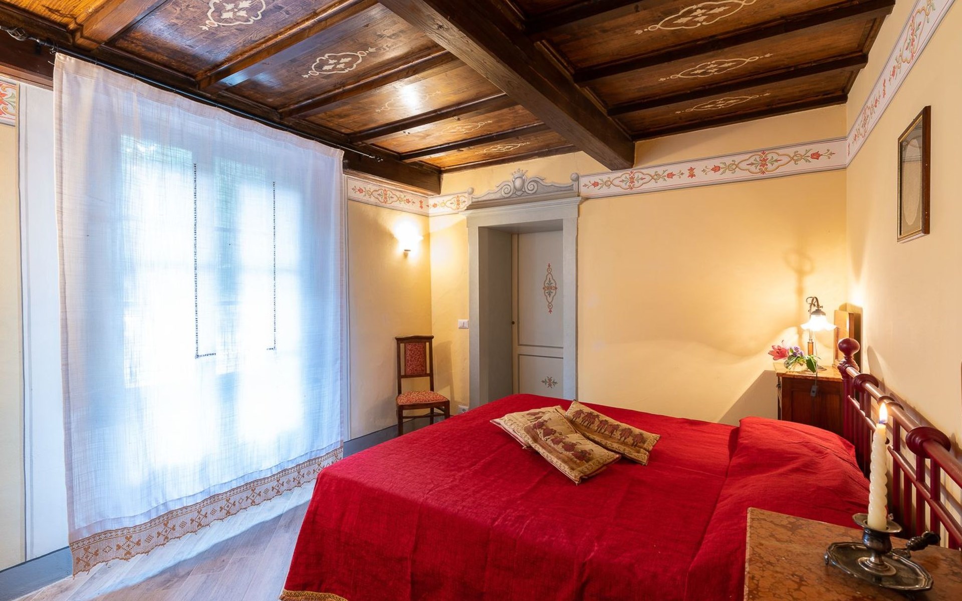 Maximaal 3 huisdieren/honden toegestaan. This detached holiday home dating back to the 19th century lies below the Castello di Romena and is surrounded by a large park with linden, oak and stone oak trees. A path about 300 metres long and lined with cypress trees leads to the property.The 250 m² living area extends over two floors. The ground floor has a fireplace room with a suite, a large dining room open towards the fireplace room, also with a suite and access to the outdoors. There is also a kitchen with access to the outdoors. The kitchen is equipped with an oven, gas hob, fridge with freezer compartment, dishwasher and coffee machine. The ground floor also has a bedroom with a double bed and private bathroom with shower and WC and an access to the outdoors. On the groundfloor there is also a second bedroom with double bed and private bathroom with shower and WC as well as a guest toilet. A staircase leads from the ground floor to the first floor, with an open living room with a balcony. The first floor also comprises two bedrooms with a double bed and each with a private bathroom, of which one has a bath, shower, two washbasins and a toilet, while the other has a shower, toilet, bidet and washbasin. During the renovation, the architectural details of the old building style were accentuated, resulting in a well-presented residential ambience with some antique furnishing, clay tiles and wooden ceiling beams or wooden paneling. There is a little house nearby with a washing machine. A TV and a DVD player are available.On the back of the house you can enjoy from the terrace with garden furniture and gazebo a beautiful view of the valley and the medieval castles of Poppi, Romena and Porciano. Approx. 40 m from the house is a large, fenced, circular swimming pool (water surface approx. 180 m², depth: 1.50 m; open in mid and high season with whirlpool. From season 2024 a portion of the large pool approx. 40 m². it will be heated, with night lighting, games for children and adults, with umbrellas, deck chairs with cushions and outdoor shower with hot water.Next to the pool is a summer kitchen with table, brick barbecue, sink and worktop .In case of booking of up to seven people, the guests have three bedrooms with three bathrooms. If requested, the fourth bedroom with en suite bathroom can be provided at an additional cost. You can order a payable bread and rolls service (only from Monday to Saturday, orders and payment locally)It is about 1km to the centre of Pratovecchio with shops. Near the house you can find a tennis court (1km), riding facilities (4km), and a 9-hole golf course (6km). Florence and Arezzo are about 40km from the house. It is about an hour by train from Arezzo to Rome. The property is completely fenced. IT051041B53AAC7G70
