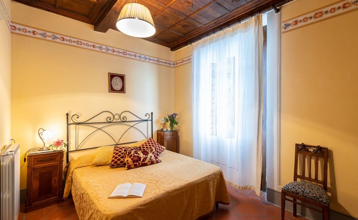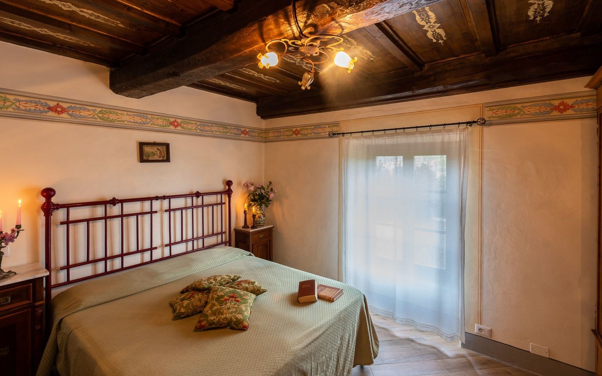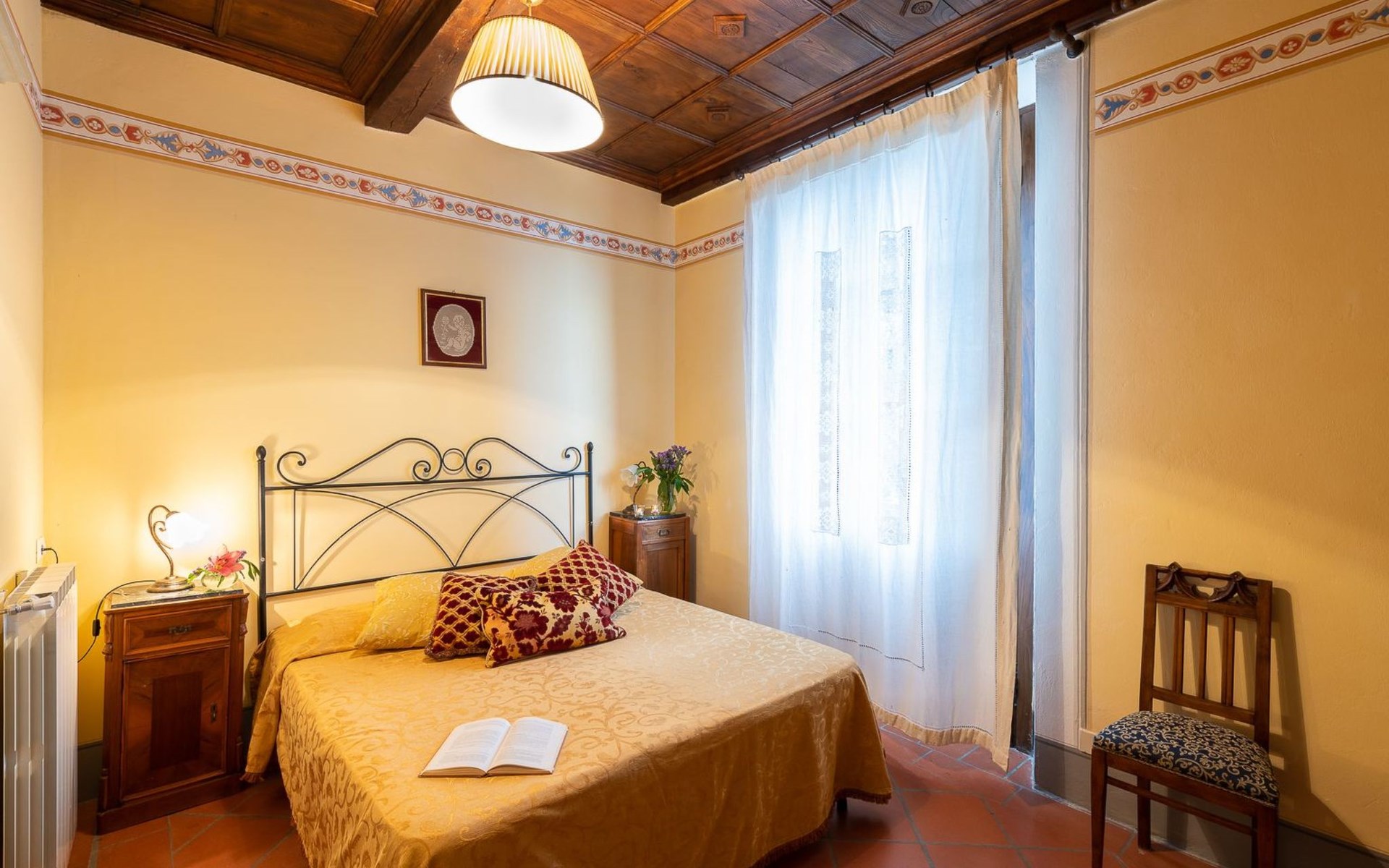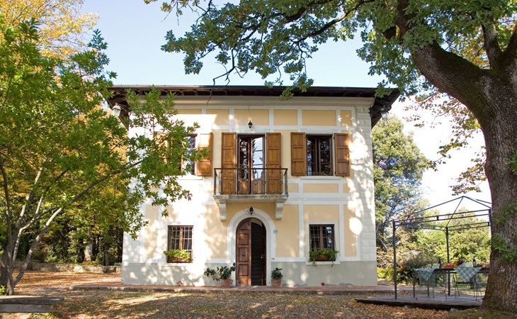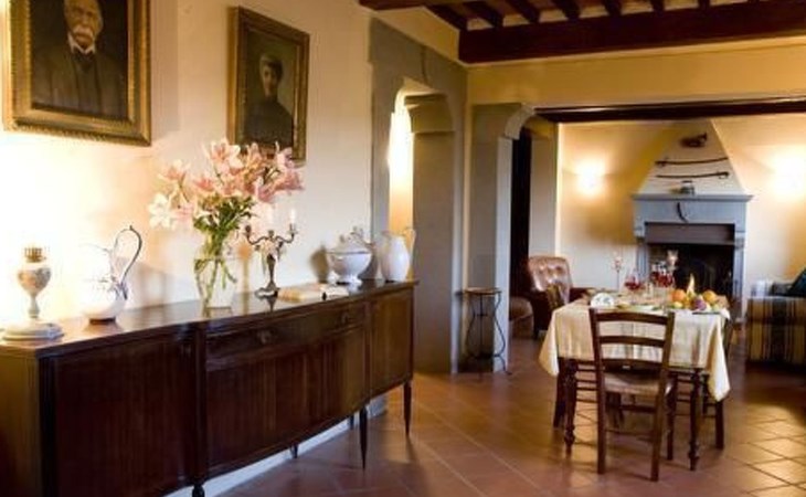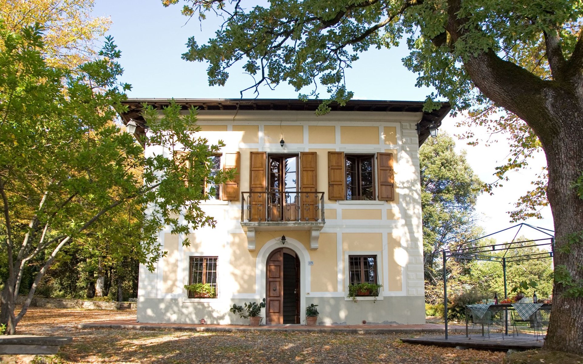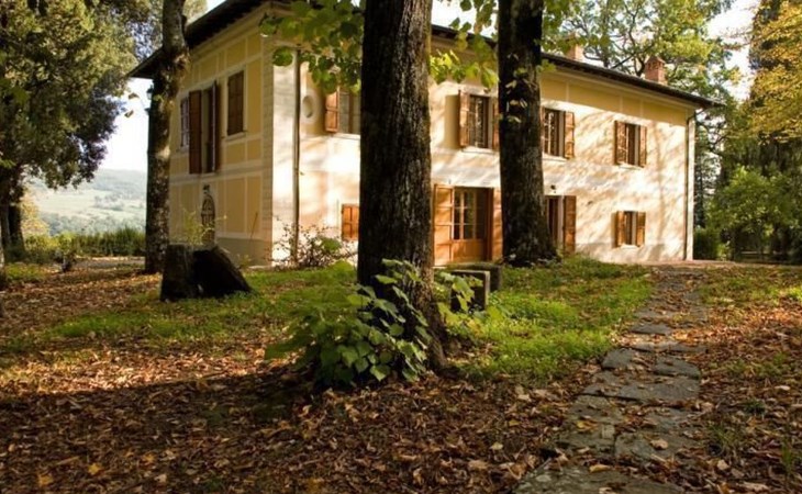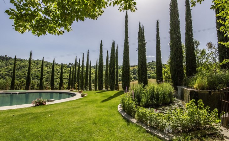 Maximaal 3 huisdieren/honden toegestaan. This detached holiday home dating back to the 19th century lies below the Castello di Romena and is surrounded by a large park with linden, oak and stone oak trees. A path about 300 metres long and lined with cypress trees leads to the property.The 250 m² living area extends over two floors. The ground floor has a fireplace room with a suite, a large dining room open towards the fireplace room, also with a suite and access to the outdoors. There is also a kitchen with access to the outdoors. The kitchen is equipped with an oven, gas hob, fridge with freezer compartment, dishwasher and coffee machine. The ground floor also has a bedroom with a double bed and private bathroom with shower and WC and an access to the outdoors. On the groundfloor there is also a second bedroom with double bed and private bathroom with shower and WC as well as a guest toilet. A staircase leads from the ground floor to the first floor, with an open living room with a balcony. The first floor also comprises two bedrooms with a double bed and each with a private bathroom, of which one has a bath, shower, two washbasins and a toilet, while the other has a shower, toilet, bidet and washbasin. During the renovation, the architectural details of the old building style were accentuated, resulting in a well-presented residential ambience with some antique furnishing, clay tiles and wooden ceiling beams or wooden paneling. There is a little house nearby with a washing machine. A TV and a DVD player are available.On the back of the house you can enjoy from the terrace with garden furniture and gazebo a beautiful view of the valley and the medieval castles of Poppi, Romena and Porciano. Approx. 40 m from the house is a large, fenced, circular swimming pool (water surface approx. 180 m², depth: 1.50 m; open in mid and high season with whirlpool. From season 2024 a portion of the large pool approx. 40 m². it will be heated, with night lighting, games for children and adults, with umbrellas, deck chairs with cushions and outdoor shower with hot water.Next to the pool is a summer kitchen with table, brick barbecue, sink and worktop .In case of booking of up to seven people, the guests have three bedrooms with three bathrooms. If requested, the fourth bedroom with en suite bathroom can be provided at an additional cost. You can order a payable bread and rolls service (only from Monday to Saturday, orders and payment locally)It is about 1km to the centre of Pratovecchio with shops. Near the house you can find a tennis court (1km), riding facilities (4km), and a 9-hole golf course (6km). Florence and Arezzo are about 40km from the house. It is about an hour by train from Arezzo to Rome. The property is completely fenced. IT051041B53AAC7G70