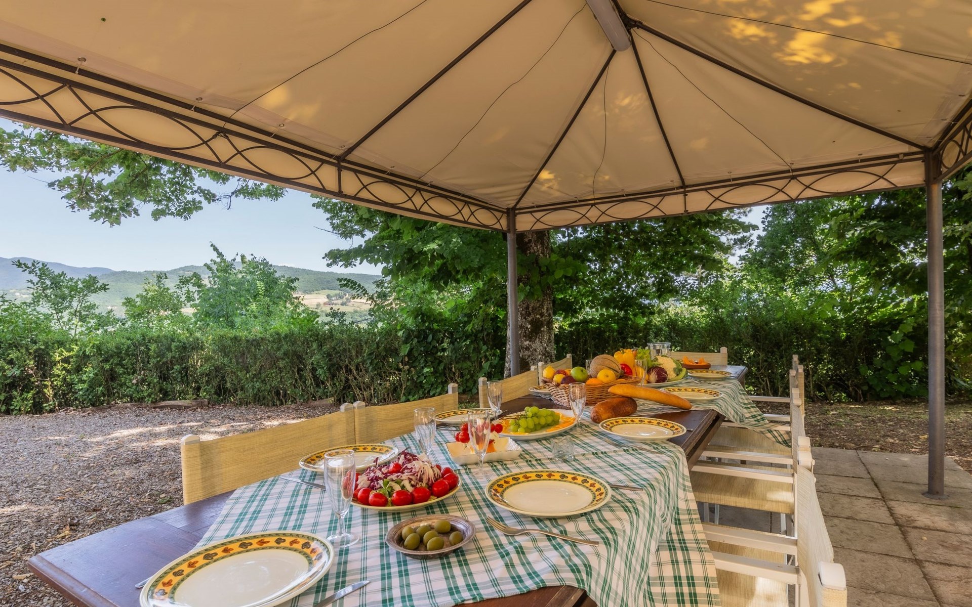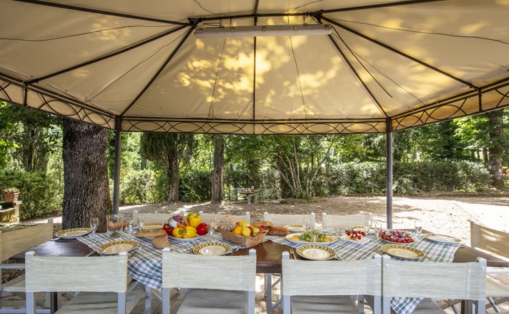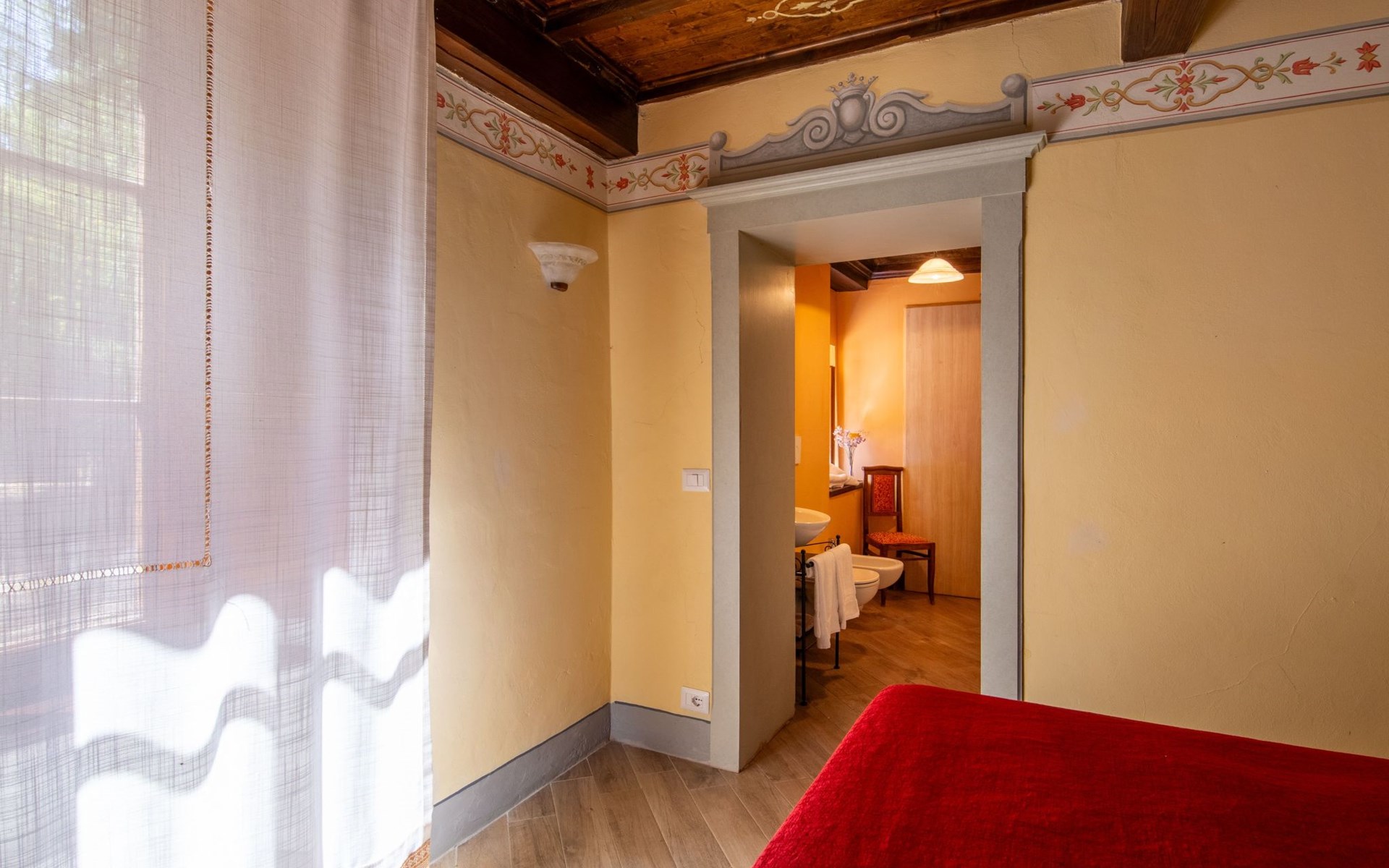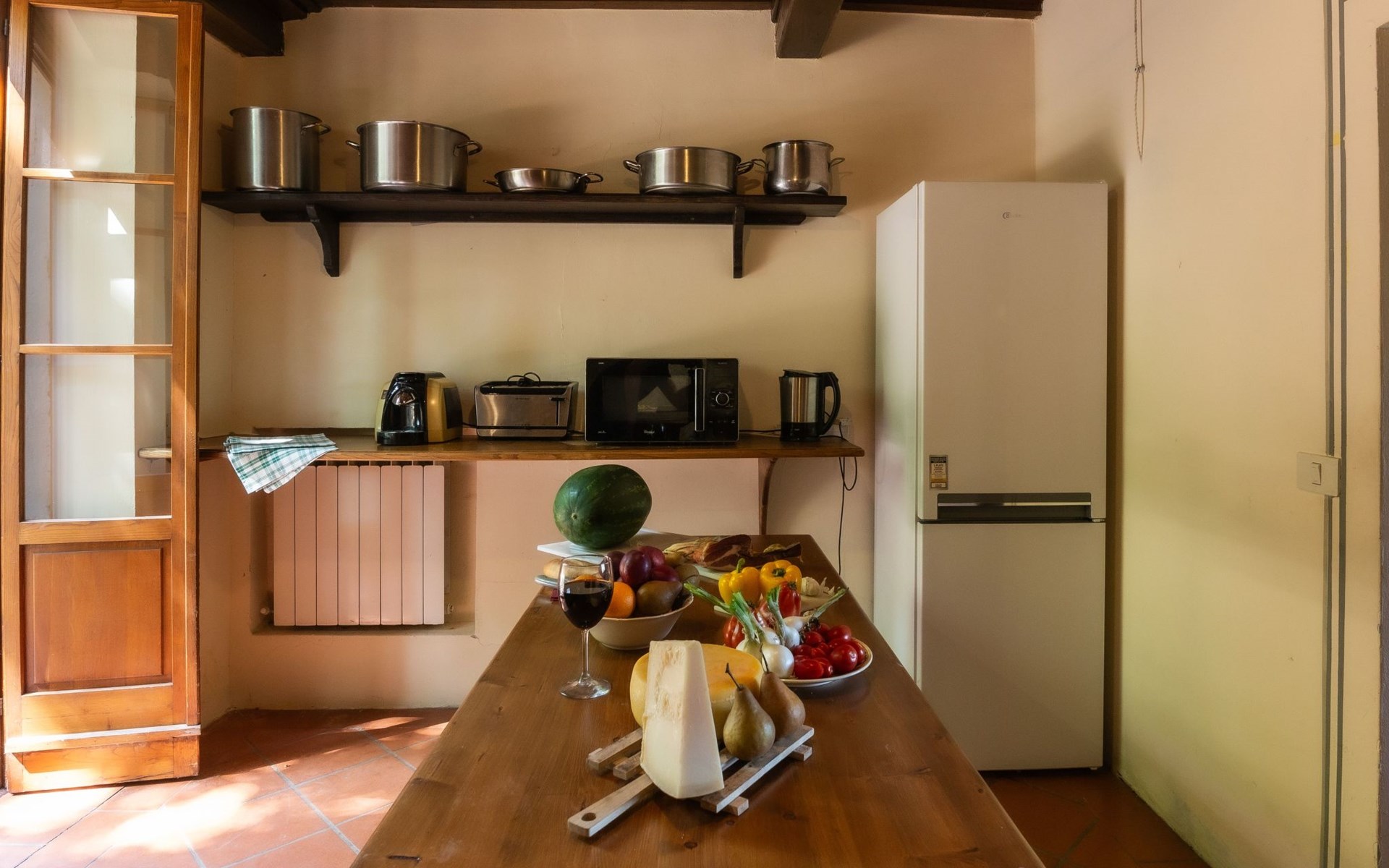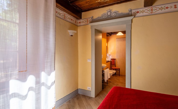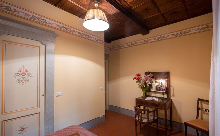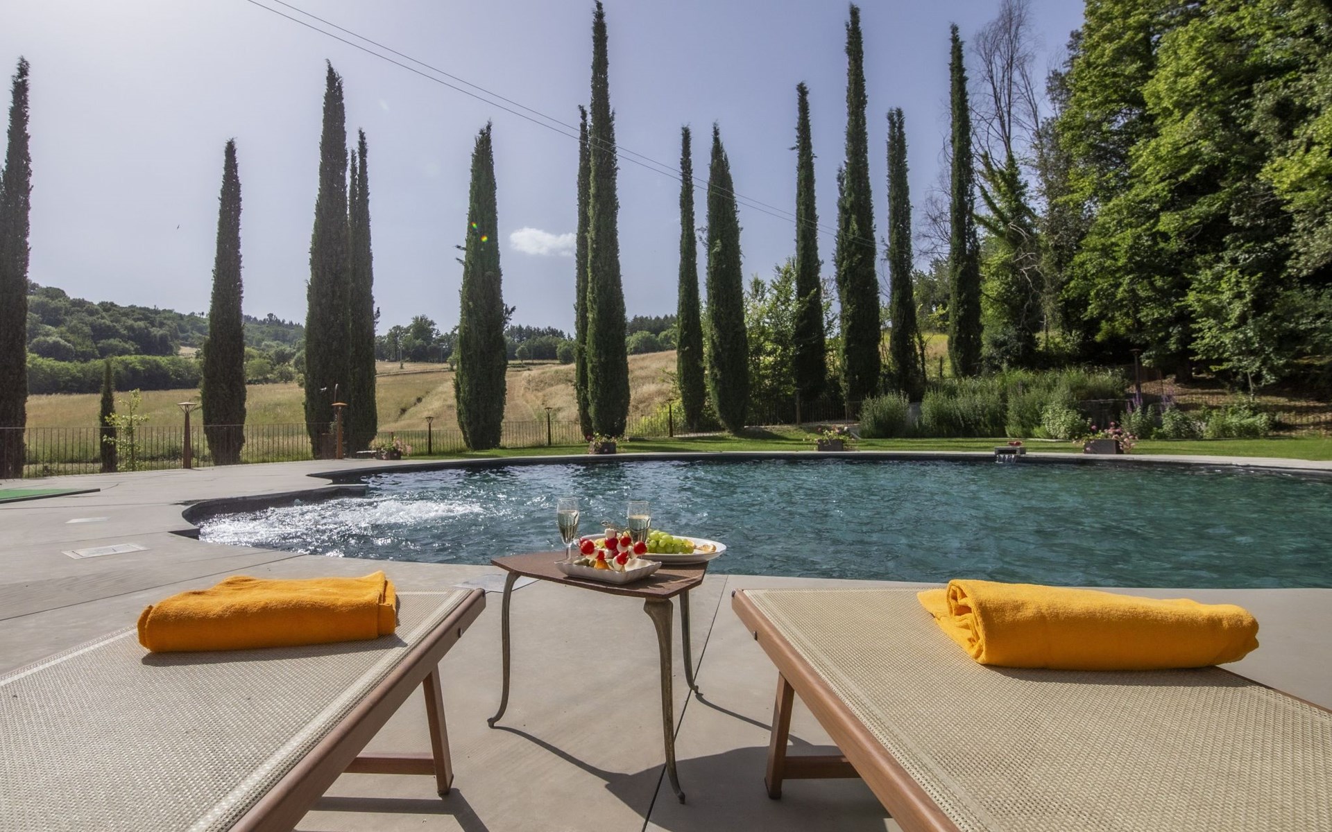 Maximaal 3 huisdieren/honden toegestaan. This detached holiday home dating back to the 19th century lies below the Castello di Romena and is surrounded by a large park with linden, oak and stone oak trees. A path about 300 metres long and lined with cypress trees leads to the property.The 250 m² living area extends over two floors. The ground floor has a fireplace room with a suite, a large dining room open towards the fireplace room, also with a suite and access to the outdoors. There is also a kitchen with access to the outdoors. The kitchen is equipped with an oven, gas hob, fridge with freezer compartment, dishwasher and coffee machine. The ground floor also has a bedroom with a double bed and private bathroom with shower and WC and an access to the outdoors. On the groundfloor there is also a second bedroom with double bed and private bathroom with shower and WC as well as a guest toilet. A staircase leads from the ground floor to the first floor, with an open living room with a balcony. The first floor also comprises two bedrooms with a double bed and each with a private bathroom, of which one has a bath, shower, two washbasins and a toilet, while the other has a shower, toilet, bidet and washbasin. During the renovation, the architectural details of the old building style were accentuated, resulting in a well-presented residential ambience with some antique furnishing, clay tiles and wooden ceiling beams or wooden paneling. There is a little house nearby with a washing machine. A TV and a DVD player are available.On the back of the house you can enjoy from the terrace with garden furniture and gazebo a beautiful view of the valley and the medieval castles of Poppi, Romena and Porciano. Approx. 40 m from the house is a large, fenced, circular swimming pool (water surface approx. 180 m², depth: 1.50 m; open in mid and high season with whirlpool. From season 2024 a portion of the large pool approx. 40 m². it will be heated, with night lighting, games for children and adults, with umbrellas, deck chairs with cushions and outdoor shower with hot water.Next to the pool is a summer kitchen with table, brick barbecue, sink and worktop .In case of booking of up to seven people, the guests have three bedrooms with three bathrooms. If requested, the fourth bedroom with en suite bathroom can be provided at an additional cost. You can order a payable bread and rolls service (only from Monday to Saturday, orders and payment locally)It is about 1km to the centre of Pratovecchio with shops. Near the house you can find a tennis court (1km), riding facilities (4km), and a 9-hole golf course (6km). Florence and Arezzo are about 40km from the house. It is about an hour by train from Arezzo to Rome. The property is completely fenced. IT051041B53AAC7G70
