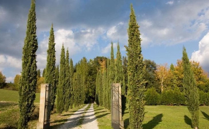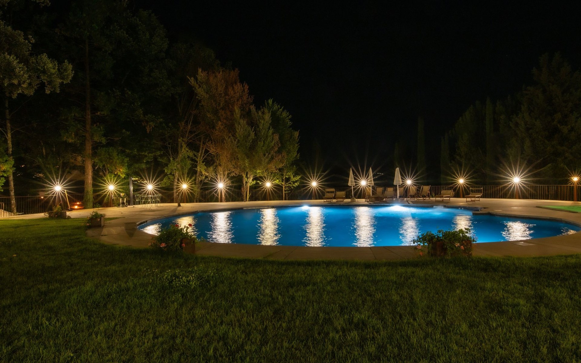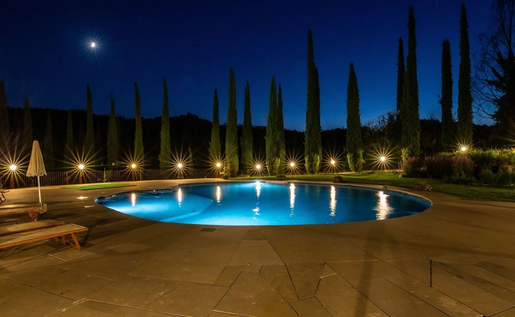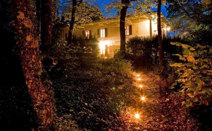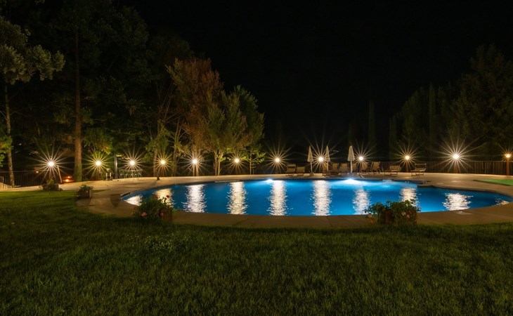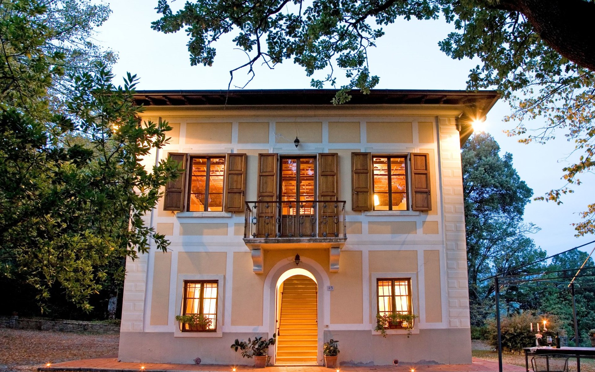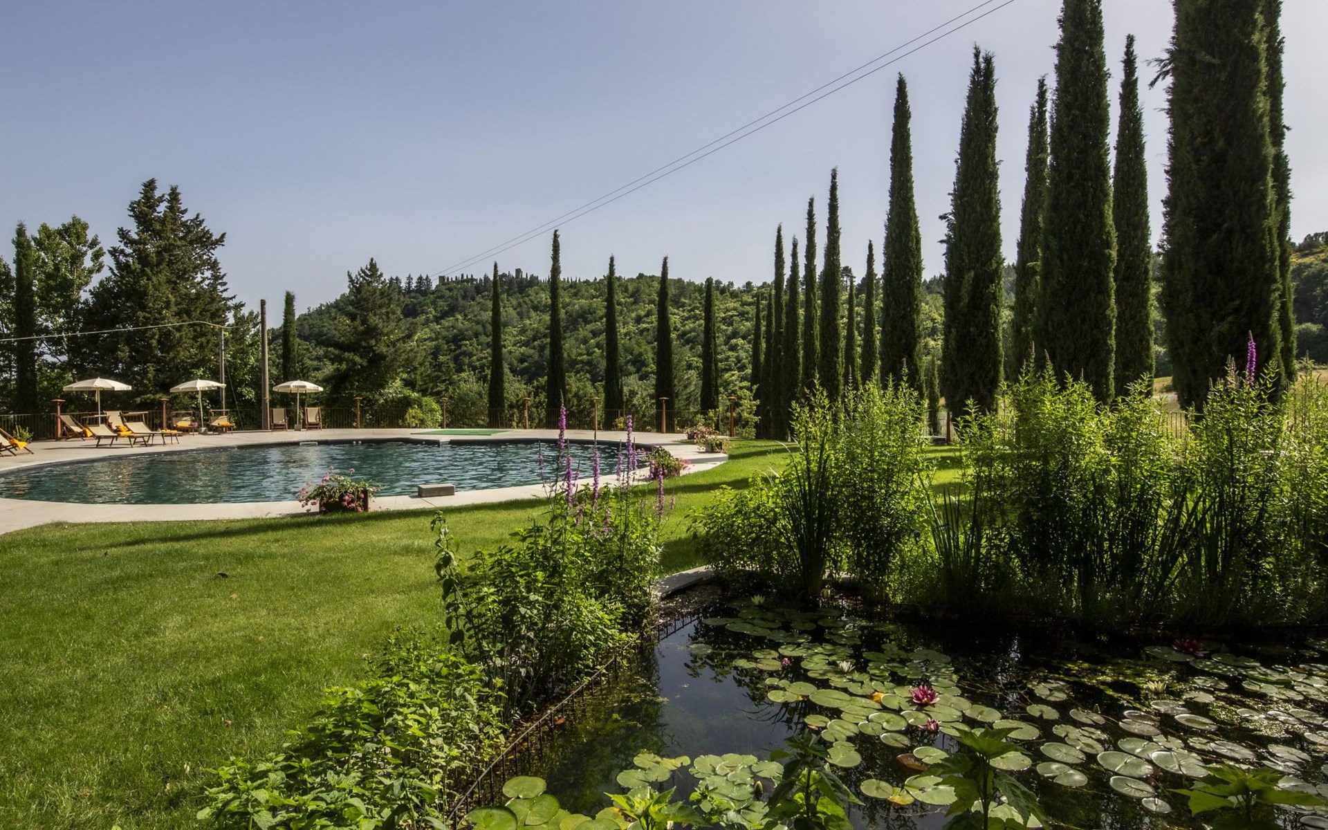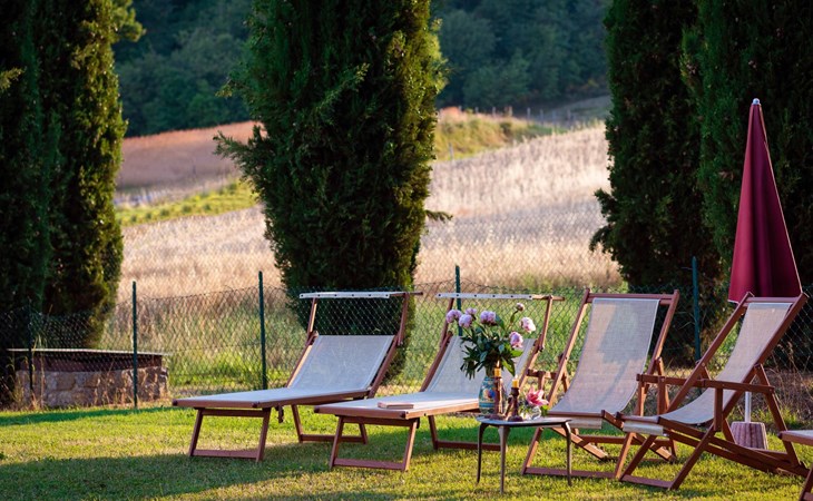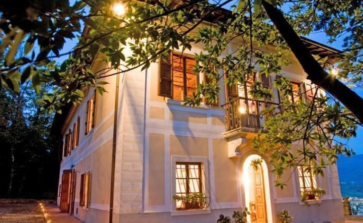 Maximaal 3 huisdieren/honden toegestaan. This detached holiday home dating back to the 19th century lies below the Castello di Romena and is surrounded by a large park with linden, oak and stone oak trees. A path about 300 metres long and lined with cypress trees leads to the property.The 250 m² living area extends over two floors. The ground floor has a fireplace room with a suite, a large dining room open towards the fireplace room, also with a suite and access to the outdoors. There is also a kitchen with access to the outdoors. The kitchen is equipped with an oven, gas hob, fridge with freezer compartment, dishwasher and coffee machine. The ground floor also has a bedroom with a double bed and private bathroom with shower and WC and an access to the outdoors. On the groundfloor there is also a second bedroom with double bed and private bathroom with shower and WC as well as a guest toilet. A staircase leads from the ground floor to the first floor, with an open living room with a balcony. The first floor also comprises two bedrooms with a double bed and each with a private bathroom, of which one has a bath, shower, two washbasins and a toilet, while the other has a shower, toilet, bidet and washbasin. During the renovation, the architectural details of the old building style were accentuated, resulting in a well-presented residential ambience with some antique furnishing, clay tiles and wooden ceiling beams or wooden paneling. There is a little house nearby with a washing machine. A TV and a DVD player are available.On the back of the house you can enjoy from the terrace with garden furniture and gazebo a beautiful view of the valley and the medieval castles of Poppi, Romena and Porciano. Approx. 40 m from the house is a large, fenced, circular swimming pool (water surface approx. 180 m², depth: 1.50 m; open in mid and high season with whirlpool. From season 2024 a portion of the large pool approx. 40 m². it will be heated, with night lighting, games for children and adults, with umbrellas, deck chairs with cushions and outdoor shower with hot water.Next to the pool is a summer kitchen with table, brick barbecue, sink and worktop .In case of booking of up to seven people, the guests have three bedrooms with three bathrooms. If requested, the fourth bedroom with en suite bathroom can be provided at an additional cost. You can order a payable bread and rolls service (only from Monday to Saturday, orders and payment locally)It is about 1km to the centre of Pratovecchio with shops. Near the house you can find a tennis court (1km), riding facilities (4km), and a 9-hole golf course (6km). Florence and Arezzo are about 40km from the house. It is about an hour by train from Arezzo to Rome. The property is completely fenced. IT051041B53AAC7G70