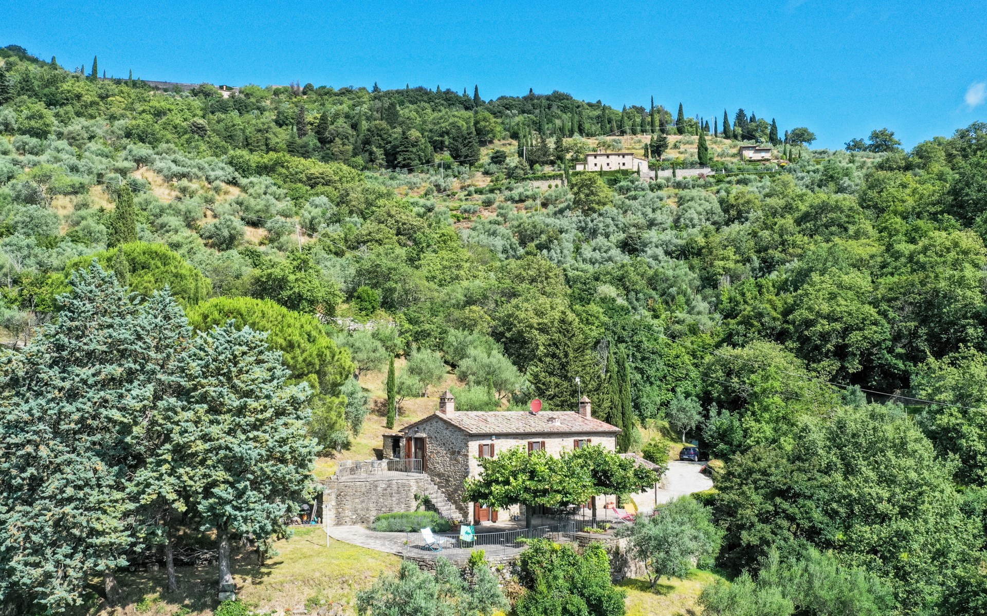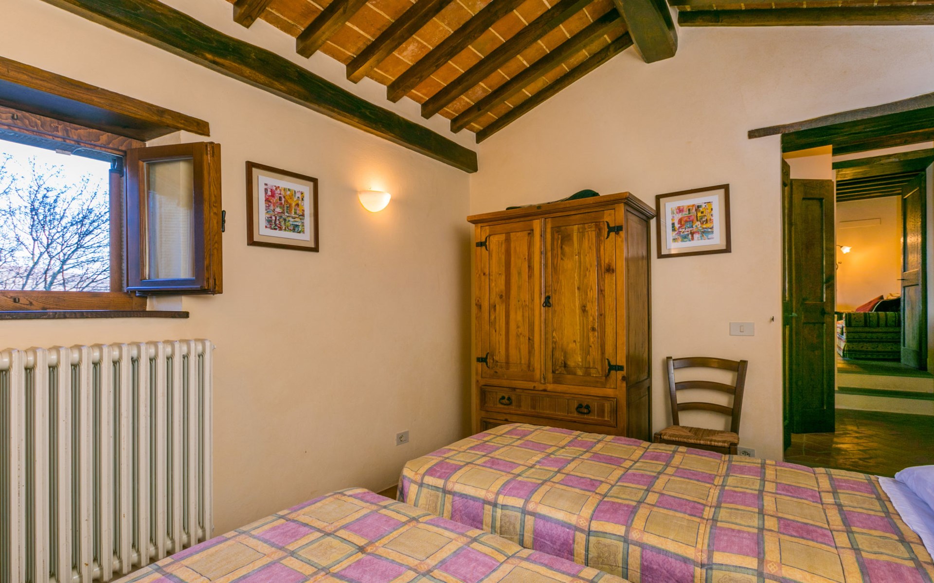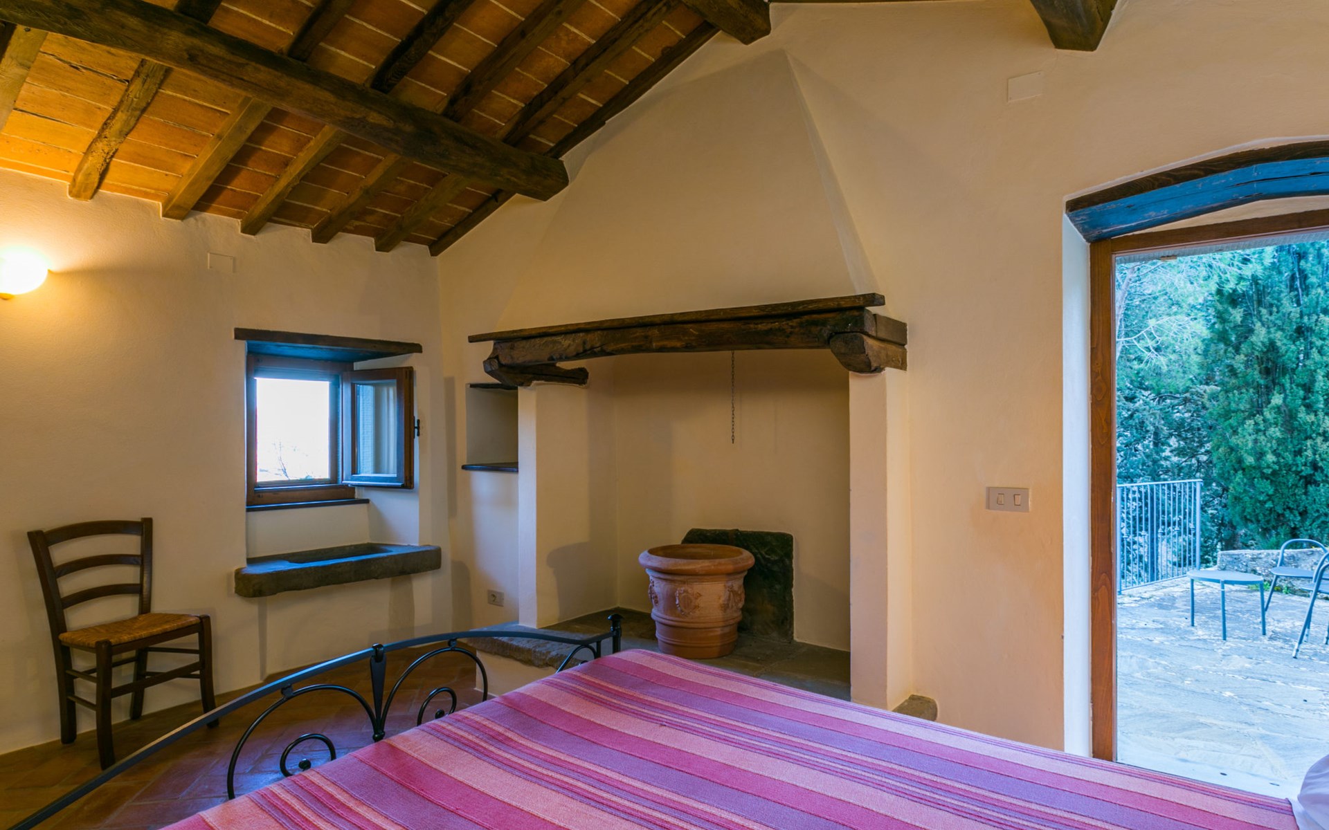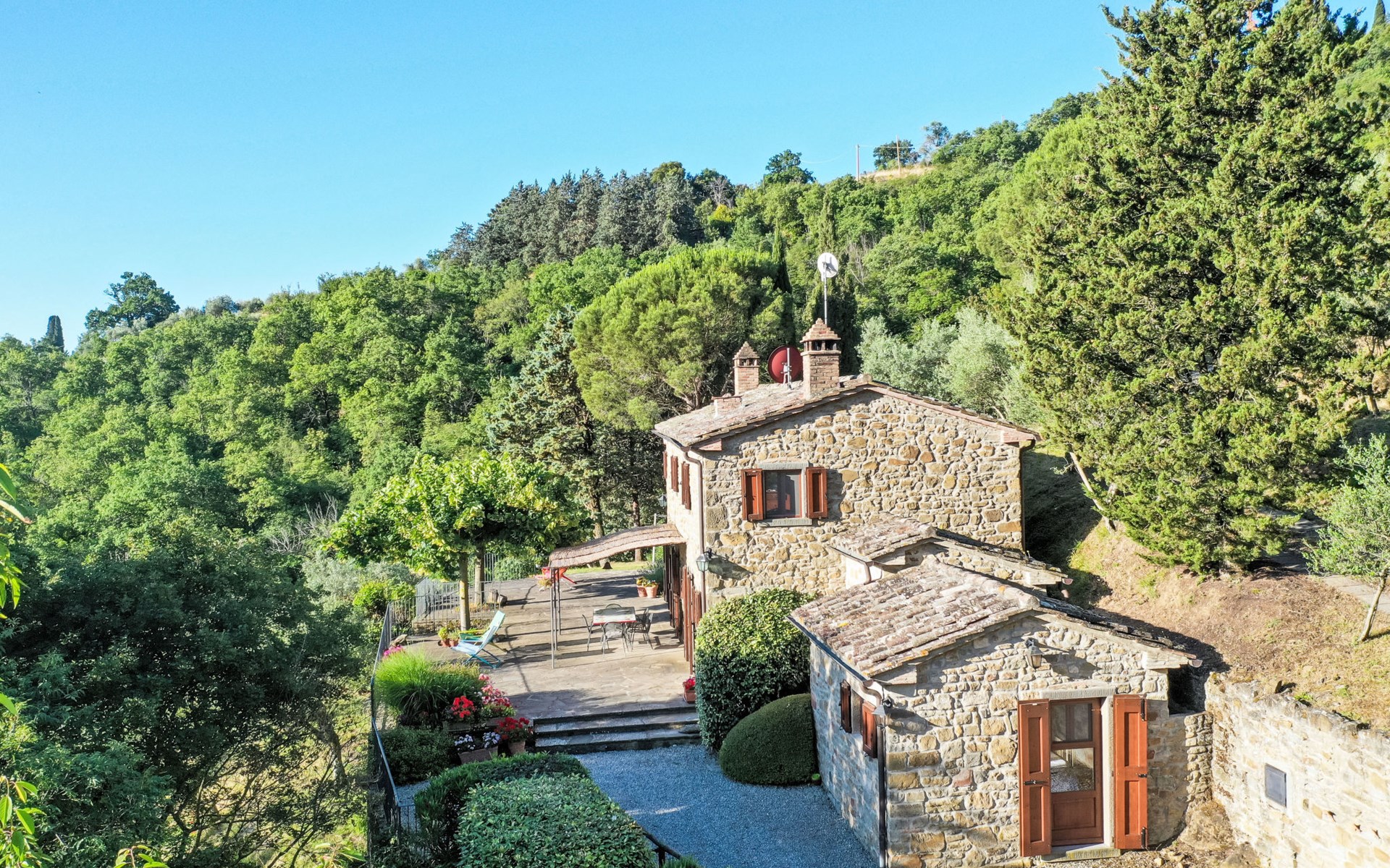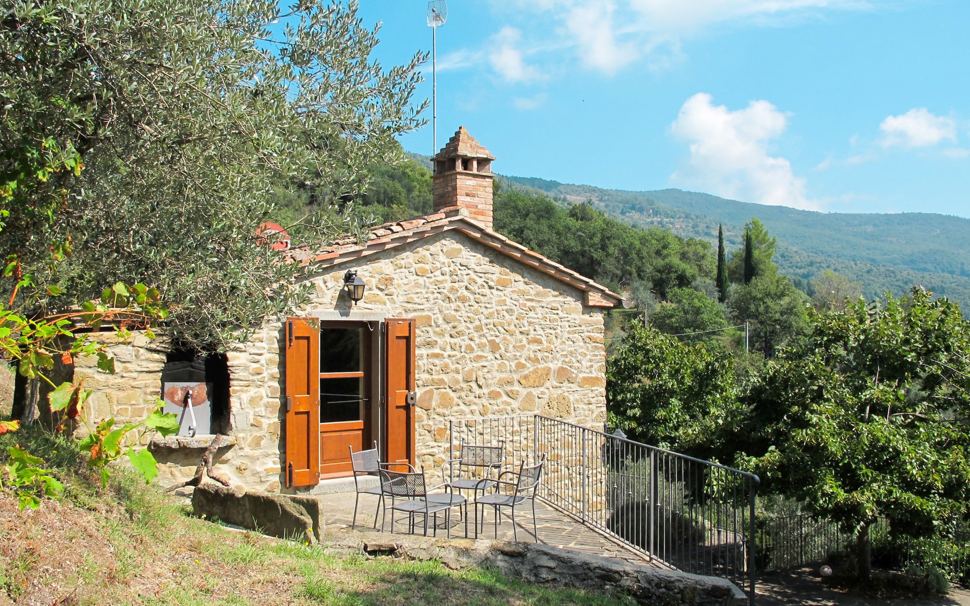 Gezellige rustieke woning "Bramasole", gerenoveerd in 2006, omgeven door bomen. 2 km van het centrum van Cortona, geïsoleerde, verhoogde ligging, 22 km van het meer, op het zuidwesten. Voor alleengebruik: wild terrein 25.000 m2, tuin op verschillende niveaus met bomen, boomgaard. Prieel, terras, tuinmeubelen, barbecue. Smalle toegangsweg (300 m onverharde weg). Parkeerplaats op het terrein. Supermarkt 8 km, restaurant 1.5 km, bar 1.5 km, bushalte 1.8 km, treinstation "Cortona Camucia" 5 km, openluchtzwembad 1 km, meer (zwemmen) "Trasimeno" 22 km. Golfterrein (9 holes) 23 km, tennis 1 km, wandelroutes 100 m vanaf het huis. Attracties in de buurt: Arezzo 35 km, Montepulciano 35 km, Pienza 52 km, Perugia 55 km, Assisi 73 m. Baby uitrusting (incl.). Het objekt is geschikt voor 6 volwassenen groepen jongeren uitsluitend op aanvraag.