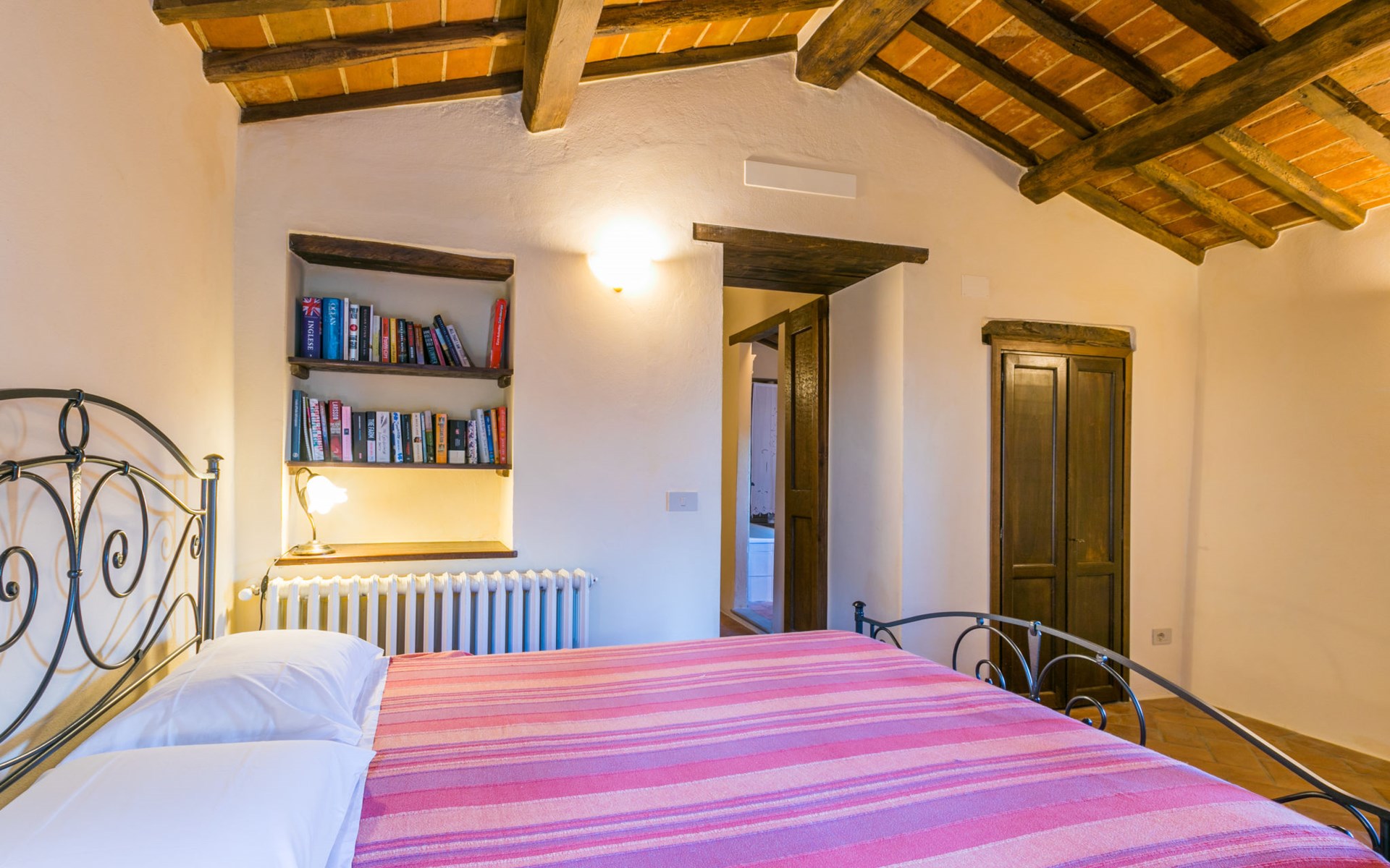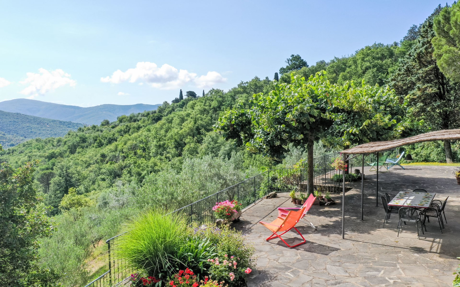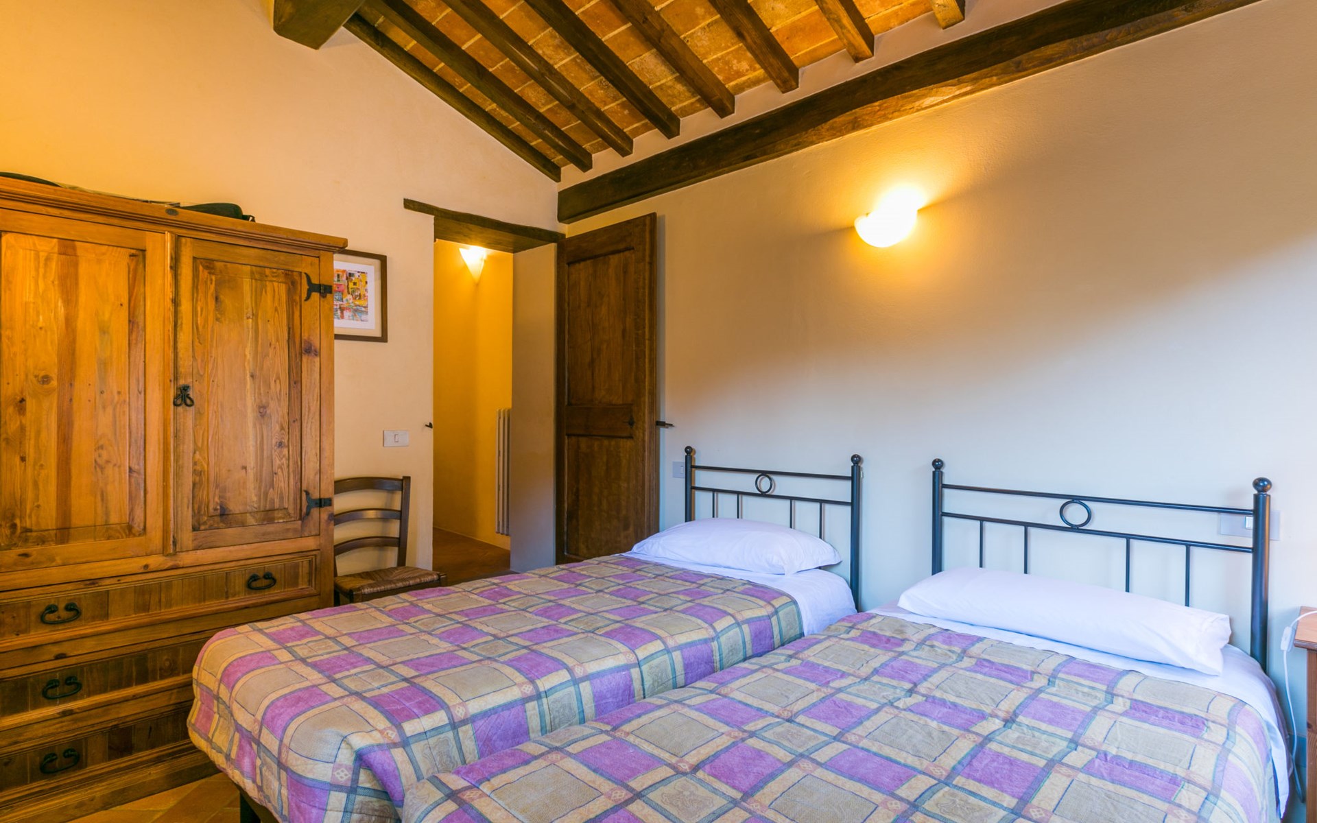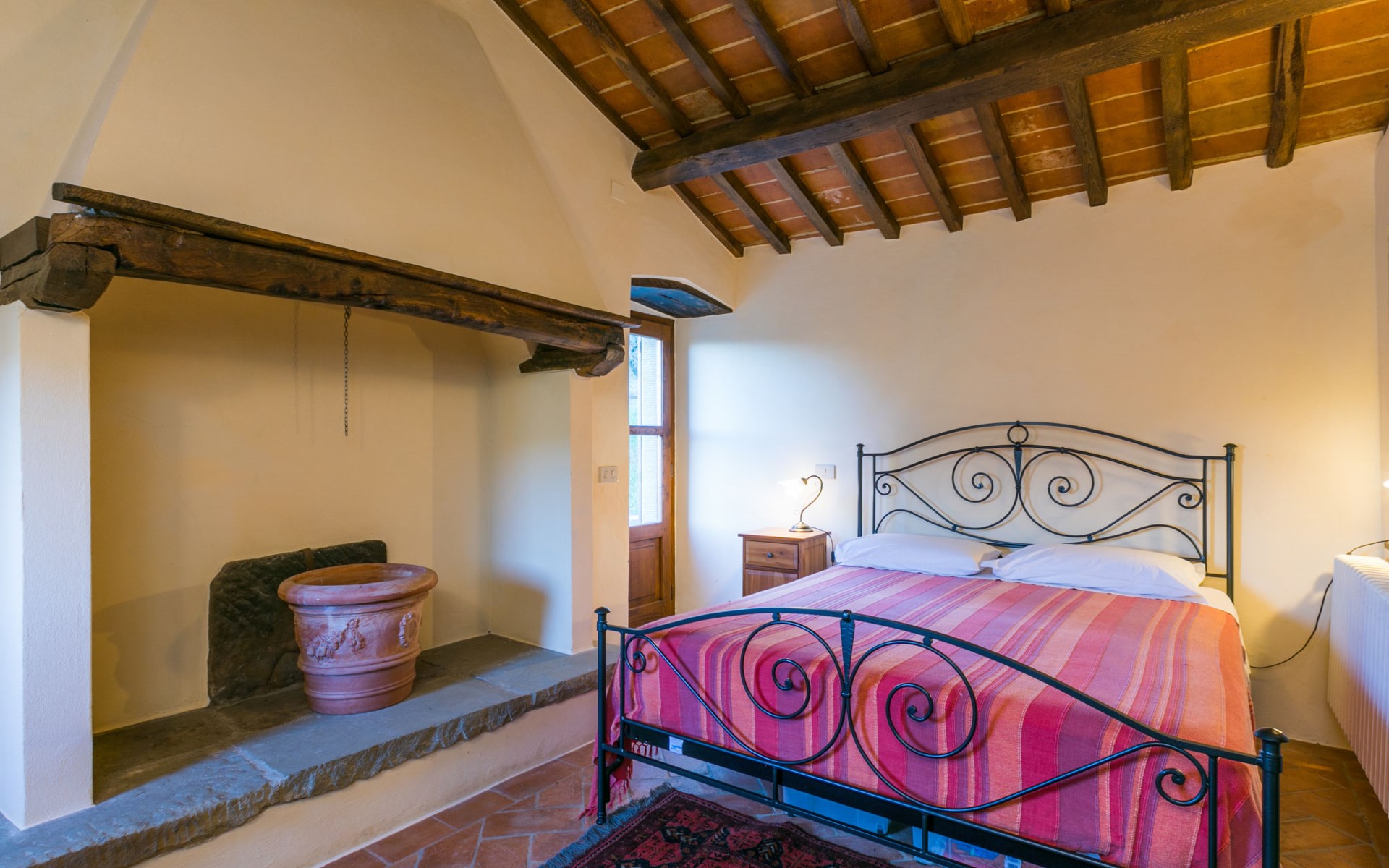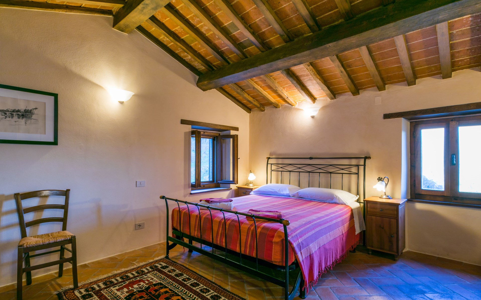 Gezellige rustieke woning "Bramasole", gerenoveerd in 2006, omgeven door bomen. 2 km van het centrum van Cortona, geïsoleerde, verhoogde ligging, 22 km van het meer, op het zuidwesten. Voor alleengebruik: wild terrein 25.000 m2, tuin op verschillende niveaus met bomen, boomgaard. Prieel, terras, tuinmeubelen, barbecue. Smalle toegangsweg (300 m onverharde weg). Parkeerplaats op het terrein. Supermarkt 8 km, restaurant 1.5 km, bar 1.5 km, bushalte 1.8 km, treinstation "Cortona Camucia" 5 km, openluchtzwembad 1 km, meer (zwemmen) "Trasimeno" 22 km. Golfterrein (9 holes) 23 km, tennis 1 km, wandelroutes 100 m vanaf het huis. Attracties in de buurt: Arezzo 35 km, Montepulciano 35 km, Pienza 52 km, Perugia 55 km, Assisi 73 m. Baby uitrusting (incl.). Het objekt is geschikt voor 6 volwassenen groepen jongeren uitsluitend op aanvraag.