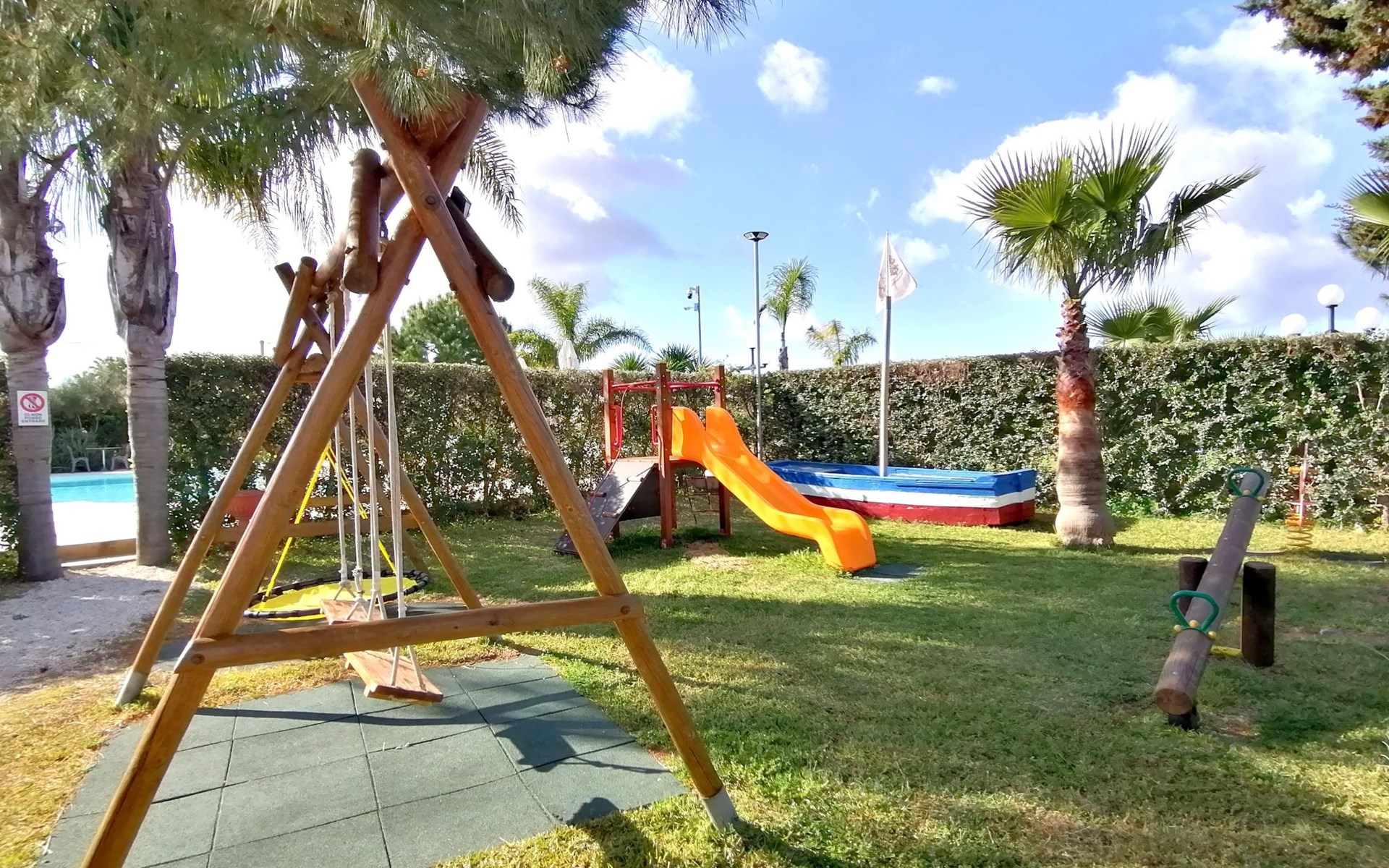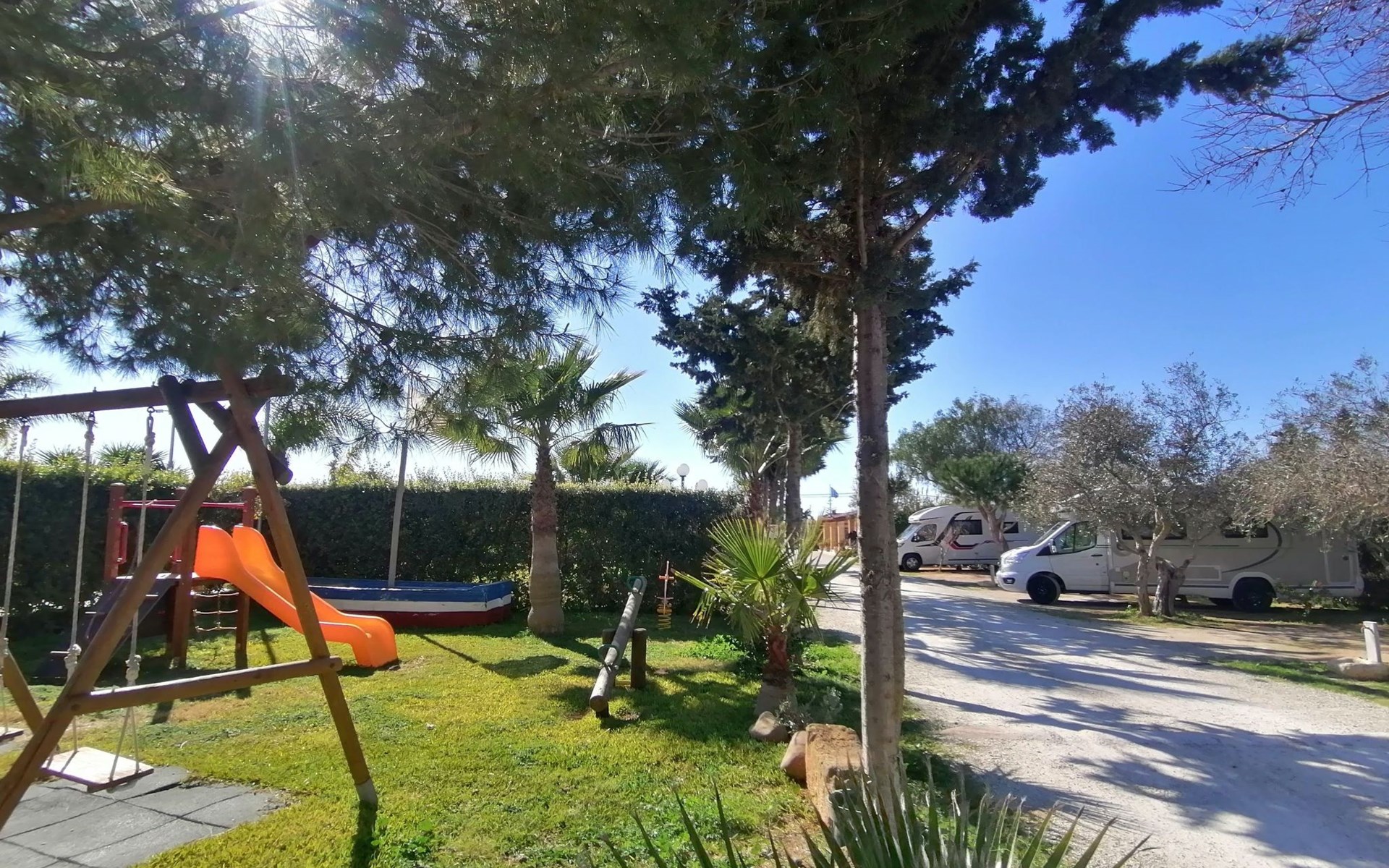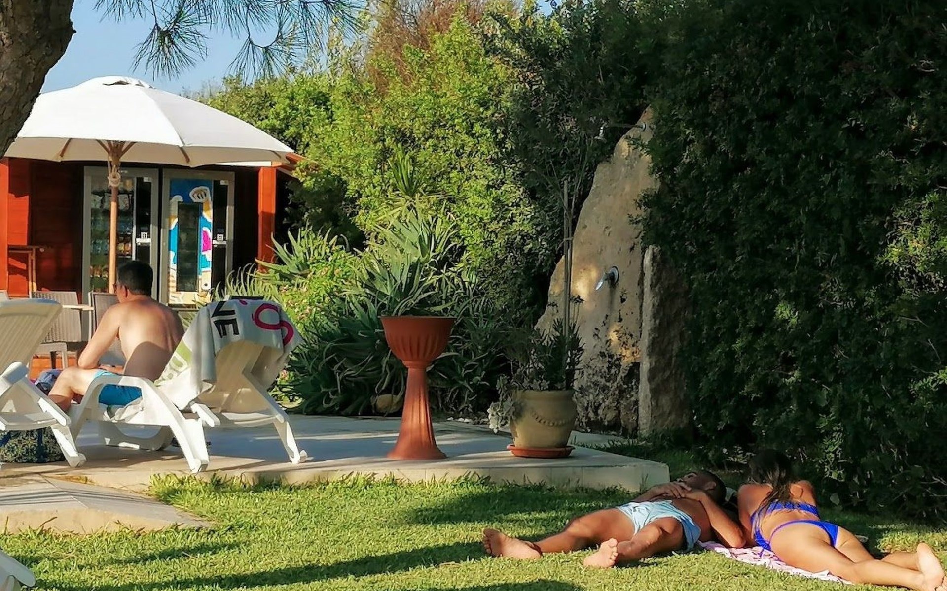 zwembad, solarium, barbecueplaats, ontbijtkiosk, drank- en ijsautomaten, speelruimte voor kinderen en jongeren, woonkamer met bibliotheek.