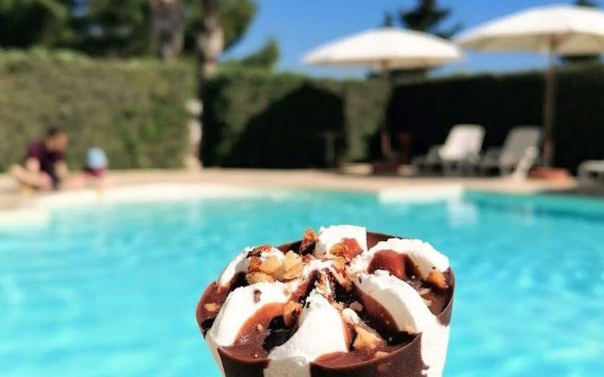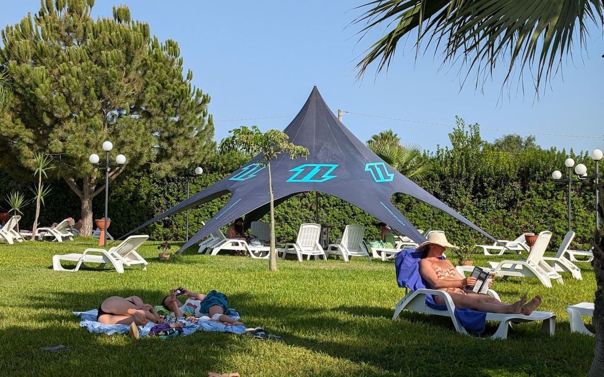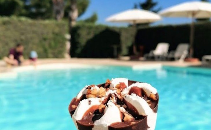 zwembad, solarium, barbecueplaats, ontbijtkiosk, drank- en ijsautomaten, speelruimte voor kinderen en jongeren, woonkamer met bibliotheek.