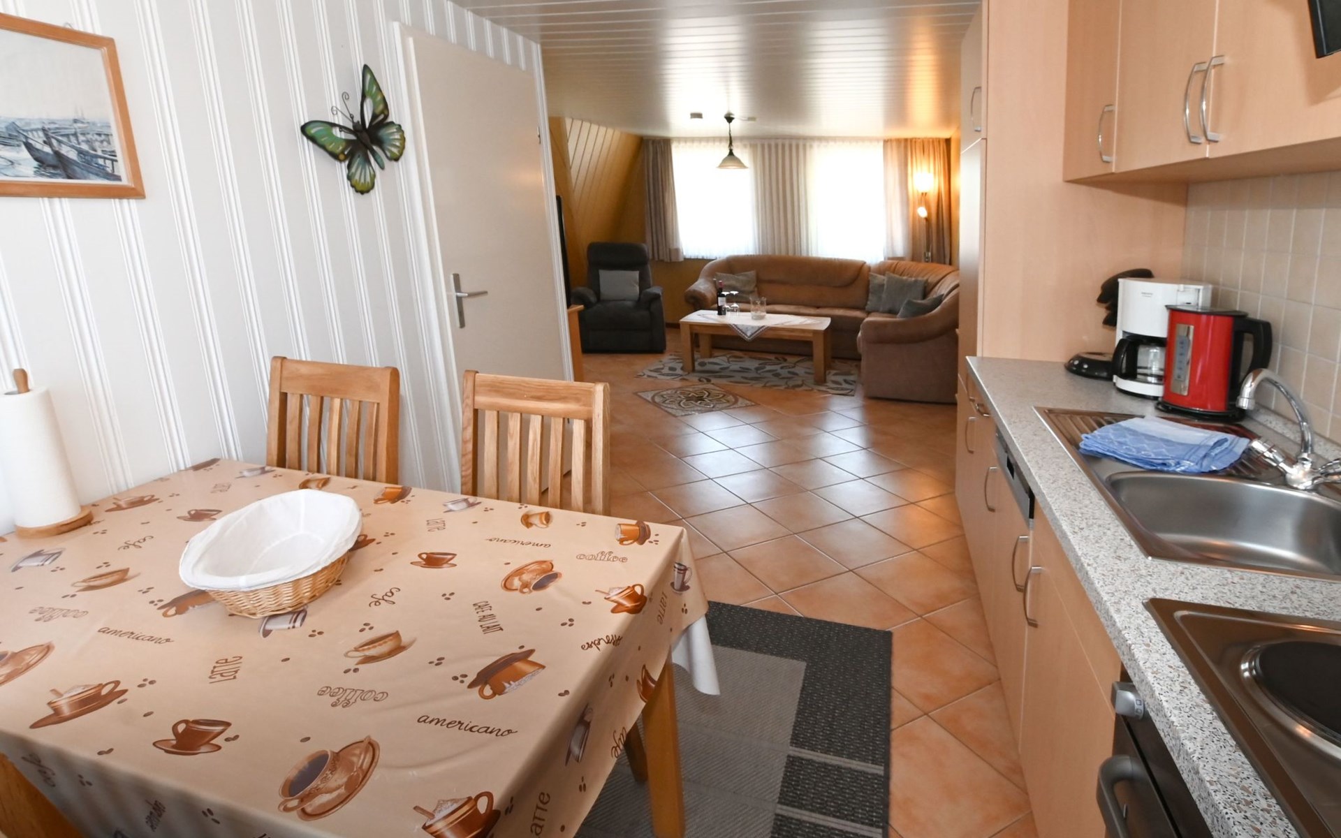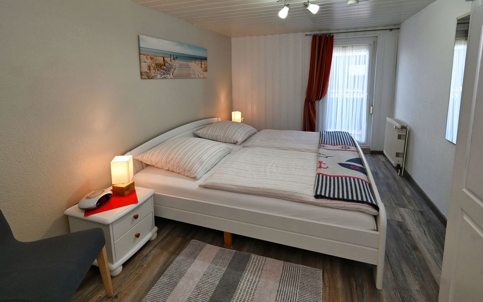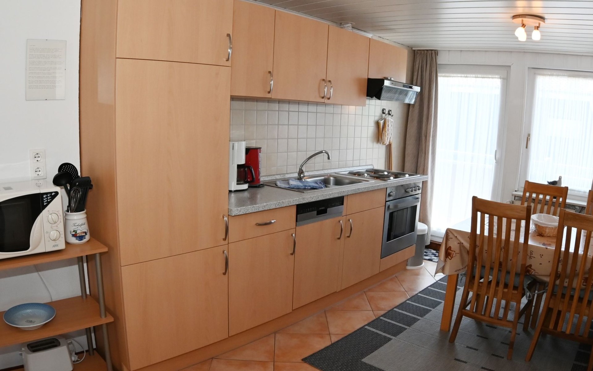 Our holiday flat is located in the centre of Büsum. Here you live very centrally, cosily and comfortably. The beach, pedestrian zone, harbour, shopping facilities and town centre are all within easy walking distance. In the house Karin are: 2 holiday flats and two permanent flats. Our non-smoking 3-room 58 m² holiday flat on the first floor has been lovingly furnished in a contemporary, bright, allergy-friendly style and with every comfort. Floors are tiled or covered with laminate. Our holiday flat has a west-facing balcony.The non-smoking holiday flat Haus Karin 02 is located on the 1st floor holiday flat and is about 58 m² in size it has the following rooms: A living room with kitchenette and a corner couch, coffee table, stool, 1x recliner, 1x stool floor lamp, 42 inch flat screen TV, sideboard and weather station radio CD player floor covered with tiles, hoover. A fully equipped kitchen with 4 ring hob, oven, dishwasher, kettle, toaster, egg cooker, Senseo, microwave, crockery, saucepans, coffee machine, fridge with 3*** freezer compartment, blender, table with 4x chairs, tiled floor. Next to it is a bedroom with 2 single beds 2.00x0.90m wide comfort slatted rose, 2x bedside tables with cloth lamps, wardrobe, chair, (satellite TV with DVD and Playstation 3 . Flooring was laid with laminate. 2 bedrooms with double bed 2.00m x 2.00m wide with comfort slatted bed frame, 2x bedside tables, cloth lamps, wardrobe, mirror, stool, laminate flooring. Bathroom with shower, mirror cabinet with vanity unit, washbasin, scales, hairdryer, stool, make-up mirror, standing toilet. Hallway with wardrobe, tiled floor. We have free W-Lan for you for failures and disturbances we assume no liability.The west-facing balcony is equipped with garden furniture 4x chairs 2x tables, parasol. In 15 m distance is still a garden house with table football, table with 4 chairs and a grill ca.40m² races for common use available. there is no possibility to charge an electric car for this the house current is not designed fire hazard.Car parking space directly at the house, bicycles can be locked in the garage.The distance to the beach is about 900m. The beach is accessible via good paths, so that e.g. a pram or handcart can be taken along. The town centre with restaurants and supermarkets is approx. 800m away. Approx. 15 minutes walk