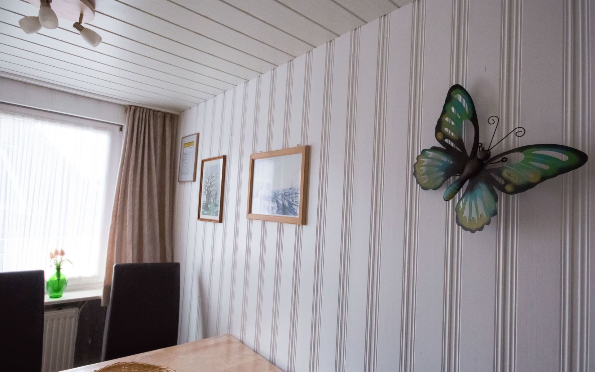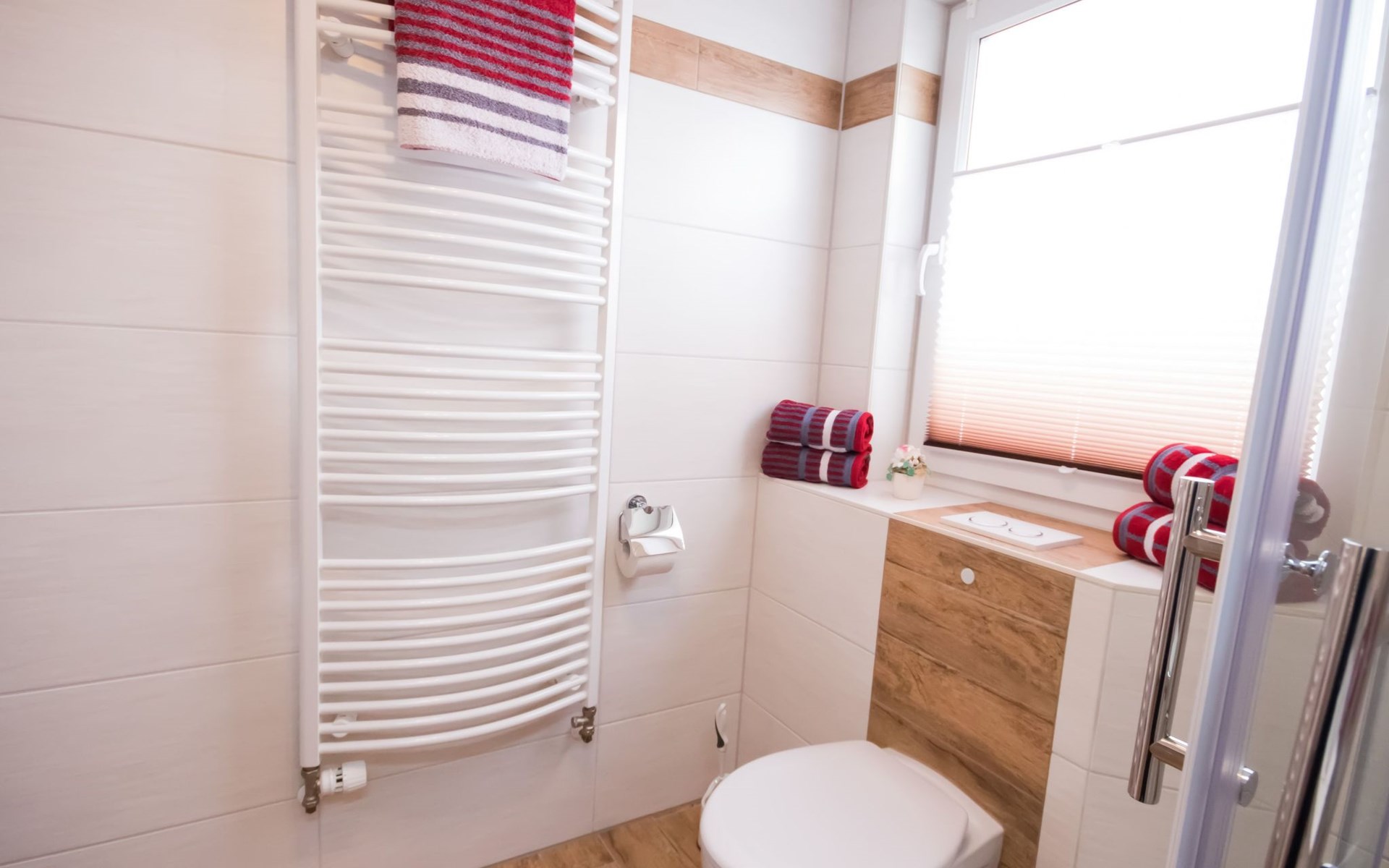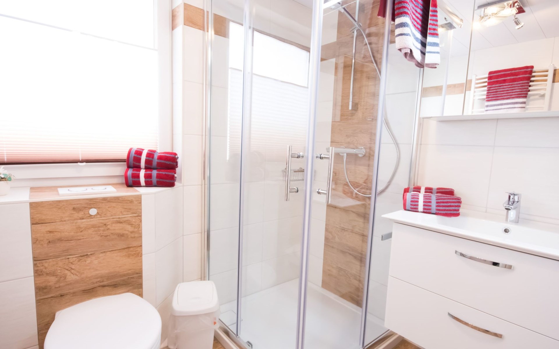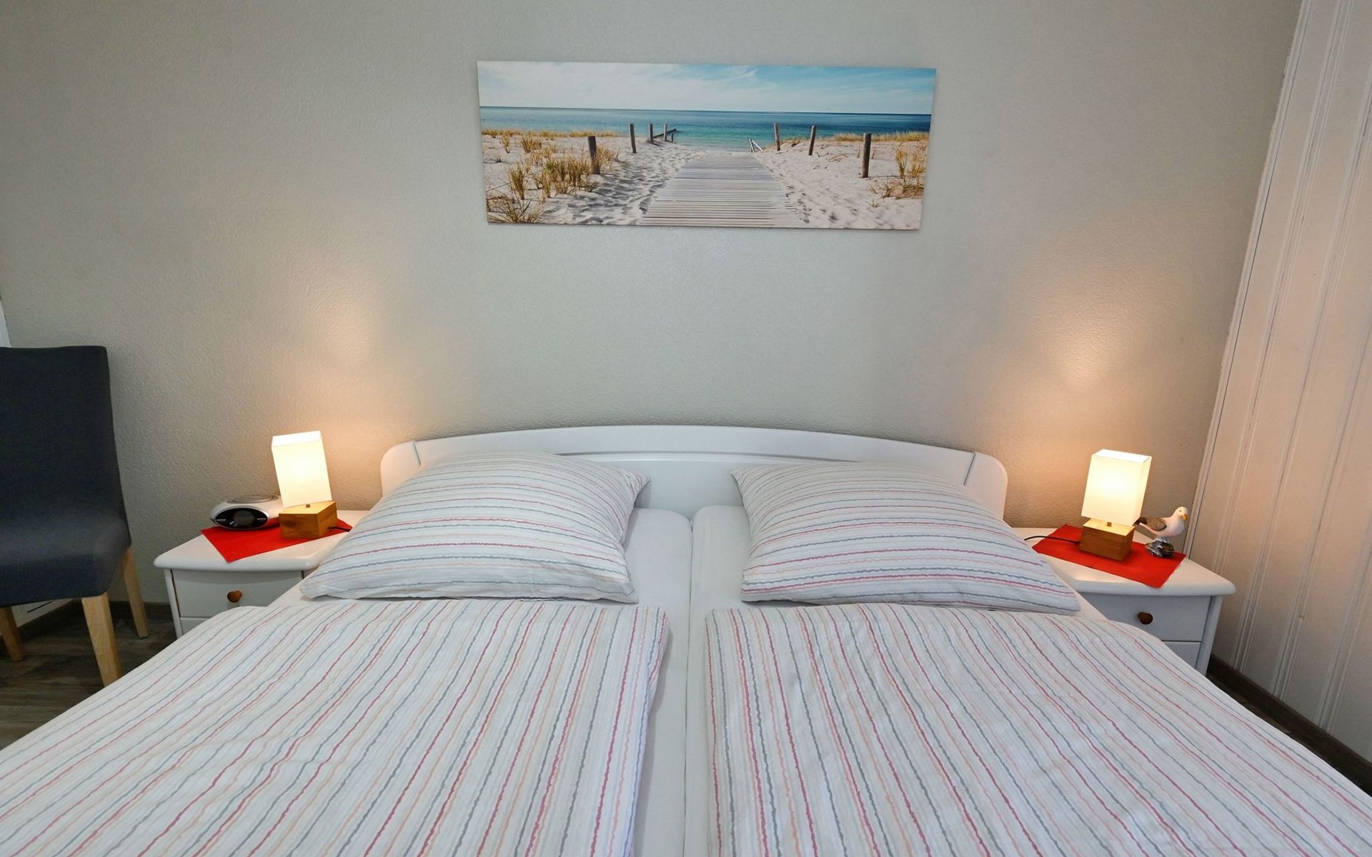 Our holiday flat is located in the centre of Büsum. Here you live very centrally, cosily and comfortably. The beach, pedestrian zone, harbour, shopping facilities and town centre are all within easy walking distance. In the house Karin are: 2 holiday flats and two permanent flats. Our non-smoking 3-room 58 m² holiday flat on the first floor has been lovingly furnished in a contemporary, bright, allergy-friendly style and with every comfort. Floors are tiled or covered with laminate. Our holiday flat has a west-facing balcony.The non-smoking holiday flat Haus Karin 02 is located on the 1st floor holiday flat and is about 58 m² in size it has the following rooms: A living room with kitchenette and a corner couch, coffee table, stool, 1x recliner, 1x stool floor lamp, 42 inch flat screen TV, sideboard and weather station radio CD player floor covered with tiles, hoover. A fully equipped kitchen with 4 ring hob, oven, dishwasher, kettle, toaster, egg cooker, Senseo, microwave, crockery, saucepans, coffee machine, fridge with 3*** freezer compartment, blender, table with 4x chairs, tiled floor. Next to it is a bedroom with 2 single beds 2.00x0.90m wide comfort slatted rose, 2x bedside tables with cloth lamps, wardrobe, chair, (satellite TV with DVD and Playstation 3 . Flooring was laid with laminate. 2 bedrooms with double bed 2.00m x 2.00m wide with comfort slatted bed frame, 2x bedside tables, cloth lamps, wardrobe, mirror, stool, laminate flooring. Bathroom with shower, mirror cabinet with vanity unit, washbasin, scales, hairdryer, stool, make-up mirror, standing toilet. Hallway with wardrobe, tiled floor. We have free W-Lan for you for failures and disturbances we assume no liability.The west-facing balcony is equipped with garden furniture 4x chairs 2x tables, parasol. In 15 m distance is still a garden house with table football, table with 4 chairs and a grill ca.40m² races for common use available. there is no possibility to charge an electric car for this the house current is not designed fire hazard.Car parking space directly at the house, bicycles can be locked in the garage.The distance to the beach is about 900m. The beach is accessible via good paths, so that e.g. a pram or handcart can be taken along. The town centre with restaurants and supermarkets is approx. 800m away. Approx. 15 minutes walk