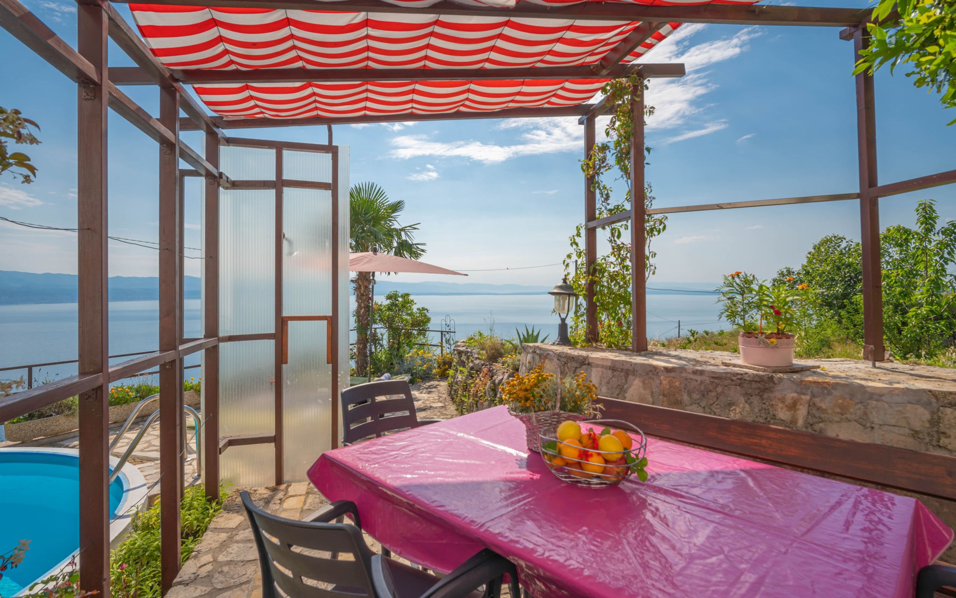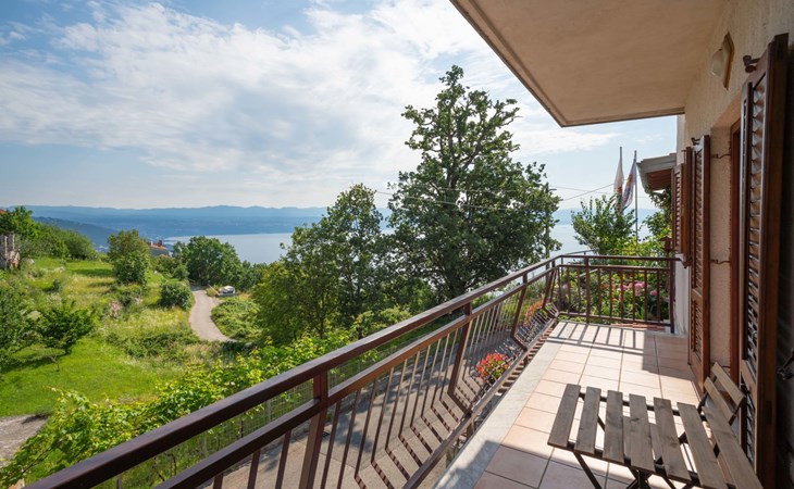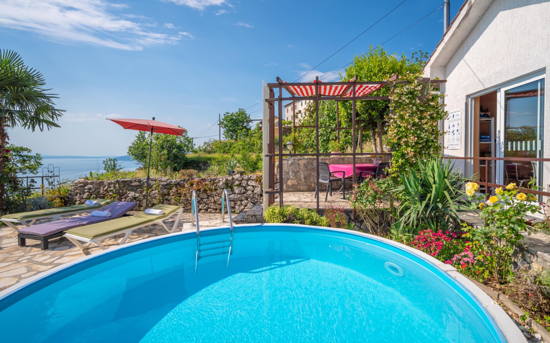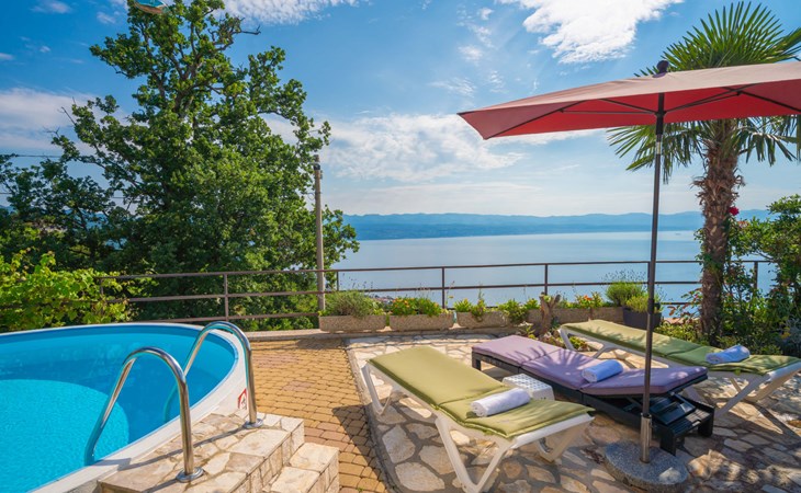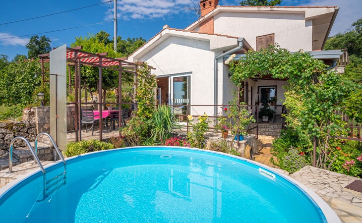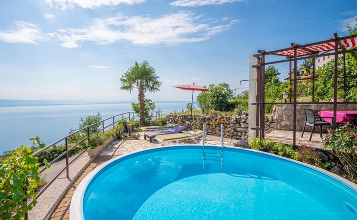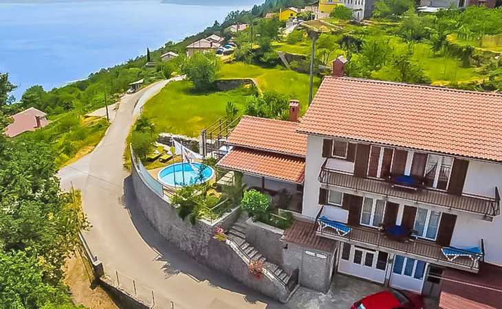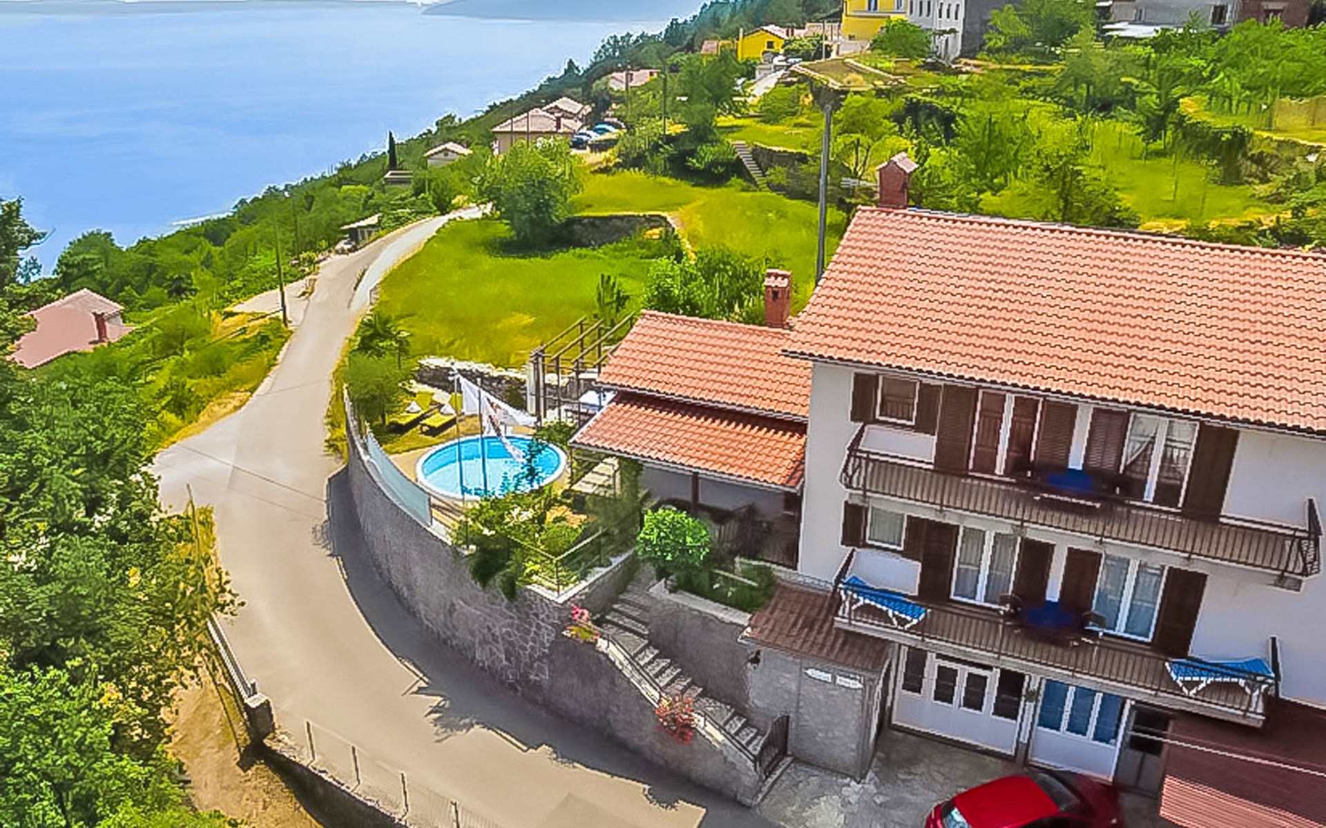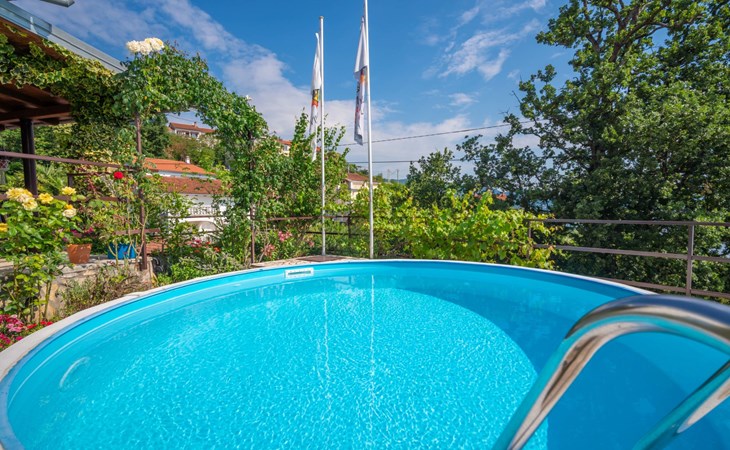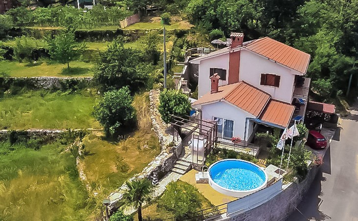 Tuliševica 5 km van Lovran: Gezellige twee onder één kap woning "Villa More". Boven Lovran, in het gehucht Tuliševica, 8 km van het centrum van Opatija, rustige, zonnige ligging tegen een helling, 6 km van zee, 6 km van het strand, te midden van groen, op het zuiden. Voor alleengebruik: openluchtzwembad rond (4 m diameter, 120 cm diepte, seizoensgebonden beschikbaarheid: 01.Mei. - 15.Okt.). Basketbal, volleybal, terras (21 m2), tuinmeubelen, barbecue, kinderspeelplaats (glijbaan, schommel). In het huis: internetaansluiting. Overdekte parkeerplaats (voor 3 auto's) bij het huis op het terrein. Winkel 500 m, supermarkt 5 km, restaurant 1 km, bushalte 350 m, kiezelstrand 6 km, stenenstrand 6 km, rotsstrand 6 km, overdekt zwembad 6 km, strandbad 6 km. Tennis 6 km.