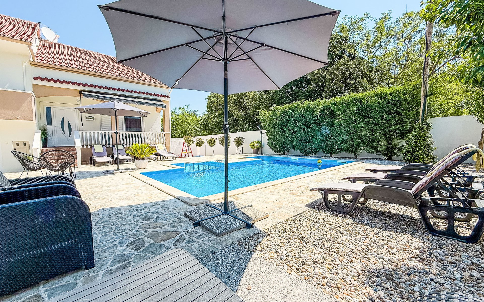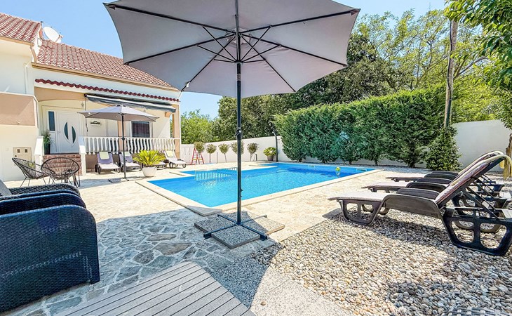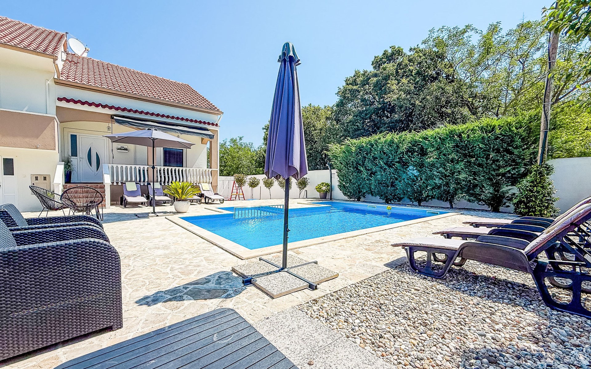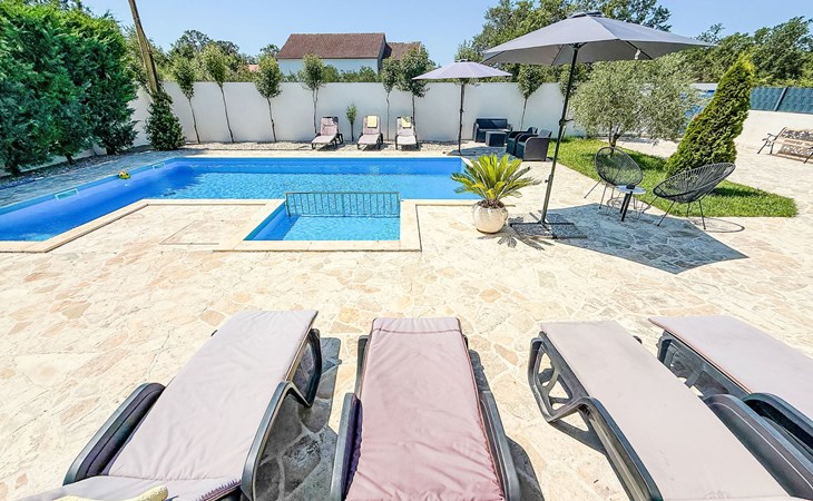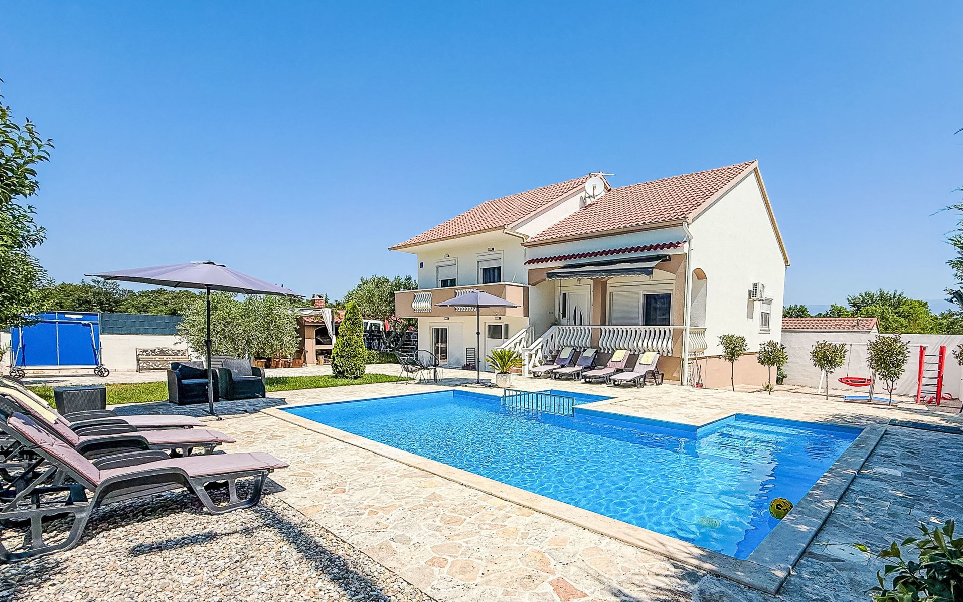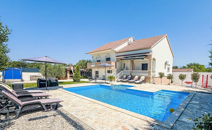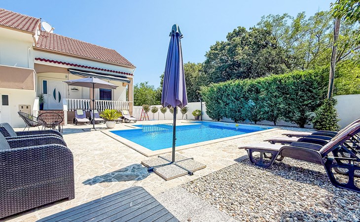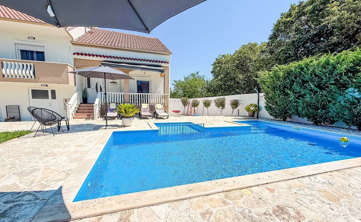 Briševo 11 km van Zadar: Eengezinswoning "Tina & Tino", van 3 verdiepingen. Zonnige ligging, 11 km van zee, aan een weg. Voor alleengebruik: terrein 1.300 m2 (omheind), openluchtzwembad hoekig (8 x 4 m, 140 cm diepte, seizoensgebonden beschikbaarheid: 02.Mei. - 26.Sep.) met trap. Buitendouche, tuinmeubelen, barbecue. In het huis: internetaansluiting, wasmachine. Parkeerplaats (voor 3 auto's) bij het huis op het terrein. Winkel 500 m, restaurant 2.3 km, bushalte 4 km, kiezelstrand 11 km. Tennis 15 km. Attracties in de buurt: Aquapark 15 km.