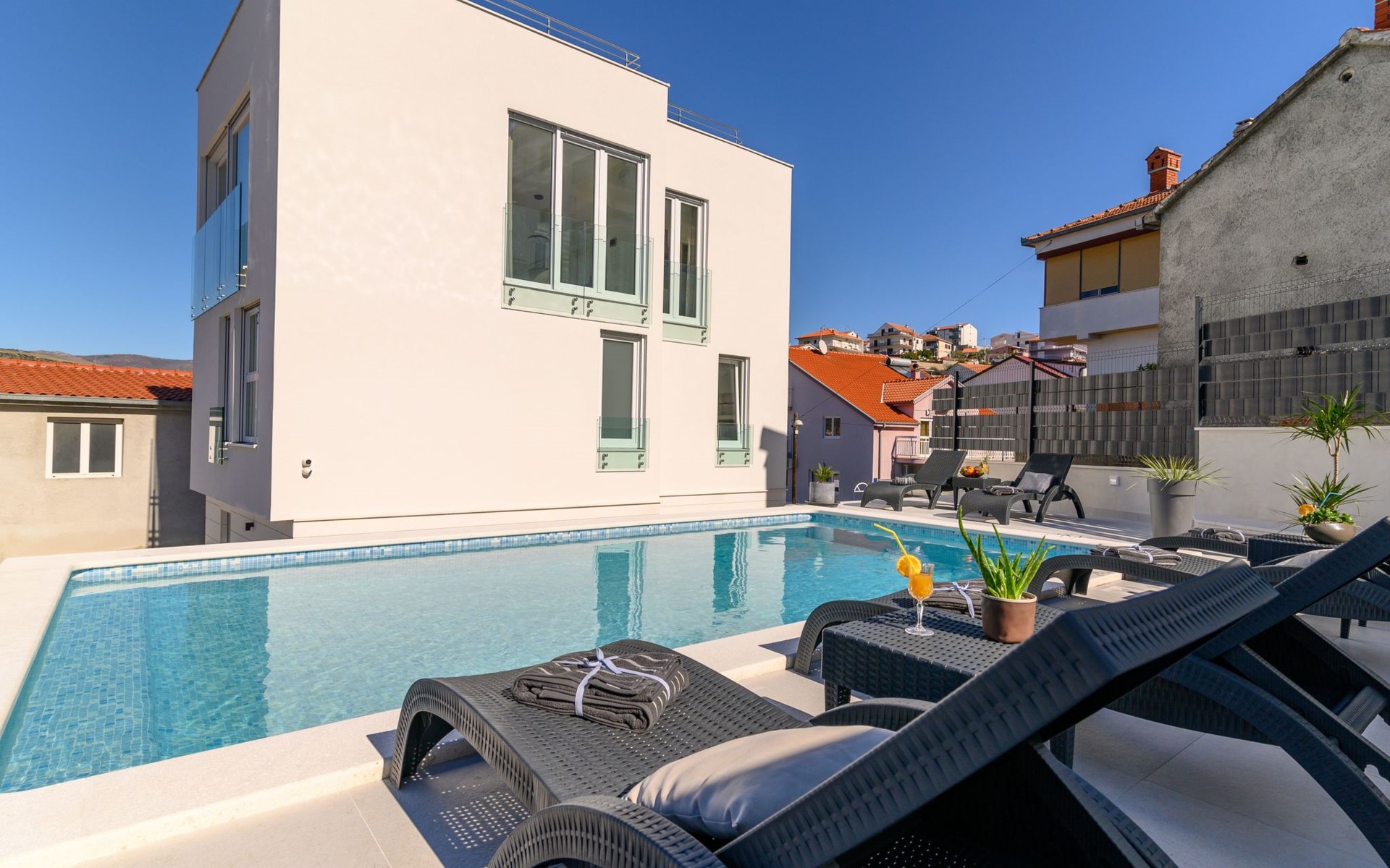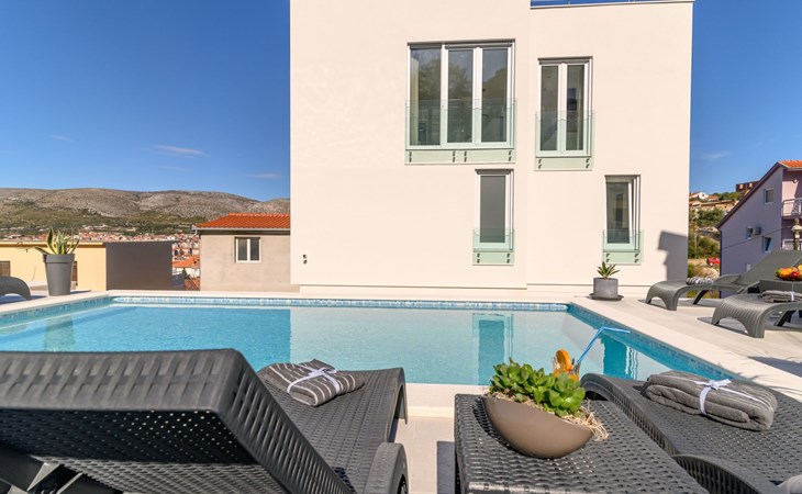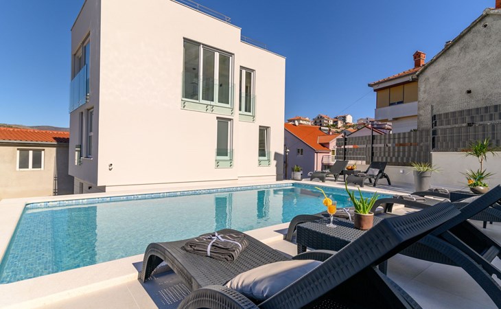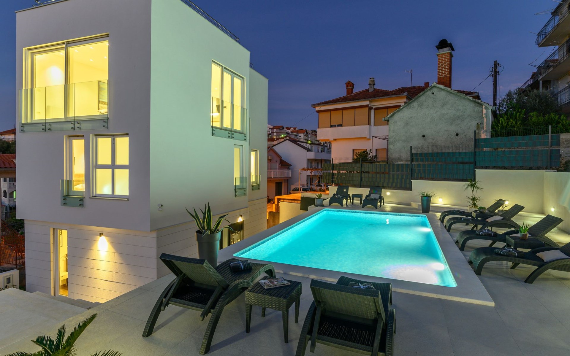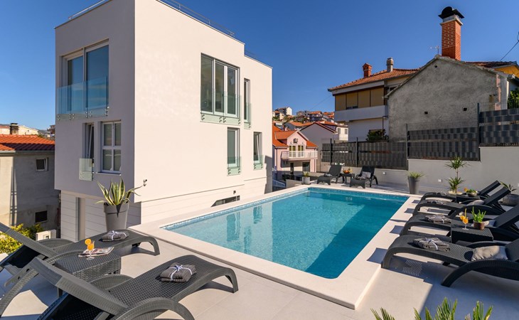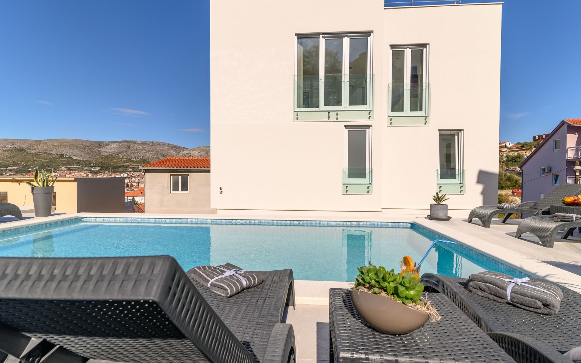 Experience unparalleled luxury and comfort in our brand-new villa, embarking on its inaugural season to offer guests the pinnacle of vacationing. Leveraging years of experience in the tourism industry, we’ve crafted every aspect of your stay to ensure a relaxing, stress-free, and unforgettable holiday. Set against the majestic backdrop of the Adriatic Sea and the historic old town of Trogir, this villa epitomizes the perfect holiday retreat.Inside, the villa unfolds over three spacious floors, each meticulously designed for your comfort. The second floor, a breathtaking open-concept space, houses the living room, dining room, and kitchen, all framing stunning views through a French balcony. Bedrooms, located on the ground and first floors, offer serene private havens, paired with modern bathrooms that ensure your utmost convenience and privacy. Throughout the villa, WiFi access keeps you connected, enveloping you in the luxury and ease of modern living.Outside, the villa’s allure continues with a rooftop terrace presenting a spectacular vantage point over the sea and Trogir’s old town. This outdoor relax zone is the villa’s crowning glory, inviting you to unwind and drink in the breathtaking panorama. The beautifully designed swimming pool offers a tranquil escape, encouraging leisurely days spent basking in the sun after exploring the local sights.Nestled just a 10-minute walk from Trogir’s captivating old town center, the villa’s location is second to none. Proximity to a pristine beach and the town center places you in an ideal spot to experience everything this enchanting area has to offer, from historical sites to culinary delights. Every need or desire for a perfect holiday is within easy reach, making each day a new opportunity for adventure and exploration.Embrace the luxury, serenity, and immaculate design of our villa for a holiday that transcends the ordinary. Let the breathtaking views of the Adriatic and the cultural richness of Trogir craft your unforgettable holiday narrative. Here, every moment is a promise of relaxation, inspiration, and experiences that will linger long after your journey home.