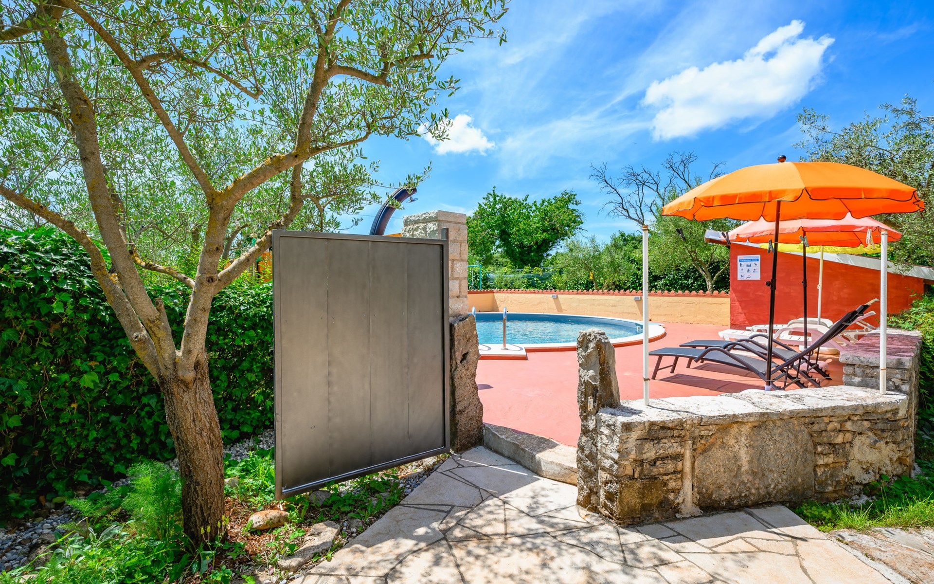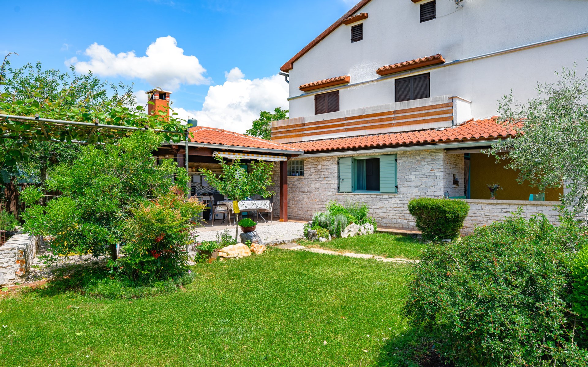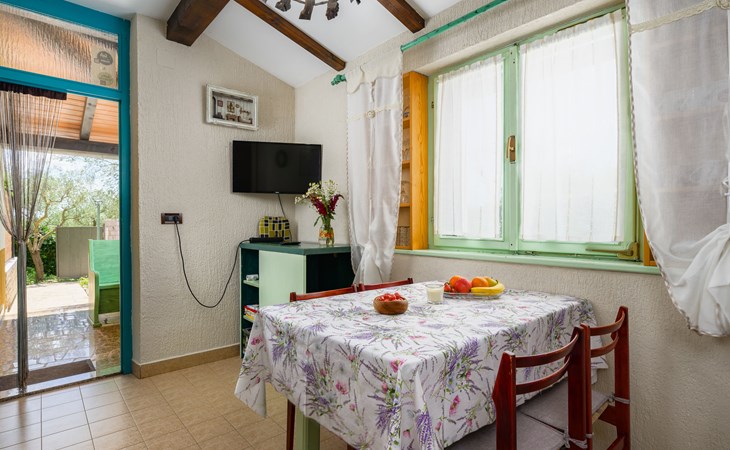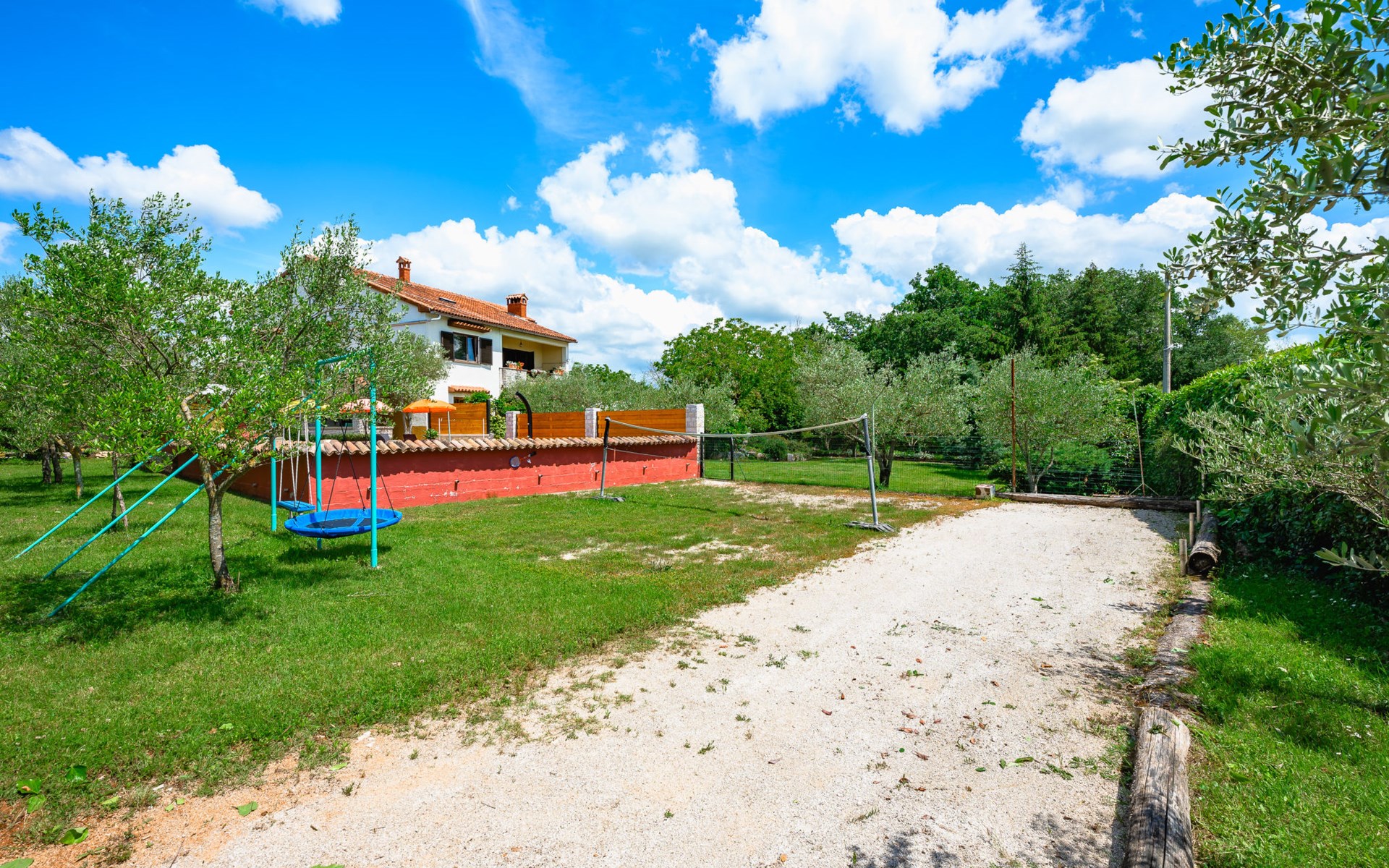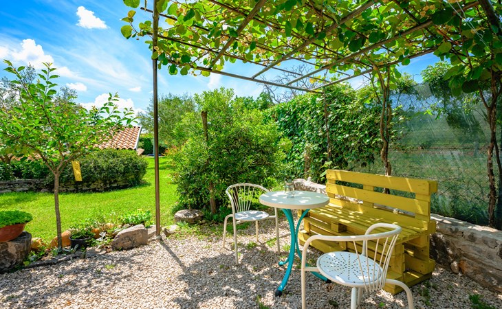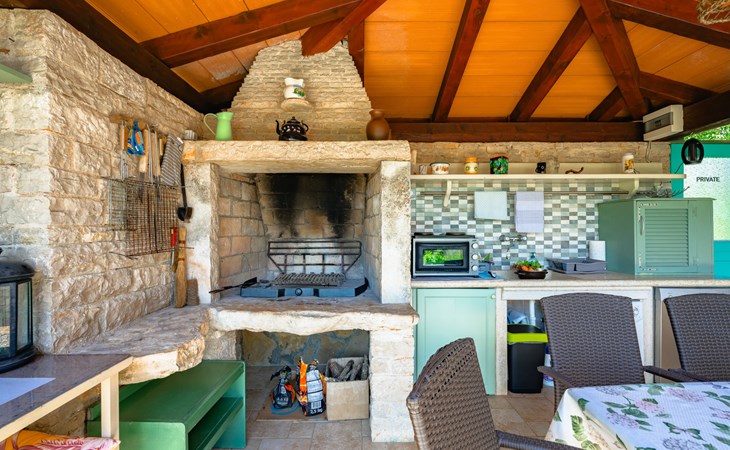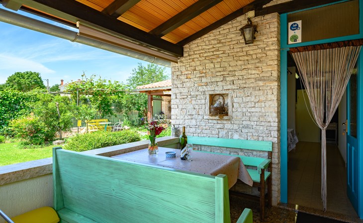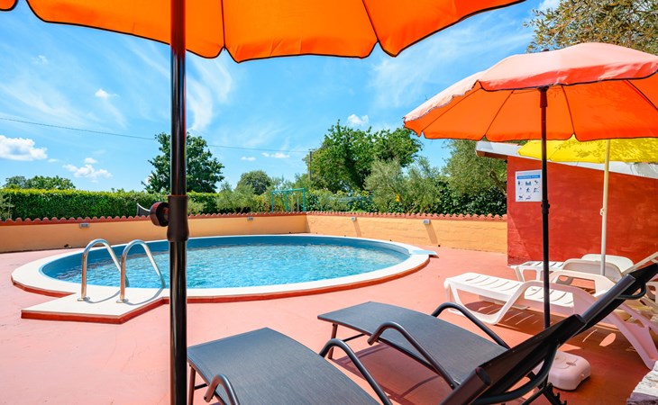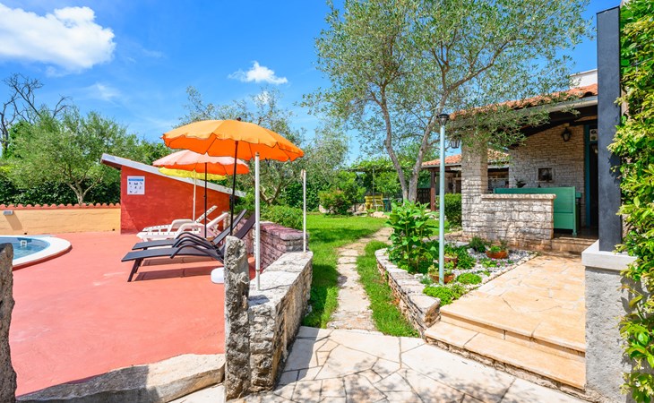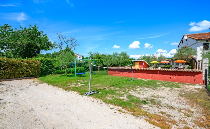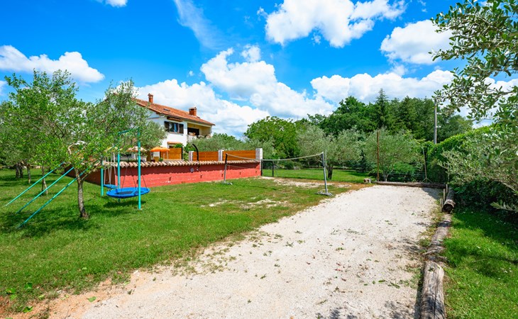 Twee onder één kap woning "Pina". In het gehucht Muntrilj, 15 km van het centrum van Pazin, 4 km van het centrum van Tinjan, 18 km van het centrum van Poreč, 18 km van zee. Voor medegebruik: terrein 3.000 m2 met gazon en bomen. Voor alleengebruik: terrein 500 m2 (omheind) met gazon en planten, openluchtzwembad rond (38 m2, 120 cm diepte, seizoensgebonden beschikbaarheid: 01.Mei. - 01.Okt.). Buitendouche, jeu de boules, terras, barbecue (schommel), onderhoud zwembad door de eigenaar/tuinman. In het huis: internetaansluiting. Parkeerplaats op het terrein. Winkel 4 km, supermarkt 15 km, restaurant 4 km, bushalte 3.3 km, rotsstrand 18 km. Jachthaven 18 km. De eigenaar woont in hetzelfde huis. Voor alleengebruik:buitenkeuken (2-pits kookplaat).