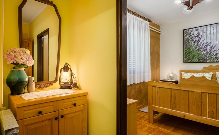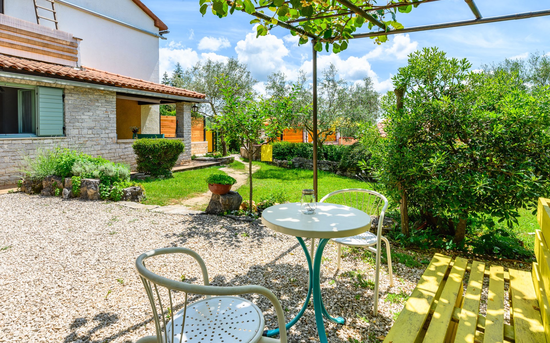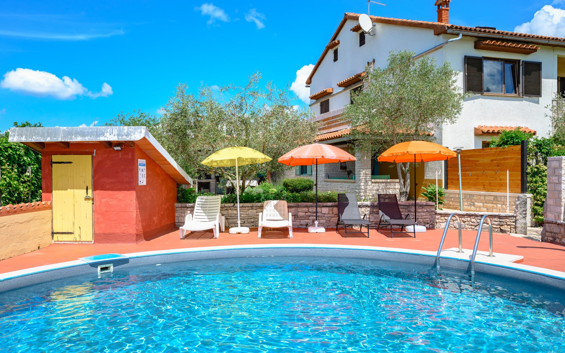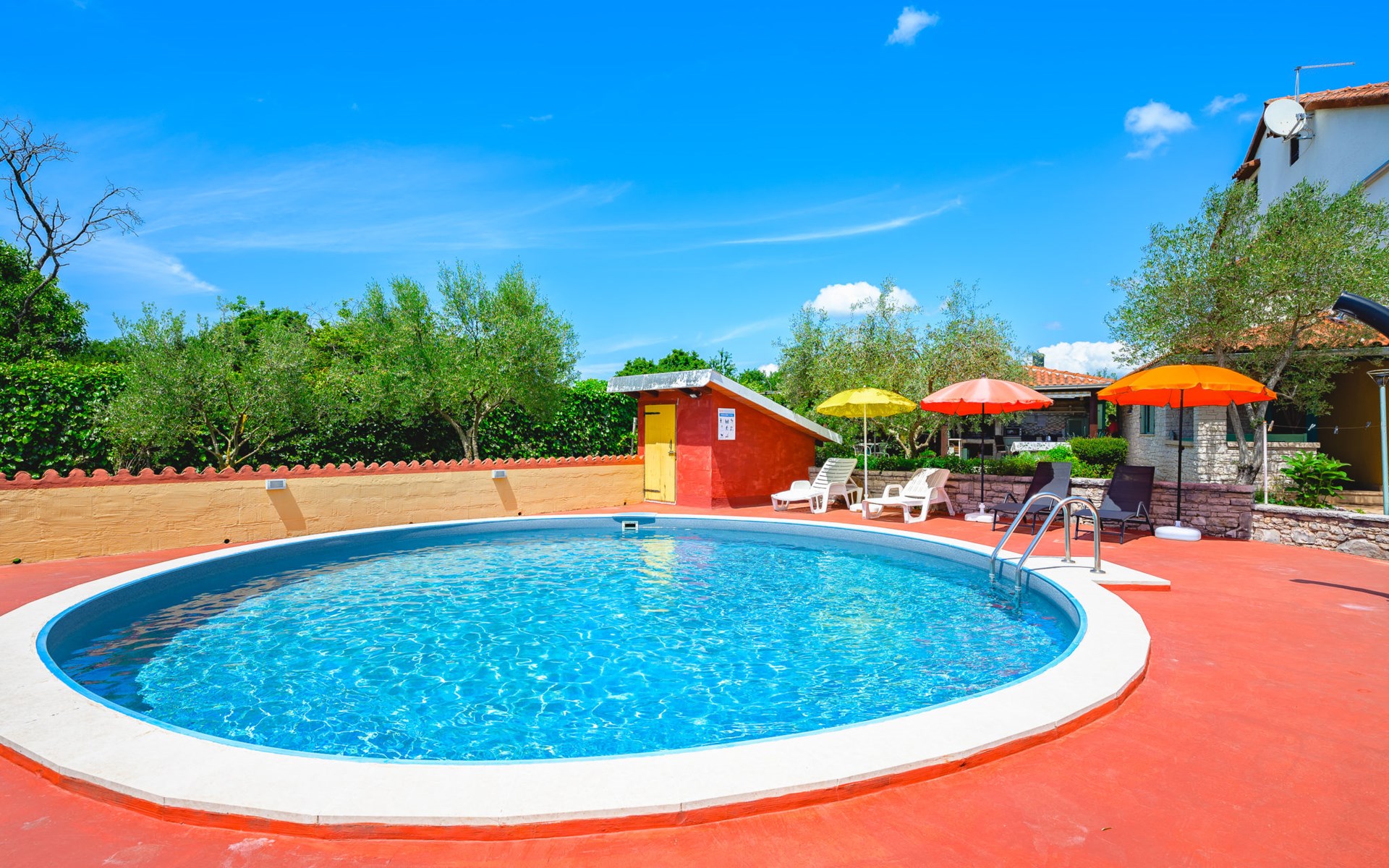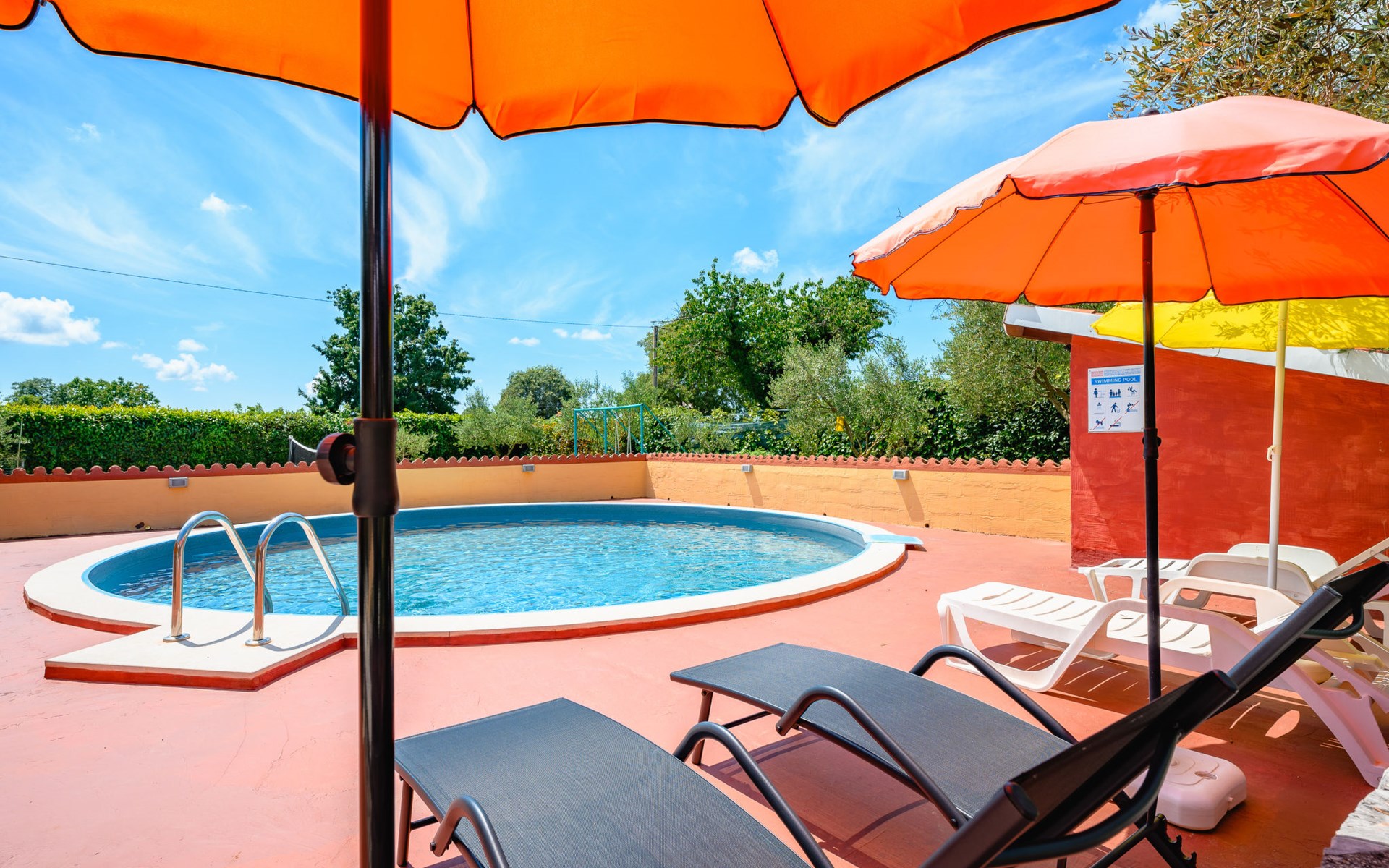 Twee onder één kap woning "Pina". In het gehucht Muntrilj, 15 km van het centrum van Pazin, 4 km van het centrum van Tinjan, 18 km van het centrum van Poreč, 18 km van zee. Voor medegebruik: terrein 3.000 m2 met gazon en bomen. Voor alleengebruik: terrein 500 m2 (omheind) met gazon en planten, openluchtzwembad rond (38 m2, 120 cm diepte, seizoensgebonden beschikbaarheid: 01.Mei. - 01.Okt.). Buitendouche, jeu de boules, terras, barbecue (schommel), onderhoud zwembad door de eigenaar/tuinman. In het huis: internetaansluiting. Parkeerplaats op het terrein. Winkel 4 km, supermarkt 15 km, restaurant 4 km, bushalte 3.3 km, rotsstrand 18 km. Jachthaven 18 km. De eigenaar woont in hetzelfde huis. Voor alleengebruik:buitenkeuken (2-pits kookplaat).