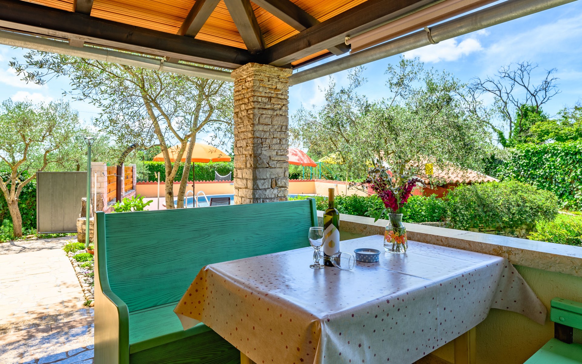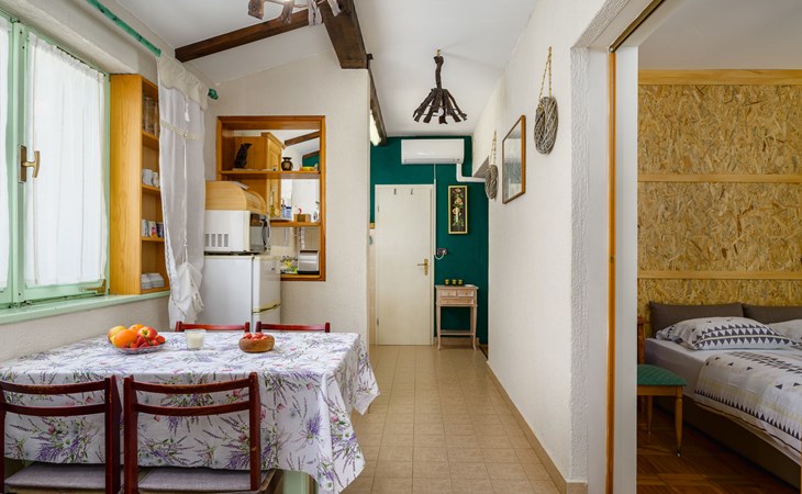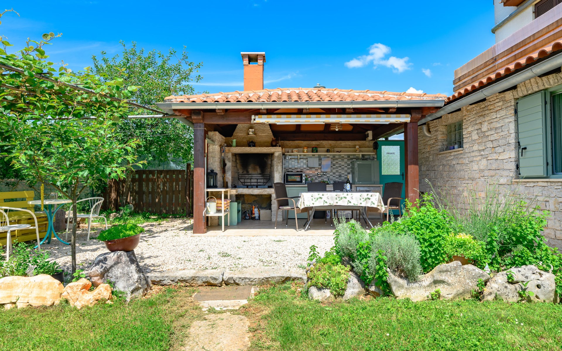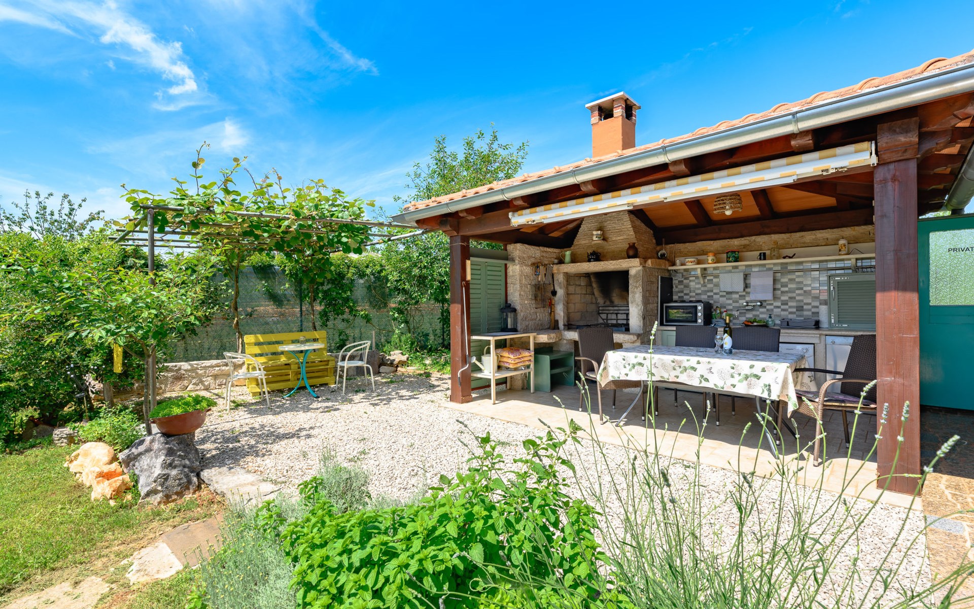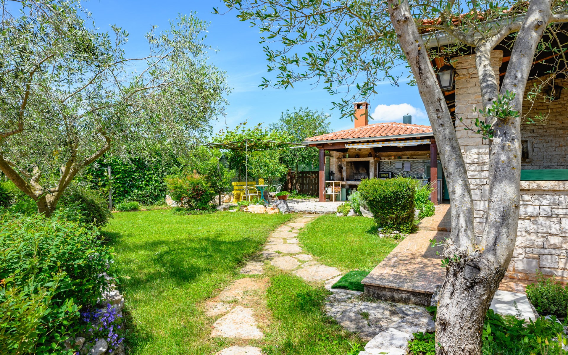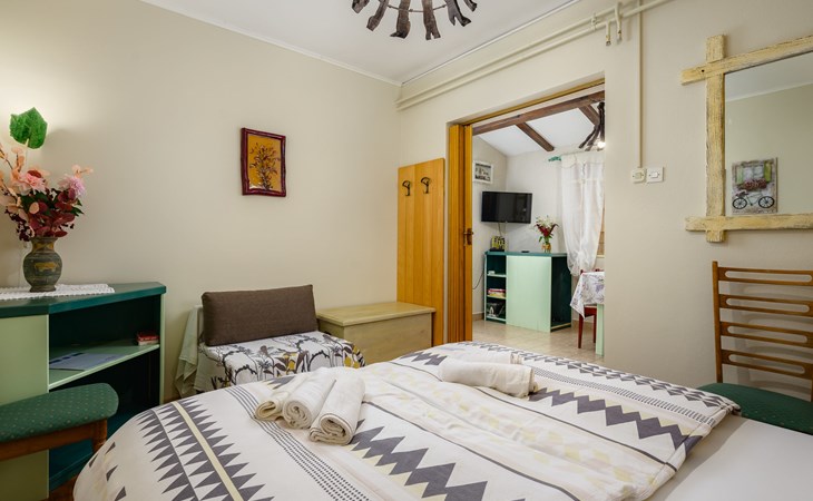 Twee onder één kap woning "Pina". In het gehucht Muntrilj, 15 km van het centrum van Pazin, 4 km van het centrum van Tinjan, 18 km van het centrum van Poreč, 18 km van zee. Voor medegebruik: terrein 3.000 m2 met gazon en bomen. Voor alleengebruik: terrein 500 m2 (omheind) met gazon en planten, openluchtzwembad rond (38 m2, 120 cm diepte, seizoensgebonden beschikbaarheid: 01.Mei. - 01.Okt.). Buitendouche, jeu de boules, terras, barbecue (schommel), onderhoud zwembad door de eigenaar/tuinman. In het huis: internetaansluiting. Parkeerplaats op het terrein. Winkel 4 km, supermarkt 15 km, restaurant 4 km, bushalte 3.3 km, rotsstrand 18 km. Jachthaven 18 km. De eigenaar woont in hetzelfde huis. Voor alleengebruik:buitenkeuken (2-pits kookplaat).