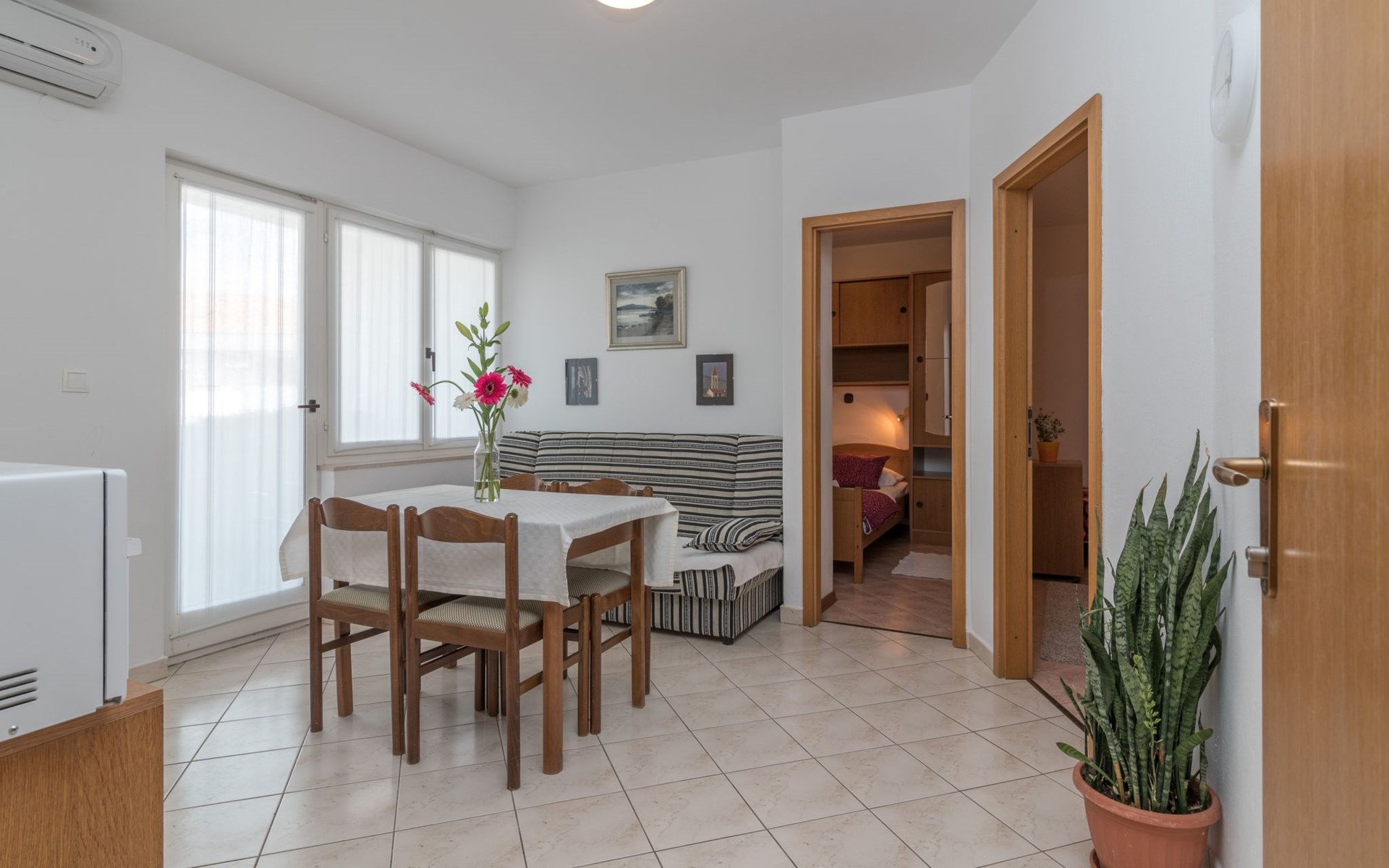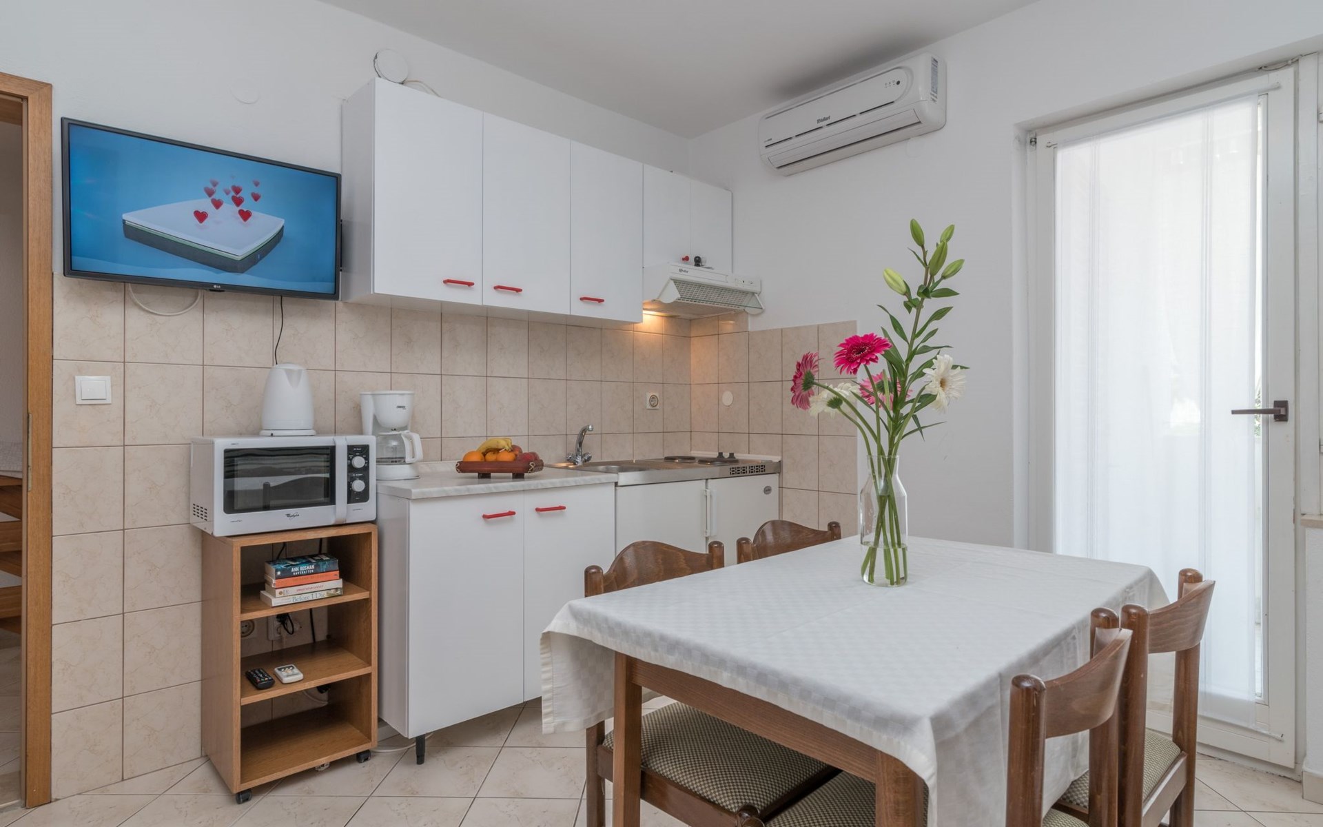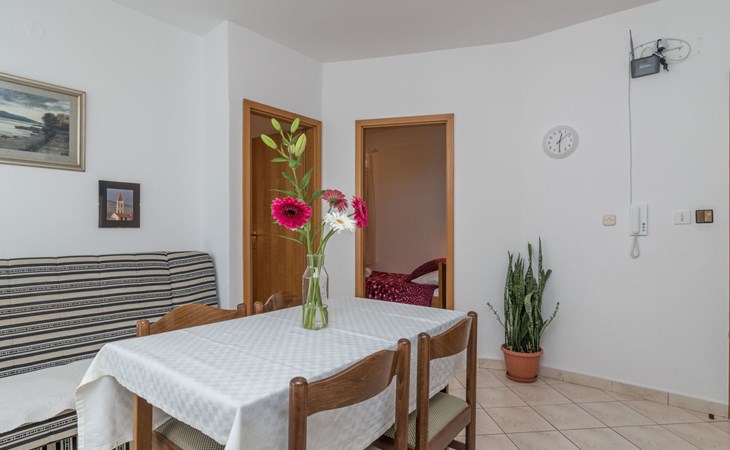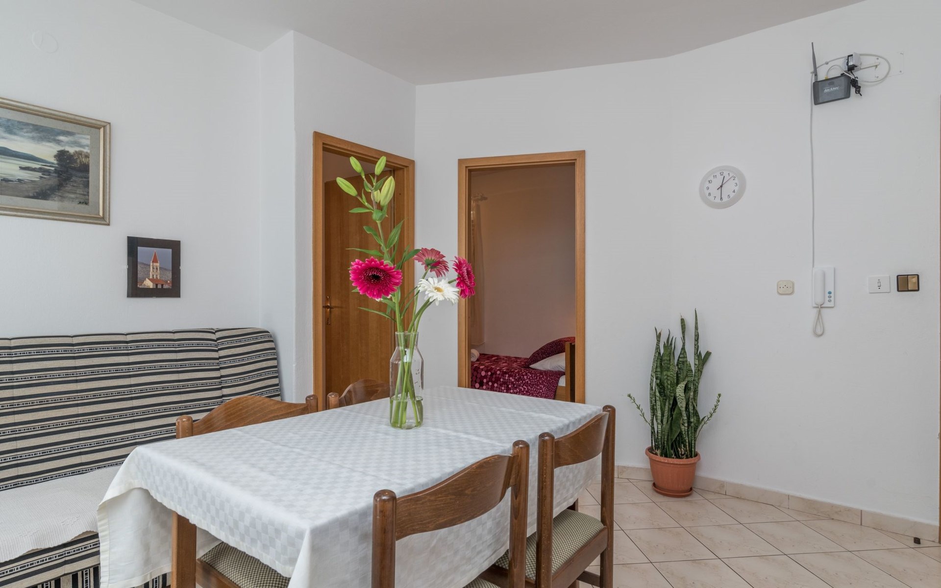 Het belangrijkste strand ligt op 2 minuten lopen van het pand. Daar vind je veel winkels, restaurants, geldautomaten, auto- en fietsverhuur, watersporten, enz. Het strand is toegankelijk via een helling, zodat bijvoorbeeld kinderwagens en handkarren kunnen worden meegenomen. Het stadscentrum ligt op ongeveer 2 km afstand en kan ook te voet worden bereikt (20 minuten). Er is ook een taxiboot die op slechts 70 meter van het pand stopt en die je naar het centrum van Trogir brengt. Split ligt op 30 km afstand. De dichtstbijzijnde luchthaven is de luchthaven Split, op 8 km van het pand.