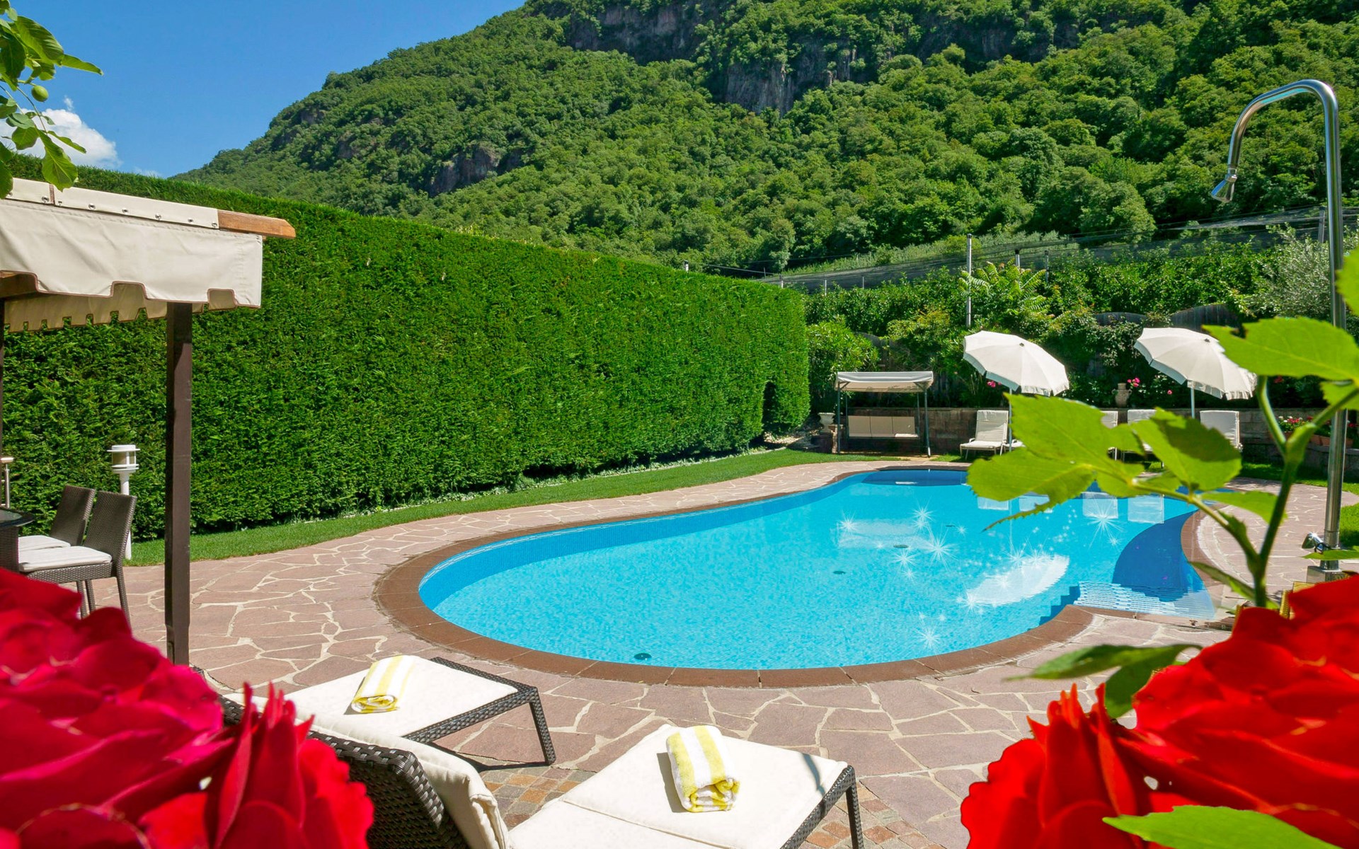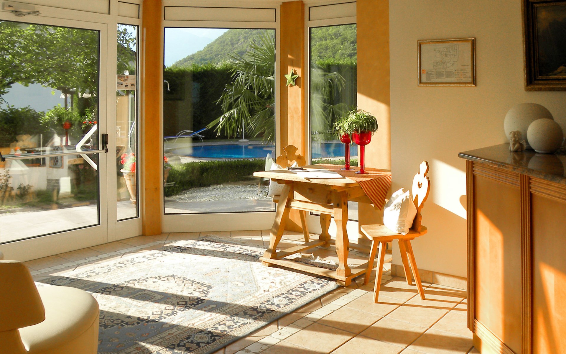 Gezellige, comfortabele residentie "Graf Volkmar", 270 m boven zeeniveau, van 4 verdiepingen. 12 appartementen in de woning. Aan de rand van de plaats, 1 km van het centrum van Postal / Burgstall, 10 km van het centrum van Merano / Merano, tegen een helling, te midden van groen, op het zuidwesten. Voor medegebruik: terrein 2.000 m2, verzorgde tuin op verschillende niveaus met gazon, openluchtzwembad, overdekt zwembad (11 x 6 m, seizoensgebonden beschikbaarheid: 01.Apr. - 15.Okt.). Tafeltennis, kinderspeelplaats. In het complex: receptie, bar, ontbijtruimte, sauna, stoombad, hot tub (alles incl.), bergruimte voor fietsen. Wissel van linnengoed 1 maal per week. Wissel van handdoeken 2 maal per week. Drankjesservice en ontbijt op verzoek op aanvraag (extra). Parkeerplaats bij het huis op het terrein, gemeenschappelijke garage bij het huis. Supermarkt 1.5 km, bushalte 150 m, treinstation "Lana-Postal (Bolzano-Merano)" 2.4 km, openluchtzwembad 2.5 km, thermaalbad "Merano" 7 km. Golfterrein (9 holes) 5 km, fietspad 50 m, kabelbaan 5 km, bergtrein 2.6 km. Attracties in de buurt: Trauttmansdorff 5 km, Merano 7 km, Messner Mountain Museum 22 km, Bolzano 25 km. Bekende skigebieden kunnen gemakkelijk worden bereikt: Meran 2000 8 km, Val Senales / Schnalstal 55 km, Val Ultima Schwemmalm Area / Schnalstal 27 km. Wandelgebied Verano / Vöran 2.6 km, Monte San Vigilio / Vigiljoch 5 km. Baby uitrusting op aanvraag (extra).