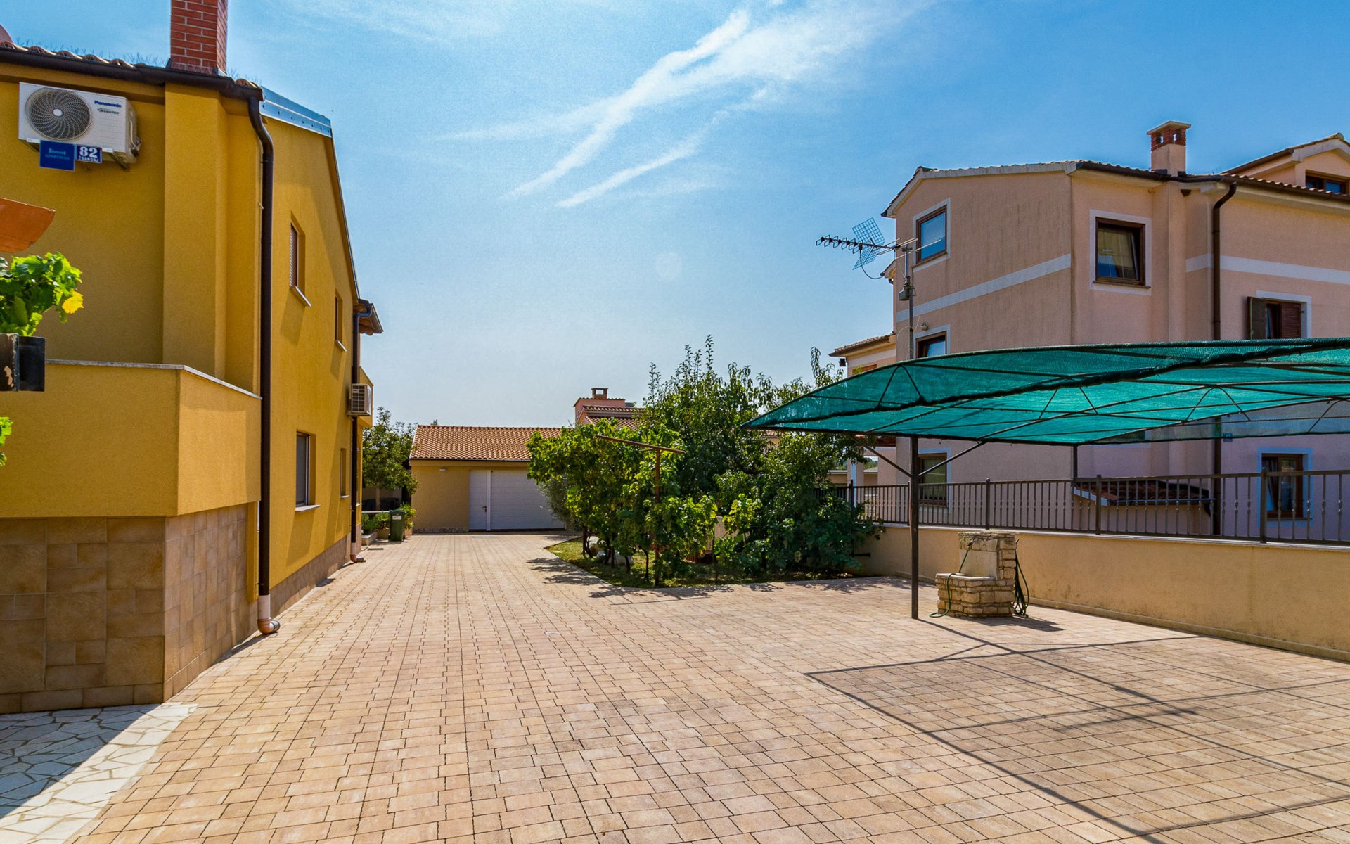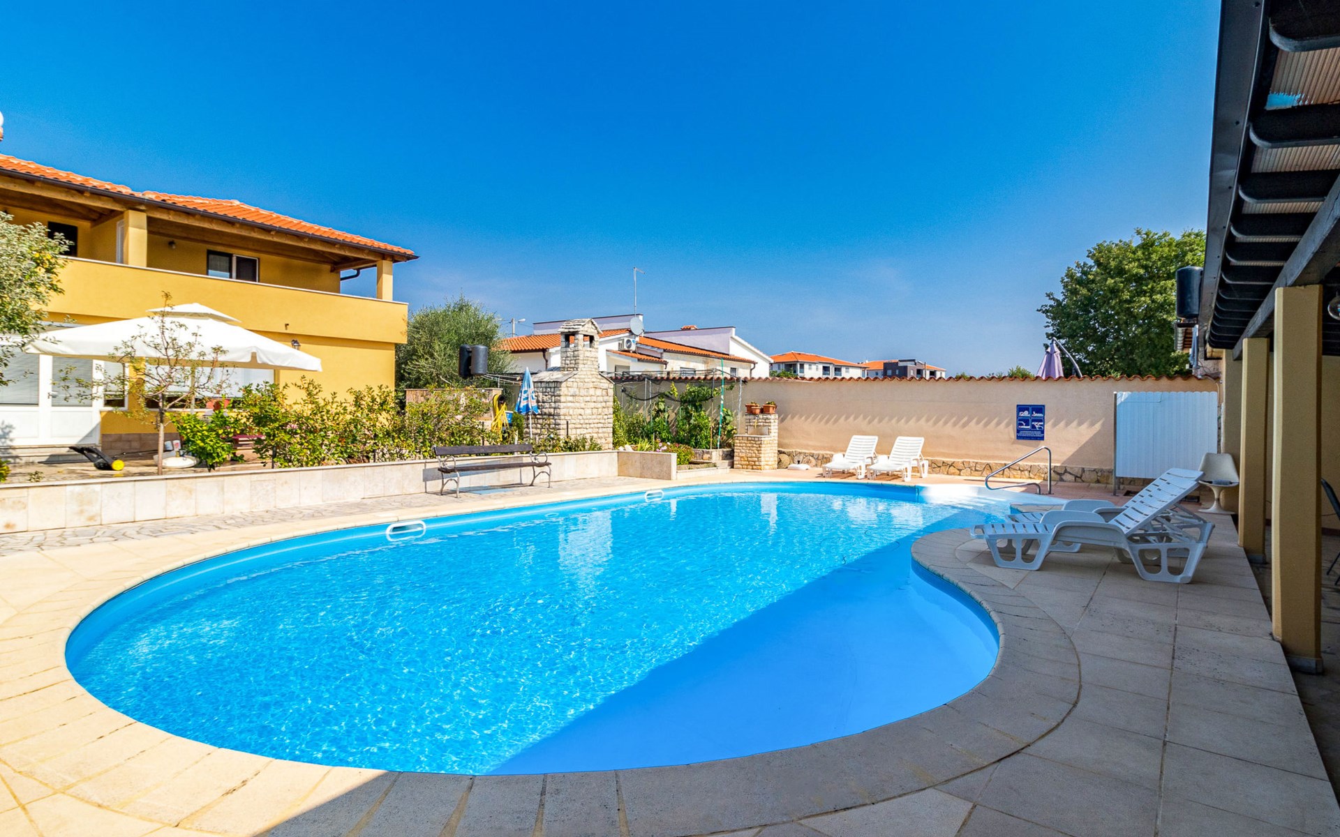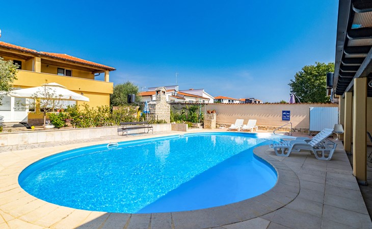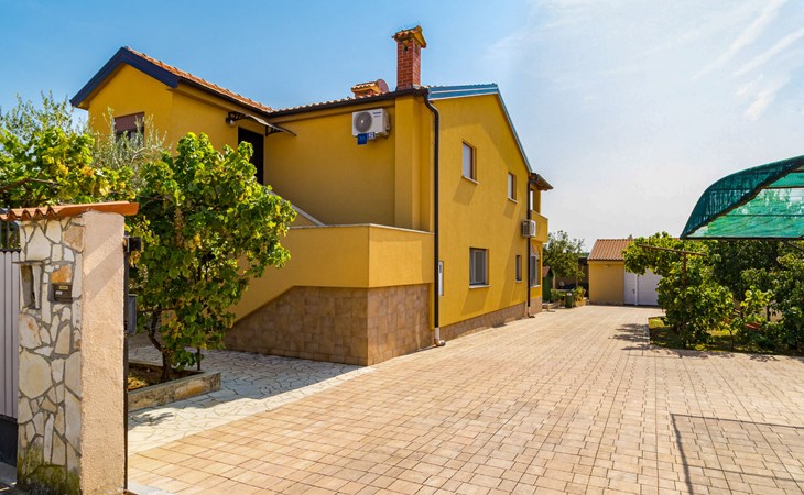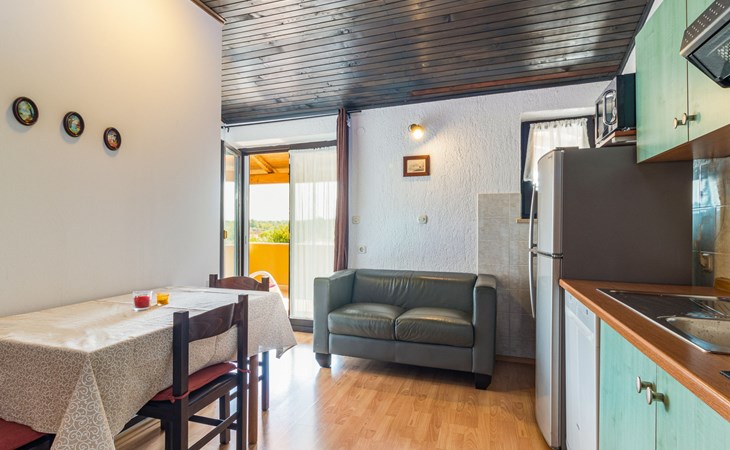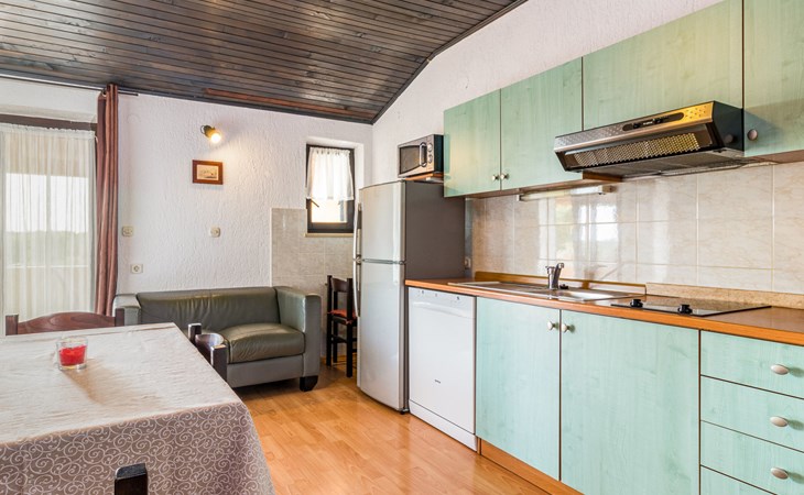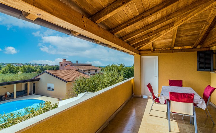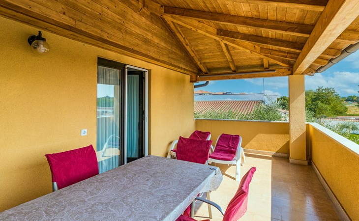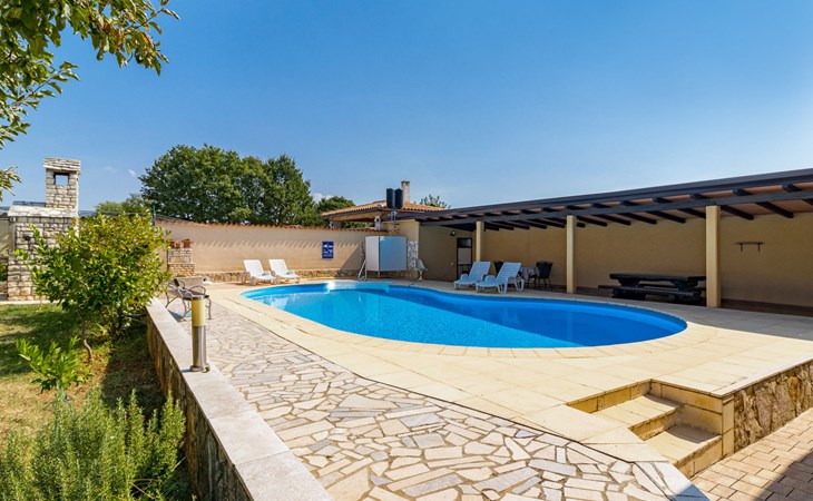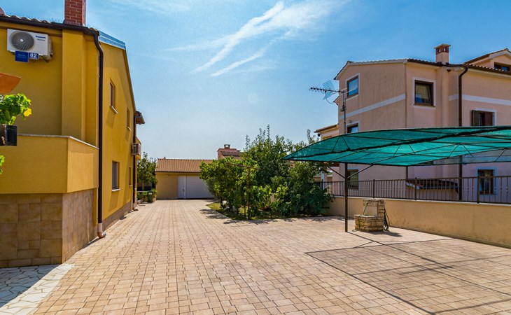 Žbandaj: Huis met 3 woningen "Dika". 300 m van het centrum van Žbandaj, 8 km van het centrum van Poreč, 8 km van zee. Voor medegebruik: terrein 1.000 m2 (omheind) met planten en bomen, openluchtzwembad (12 x 6 m, 100 - 160 cm diepte, seizoensgebonden beschikbaarheid: 01.Jun. - 30.Sep.) met trap. Buitendouche, tuinmeubelen, barbecue, onderhoud zwembad door de eigenaar/tuinman. In het huis: wasmachine (voor medegebruik, extra). Parkeerplaats bij het huis op het terrein. Winkel 300 m, supermarkt 1 km, restaurant 200 m, bushalte 8 km, treinstation 24 km, kiezelstrand 8 km.