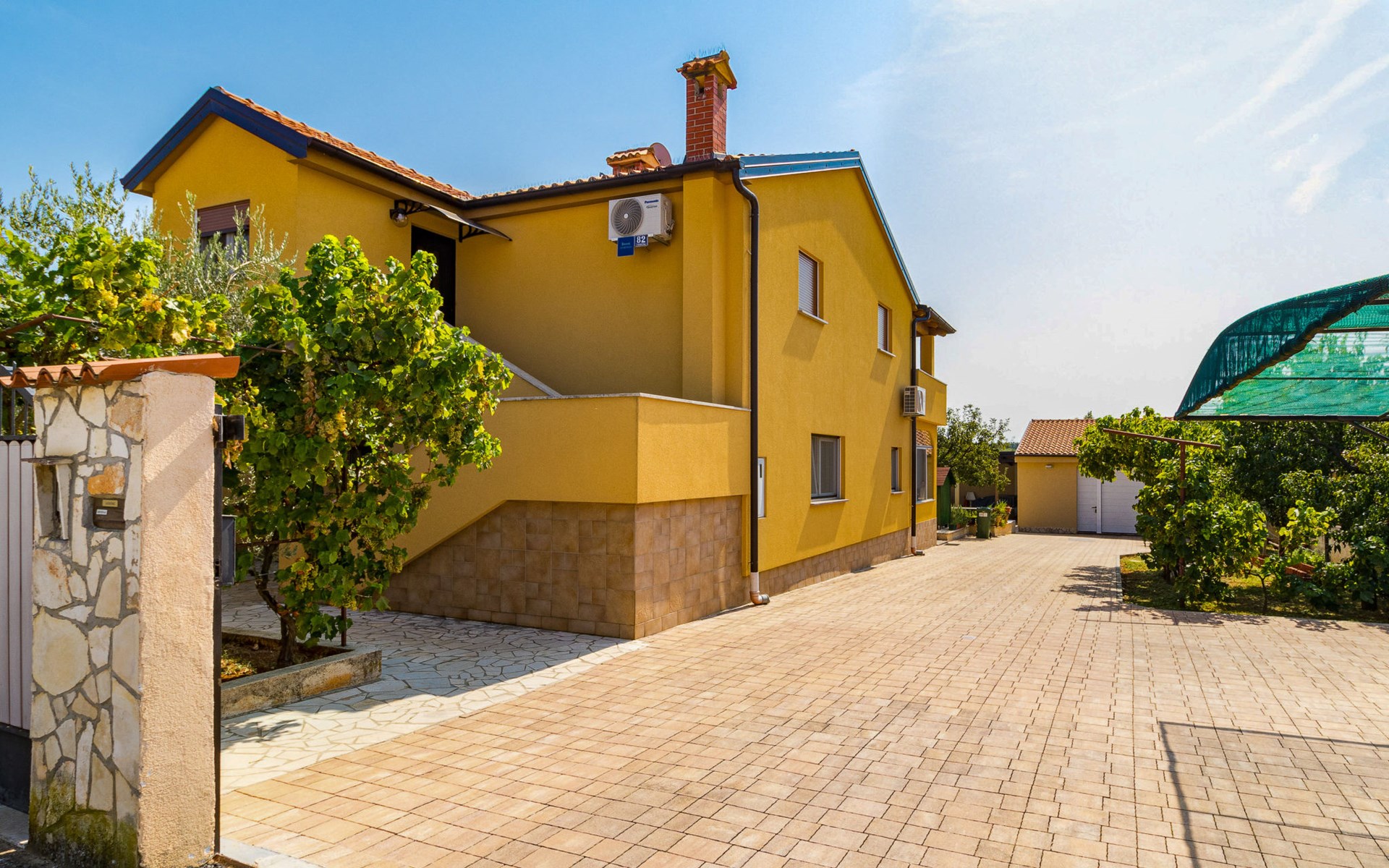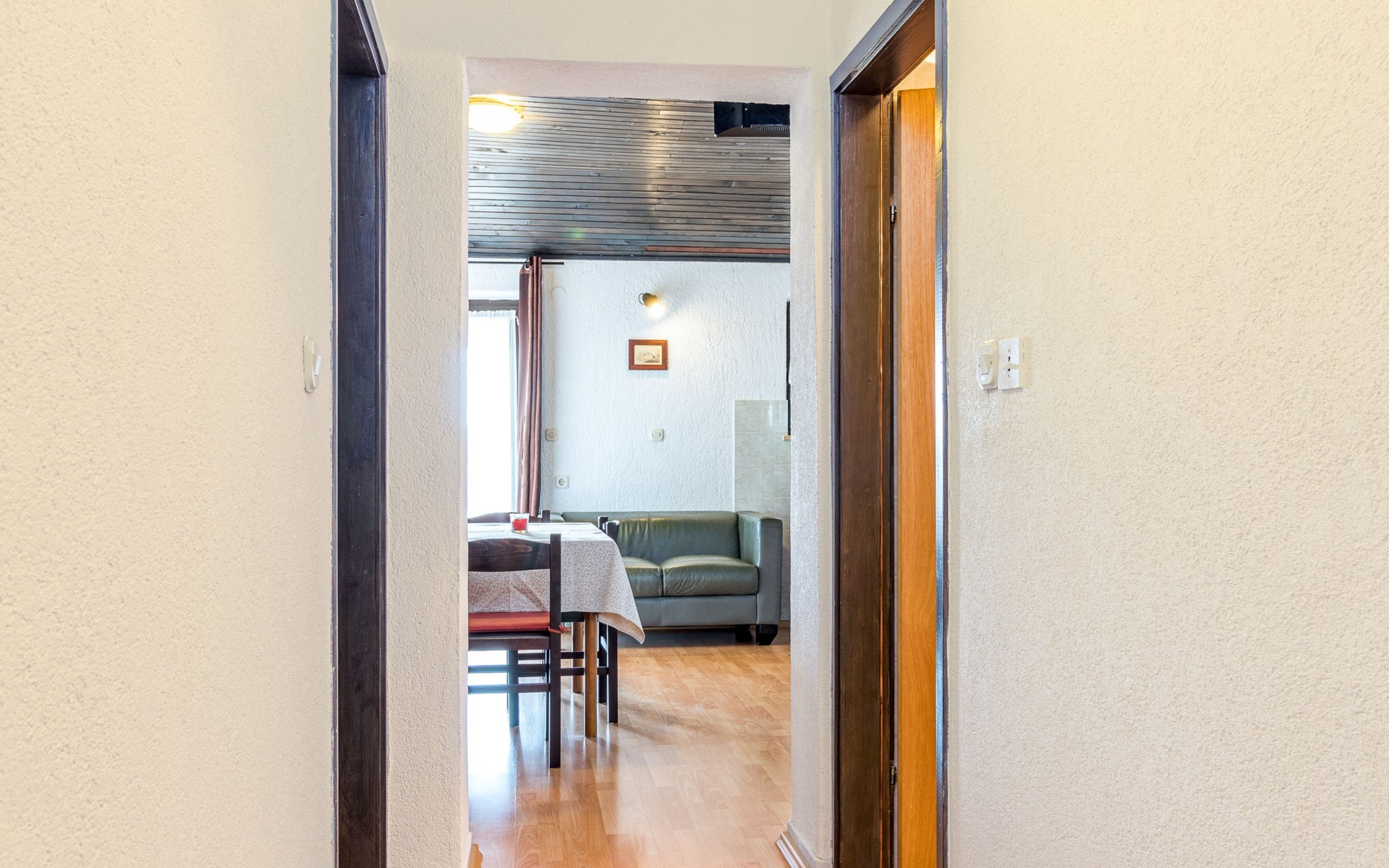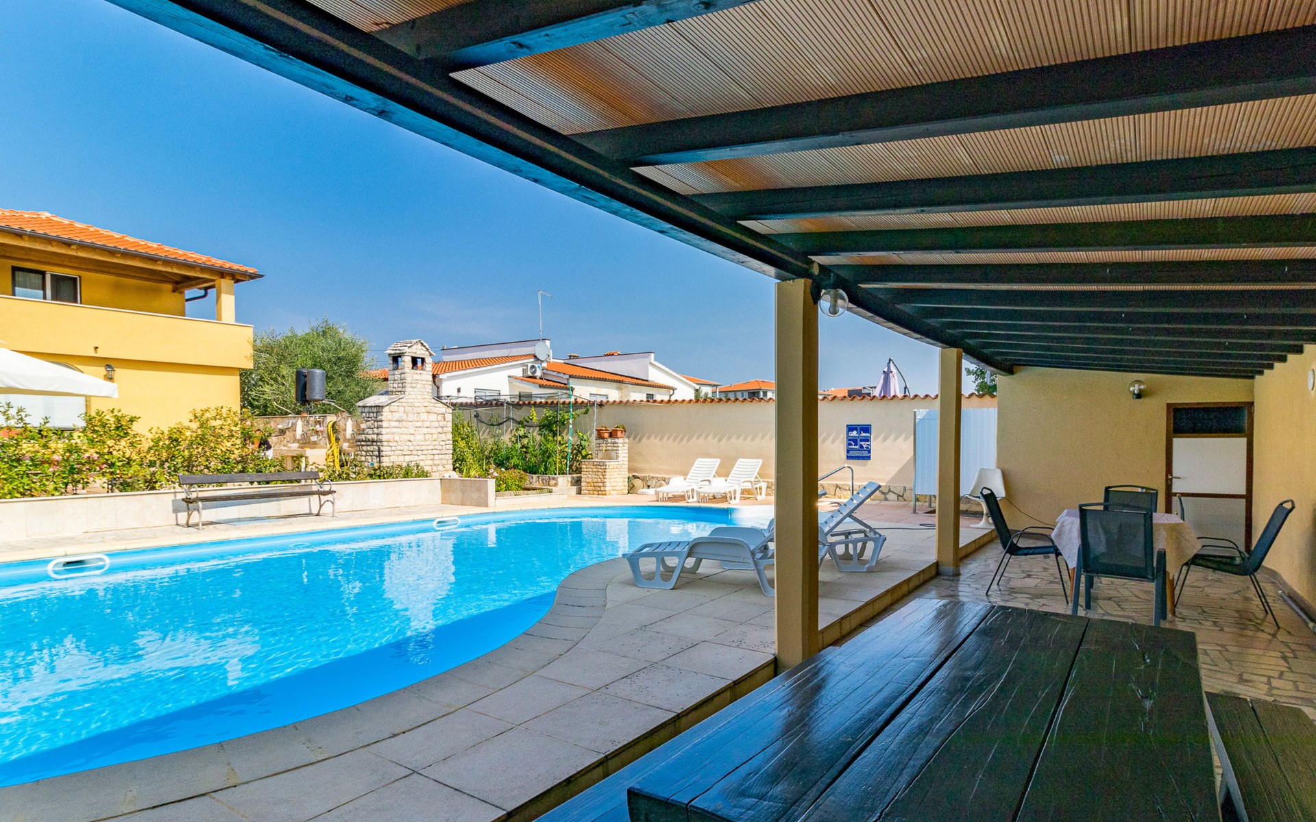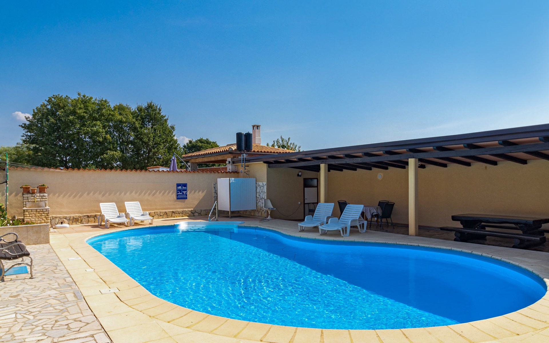 Žbandaj: Huis met 3 woningen "Dika". 300 m van het centrum van Žbandaj, 8 km van het centrum van Poreč, 8 km van zee. Voor medegebruik: terrein 1.000 m2 (omheind) met planten en bomen, openluchtzwembad (12 x 6 m, 100 - 160 cm diepte, seizoensgebonden beschikbaarheid: 01.Jun. - 30.Sep.) met trap. Buitendouche, tuinmeubelen, barbecue, onderhoud zwembad door de eigenaar/tuinman. In het huis: wasmachine (voor medegebruik, extra). Parkeerplaats bij het huis op het terrein. Winkel 300 m, supermarkt 1 km, restaurant 200 m, bushalte 8 km, treinstation 24 km, kiezelstrand 8 km.