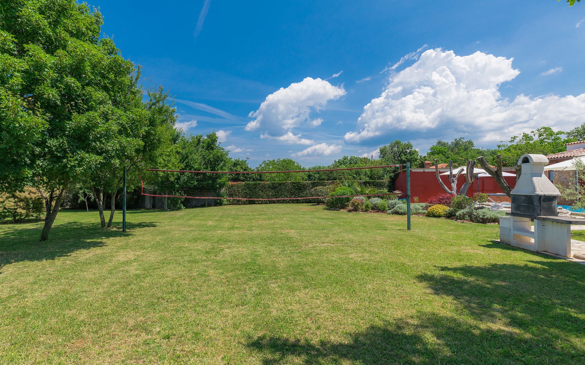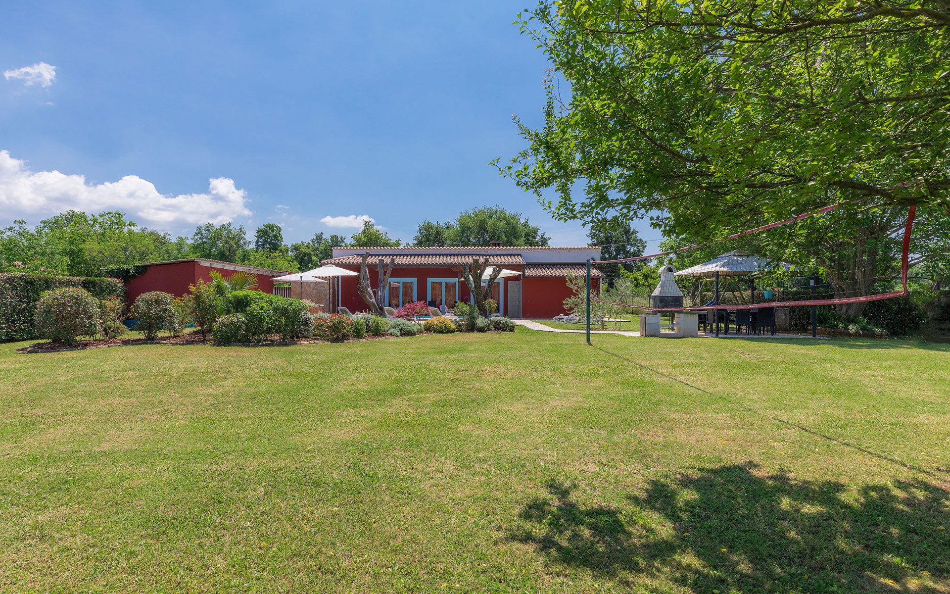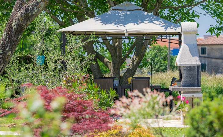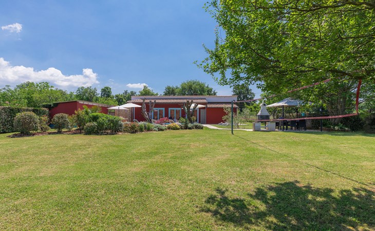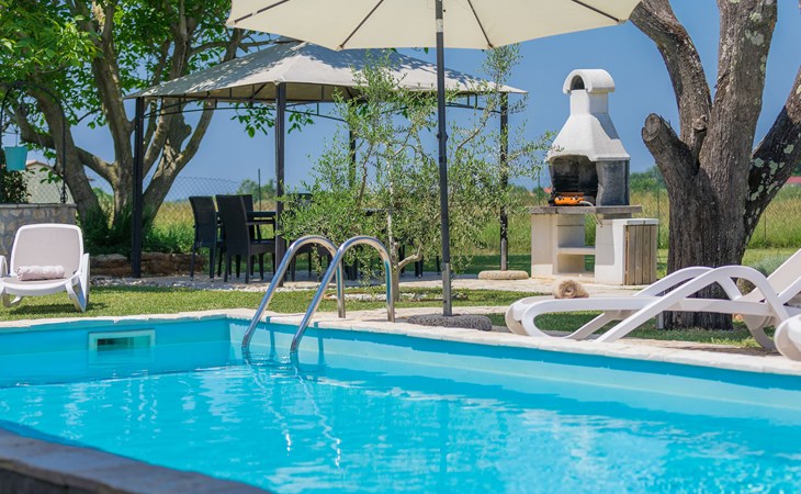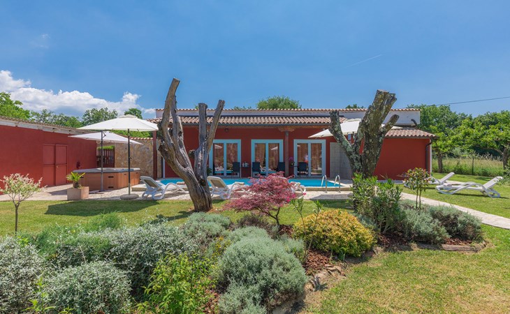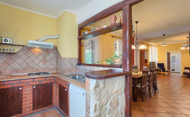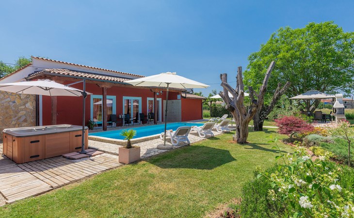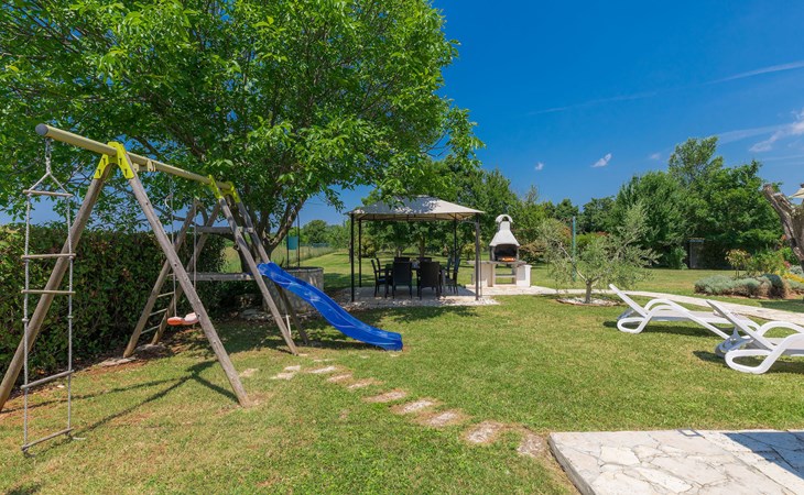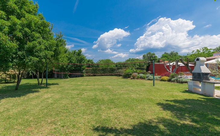 Plovanija 4 km van Buje: Eengezinswoning "Villa Renzo". In het gehucht Simonetija, 1 km van het centrum van Plovanija, 10 km van het centrum van Umag, rustige ligging, 5 km van zee, te midden van groen. Voor alleengebruik: terrein 3.000 m2 (omheind), tuin met gazon 1.000 m2 bomen, openluchtzwembad hoekig (3 x 8 m, 140 cm diepte, seizoensgebonden beschikbaarheid: 11.Mei. - 21.Sep.). Buitendouche, hot tub, barbecue, kinderspeelplaats (schommel). In het huis: internetaansluiting, sauna, biljart, wasmachine. Overdekte parkeerplaats bij het huis op het terrein. Winkel, restaurant 500 m, bushalte 3.9 km, kiezelstrand 5 km. Golfterrein (18 holes) 15 km, tennis 7 km, wandelroutes, vanaf het huis, fietspad 10 m. De eigenaar accepteert geen jeugdgroepen.