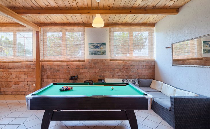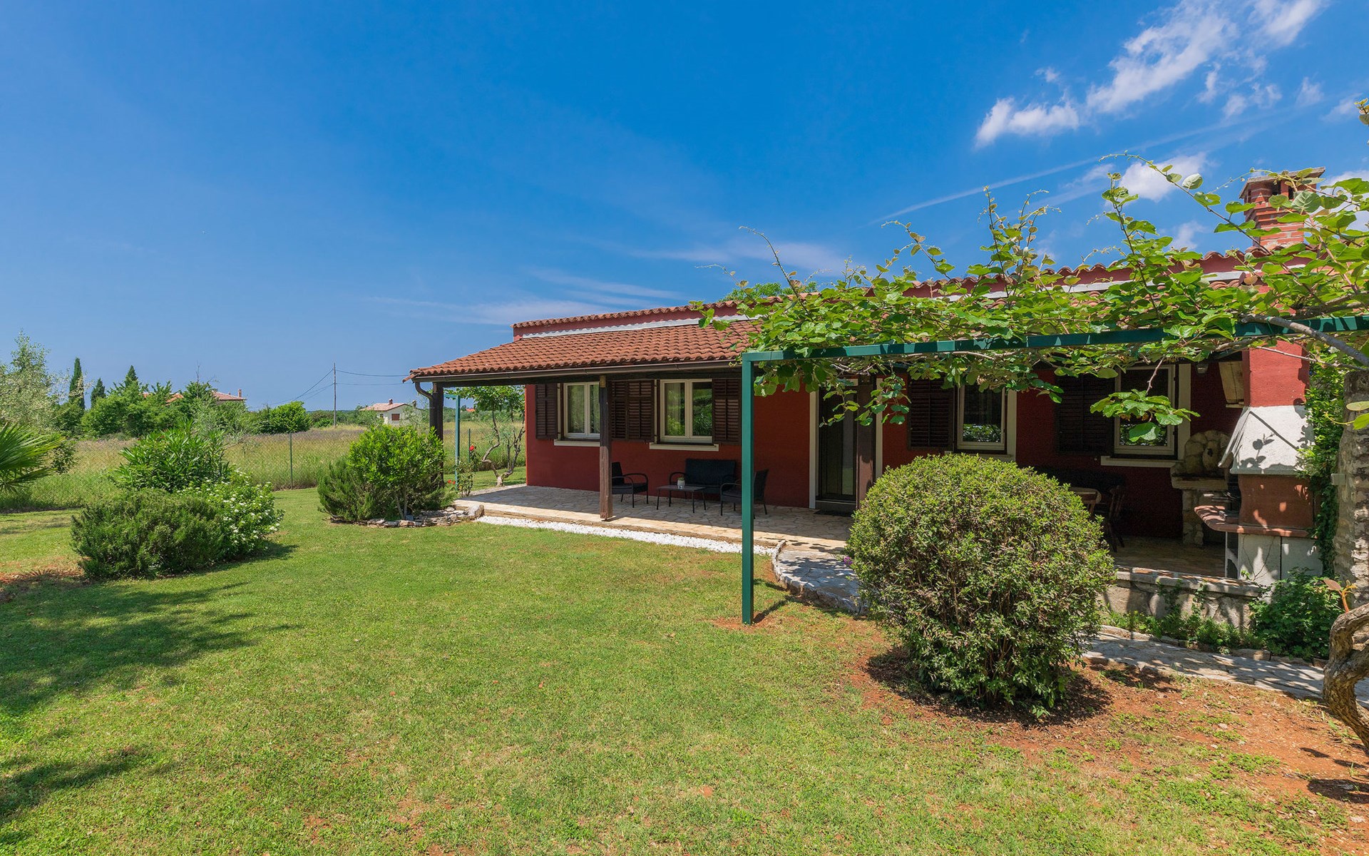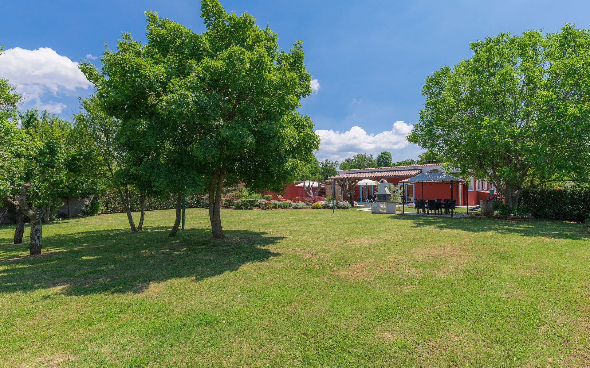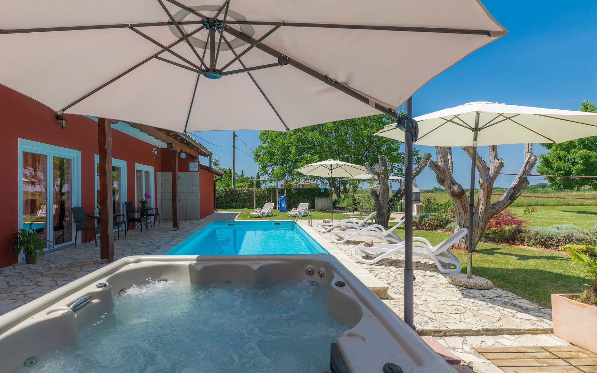 Plovanija 4 km van Buje: Eengezinswoning "Villa Renzo". In het gehucht Simonetija, 1 km van het centrum van Plovanija, 10 km van het centrum van Umag, rustige ligging, 5 km van zee, te midden van groen. Voor alleengebruik: terrein 3.000 m2 (omheind), tuin met gazon 1.000 m2 bomen, openluchtzwembad hoekig (3 x 8 m, 140 cm diepte, seizoensgebonden beschikbaarheid: 11.Mei. - 21.Sep.). Buitendouche, hot tub, barbecue, kinderspeelplaats (schommel). In het huis: internetaansluiting, sauna, biljart, wasmachine. Overdekte parkeerplaats bij het huis op het terrein. Winkel, restaurant 500 m, bushalte 3.9 km, kiezelstrand 5 km. Golfterrein (18 holes) 15 km, tennis 7 km, wandelroutes, vanaf het huis, fietspad 10 m. De eigenaar accepteert geen jeugdgroepen.