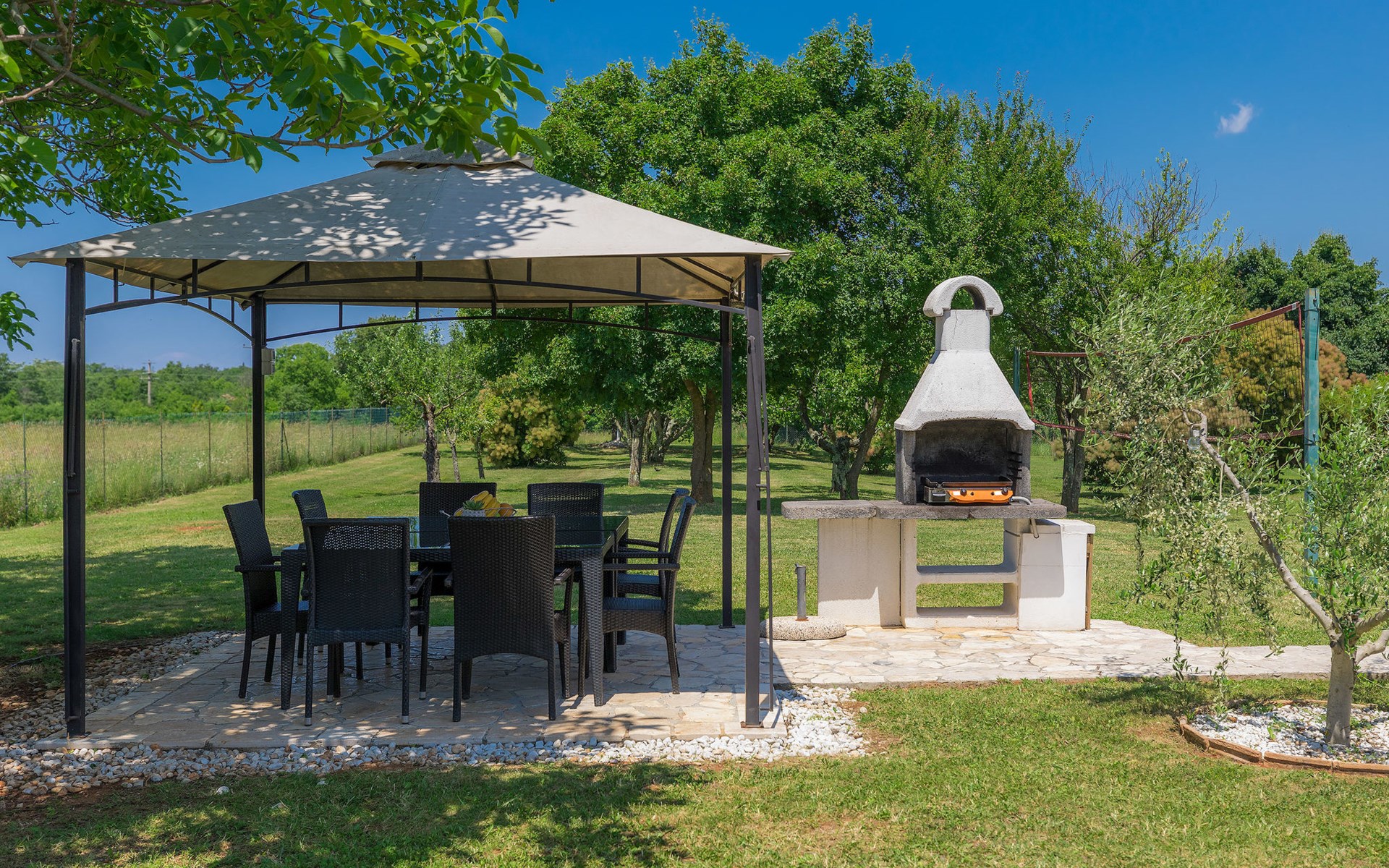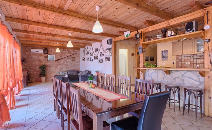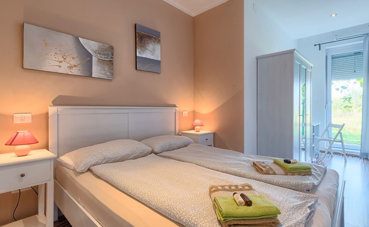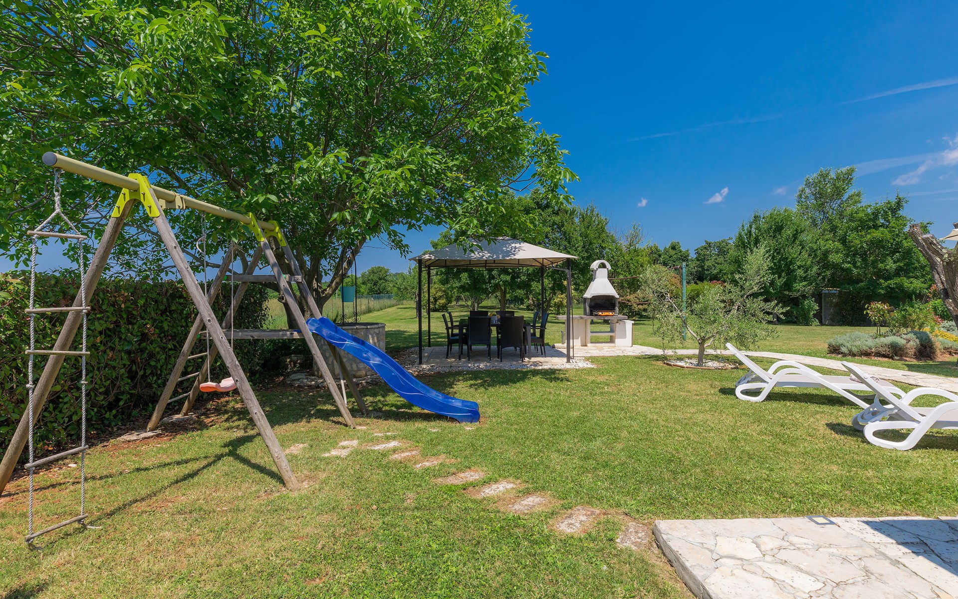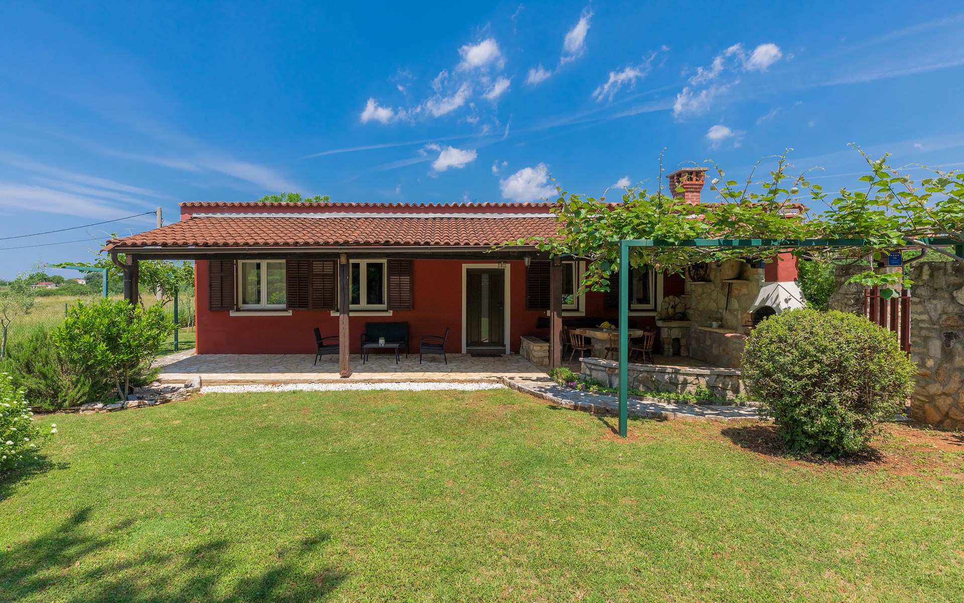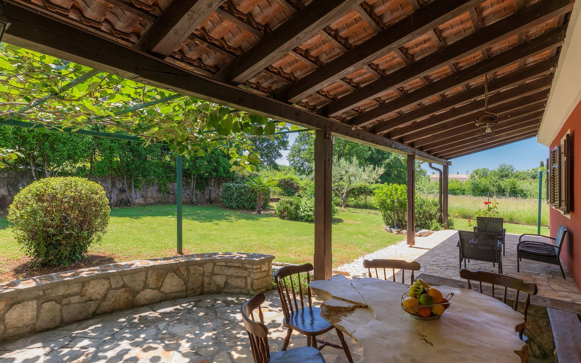 Plovanija 4 km van Buje: Eengezinswoning "Villa Renzo". In het gehucht Simonetija, 1 km van het centrum van Plovanija, 10 km van het centrum van Umag, rustige ligging, 5 km van zee, te midden van groen. Voor alleengebruik: terrein 3.000 m2 (omheind), tuin met gazon 1.000 m2 bomen, openluchtzwembad hoekig (3 x 8 m, 140 cm diepte, seizoensgebonden beschikbaarheid: 11.Mei. - 21.Sep.). Buitendouche, hot tub, barbecue, kinderspeelplaats (schommel). In het huis: internetaansluiting, sauna, biljart, wasmachine. Overdekte parkeerplaats bij het huis op het terrein. Winkel, restaurant 500 m, bushalte 3.9 km, kiezelstrand 5 km. Golfterrein (18 holes) 15 km, tennis 7 km, wandelroutes, vanaf het huis, fietspad 10 m. De eigenaar accepteert geen jeugdgroepen.