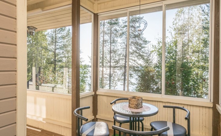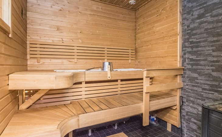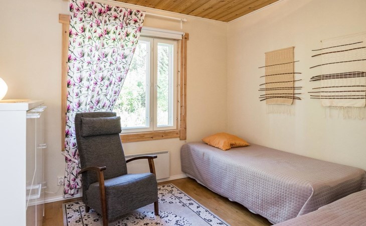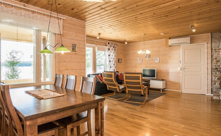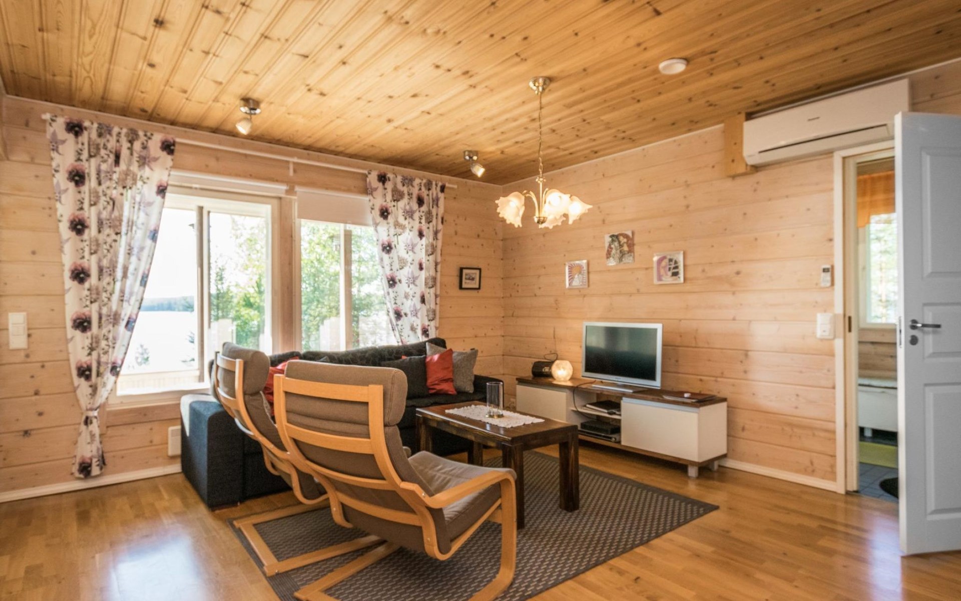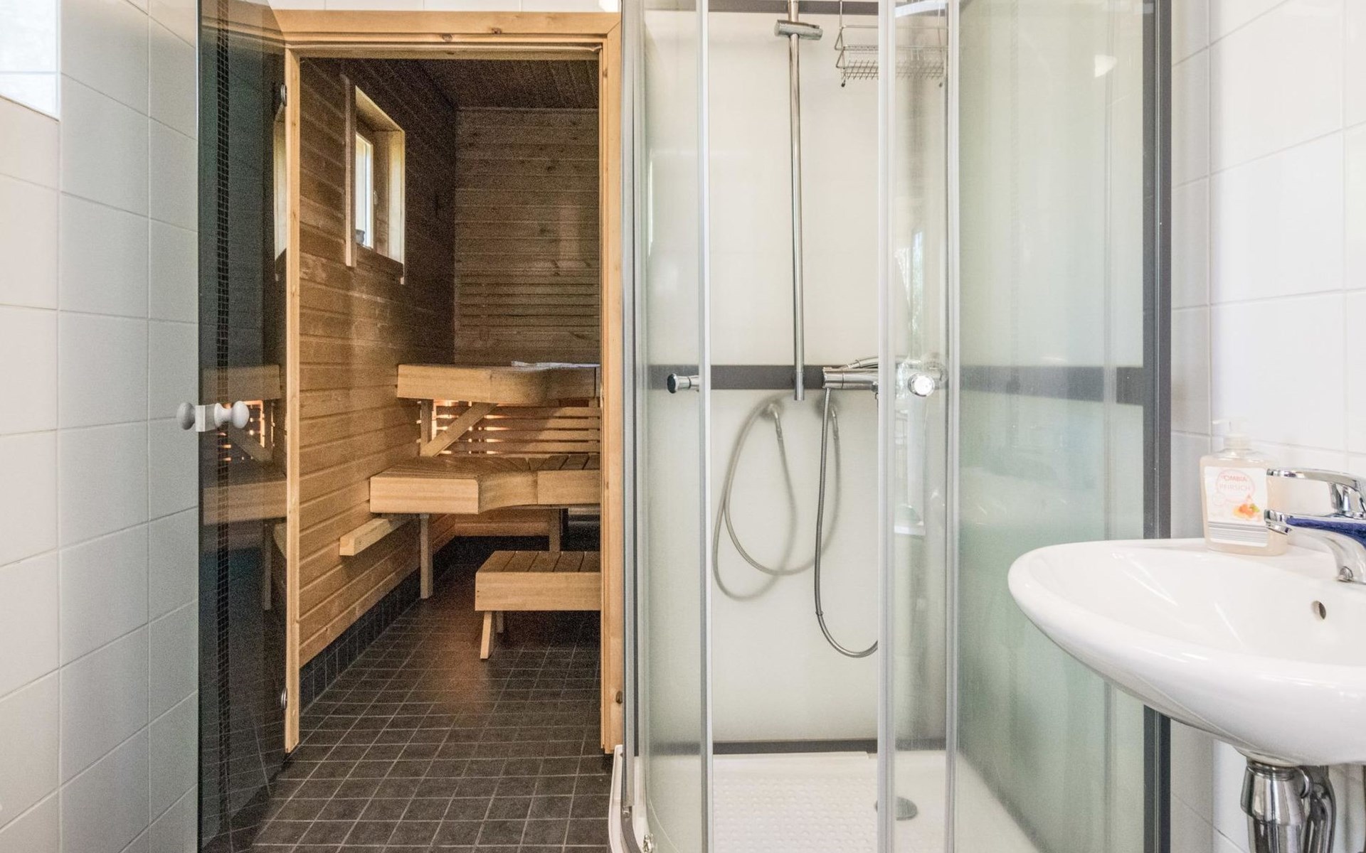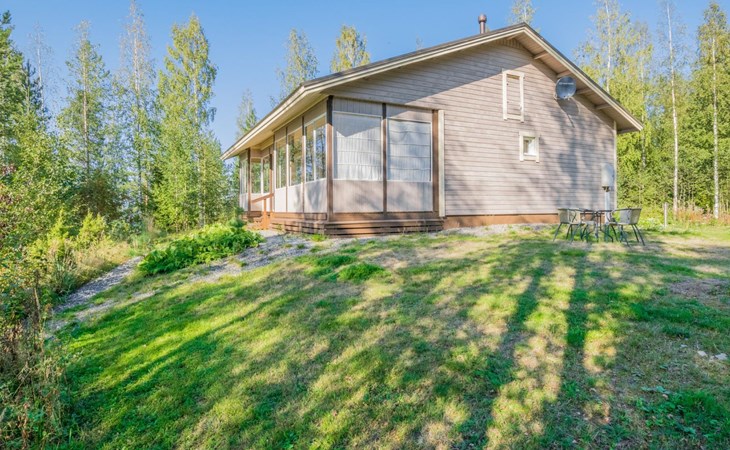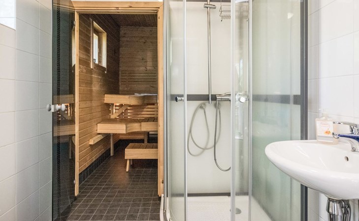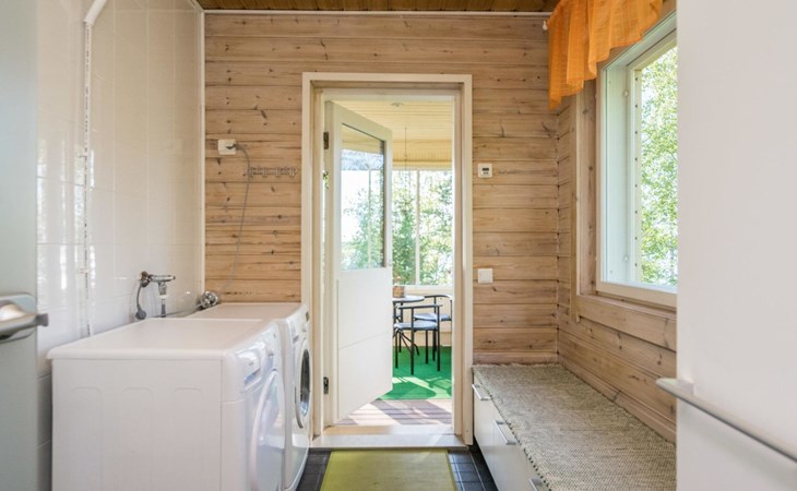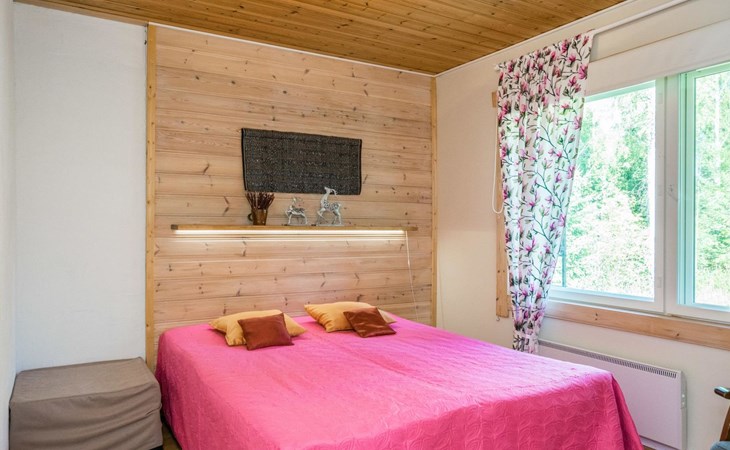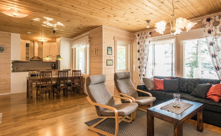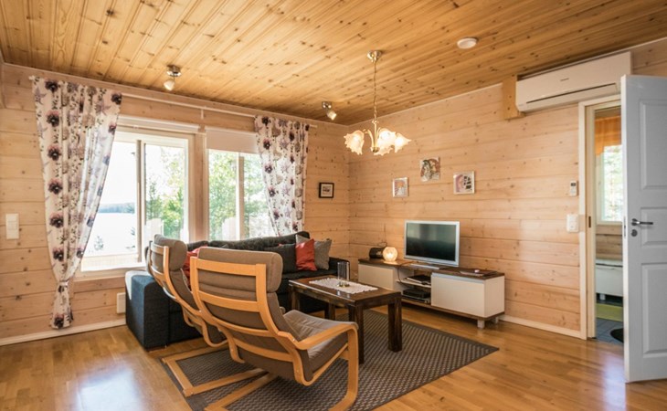 Wooden, inside log-paneled cottage built in 2013, combinated kitchen-living room with sofa bed for two, vestibule, bedroom with double bed and extra bed, bedroom with 2 beds, washroom with walk-in shower and toilet, wood heated sauna, utility/dressing room, spacious glass terrace with two seating groups.