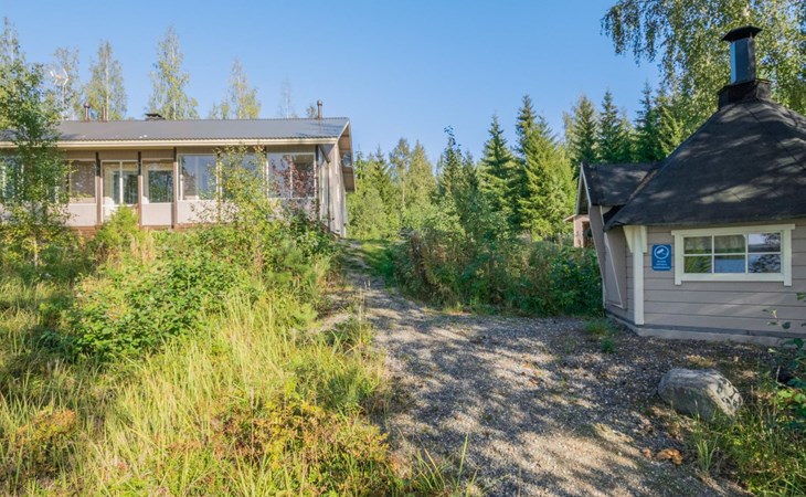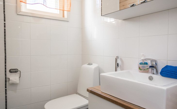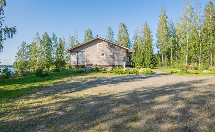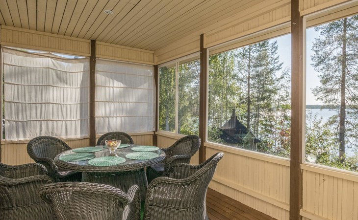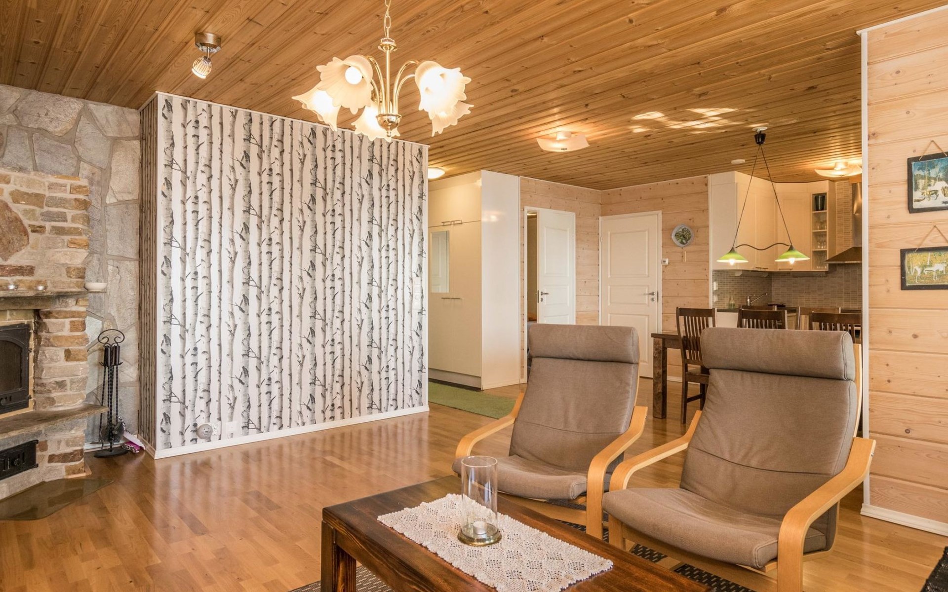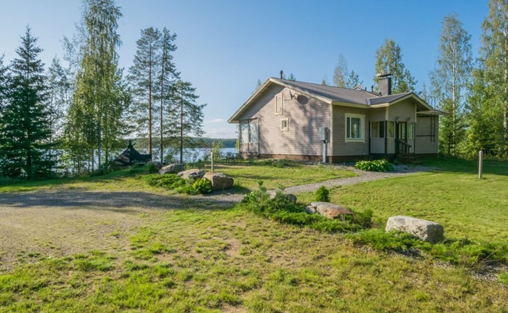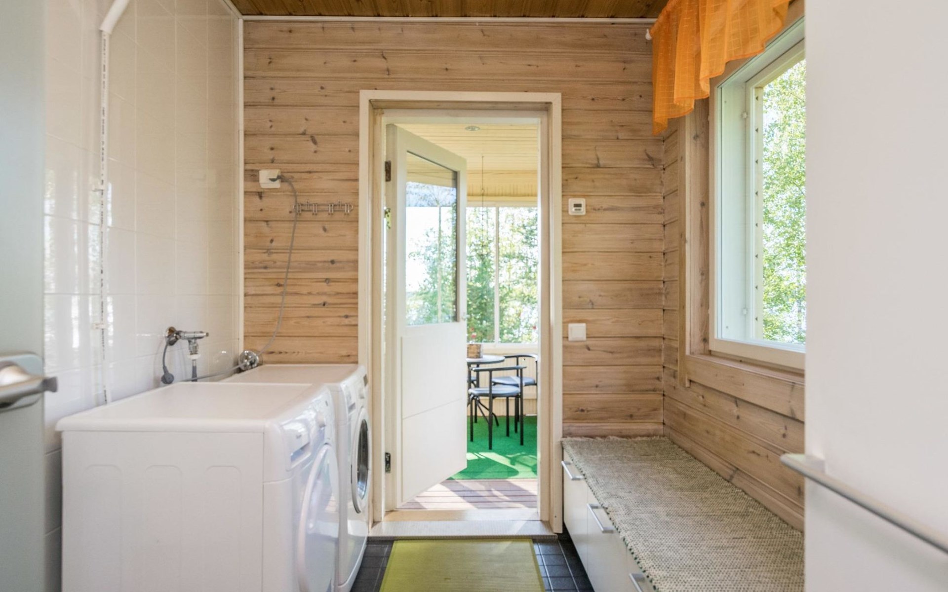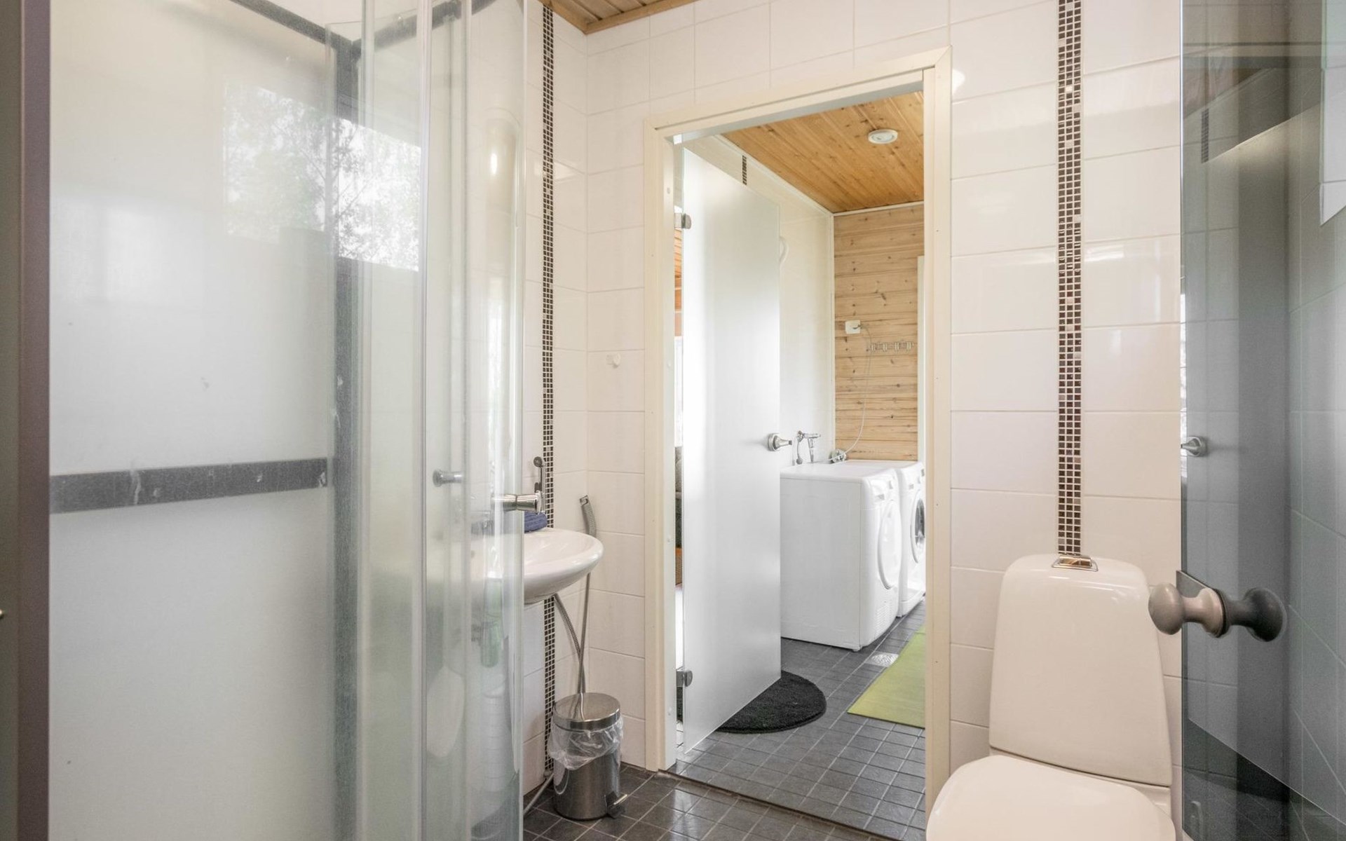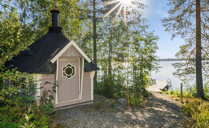 Wooden, inside log-paneled cottage built in 2013, combinated kitchen-living room with sofa bed for two, vestibule, bedroom with double bed and extra bed, bedroom with 2 beds, washroom with walk-in shower and toilet, wood heated sauna, utility/dressing room, spacious glass terrace with two seating groups.