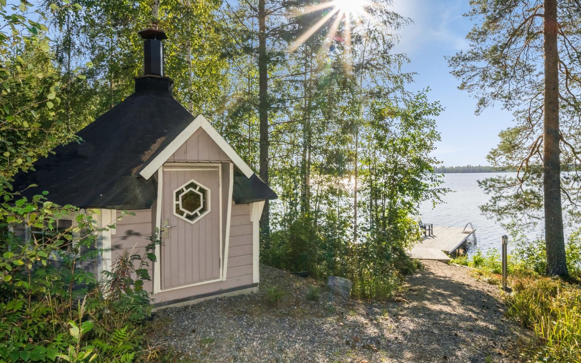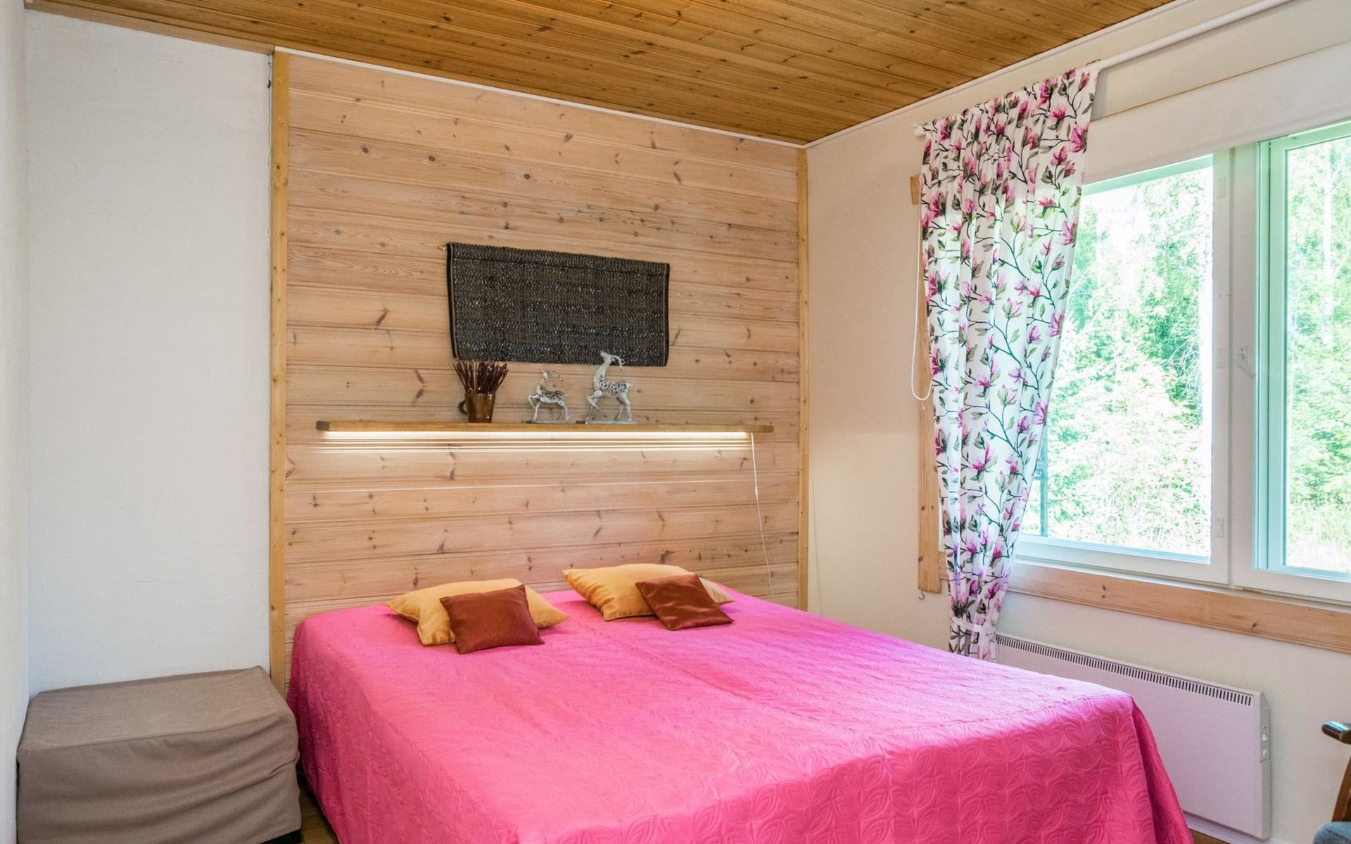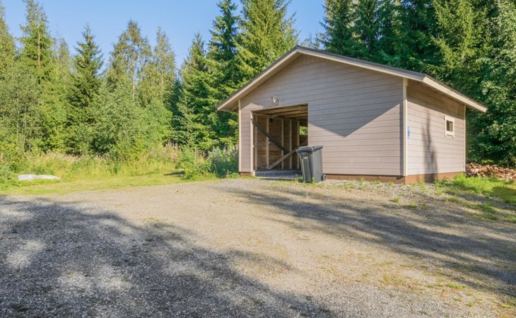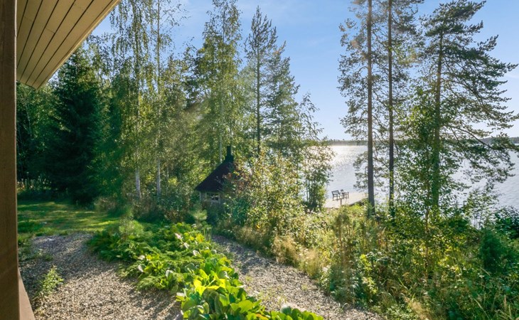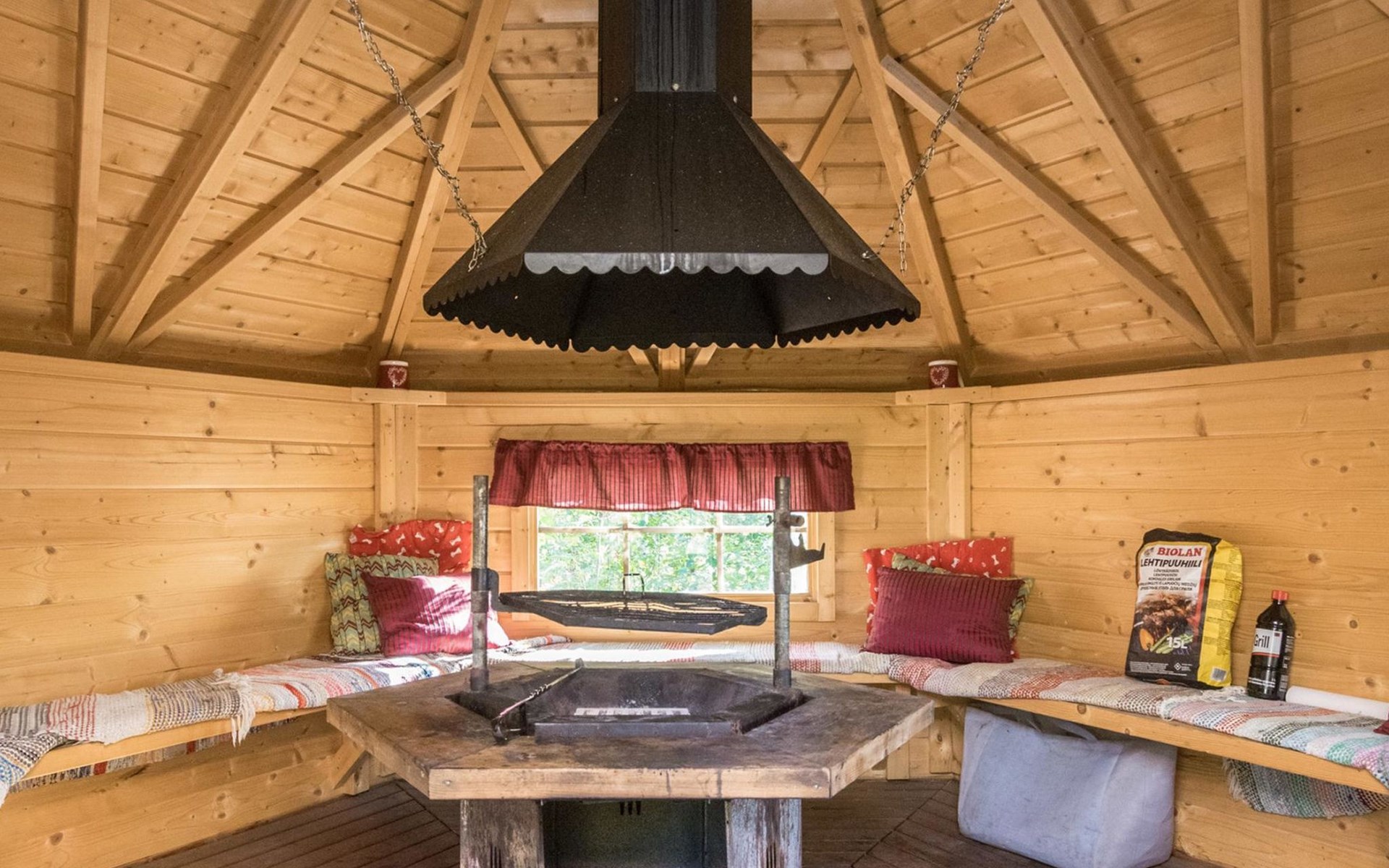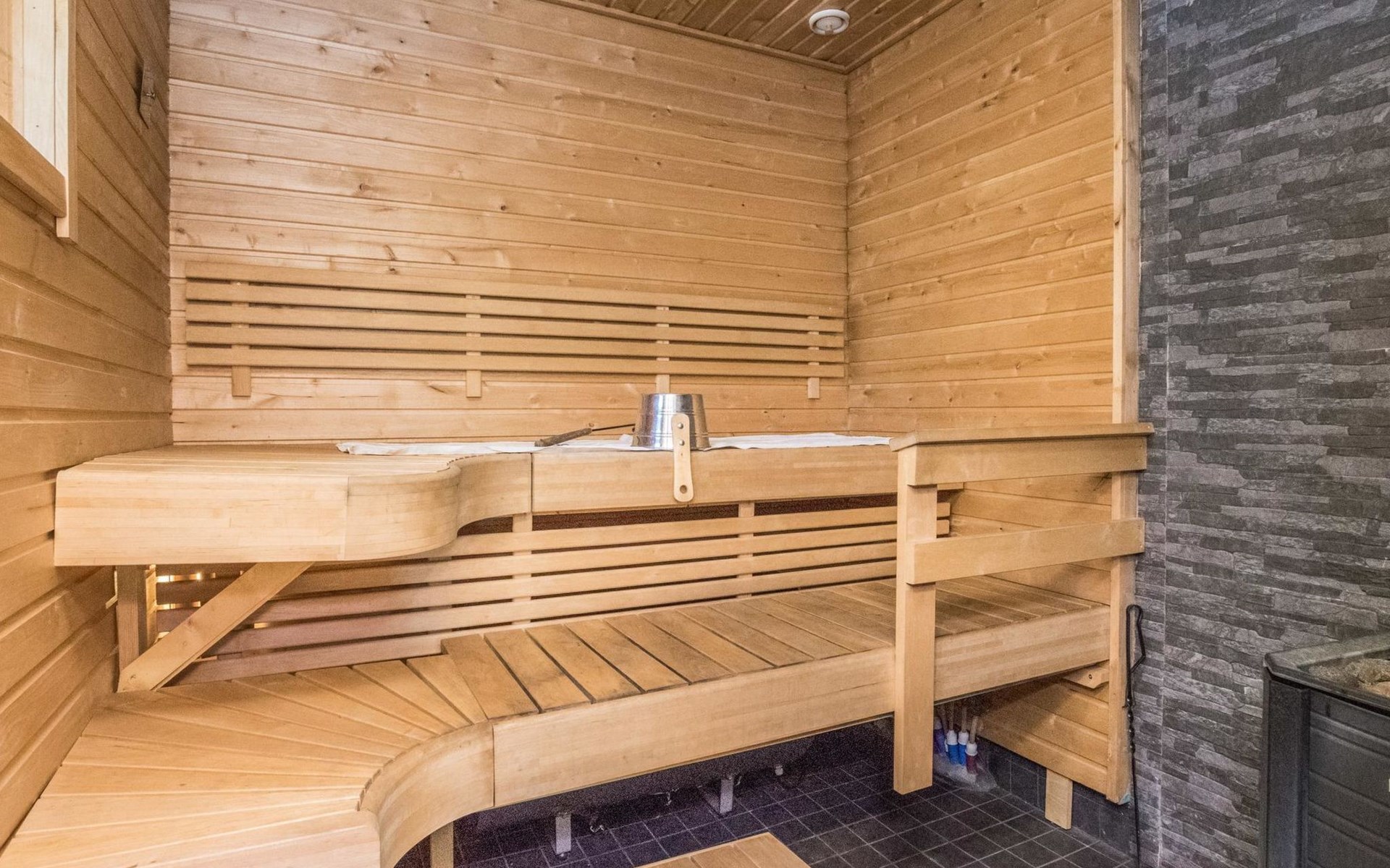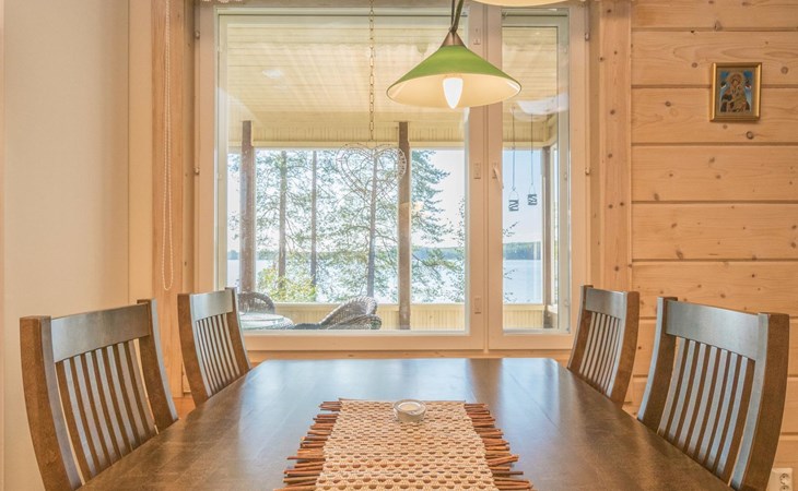 Wooden, inside log-paneled cottage built in 2013, combinated kitchen-living room with sofa bed for two, vestibule, bedroom with double bed and extra bed, bedroom with 2 beds, washroom with walk-in shower and toilet, wood heated sauna, utility/dressing room, spacious glass terrace with two seating groups.